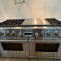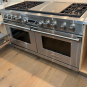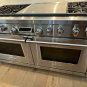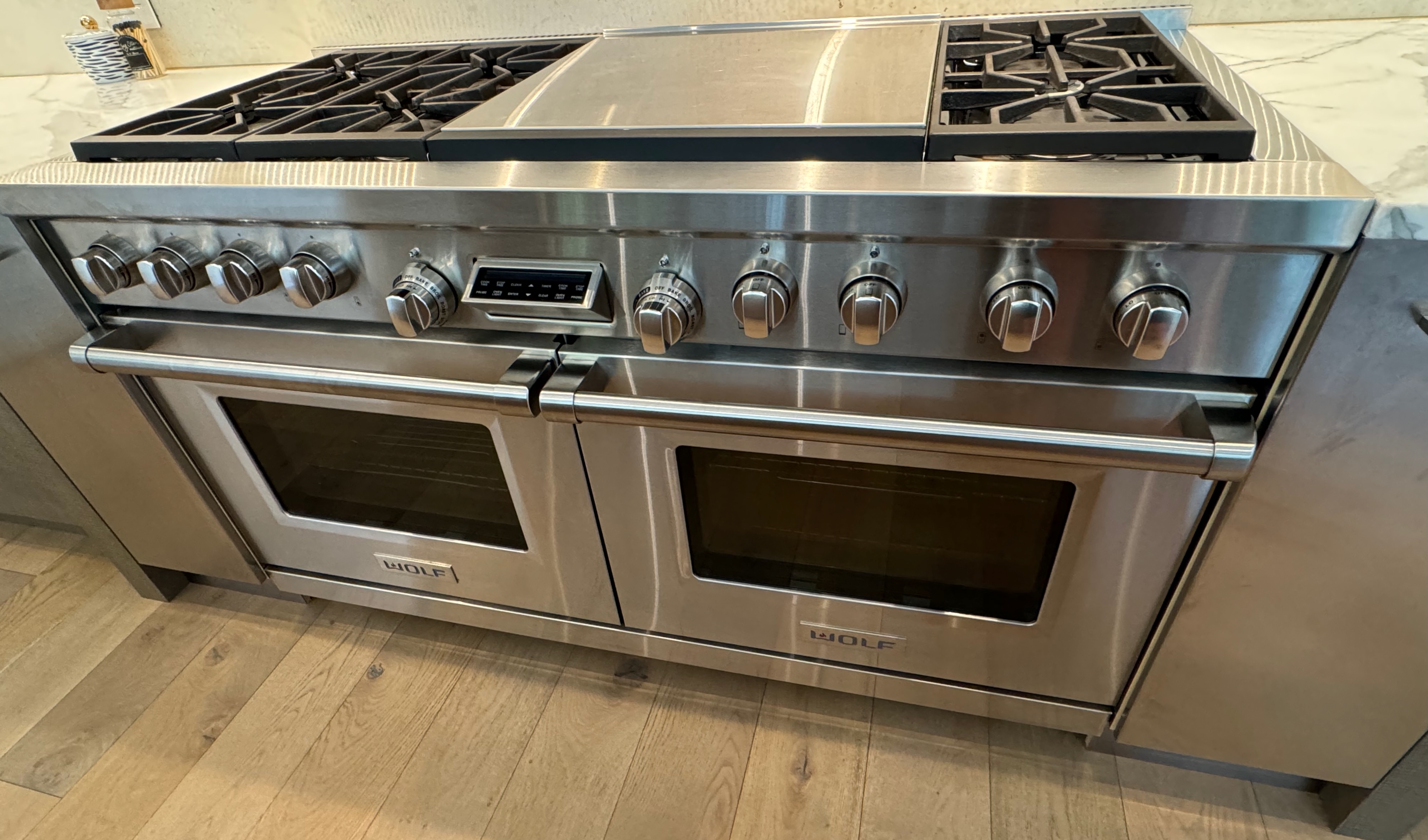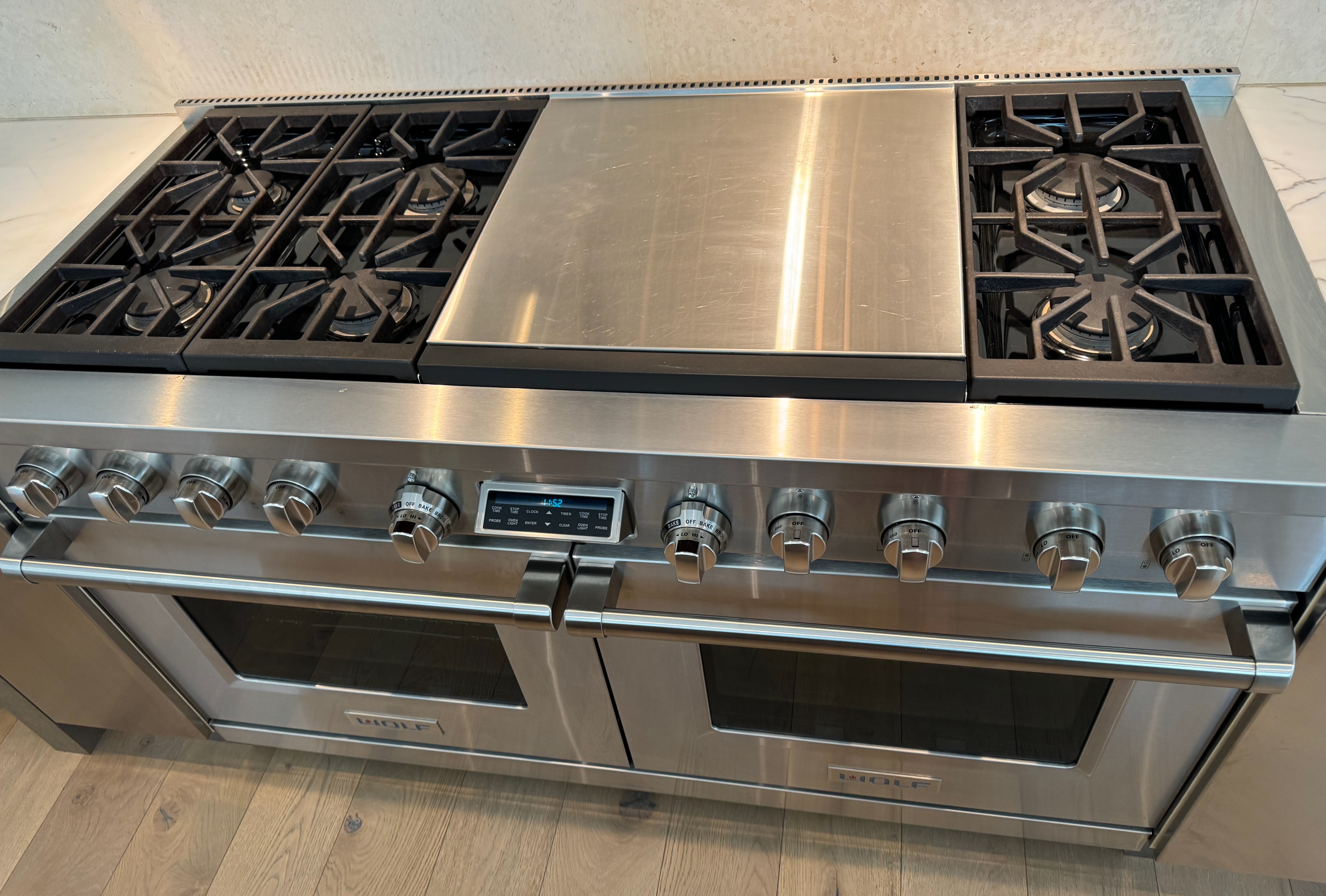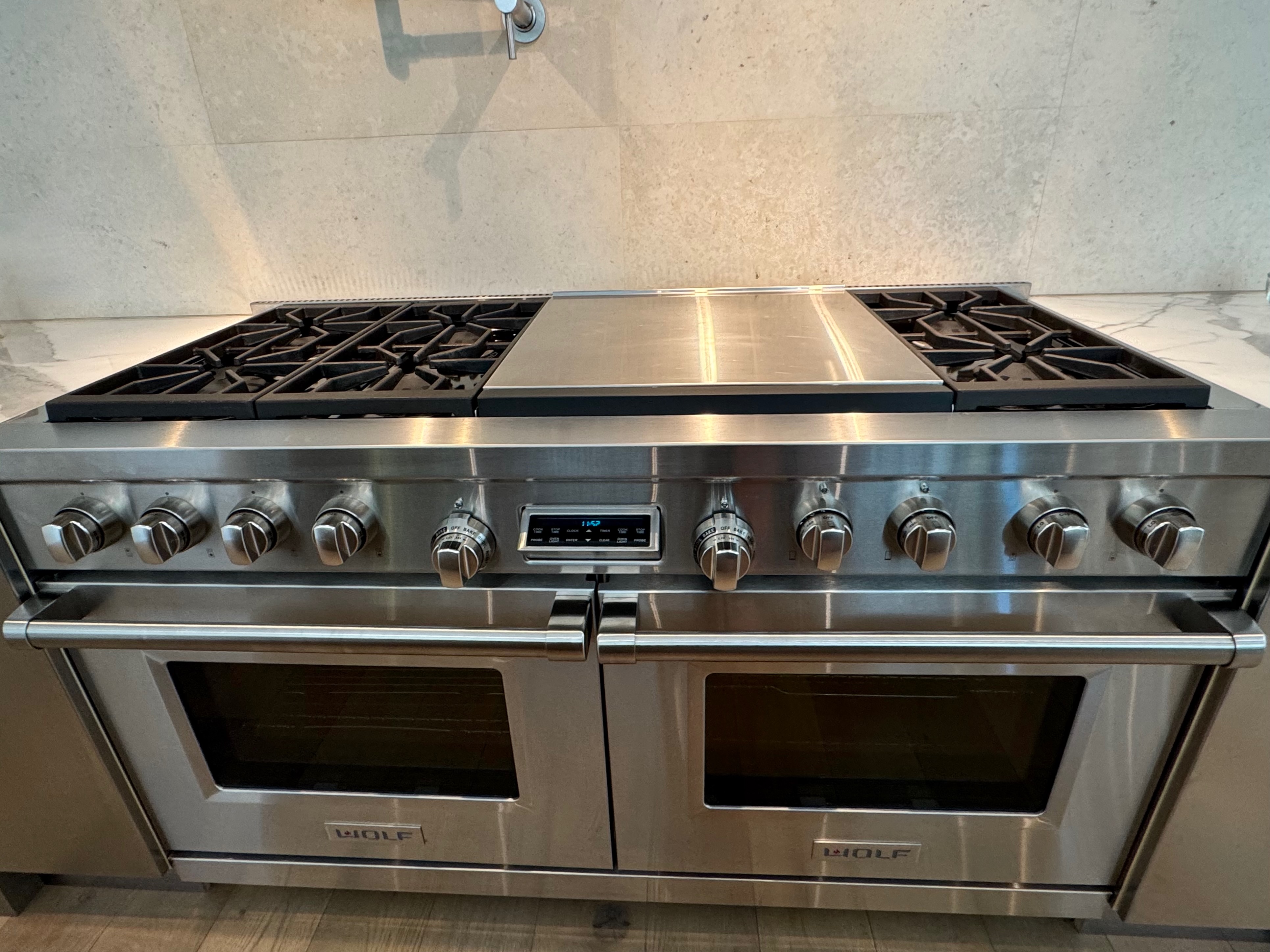 60 “ Wolf Stainless Steel range, Dual Fuel Range - 6 Burners and Infrared Dual Griddle with extra self gliding racks for the oven. Model #DF606DG, Serial #18382730, Listing price new $21,285