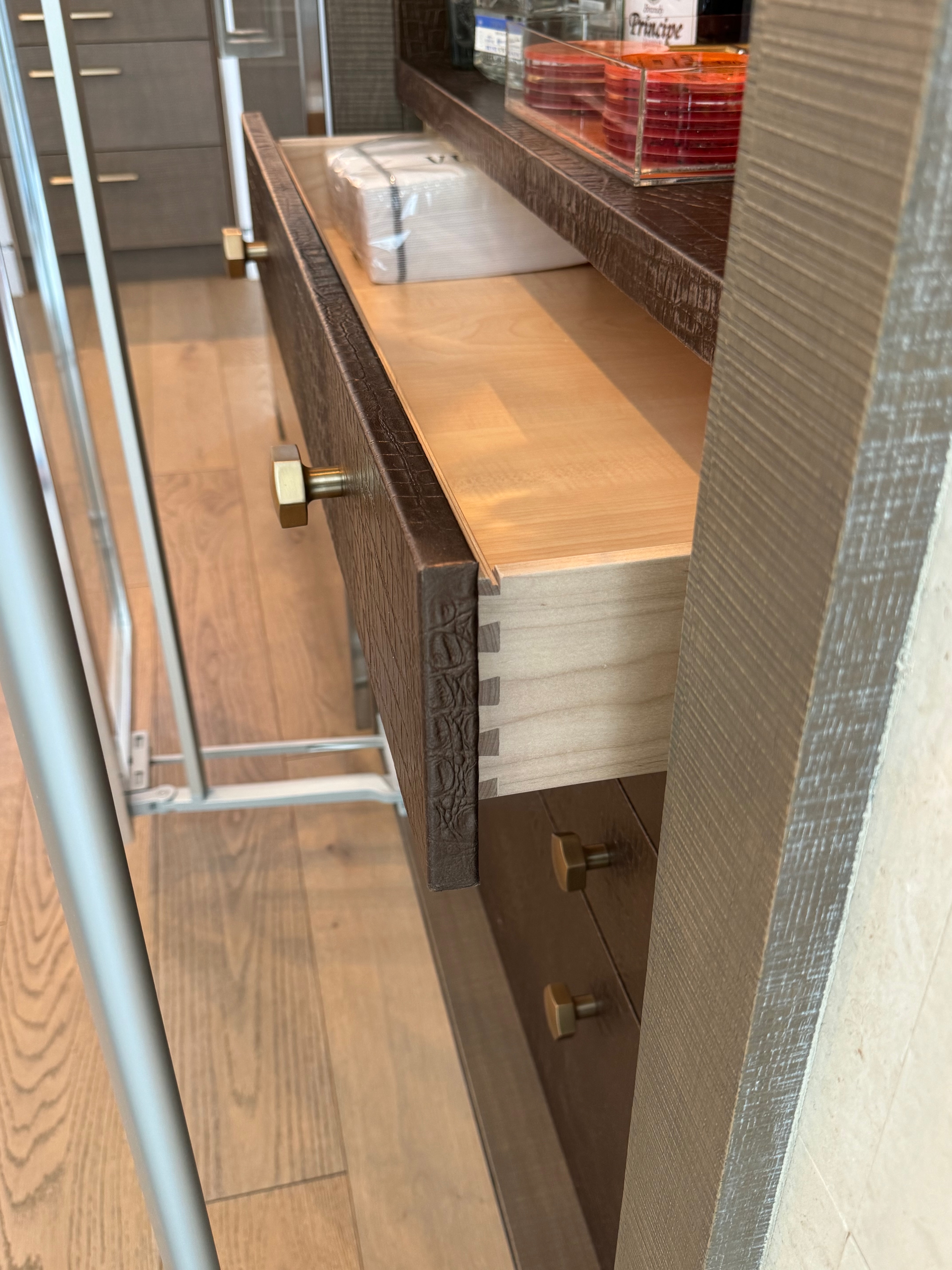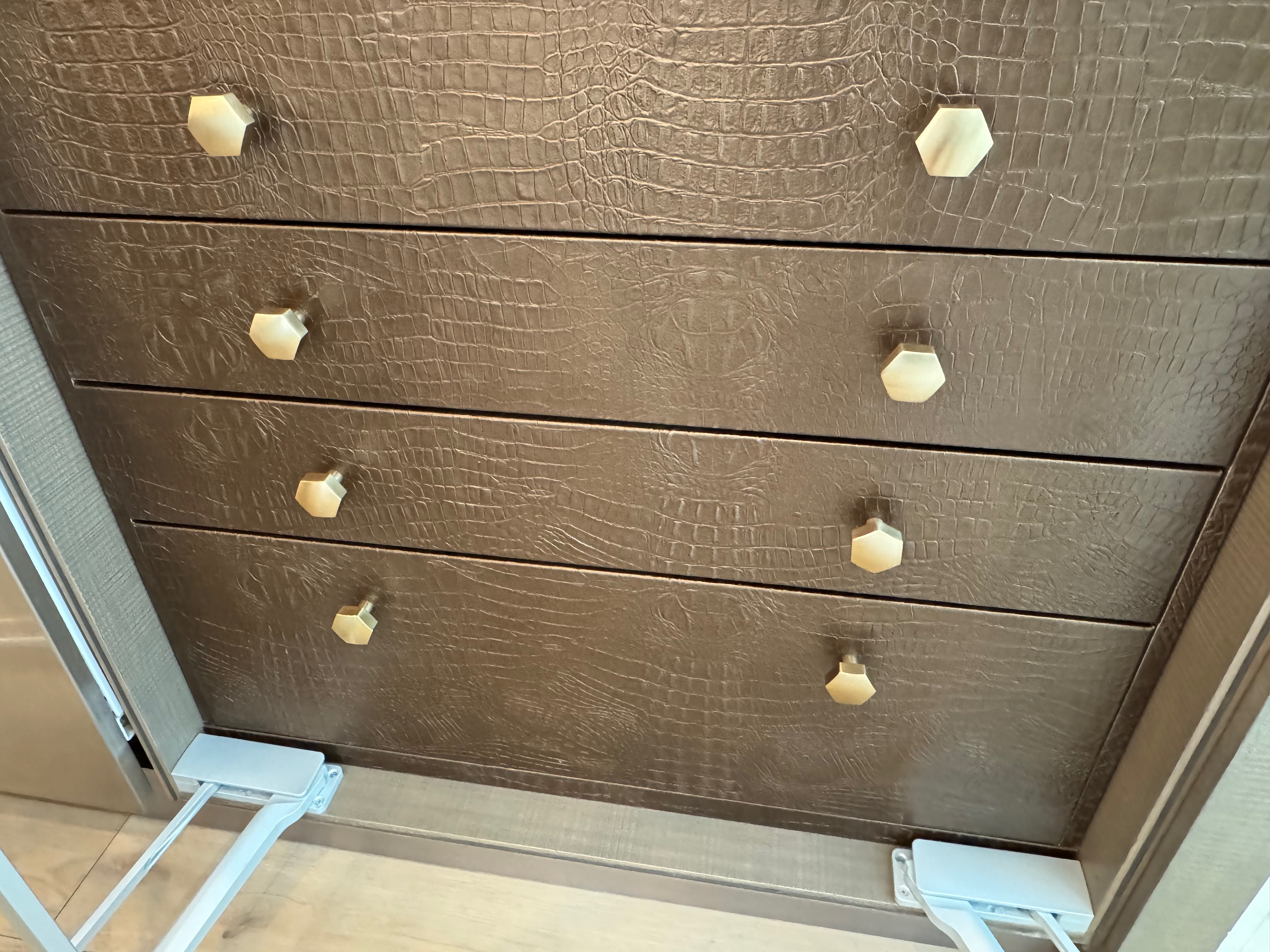 Five drawer wrapped leather cabinet Dim.: 38 ½”w x 20”d