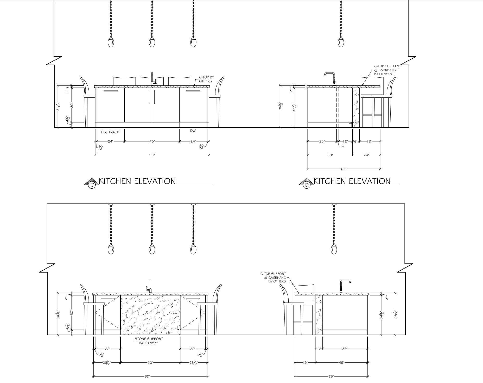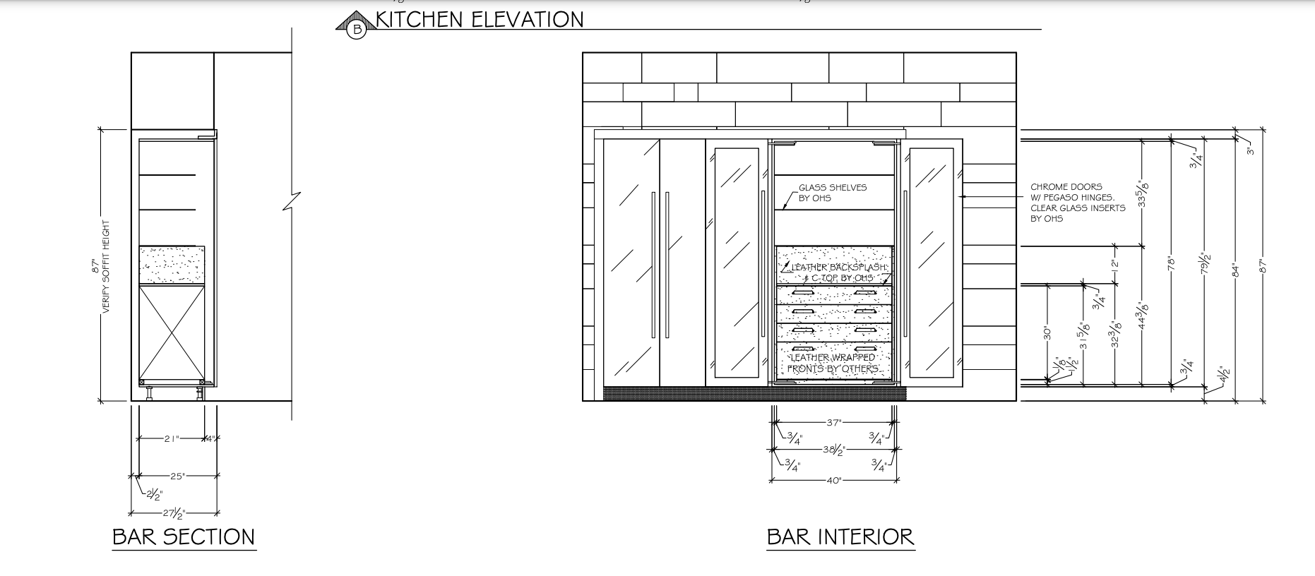 1-Two drawer, Two door base cabinets (one false drawer at wet bar sink) Dim.: 44”w x 36”h x 24”d