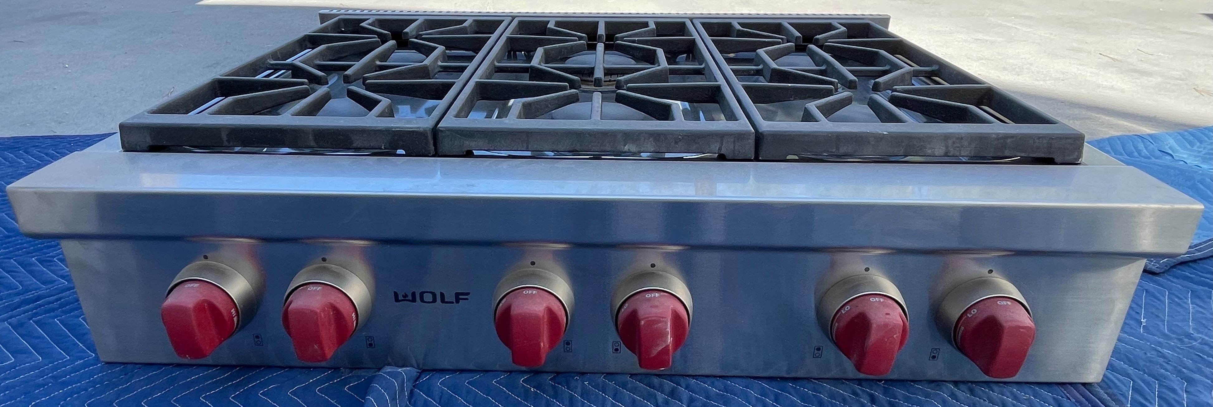 36” Wolf 6 burner range top Model #SRT366 Serial #17290925 Dim.: Listing price new $4,585