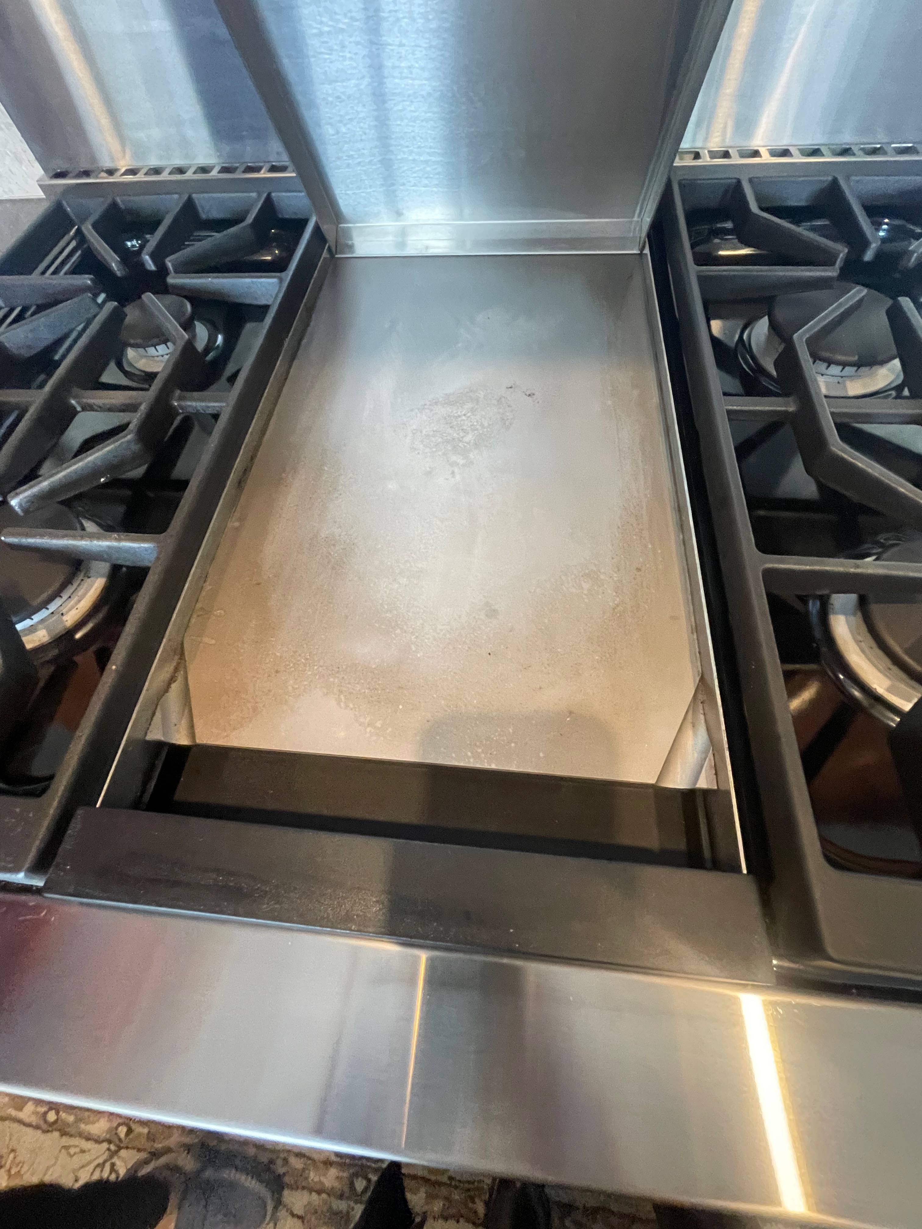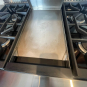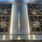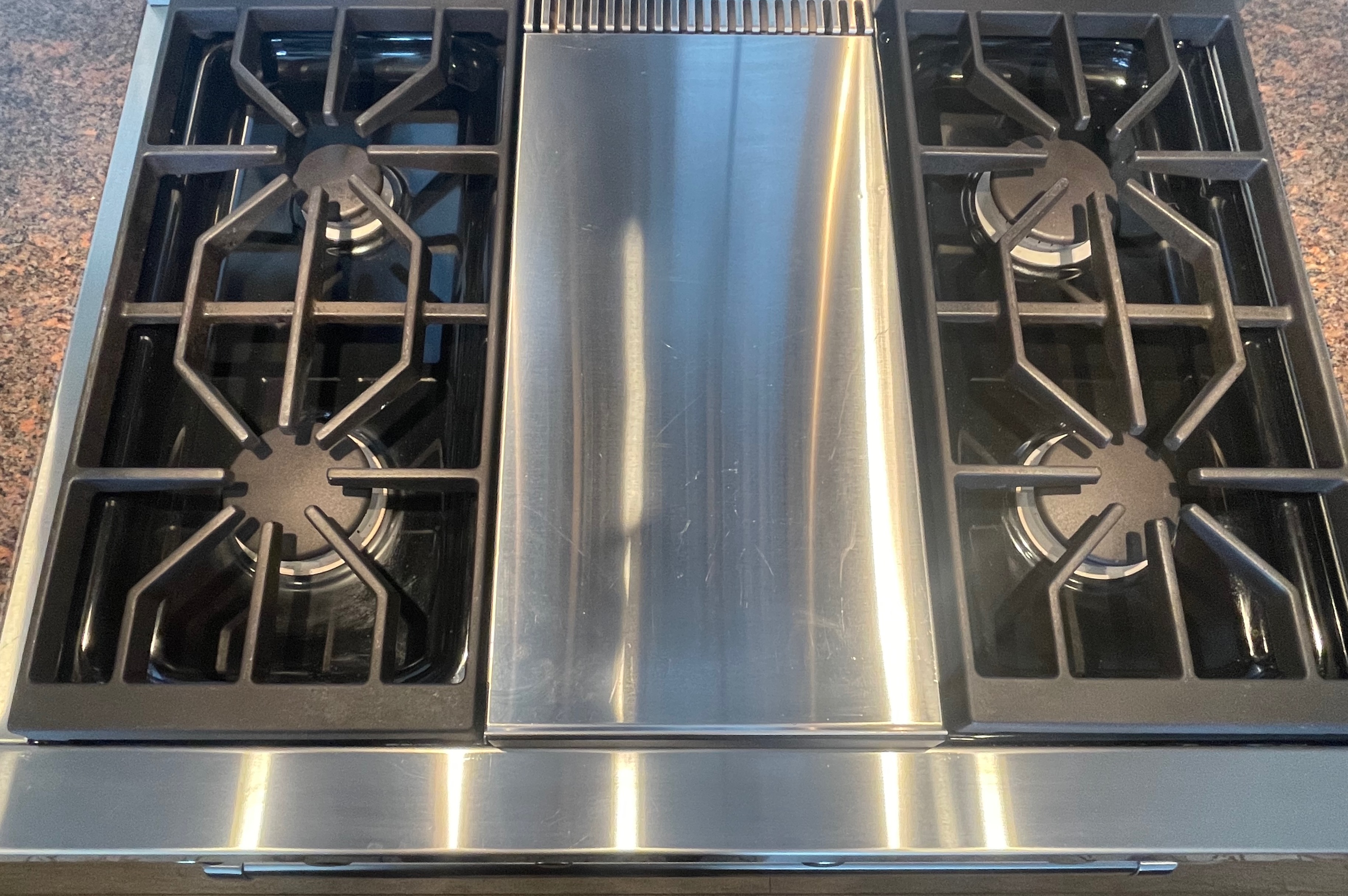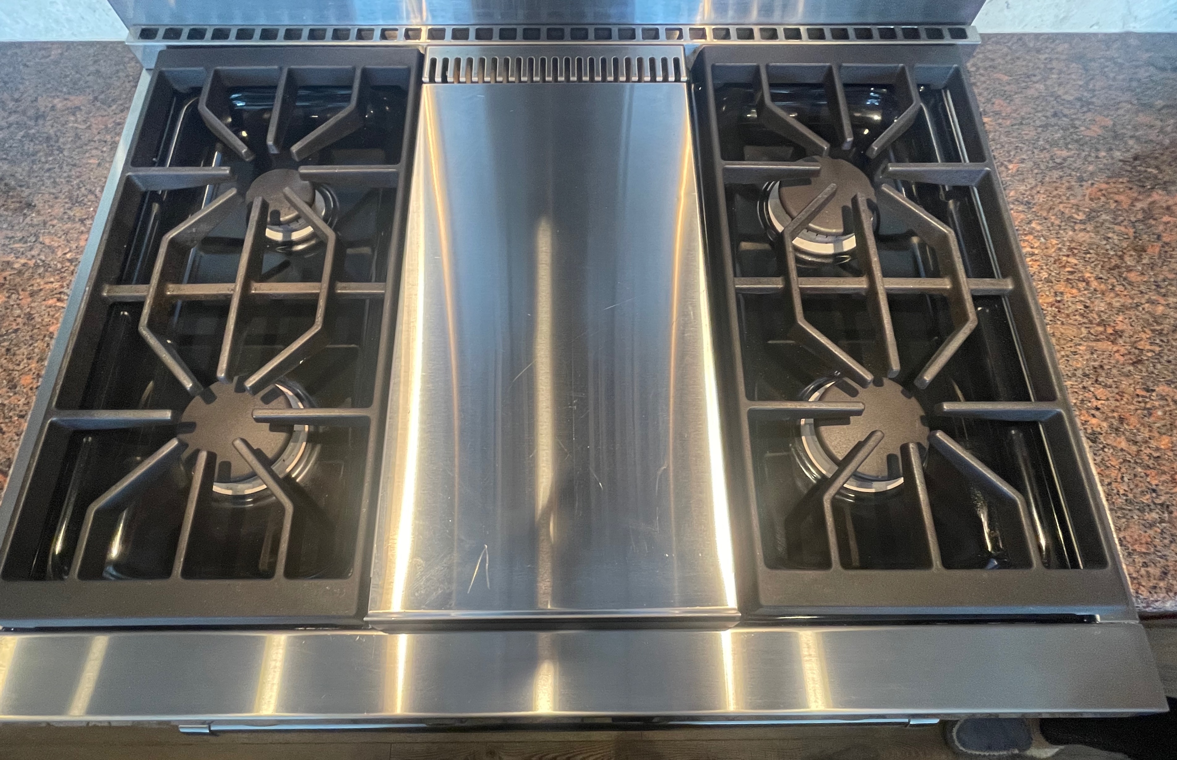 36 Wolf Stainless Steel side gas Range, griddle, comes with red and silver knobs, has stainless steel backsplash. Model #GR364G Serial #18533603 Dim.:36”w, Listing price new $8,760