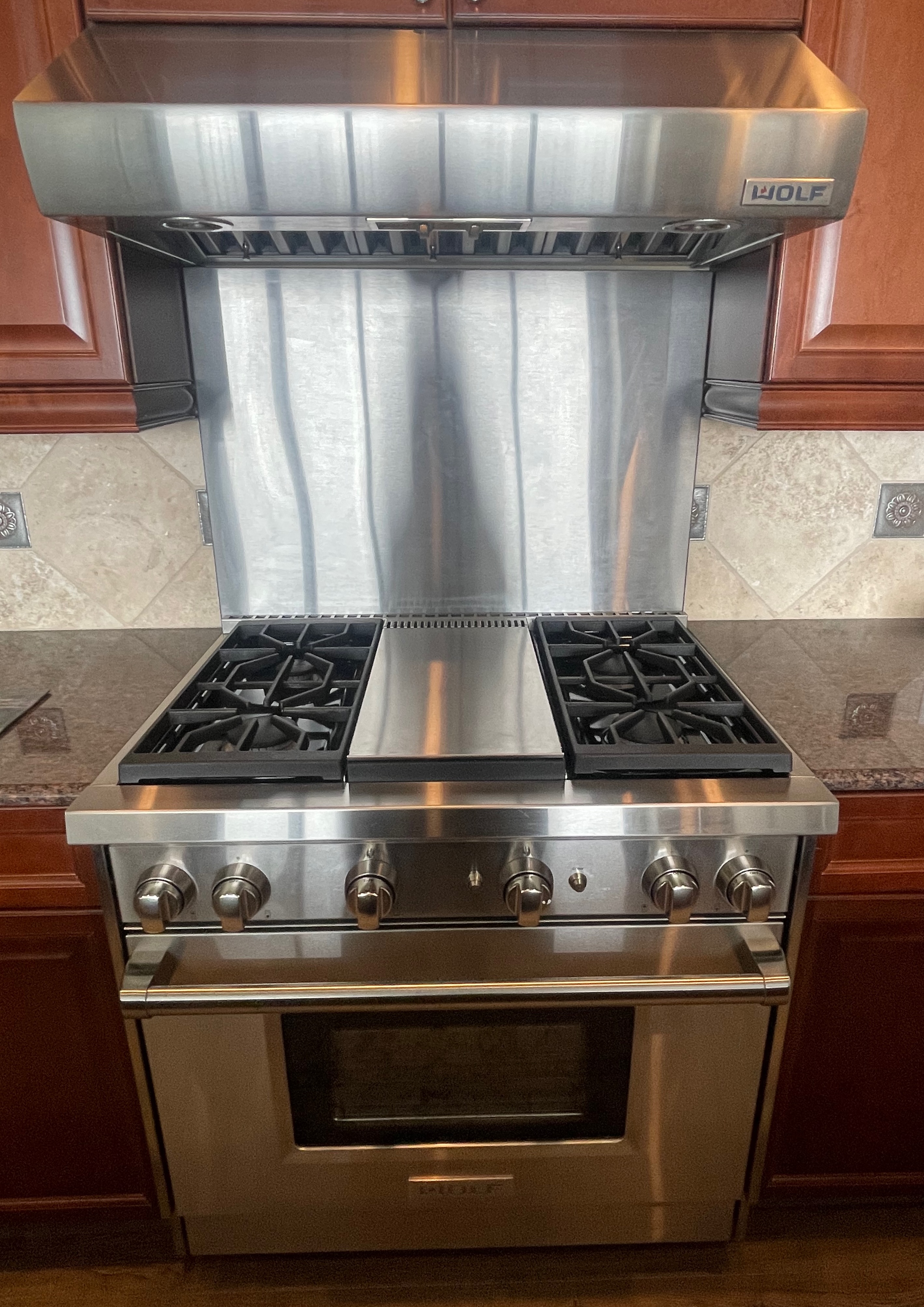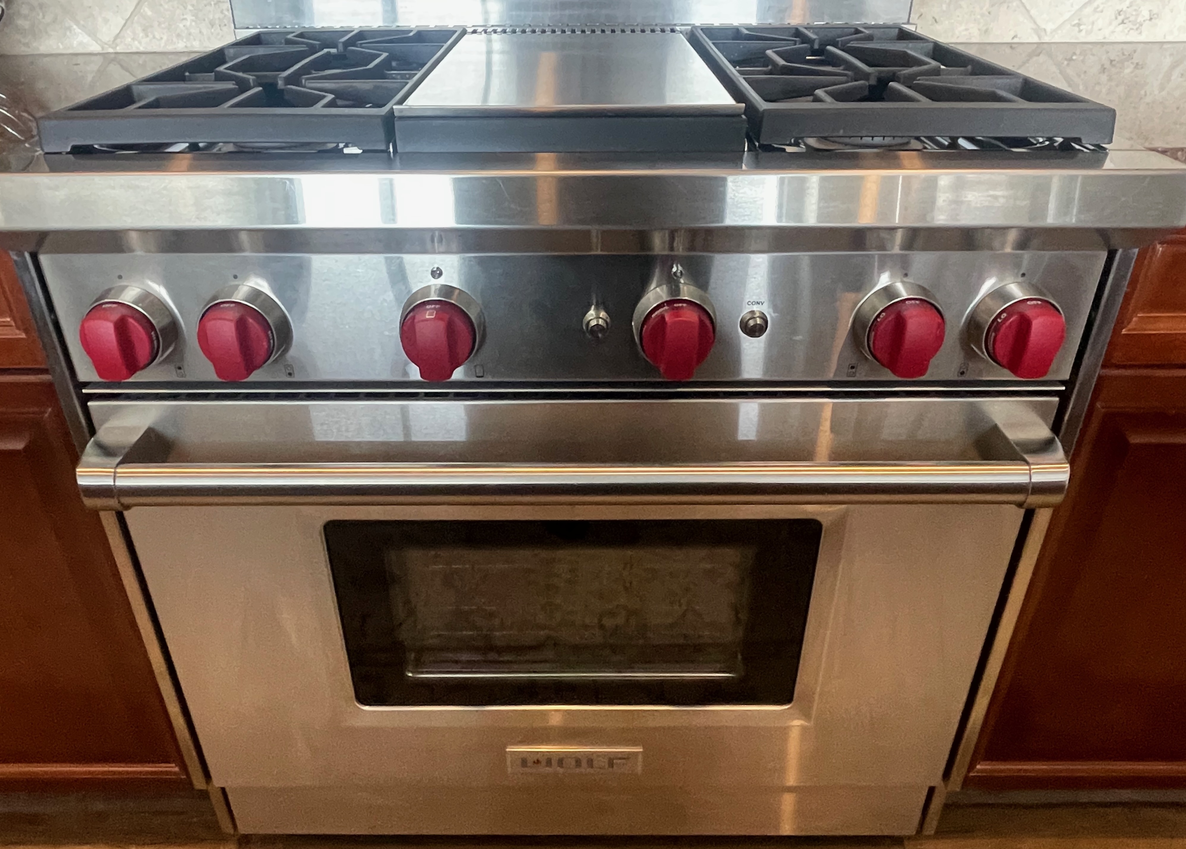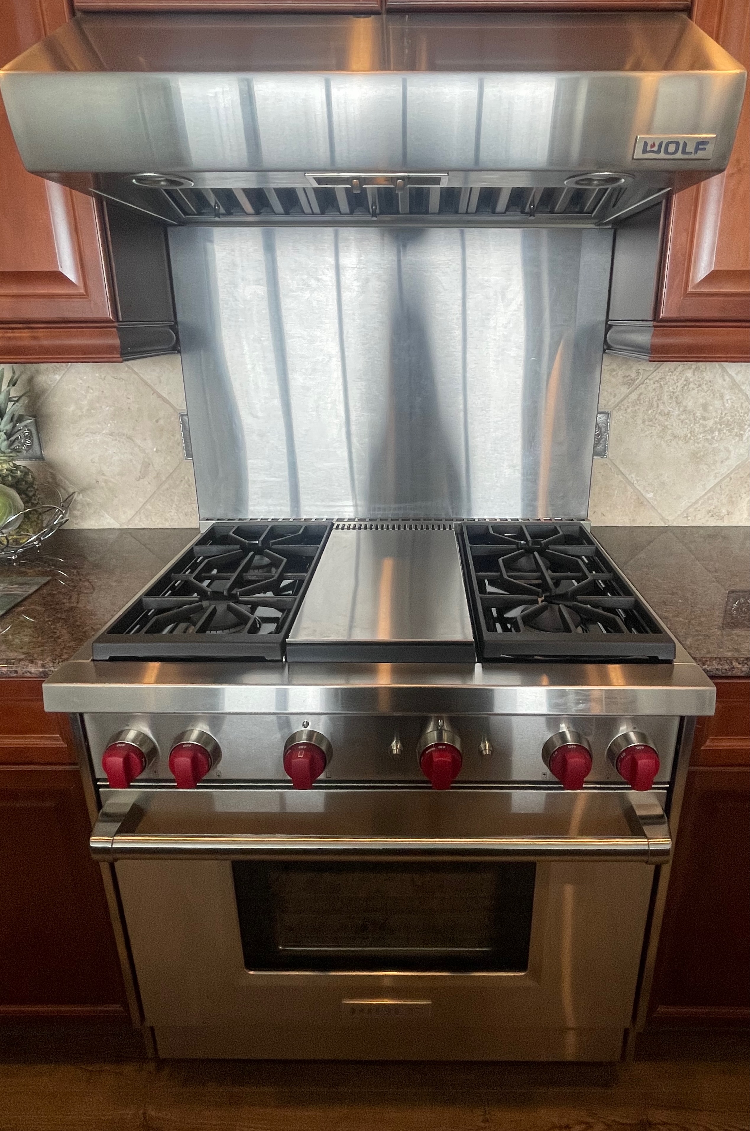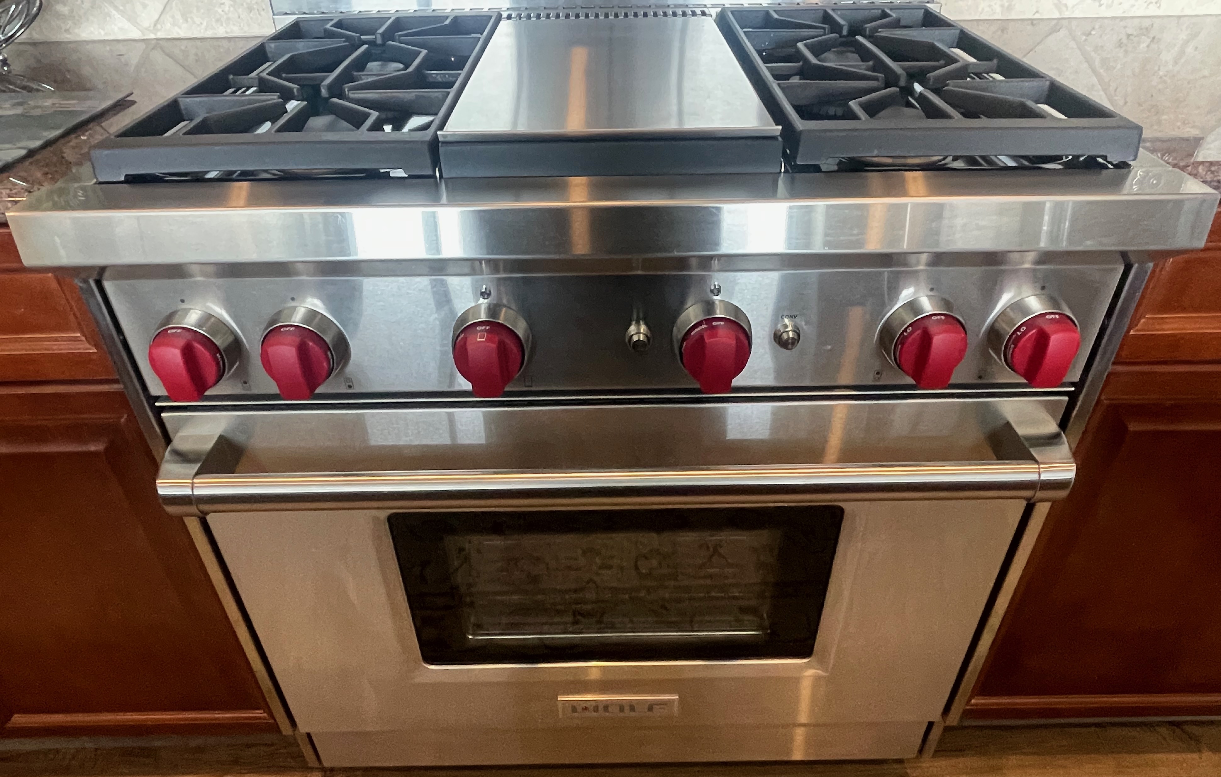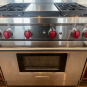 36" Wolf Gas Range with griddle, Wolf low profile wall Hood and Wolf M series professional Microwave.The appliances are being switched out for induction cooktop, speed oven that is why they are being sold.