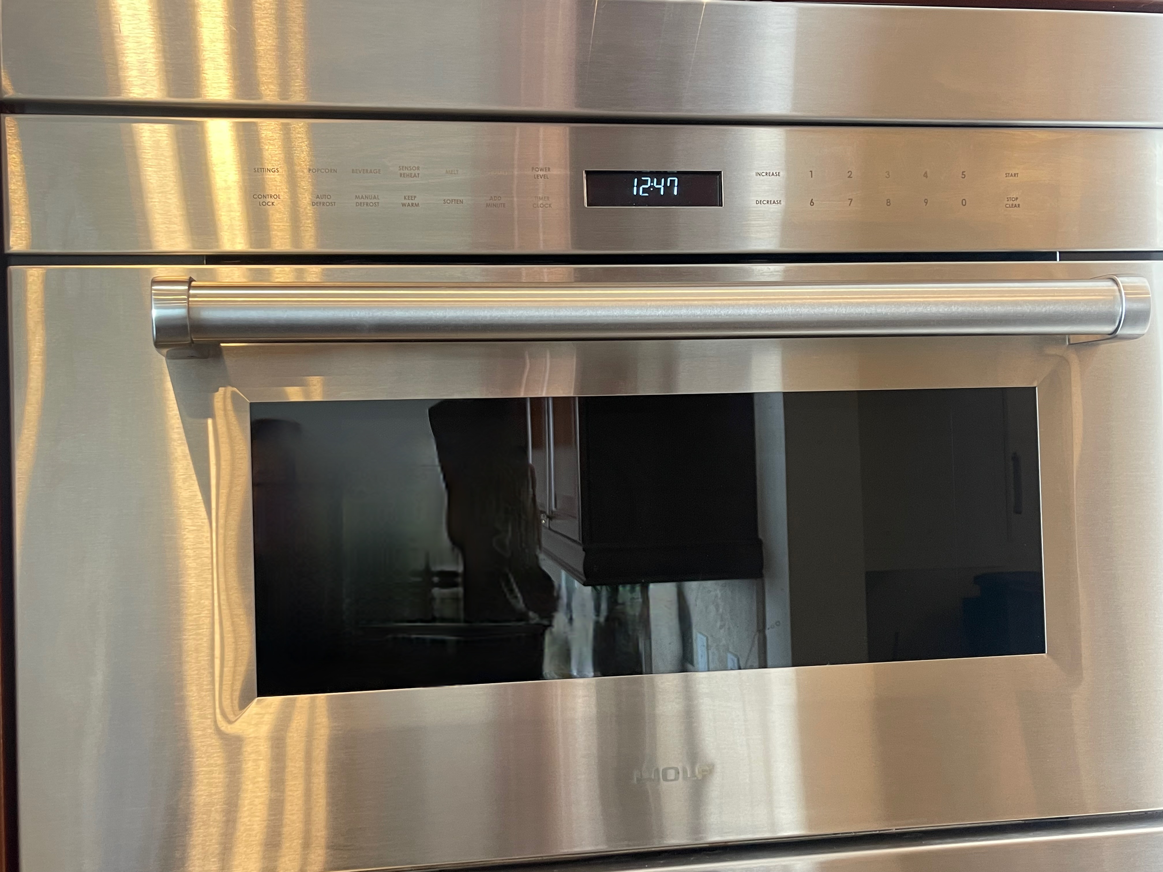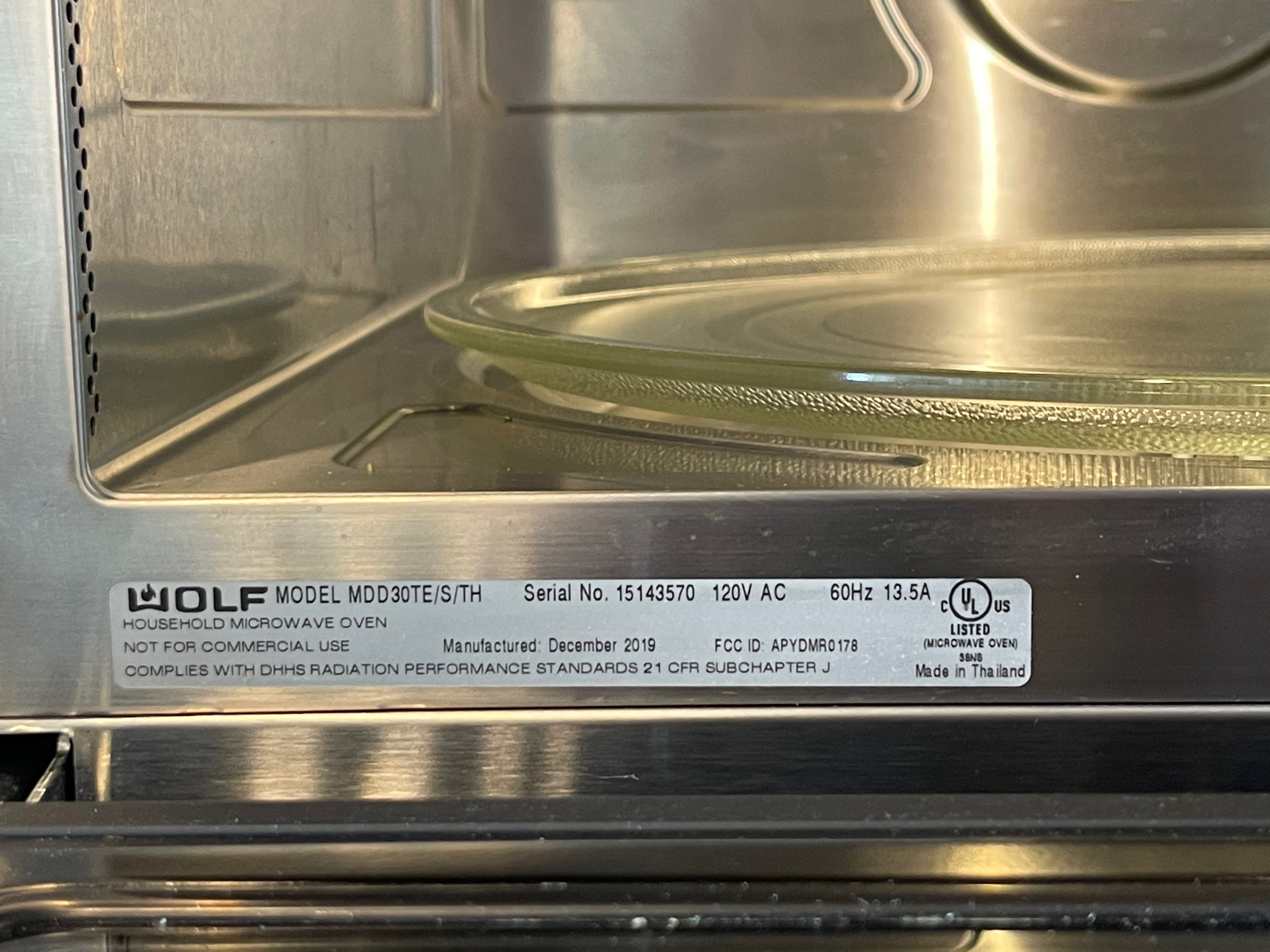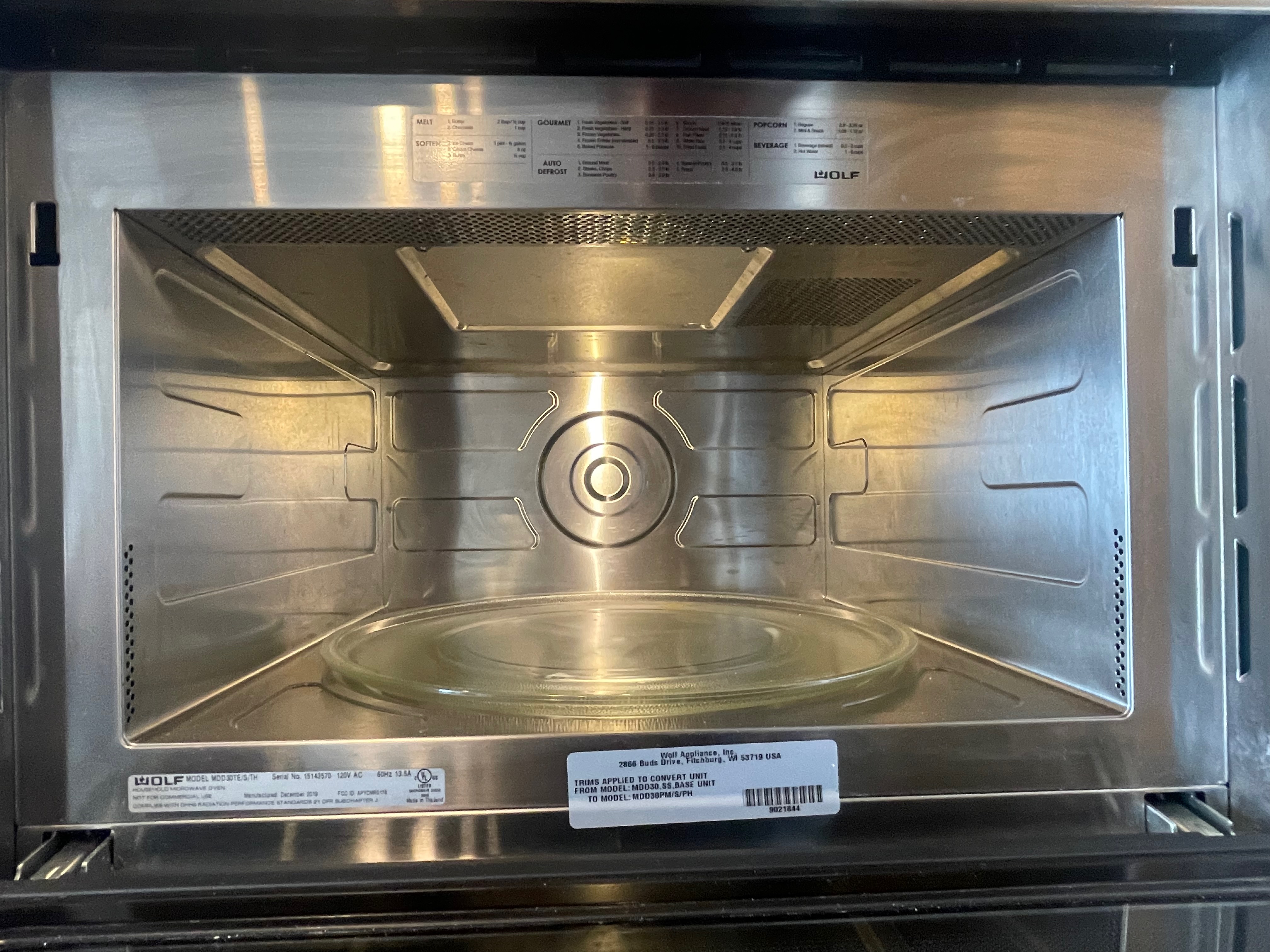 30 Wolf Stainless Steel Side Microwave, M series professional drop-down door, Model #MDD30PM/S/P, Serial #15143570 Dim.:30"w x 25 3/4"h, Listing price new $2,589