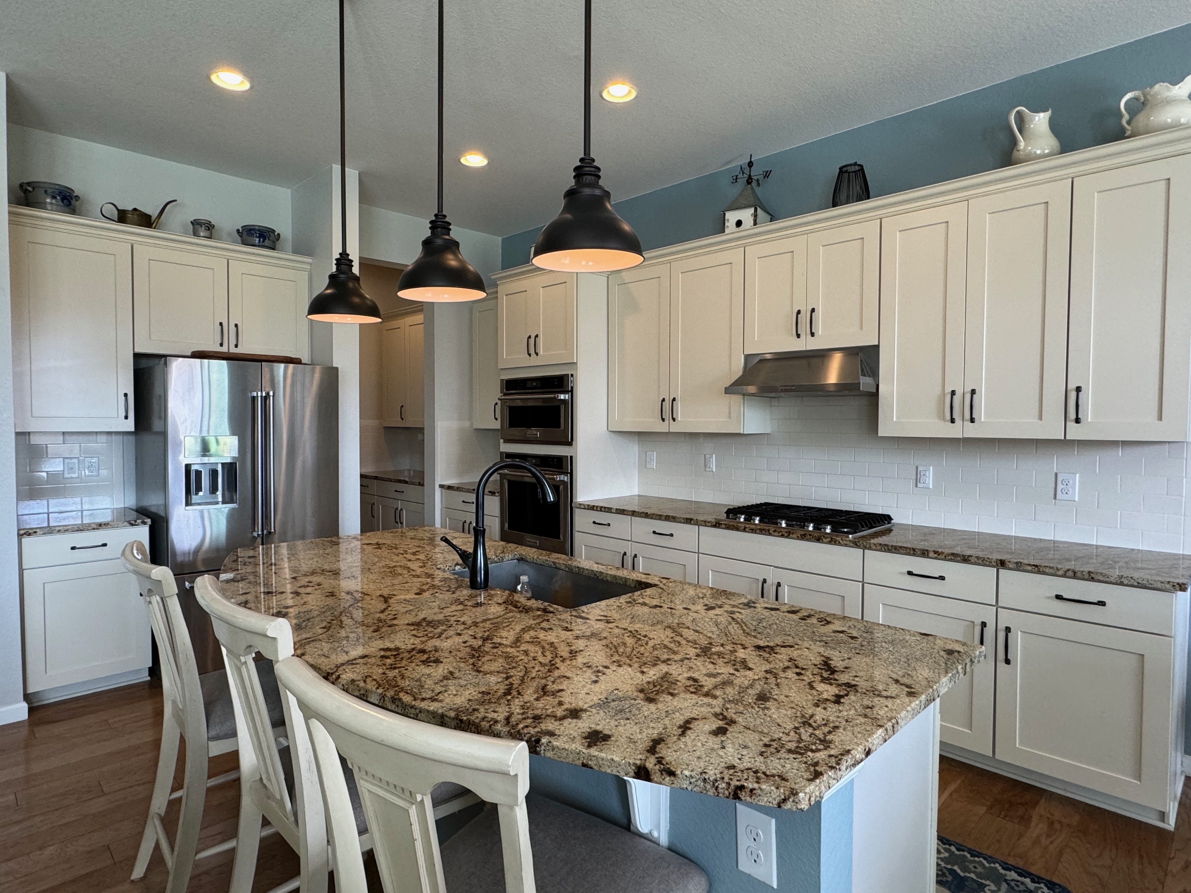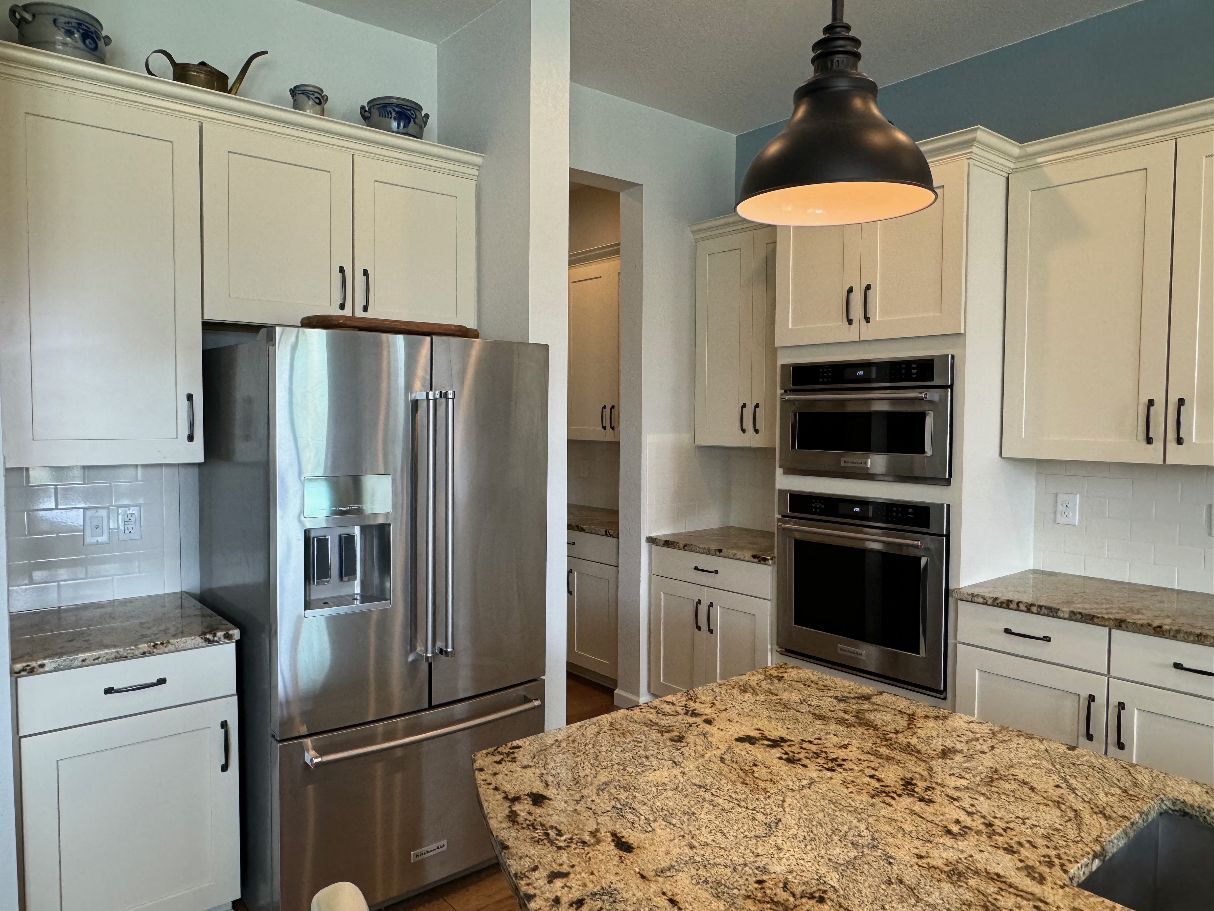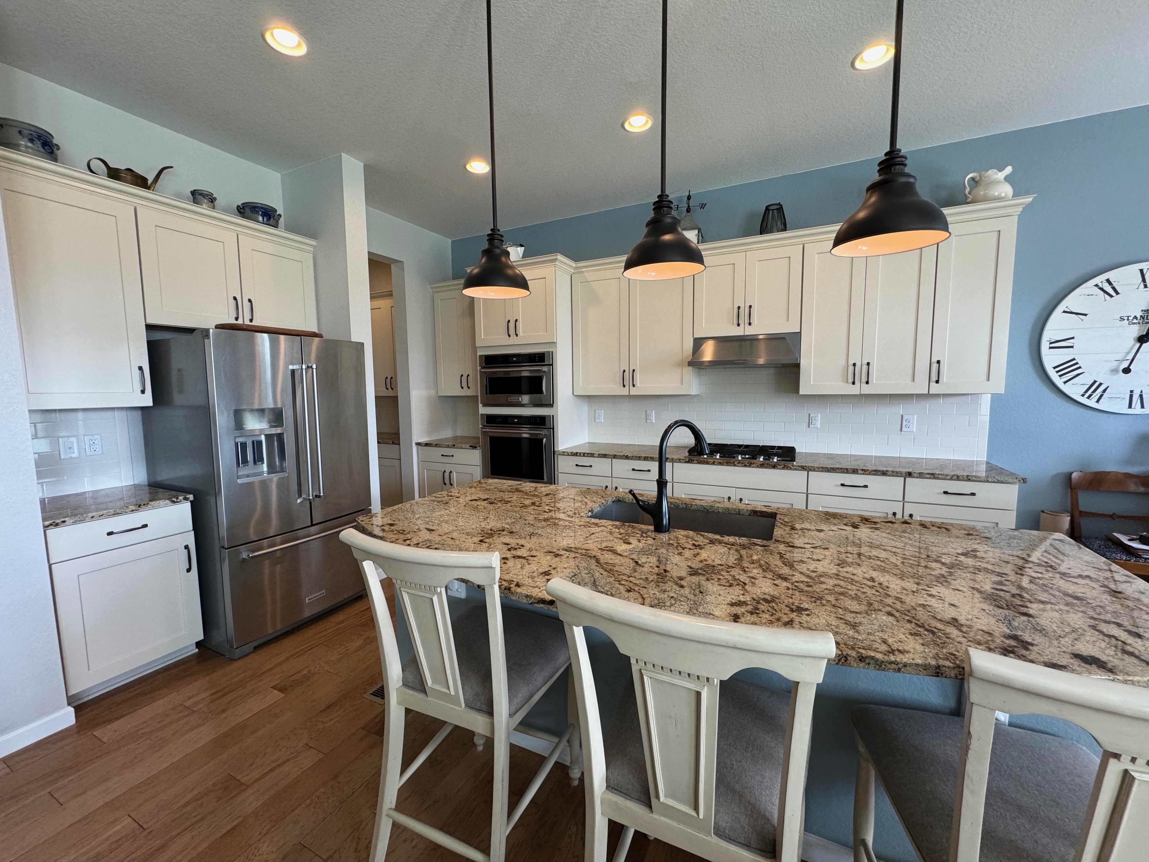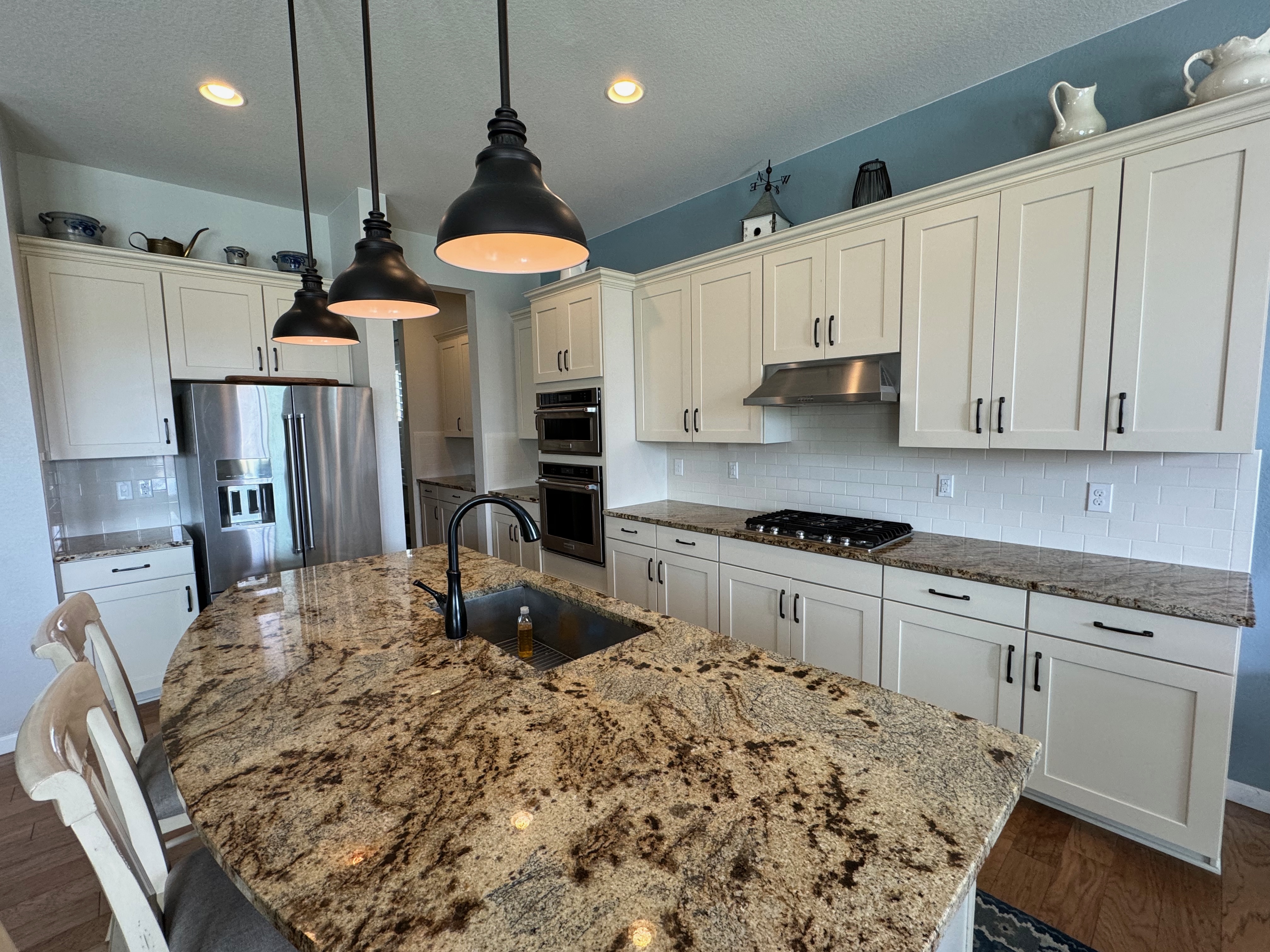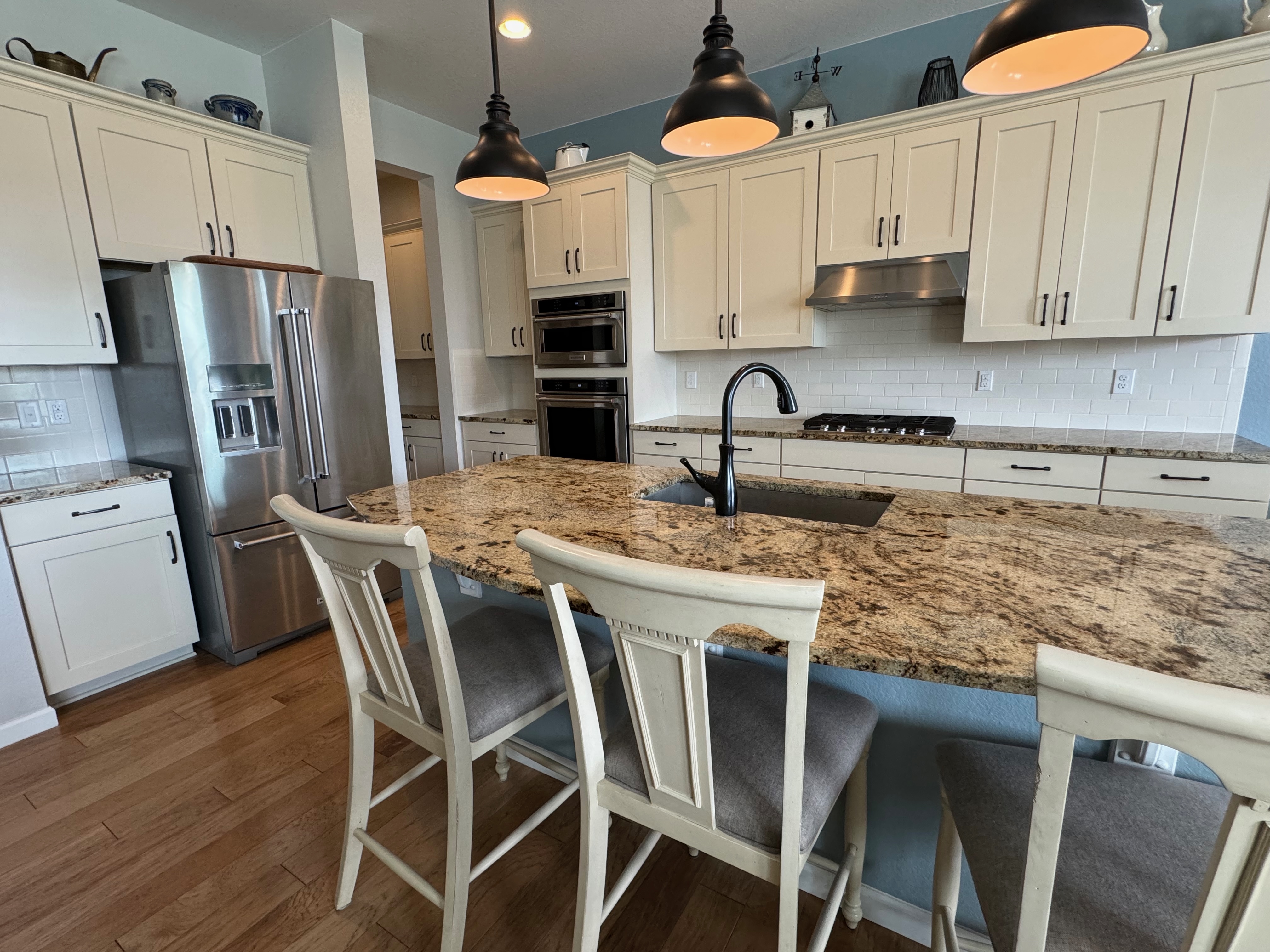 Like New Timberlake Cabinetry, only 7 years old. The cabinet maker is local so you could add additional matching cabinetry. The cabinets are the New Haven door style in a nice painted vanilla shade. Included KitchenAid Stainless Steel appliances, slab granite counter tops, undermount sink, faucet set, disposal and pendant lights. The matching chairs can be included for an additional cost. The kitchen is available to be removed by a qualified buyer or there are licensed contractors available to hire. Price for the kitchen package below.