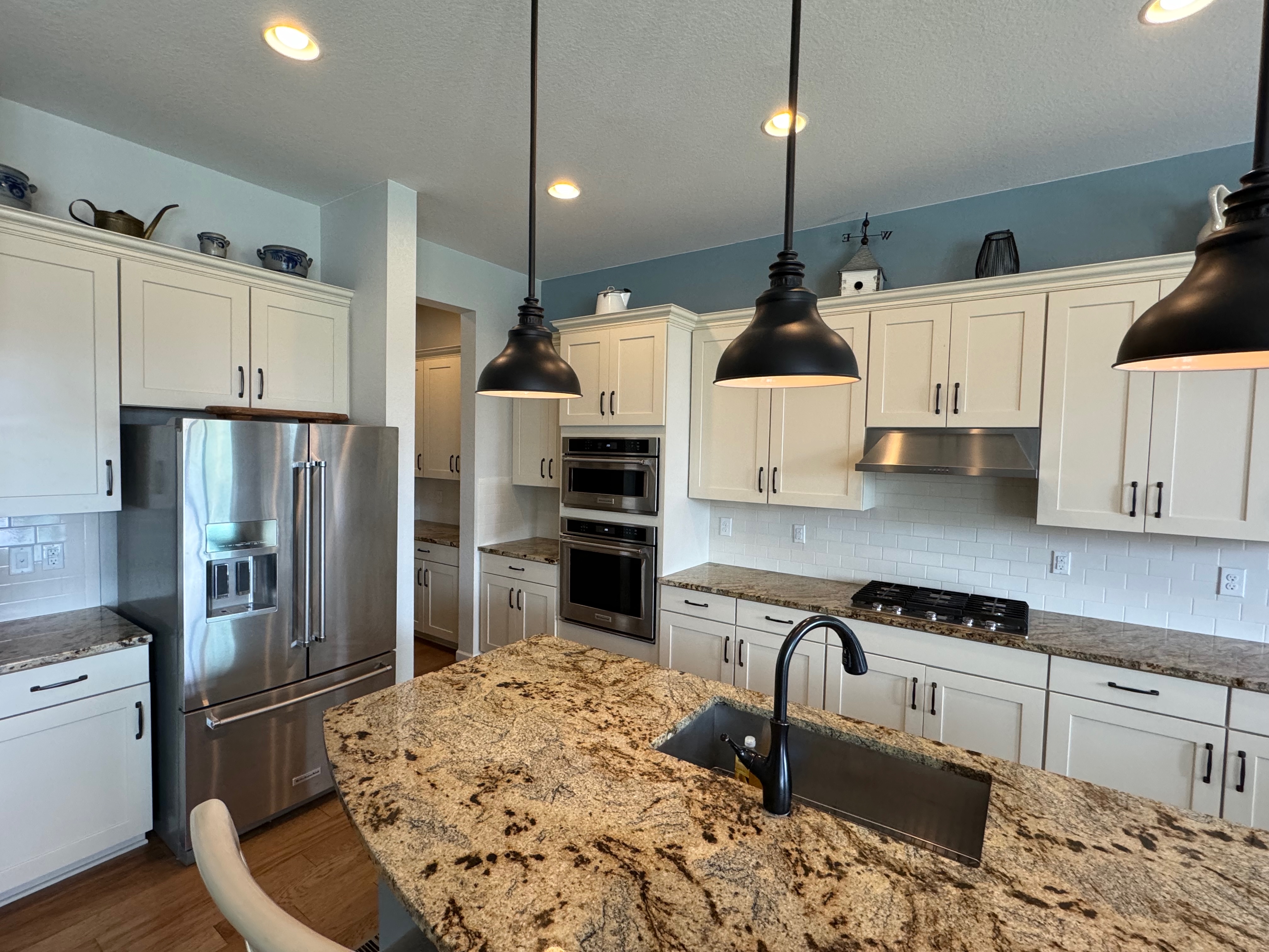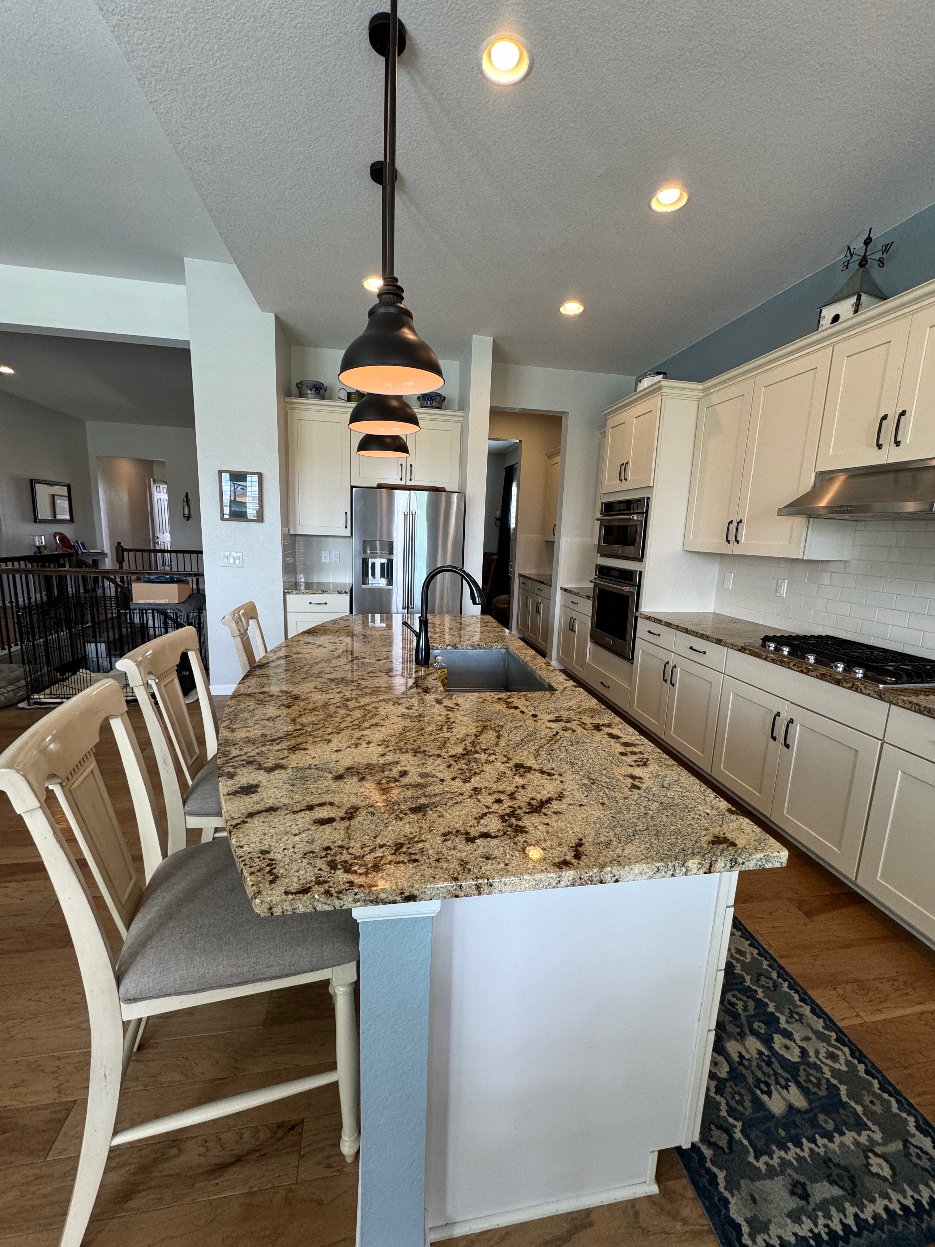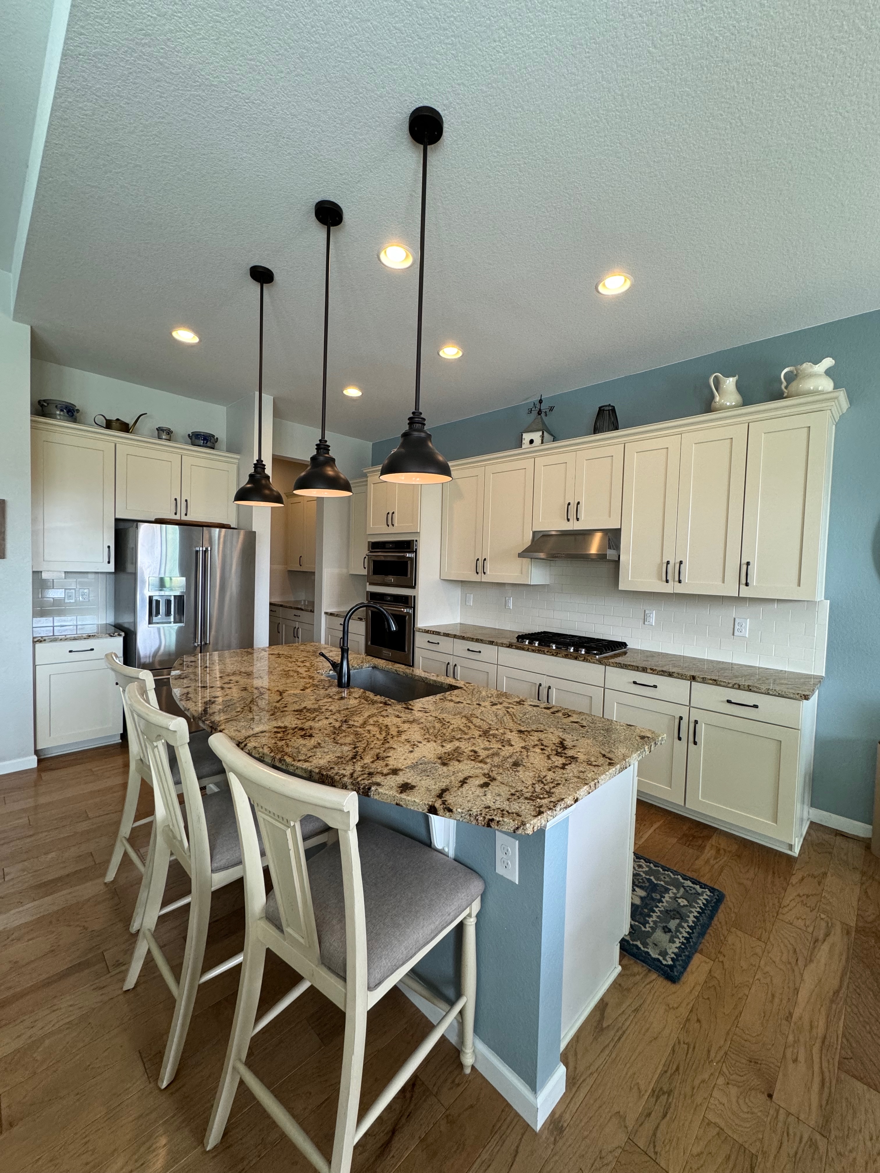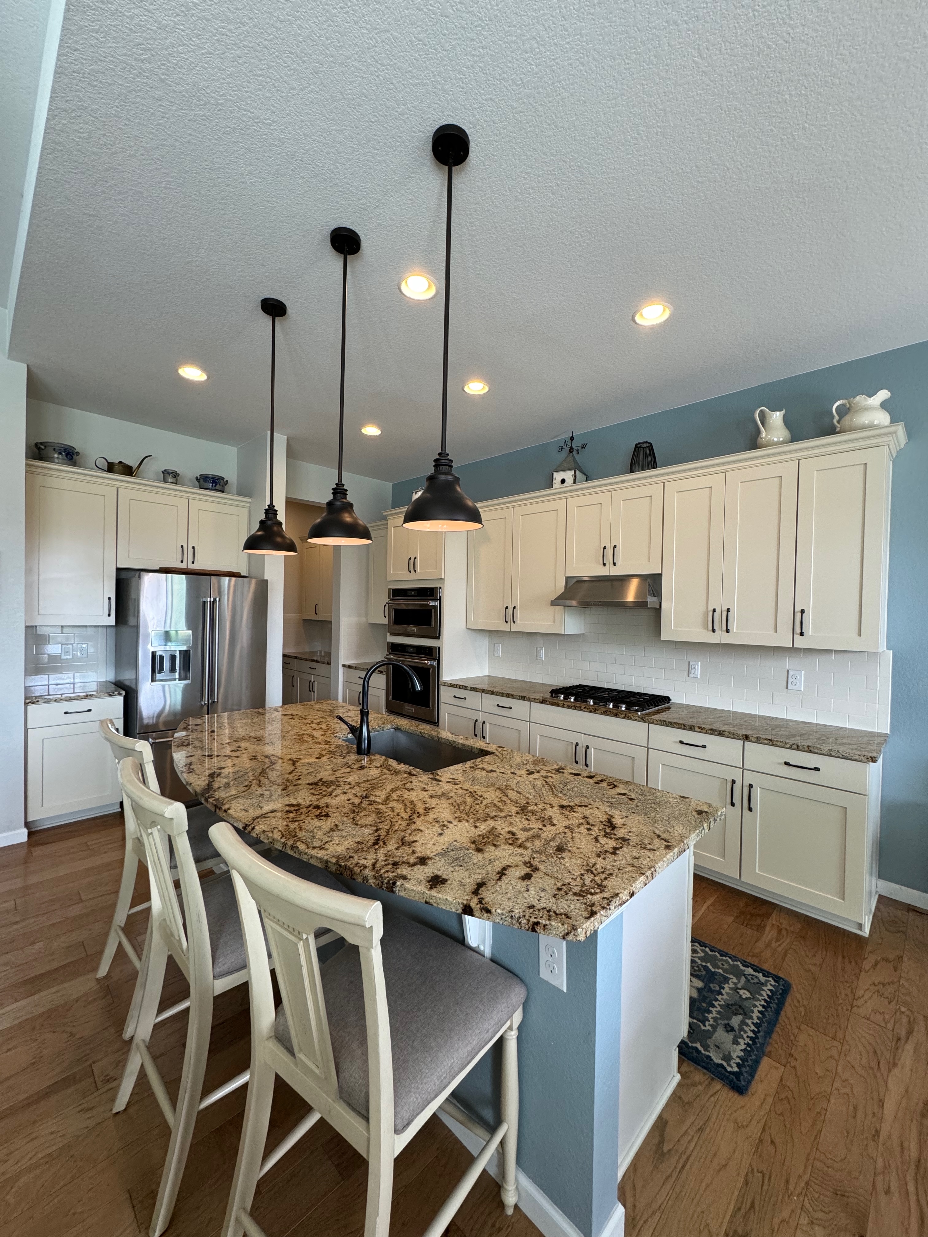 Like New Timberlake Cabinetry, only 7 years old. The cabinet maker is local so you could add additional matching cabinetry. The cabinets are the New Haven door style in a nice painted vanilla shade. Included KitchenAid Stainless Steel appliances, slab granite counter tops, undermount sink, faucet set, disposal and pendant lights. The matching chairs can be included for an additional cost. The kitchen is available to be removed by a qualified buyer or there are licensed contractors available to hire. Price for the kitchen package below.
