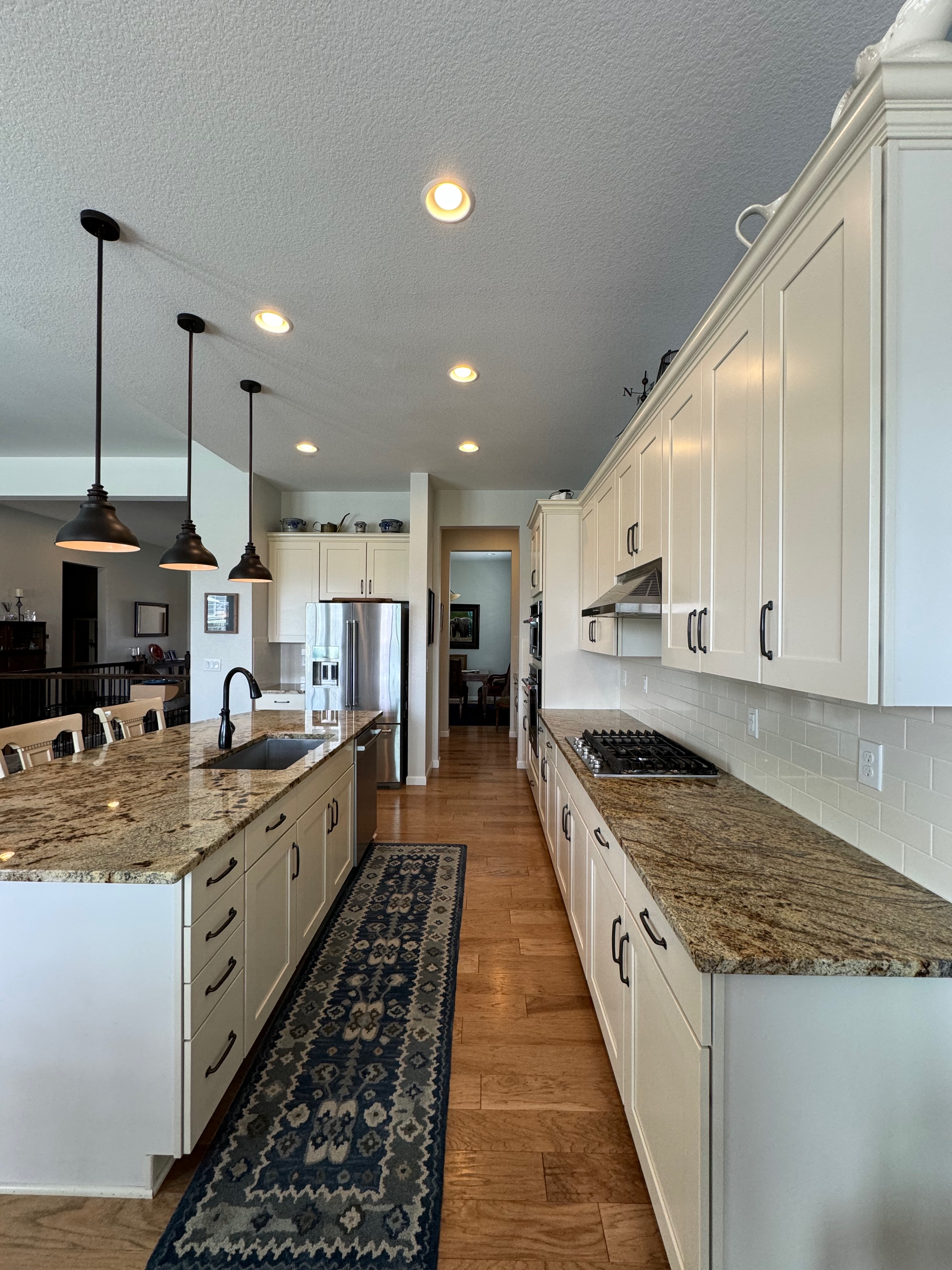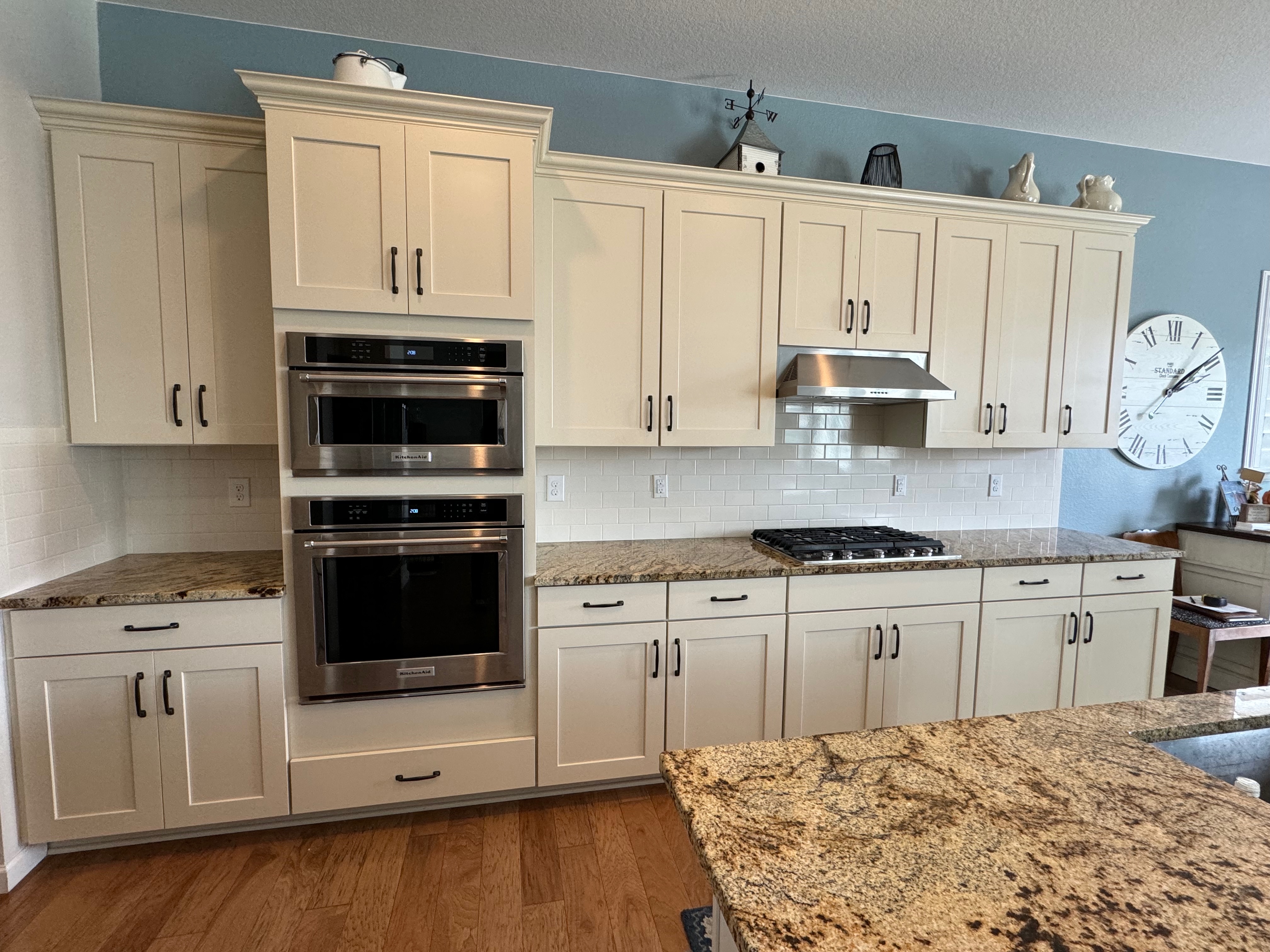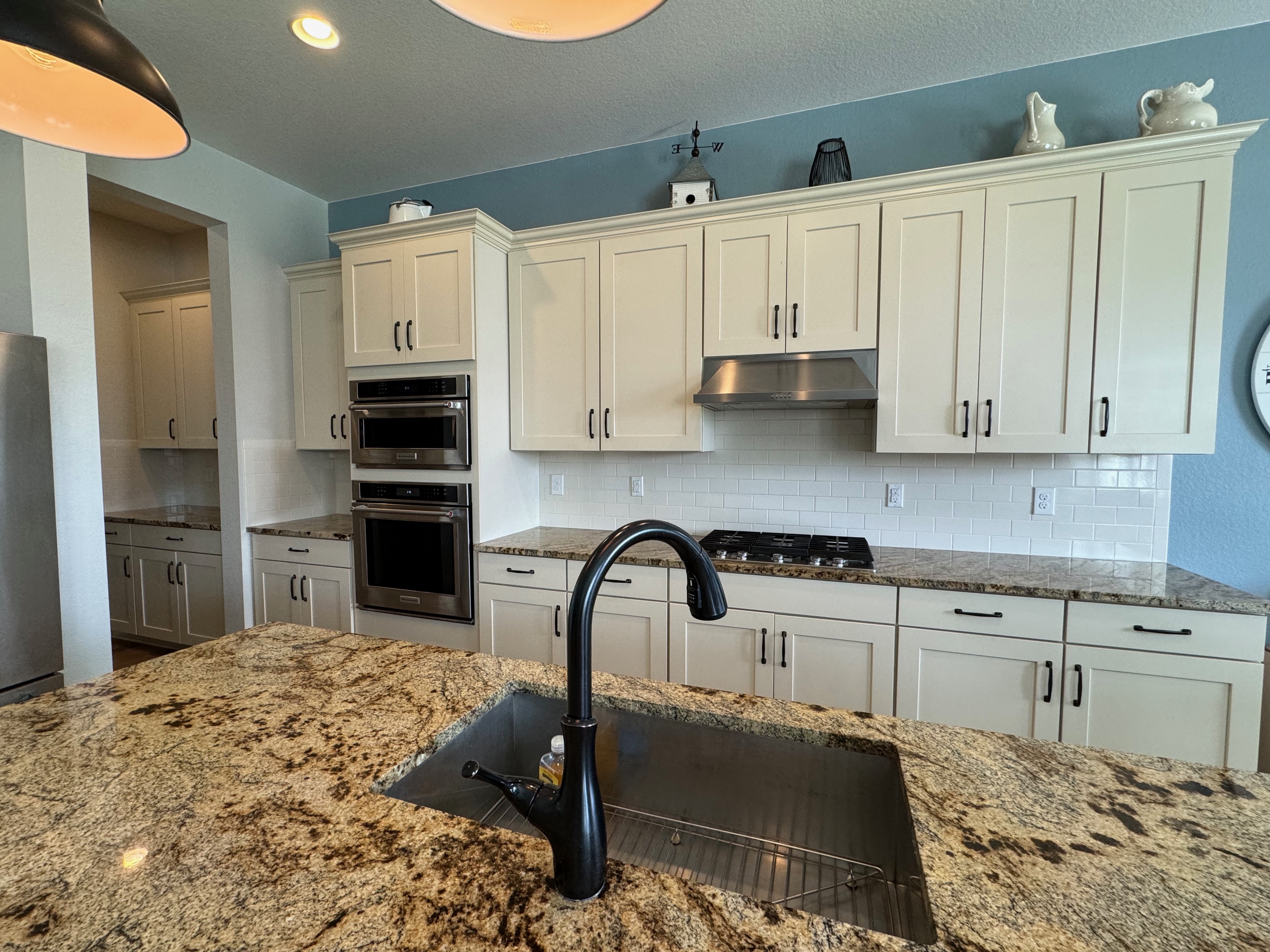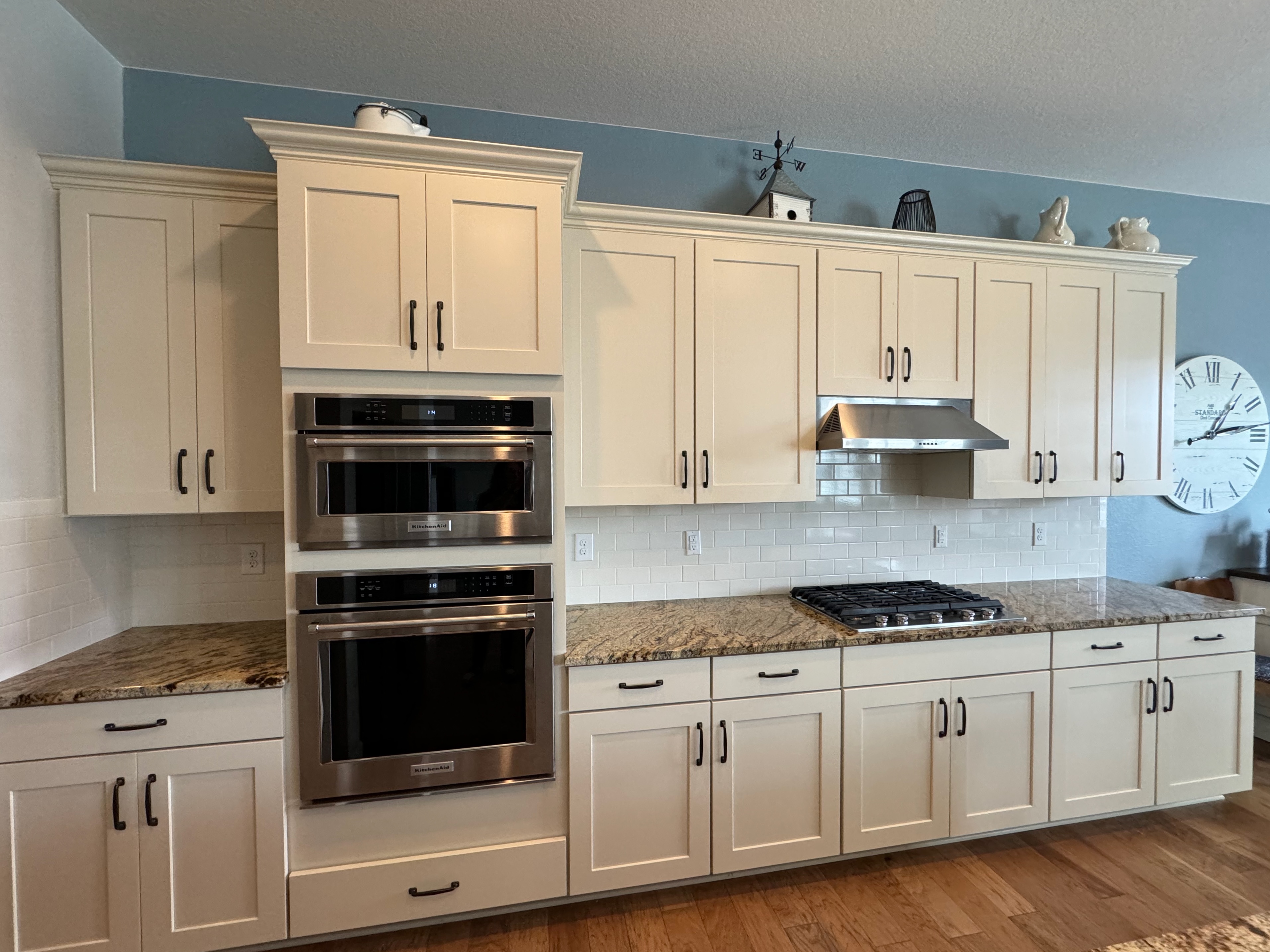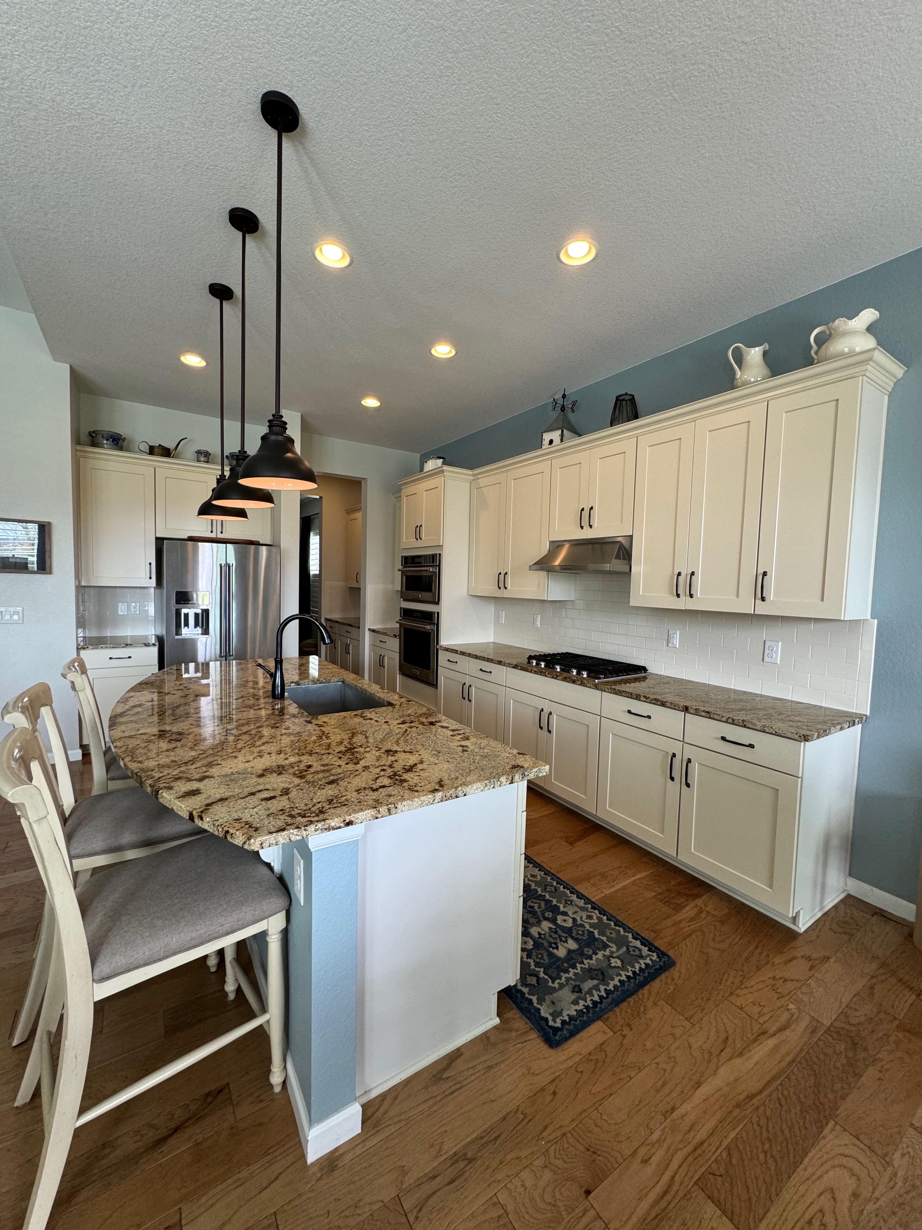 Like New Timberlake Cabinetry, only 7 years old. The cabinet maker is local so you could add additional matching cabinetry. The cabinets are the New Haven door style in a nice painted vanilla shade. Included KitchenAid Stainless Steel appliances, slab granite counter tops, undermount sink, faucet set, disposal and pendant lights. The matching chairs can be included for an additional cost. The kitchen is available to be removed by a qualified buyer or there are licensed contractors available to hire. Price for the kitchen package below.