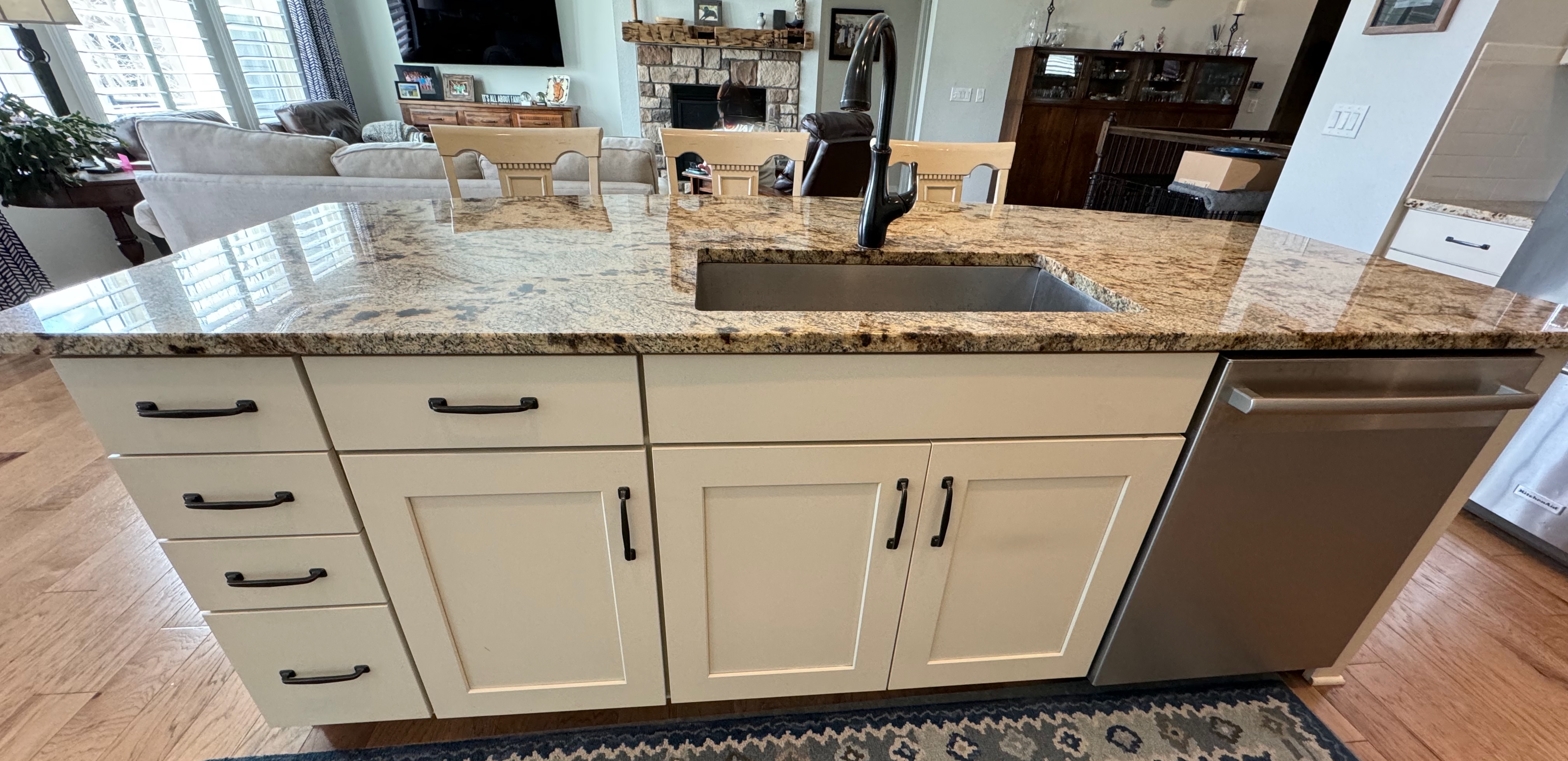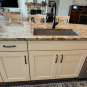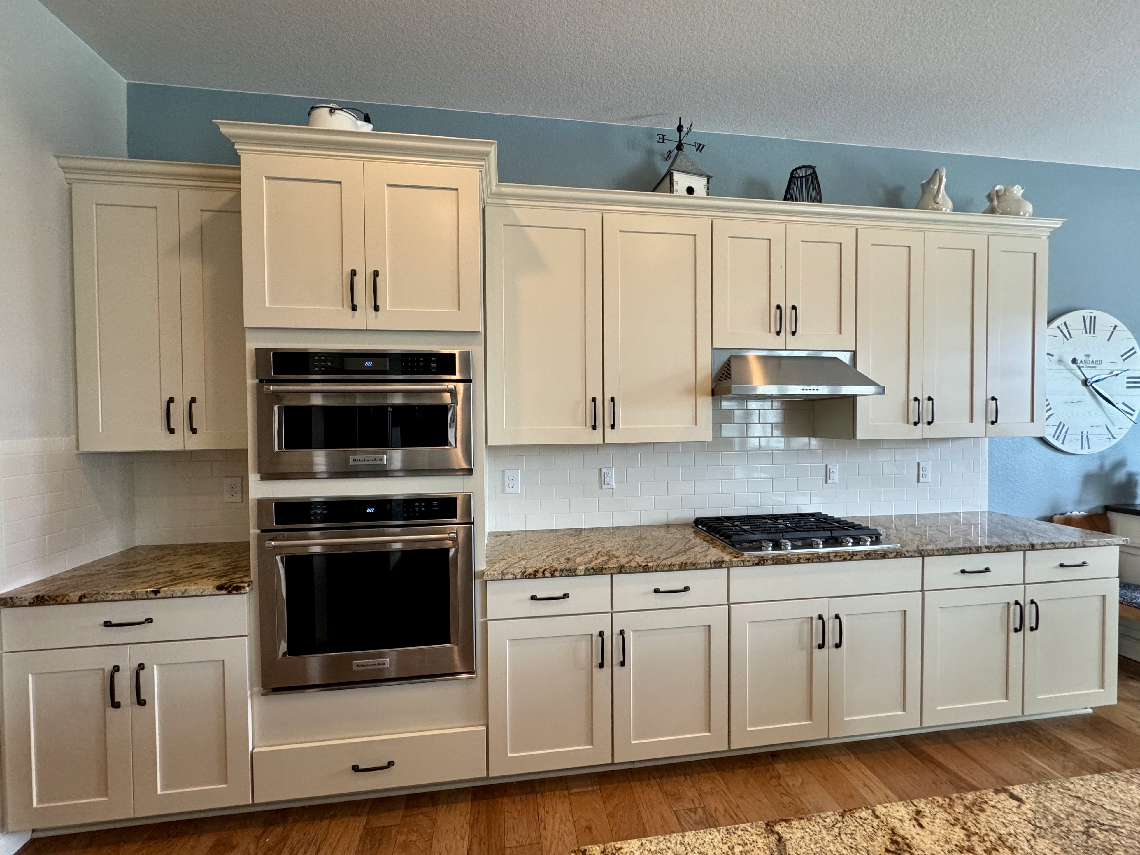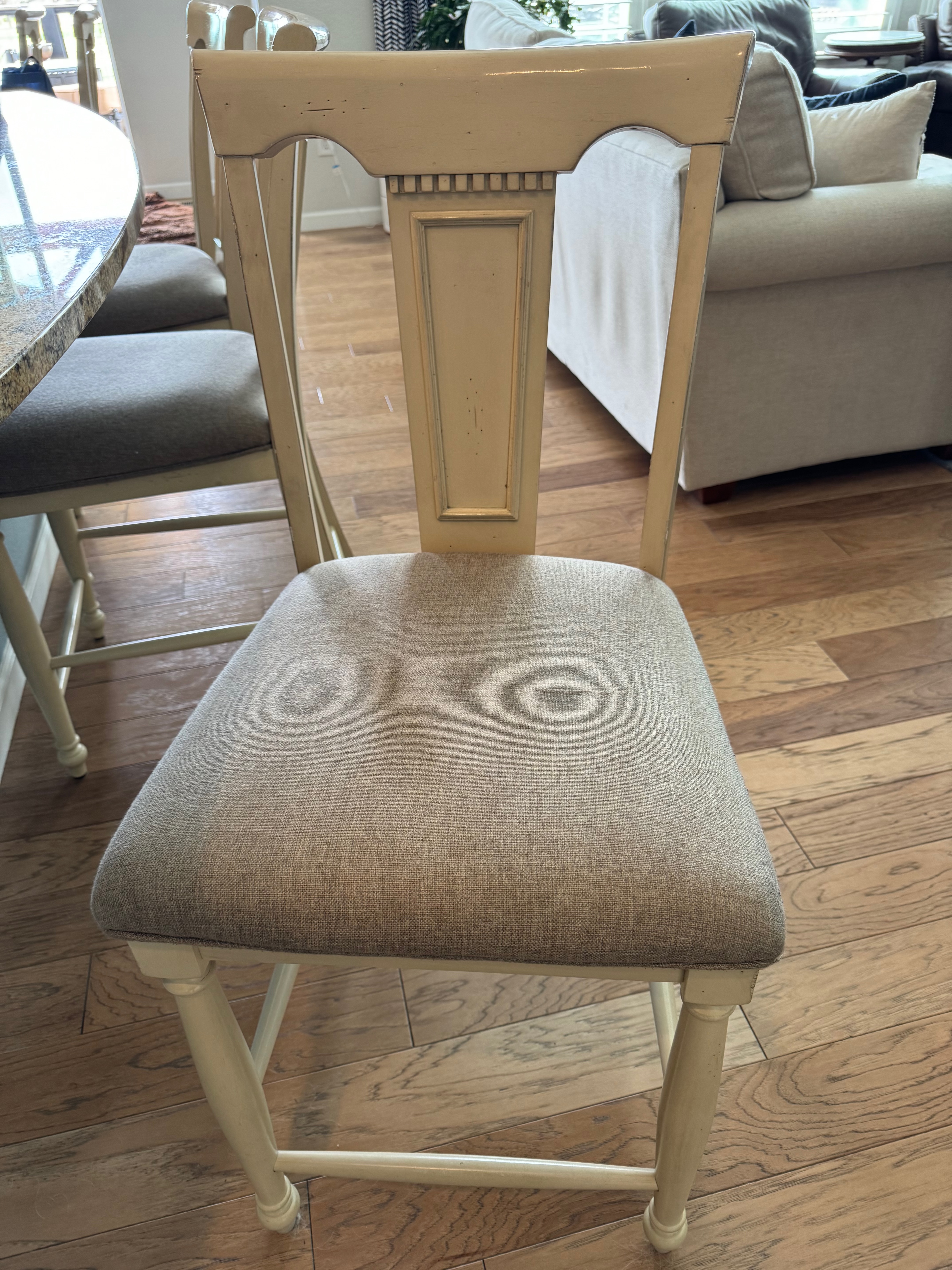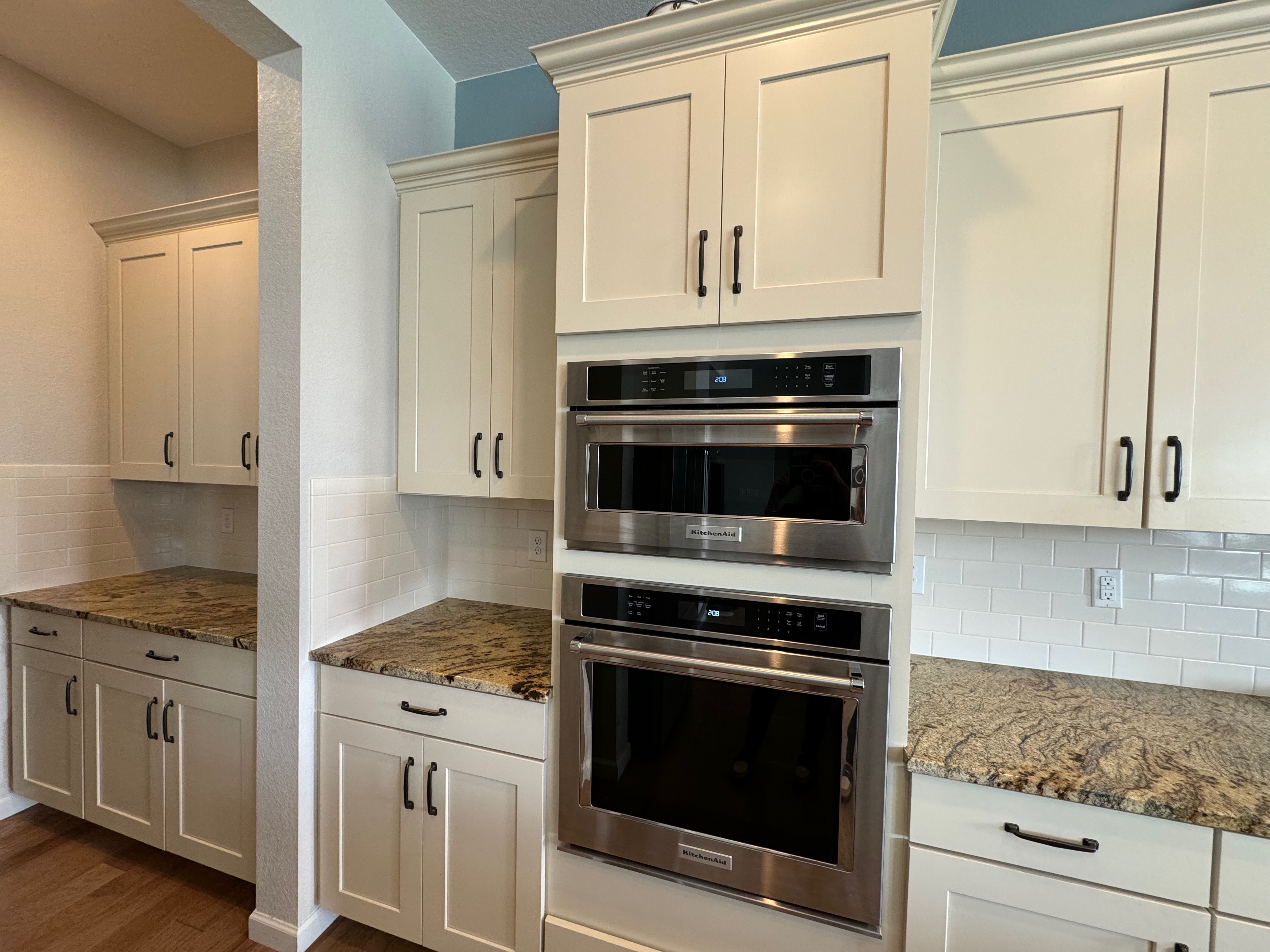 Like New Timberlake Cabinetry, only 7 years old. The cabinet maker is local so you could add additional matching cabinetry. The cabinets are the New Haven door style in a nice painted vanilla shade. Included KitchenAid Stainless Steel appliances, slab granite counter tops, undermount sink, faucet set, disposal and pendant lights. The matching chairs can be included for an additional cost. The kitchen is available to be removed by a qualified buyer or there are licensed contractors available to hire. Price for the kitchen package below.