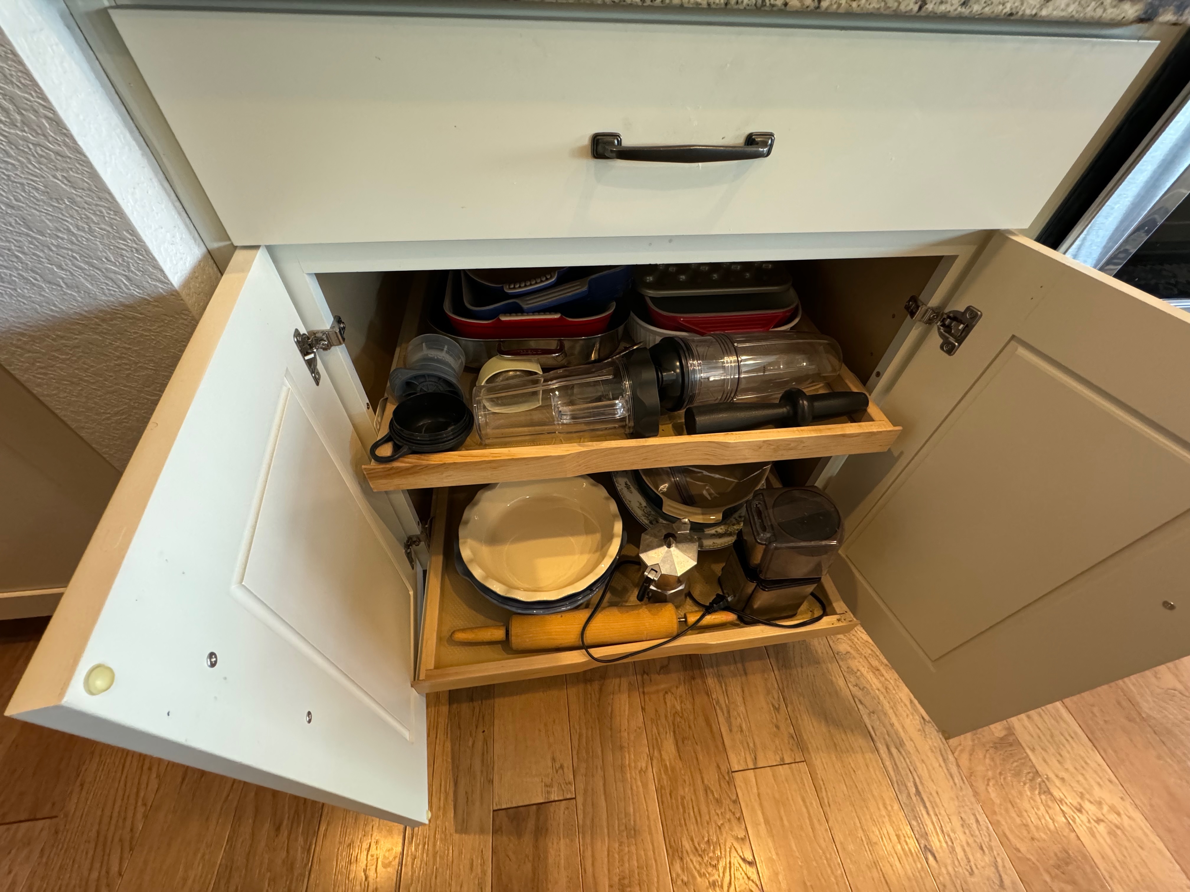 1-One drawer, two door base cabinet, two pull out drawers inside Dim.:30” w x 36”h x 24” d