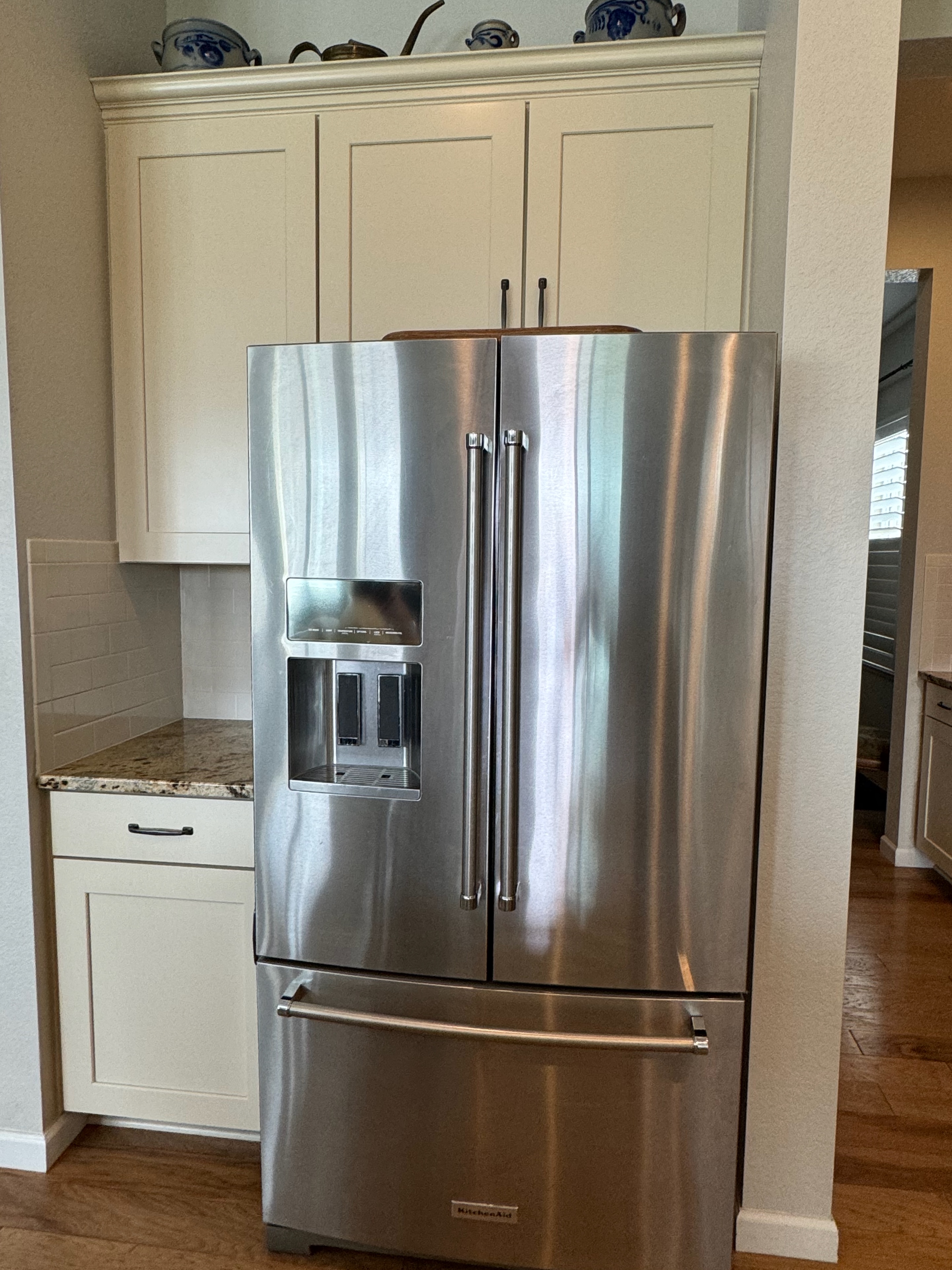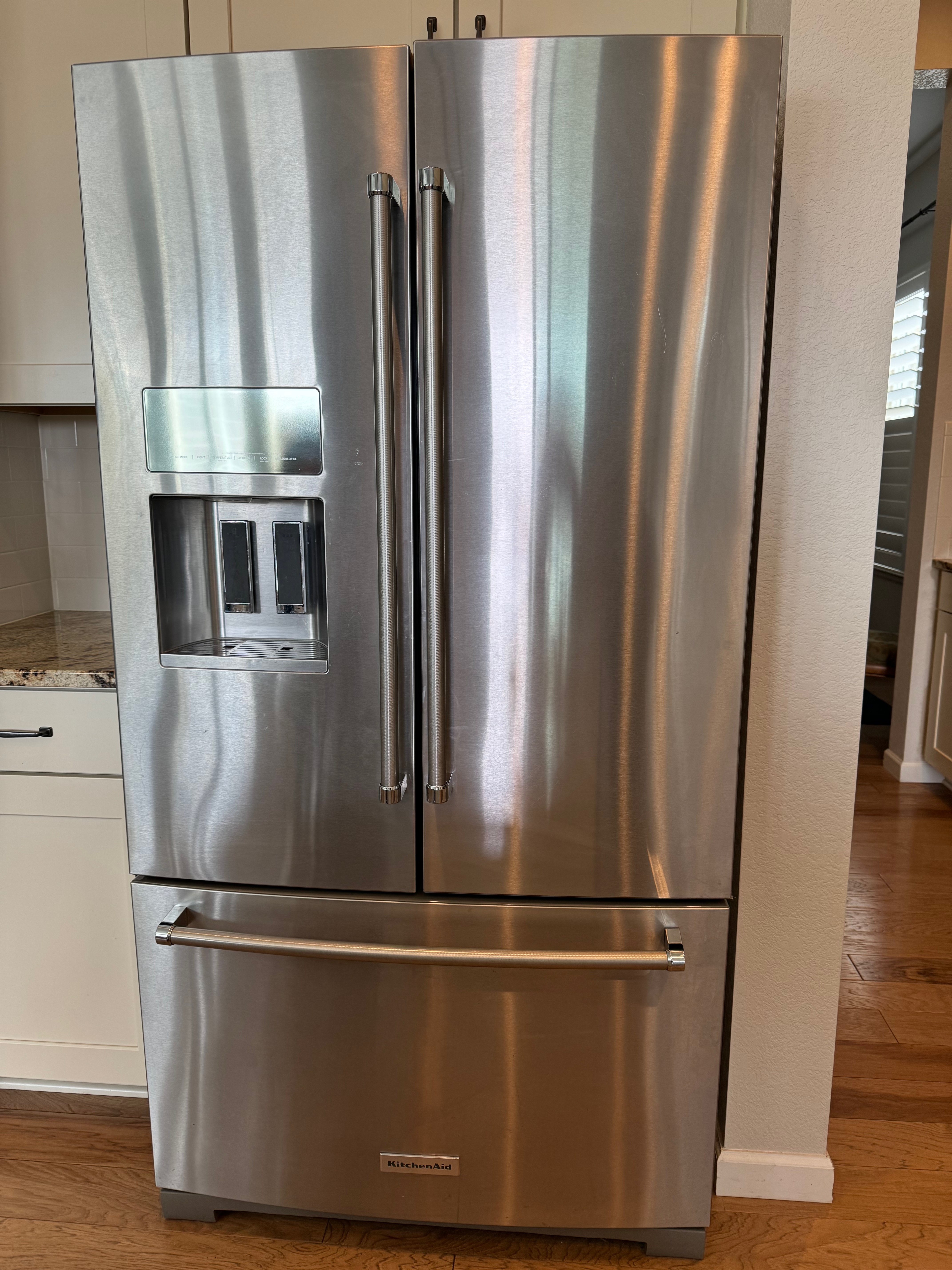 36” KitchenAid French door refrigerator Model# KRFF707ESS01, Serial #K64306707 10/16, Listing price new $3,699