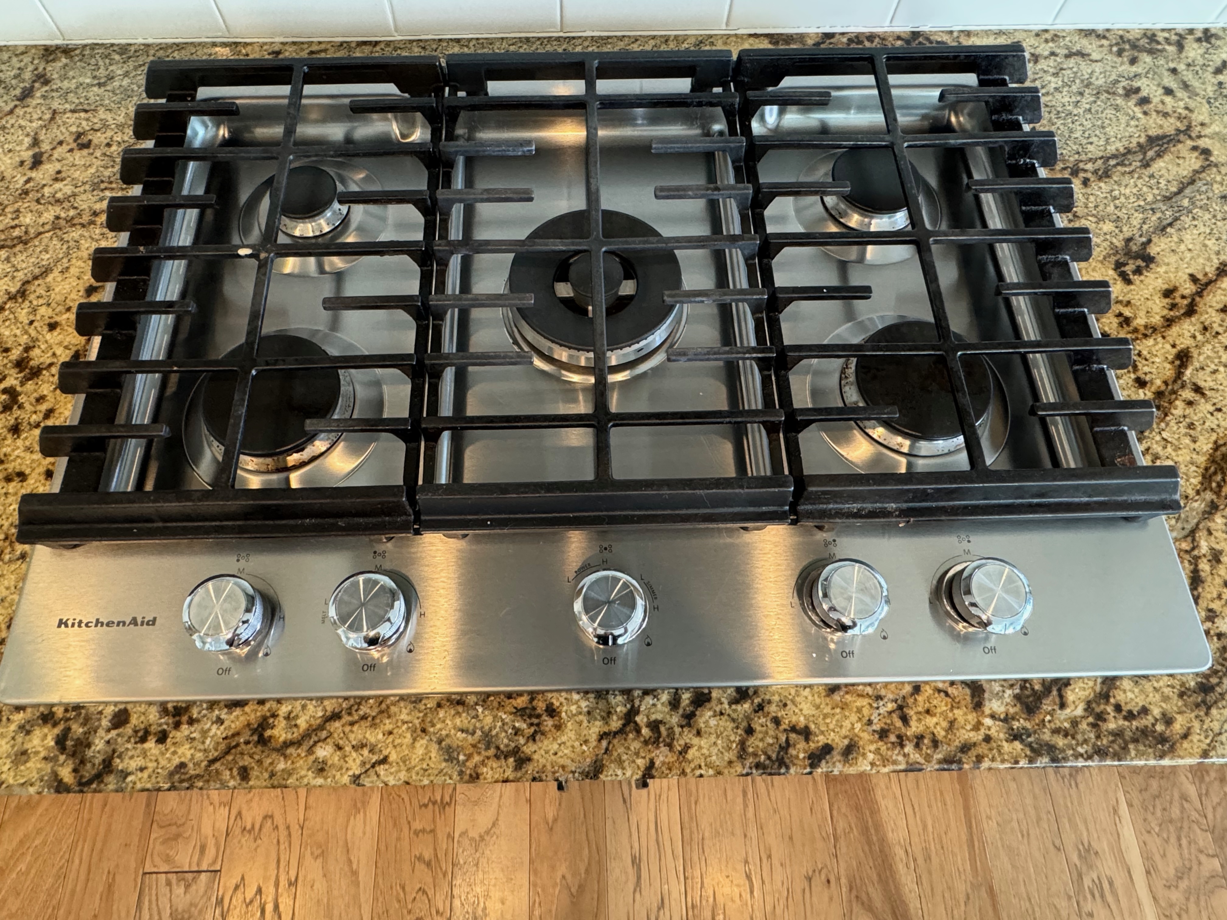 30” KitchenAid 5 Burner gas cooktop Model #KCGS550ESS01 Serial # ,Listing price new $1,148