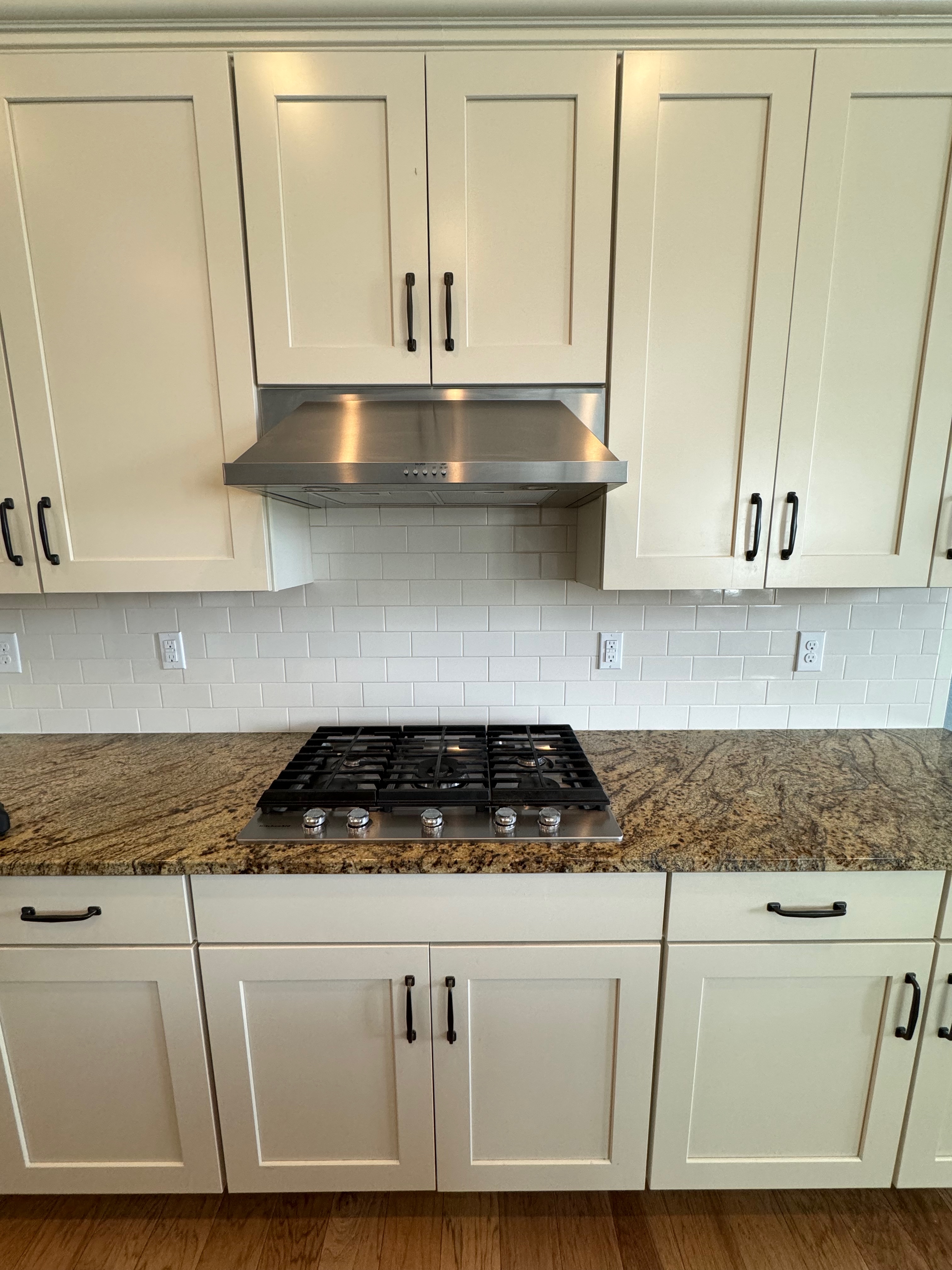 1-Two door wall cabinet over the hood Dim.: 30” w x 24 ½”h/27” h with crown x 12 ½” d