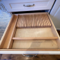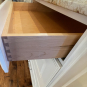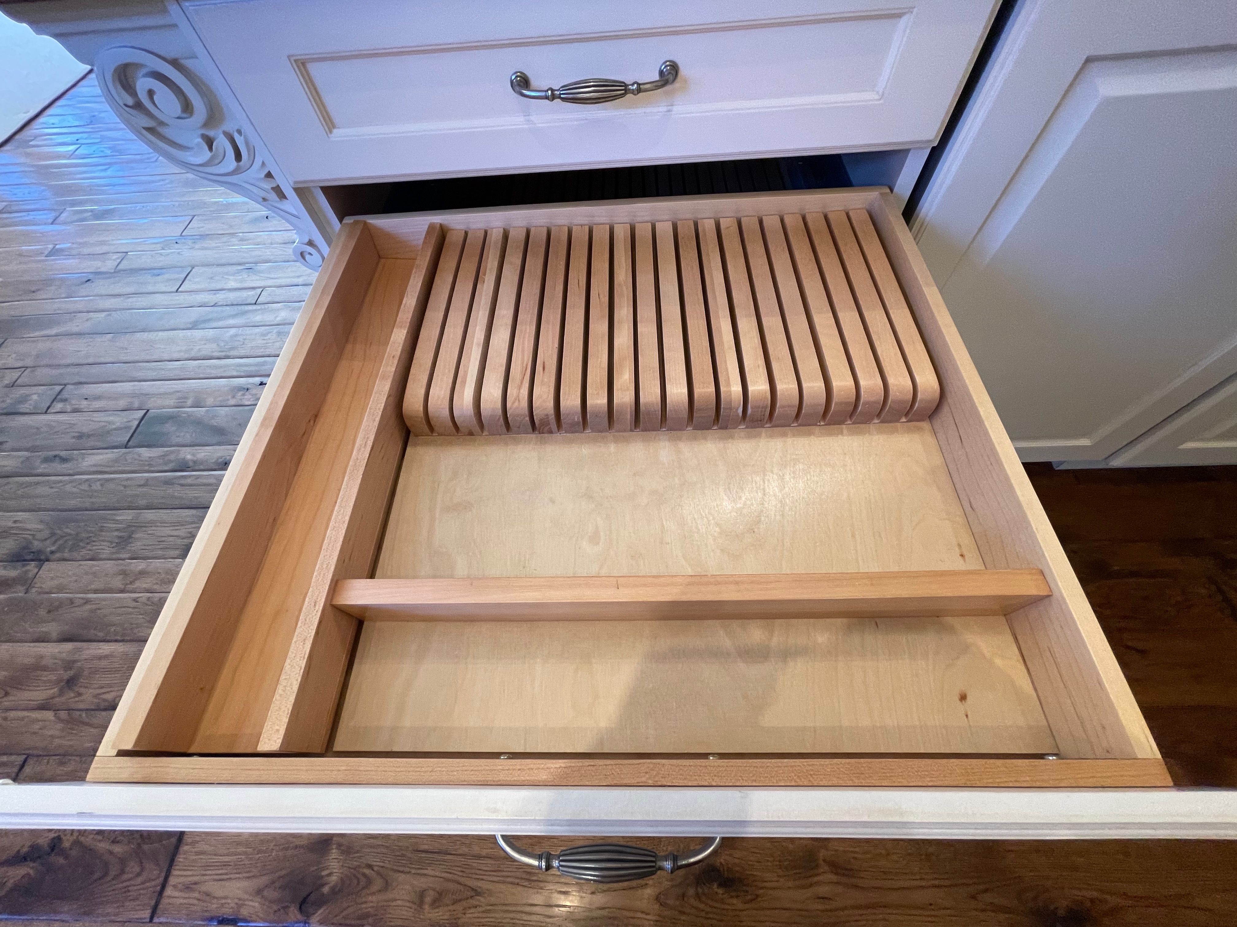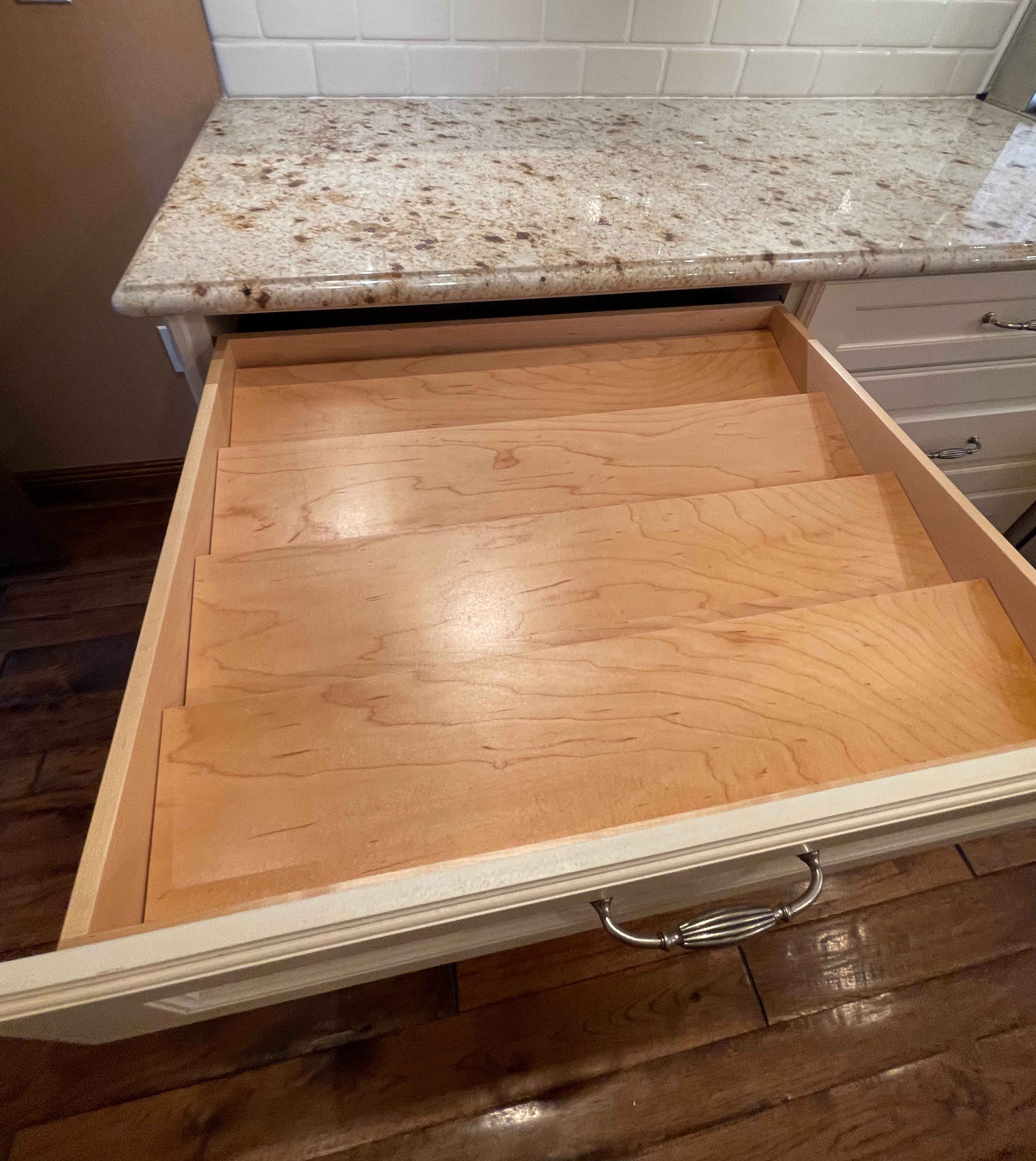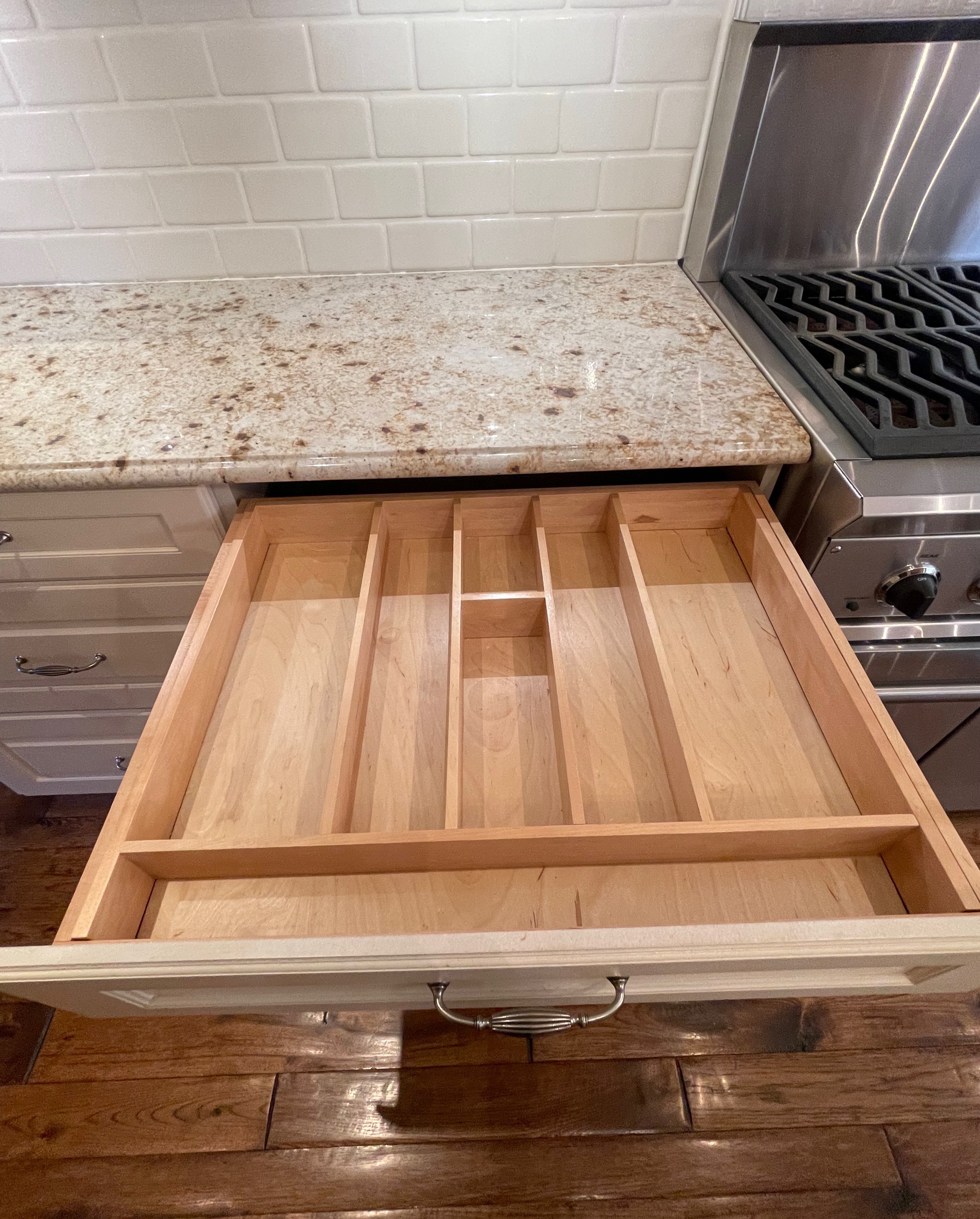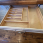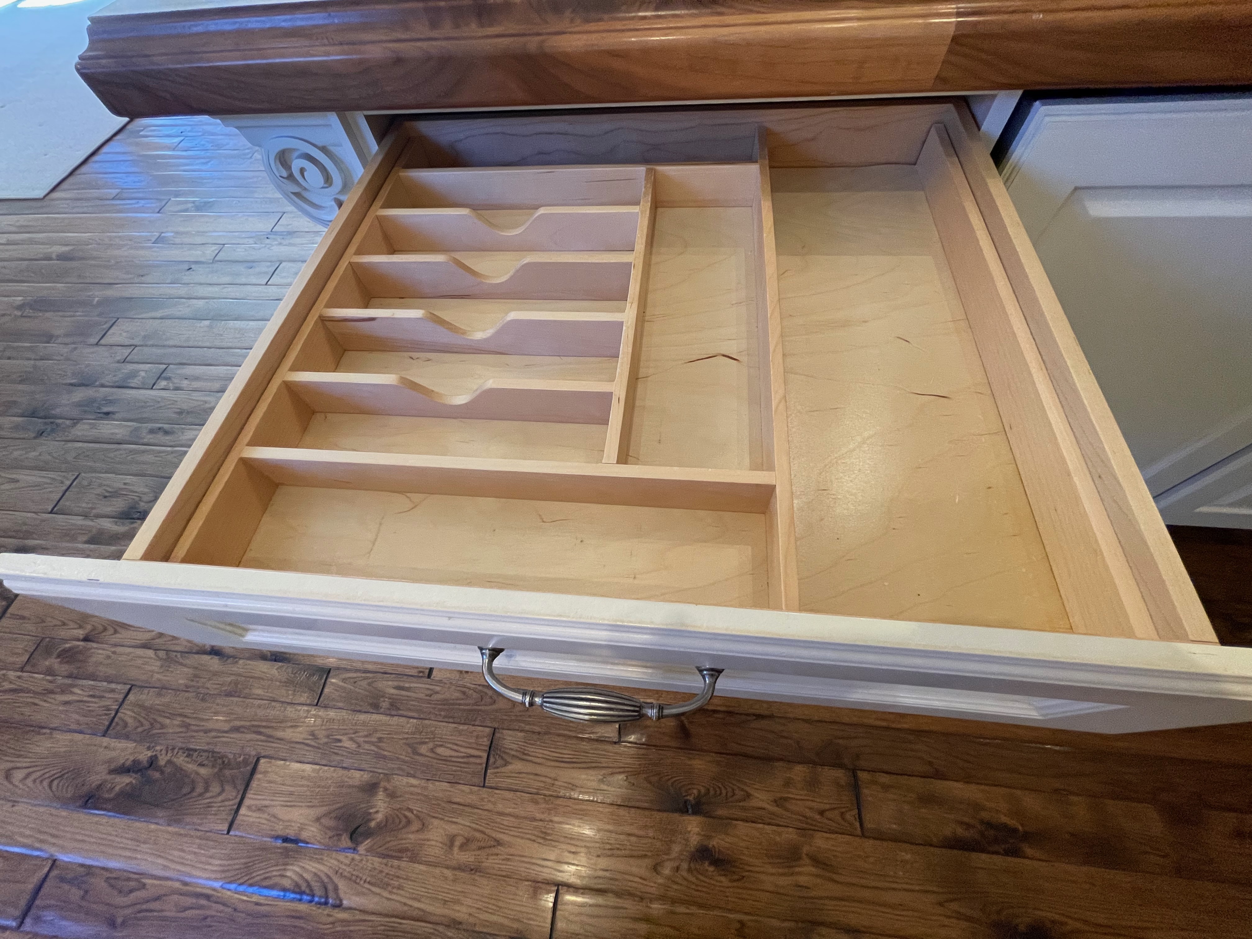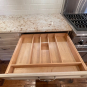 1-Four drawer base cabinet w/ flatware divider and 2 drawers for cutlery and utensils Dim.: 28“w x 36”h x 24“d, finished panel end