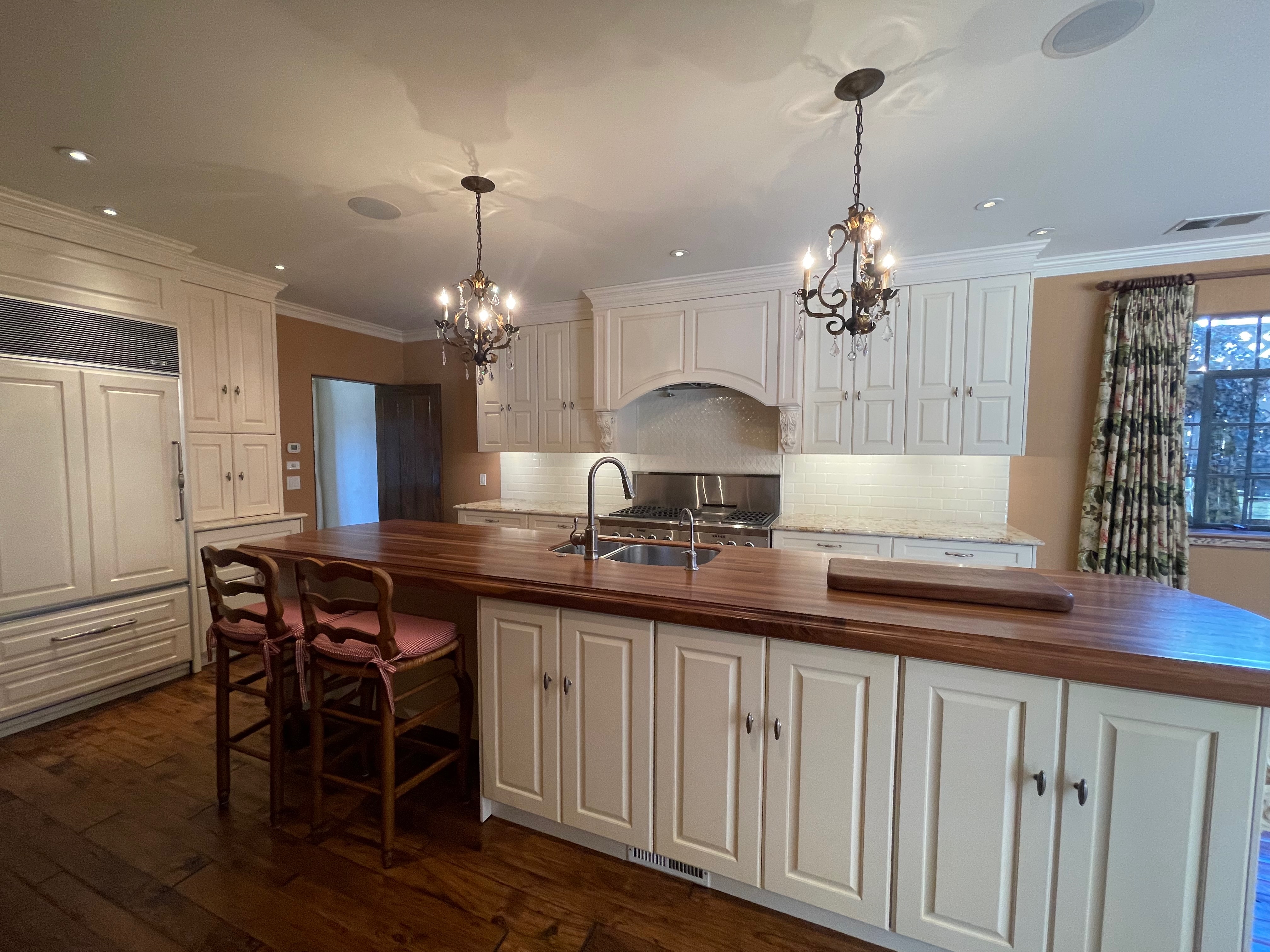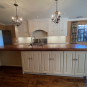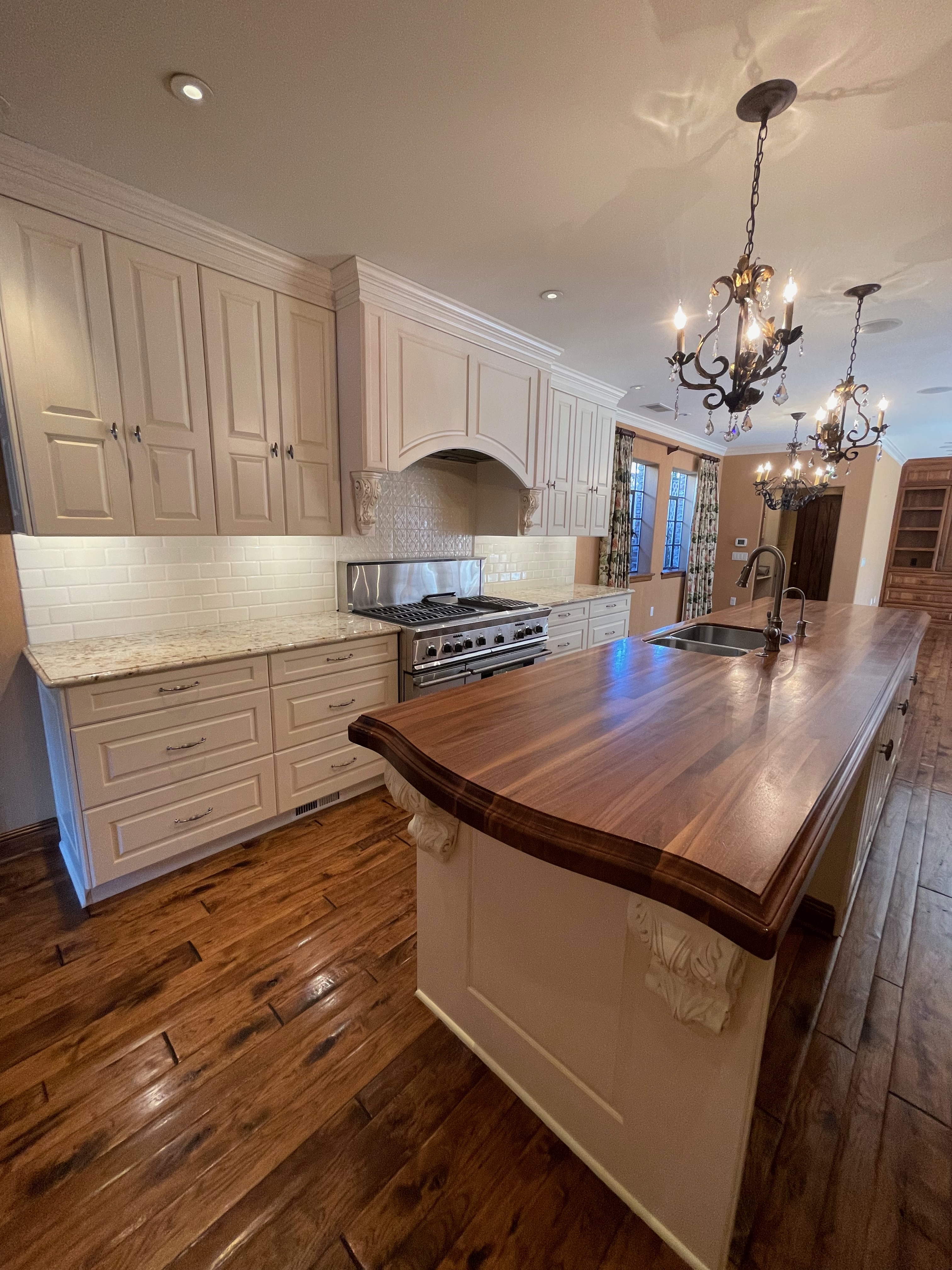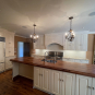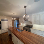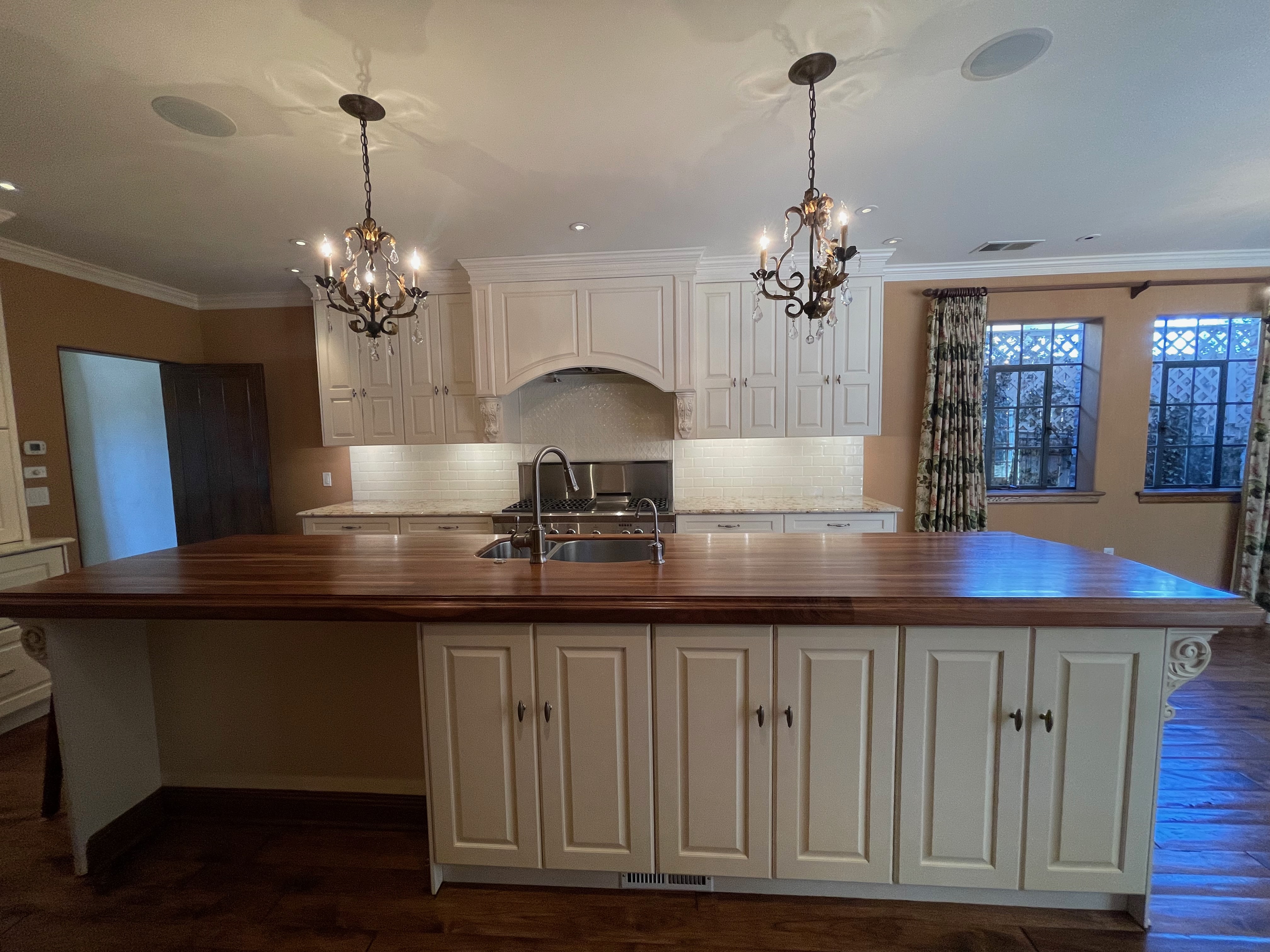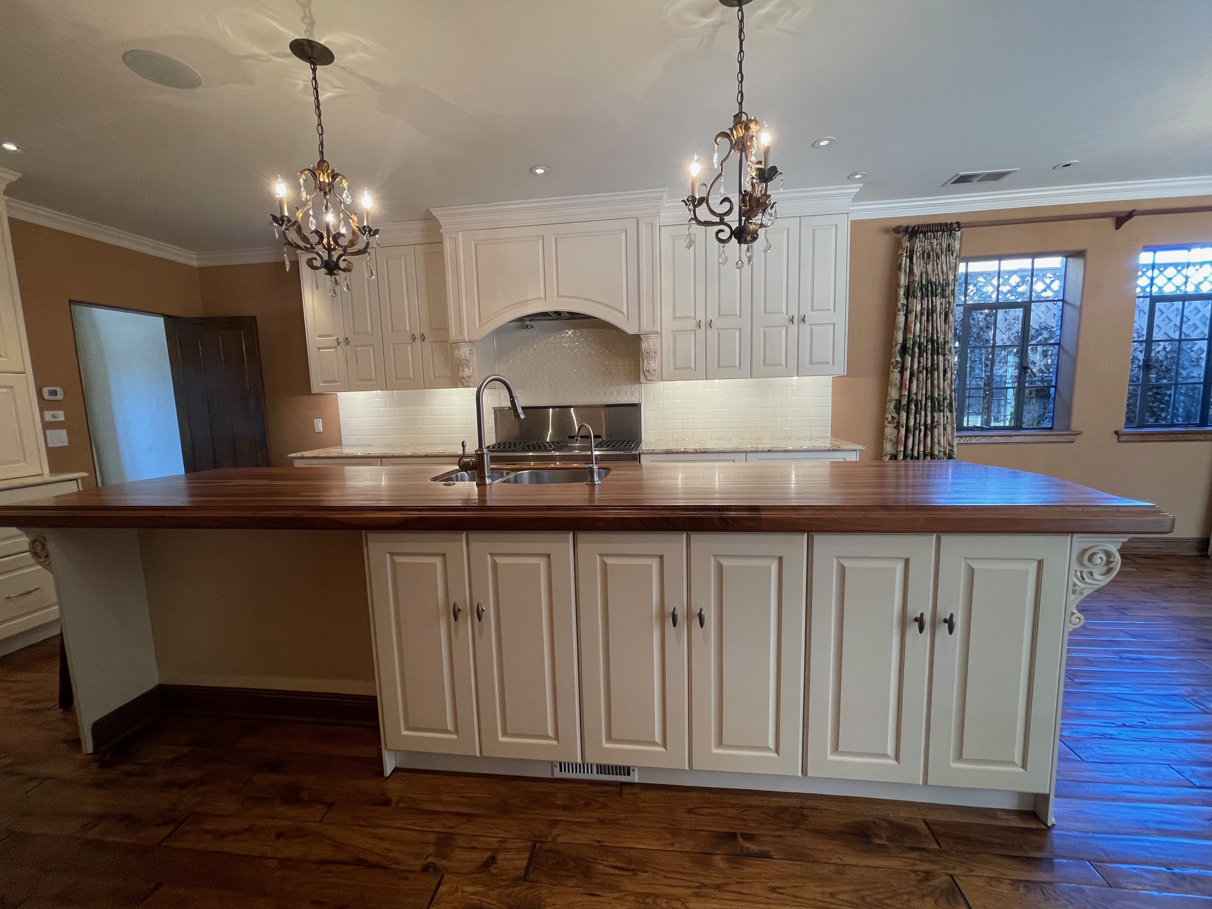 ISLAND BASE CABINETS w/ Wood island counter & two pendant lights