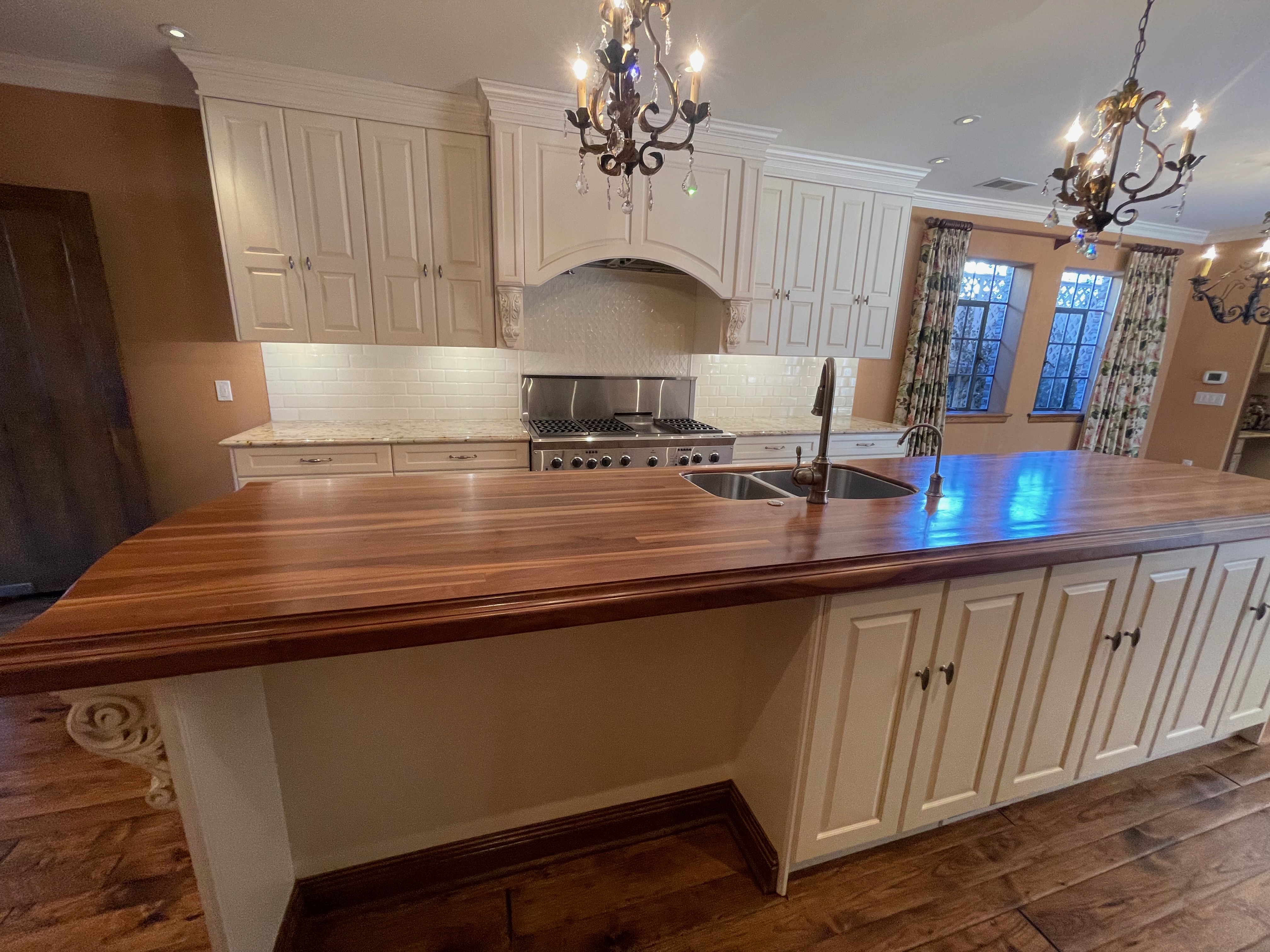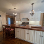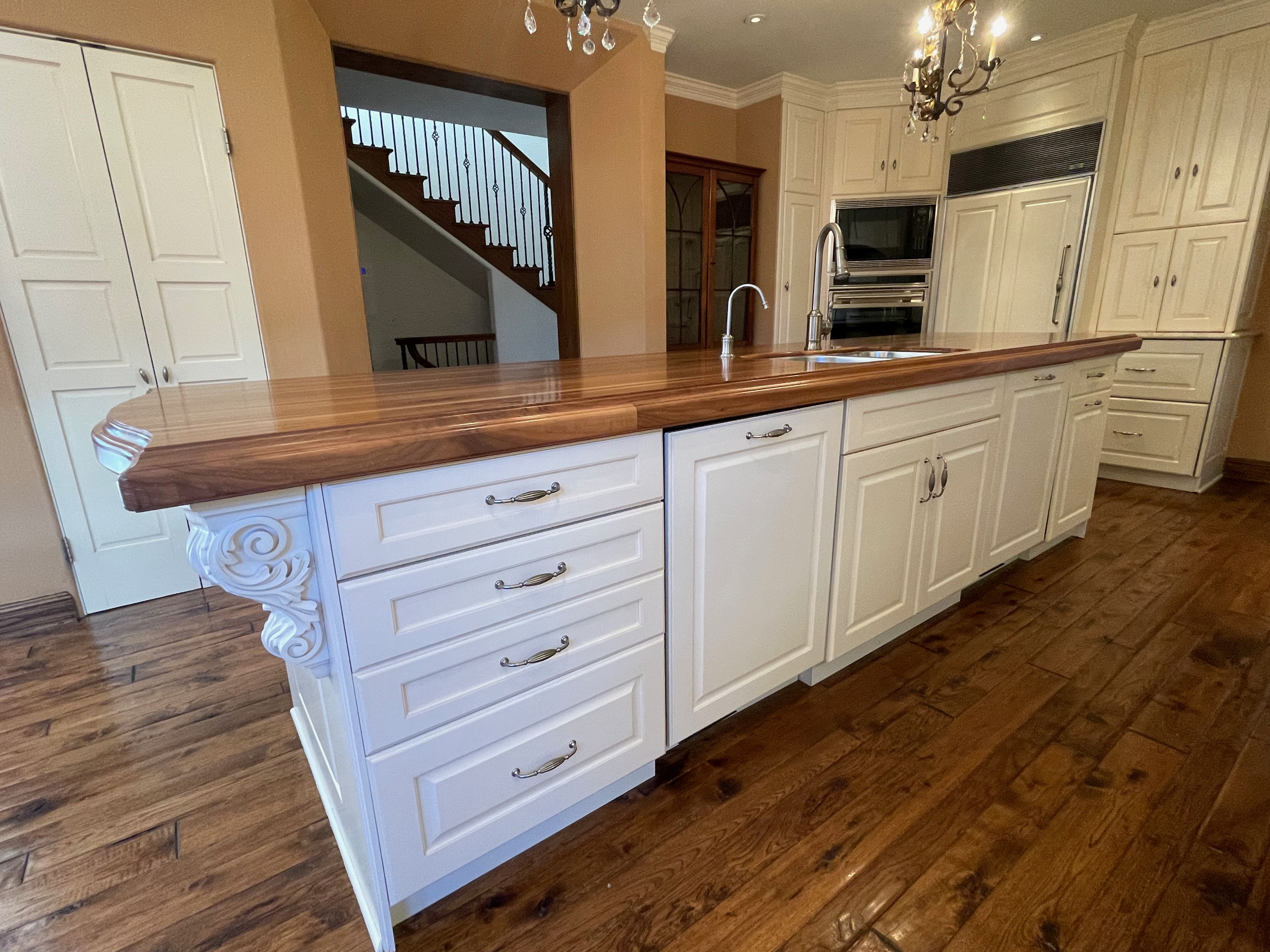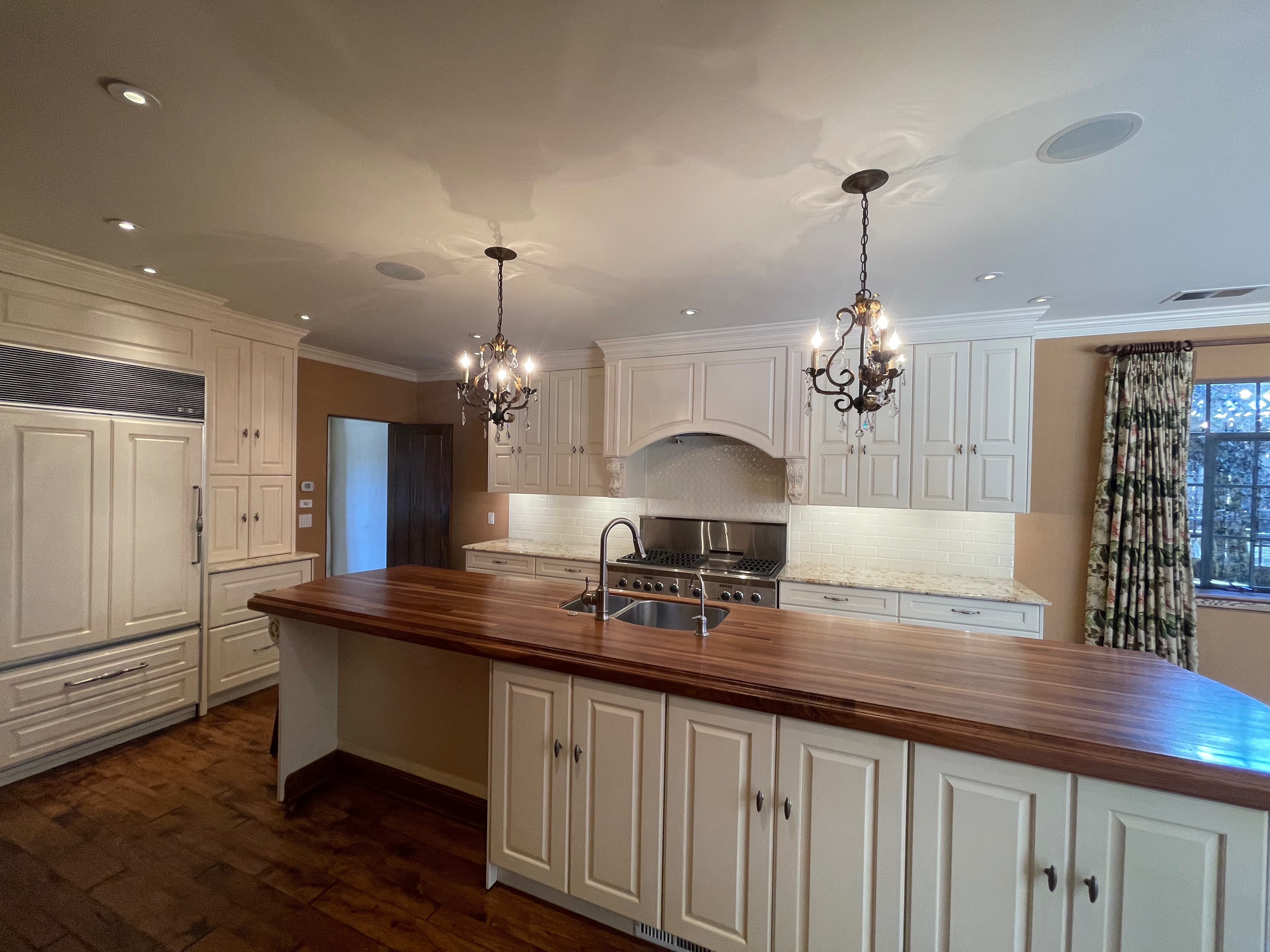 ISLAND BASE CABINETS w/ Wood island counter & two pendant lights