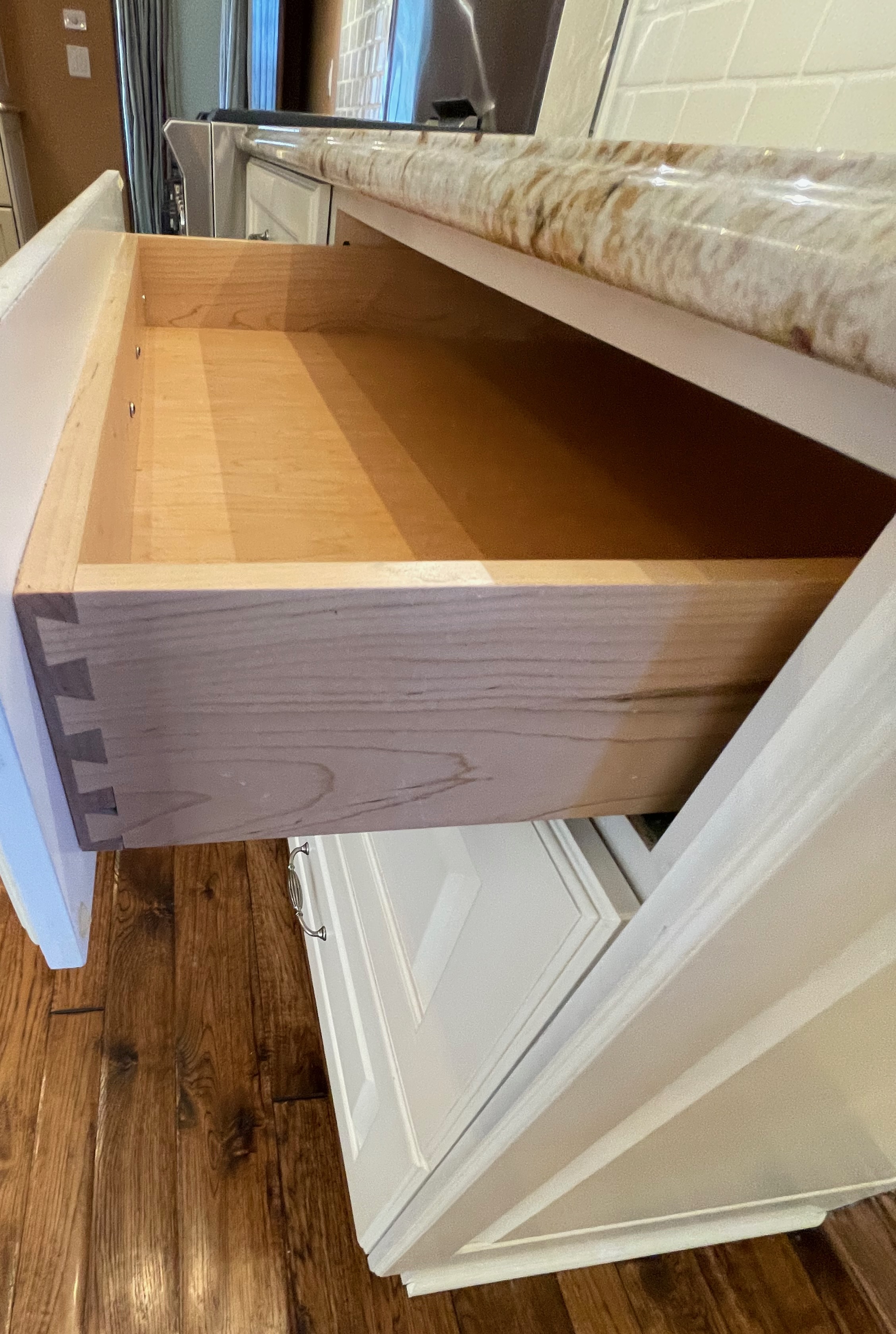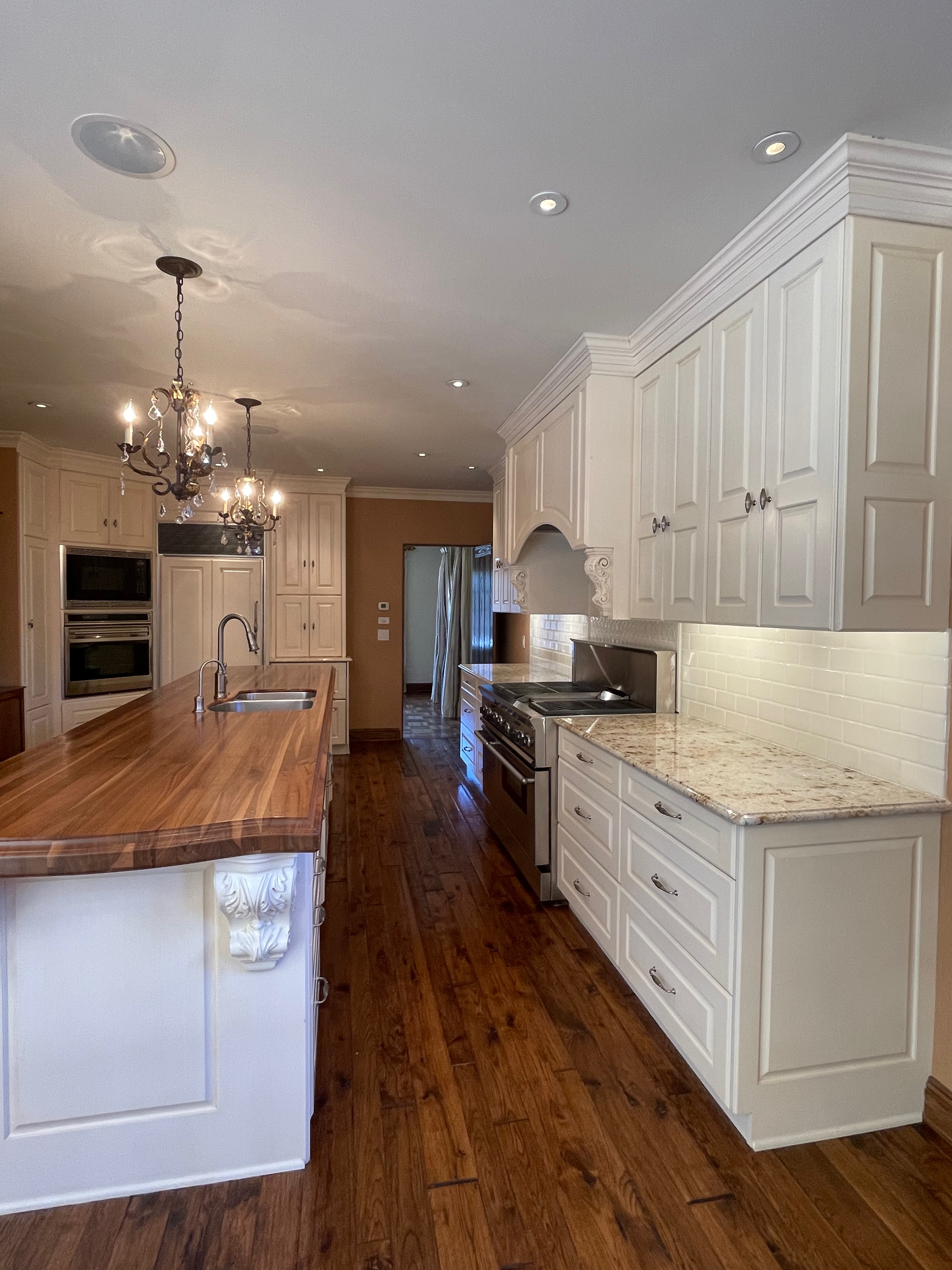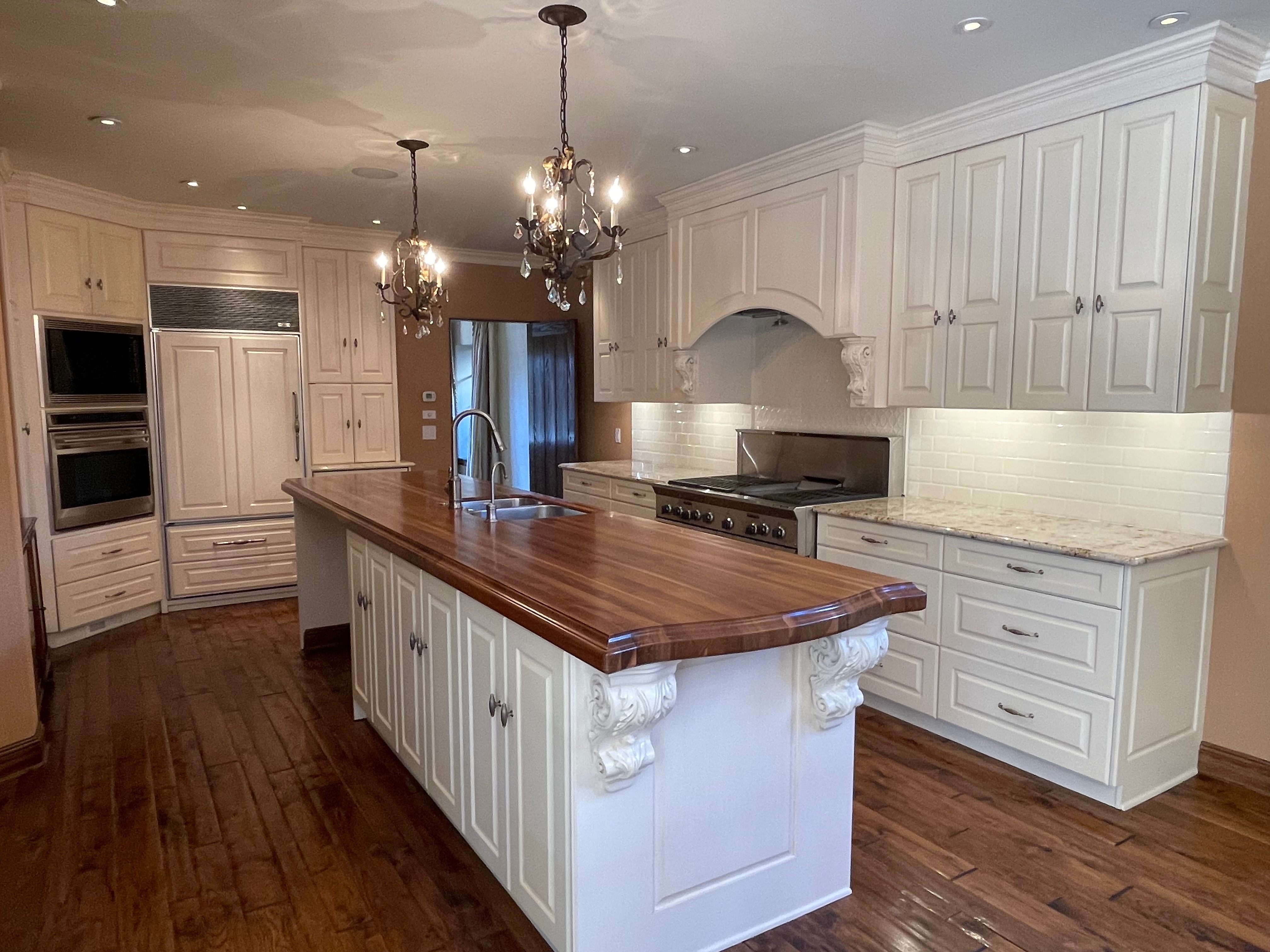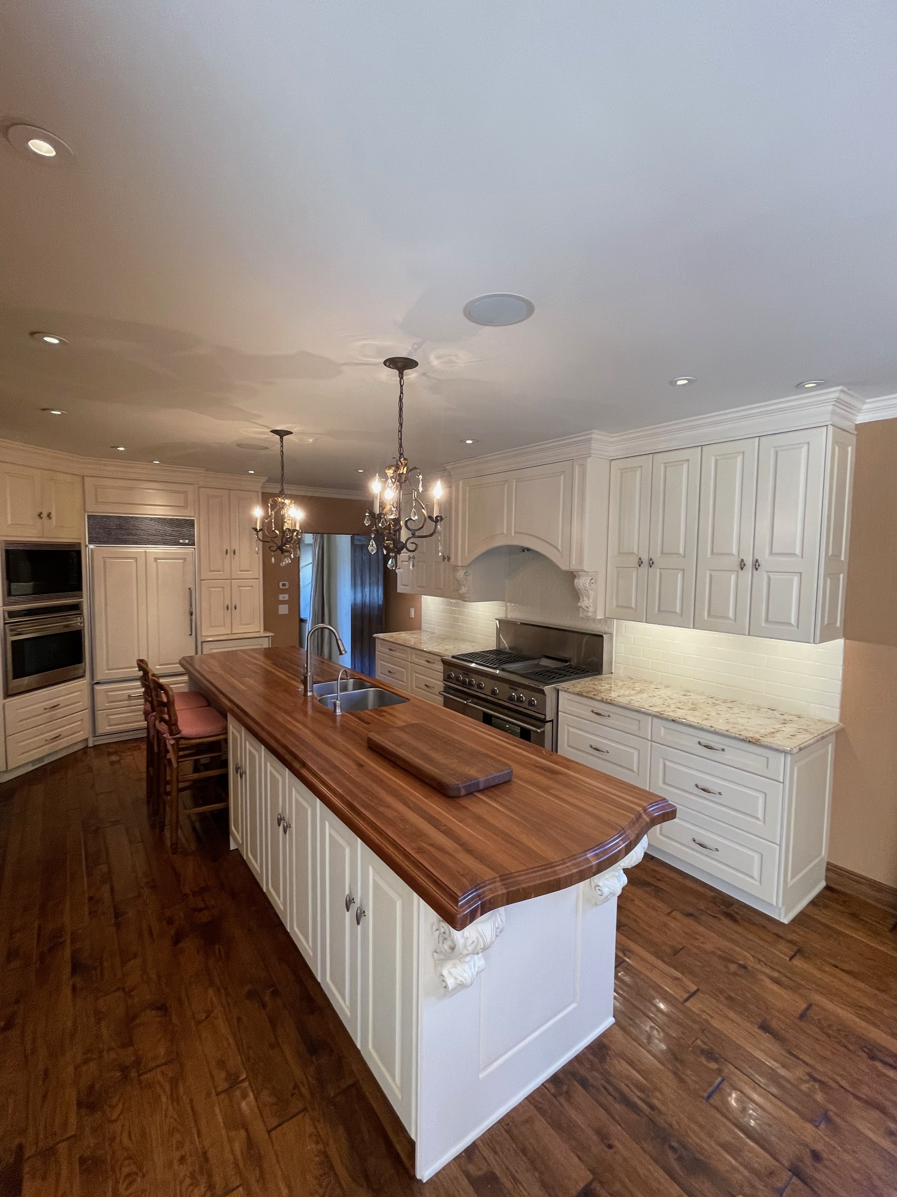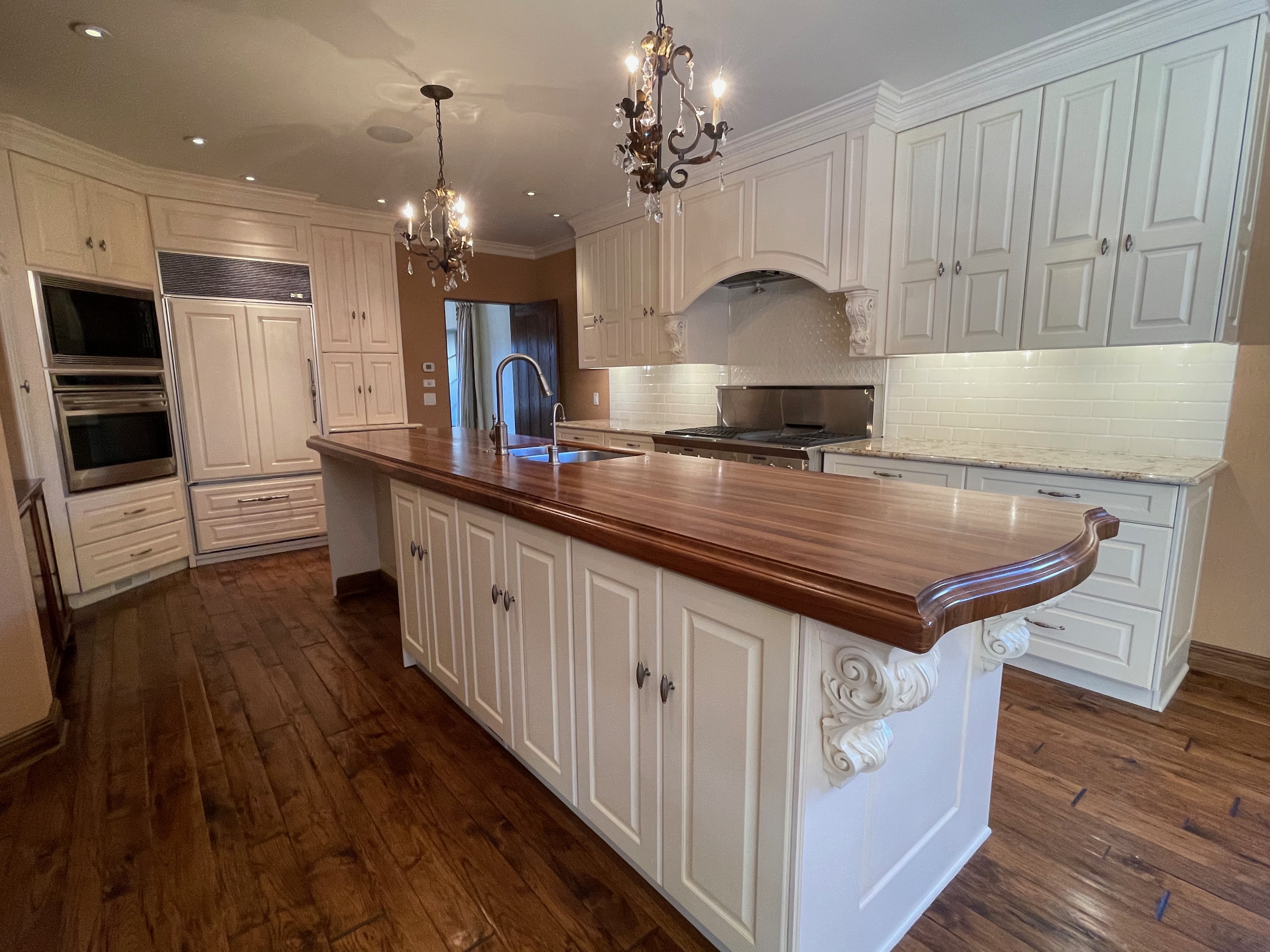 Like new! Custom made kitchen cabinets in an off white with soft close drawers and doors, dovetail drawers and wood inserts for spices, cutlery, flatware and cooking utensils. The cabinetry is in excellent condition! Wolf, Sub-Zero and Thermador appliances included plus a gorgeous walnut island top! The kitchen package can be removed anytime by a qualified buyer or we have licensed sub-contractors that can be hired to uninstall and move the kitchen but must be removed by the end of April tbd project start date.