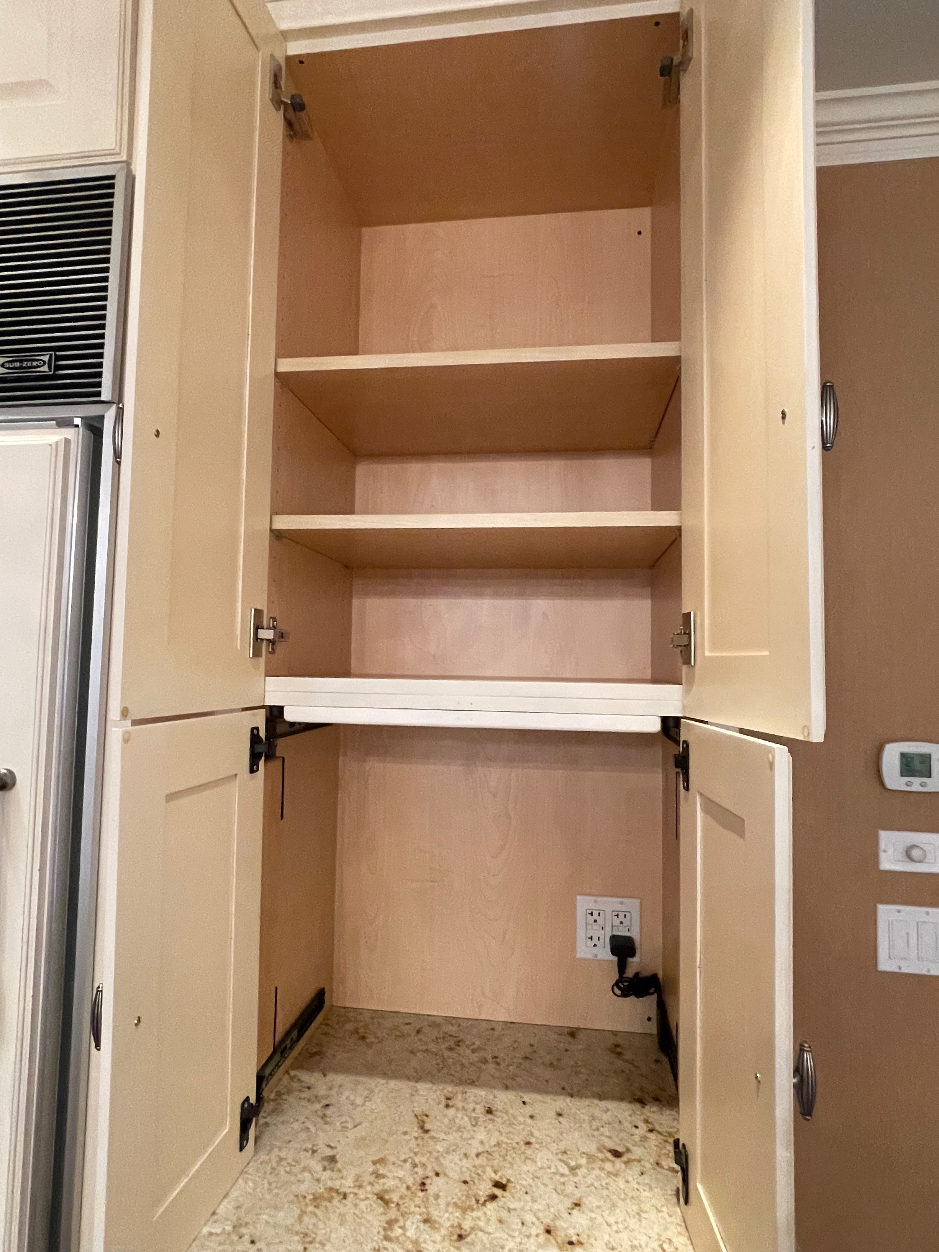 1-4 door wall counter cabinet w/ an appliance garage below Dim.: 24“w/ 27”w w/filler and finished panel x 61“h/67 ”h w/crown x 8“d *Finished panels on the exposed ends