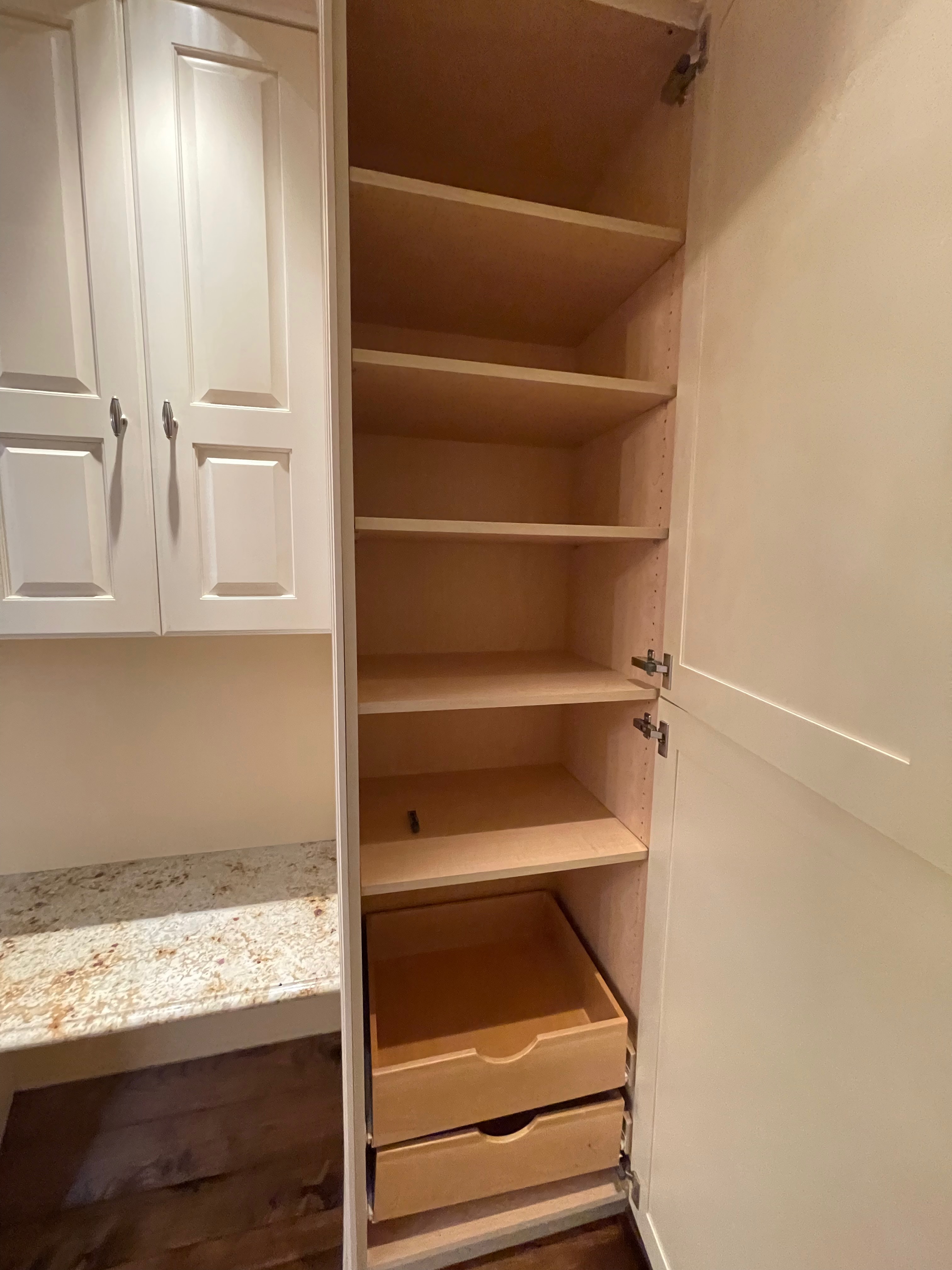 1-Two door pantry double tall wall cabinet w/two pull out drawers off the kitchen Dim.: 24“w/26” w x 94“h/99”h w/crown x 20”d