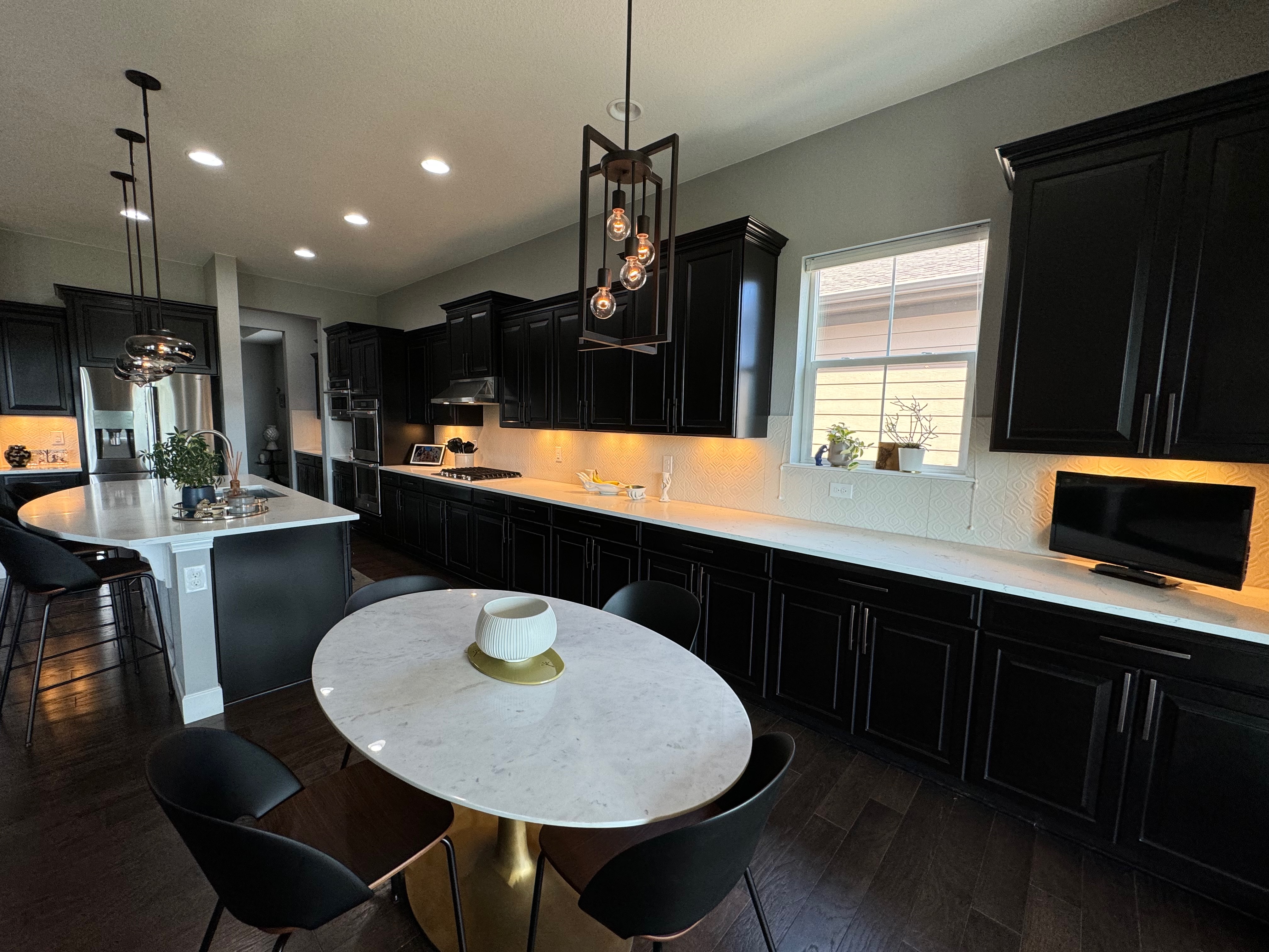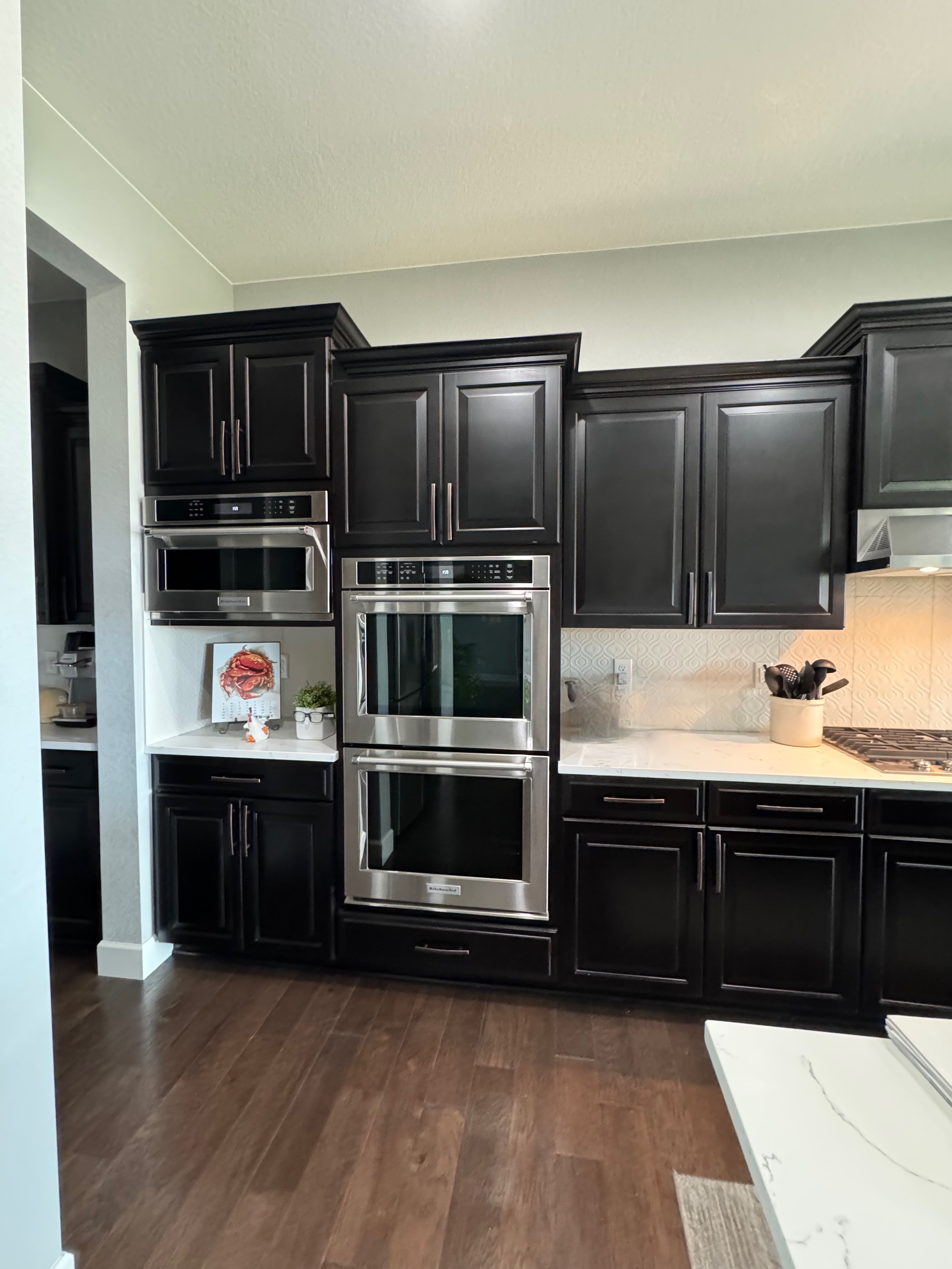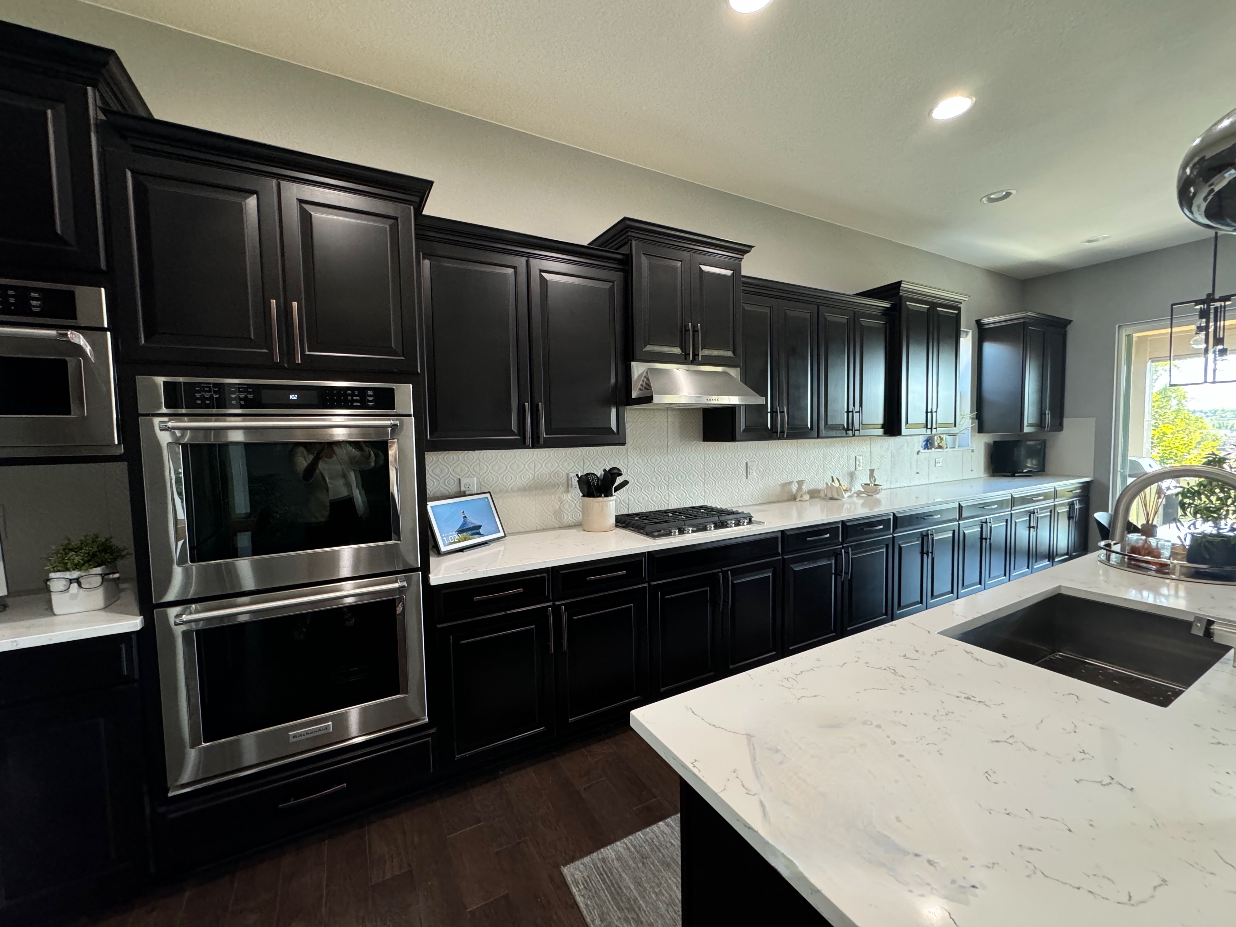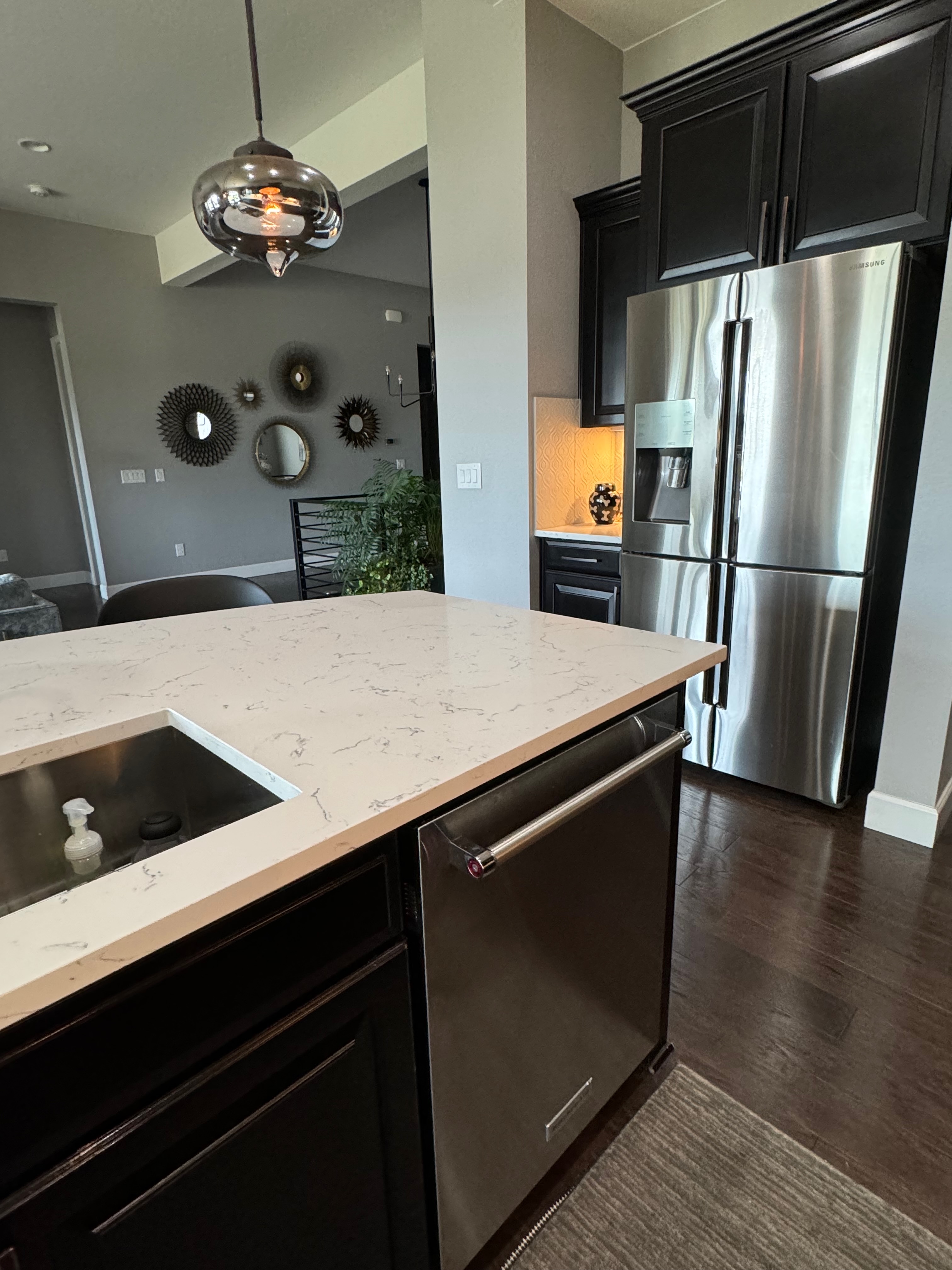 Like New! Timberlake Kitchen Cabinetry, only 7 years old. The cabinets are the Rushmore door style in a Maple wood with a raised panel overlay in a nice Espresso finish. The cabinets have bow pull door hardware in Verona bronze. The cabinets have dove-tail drawers and lots of pull-out drawer inserts inside. The cabinet maker is local so you could add additional matching cabinetry. Included are gorgeous Quartz slab countertops along with KitchenAid and Samsung Stainless Steel Appliances. The kitchen is available to be removed by a qualified buyer or there are licensed contractors available to hire after Christmas by 1/5/25. Price for the kitchen package below.