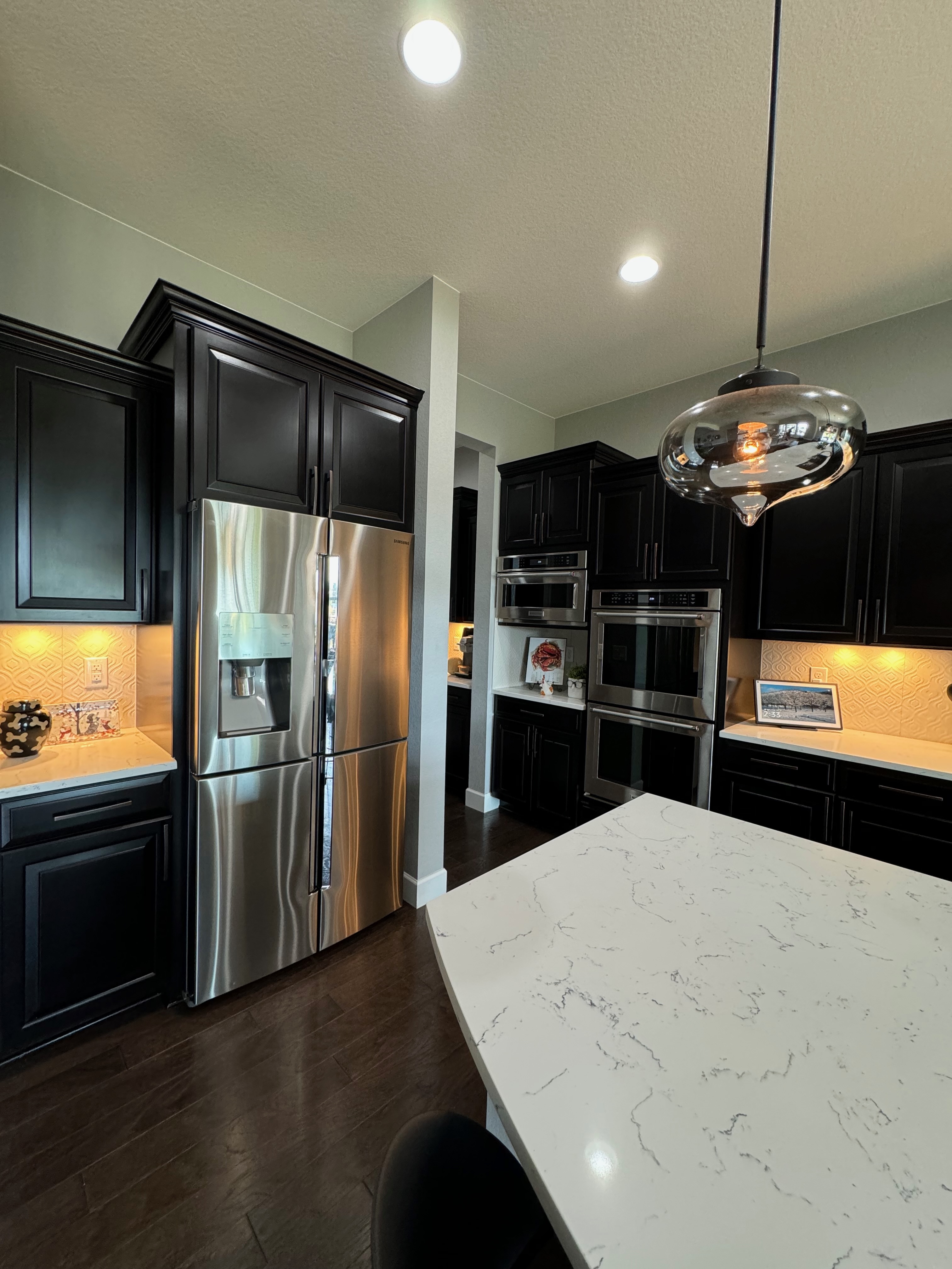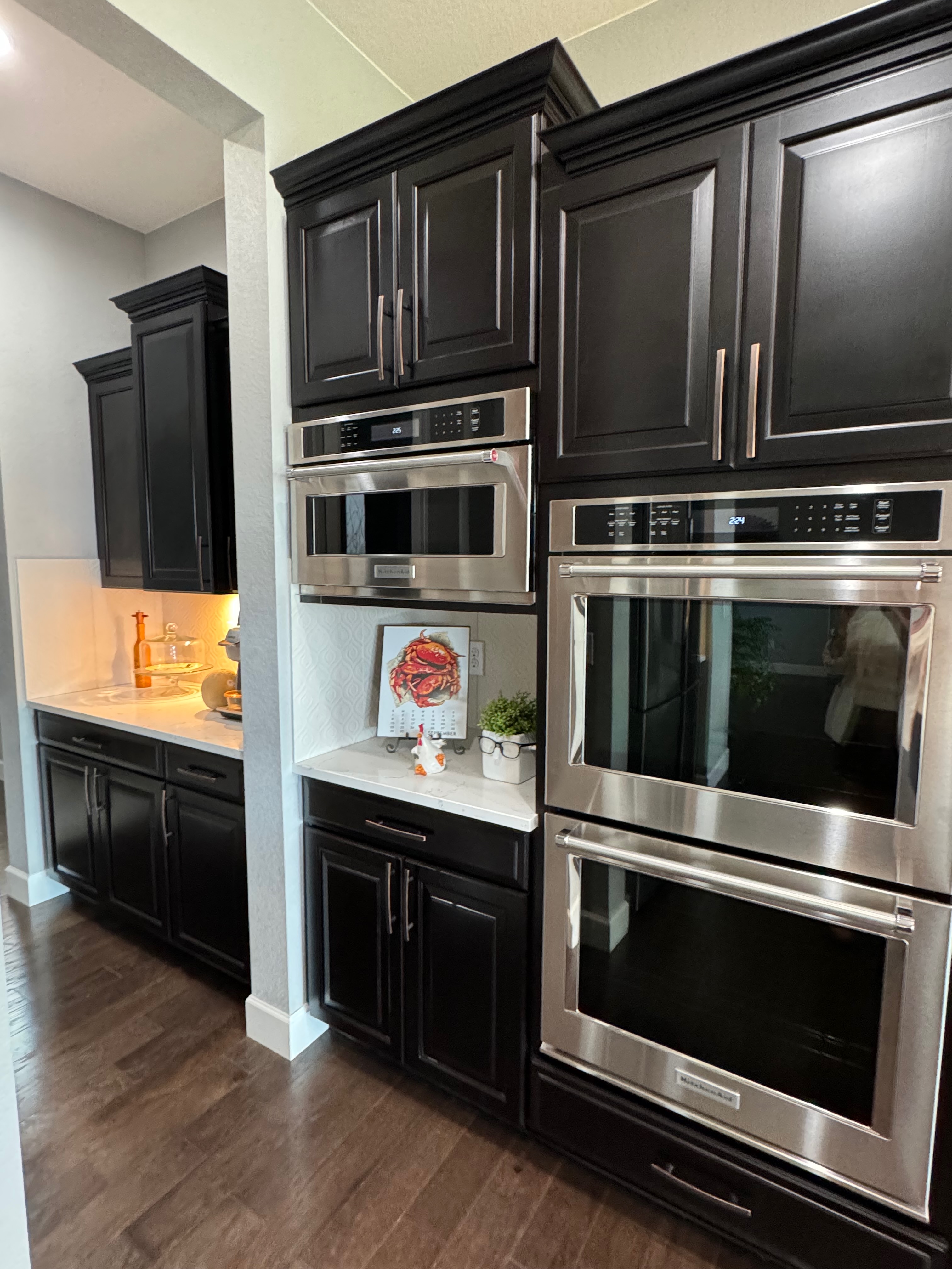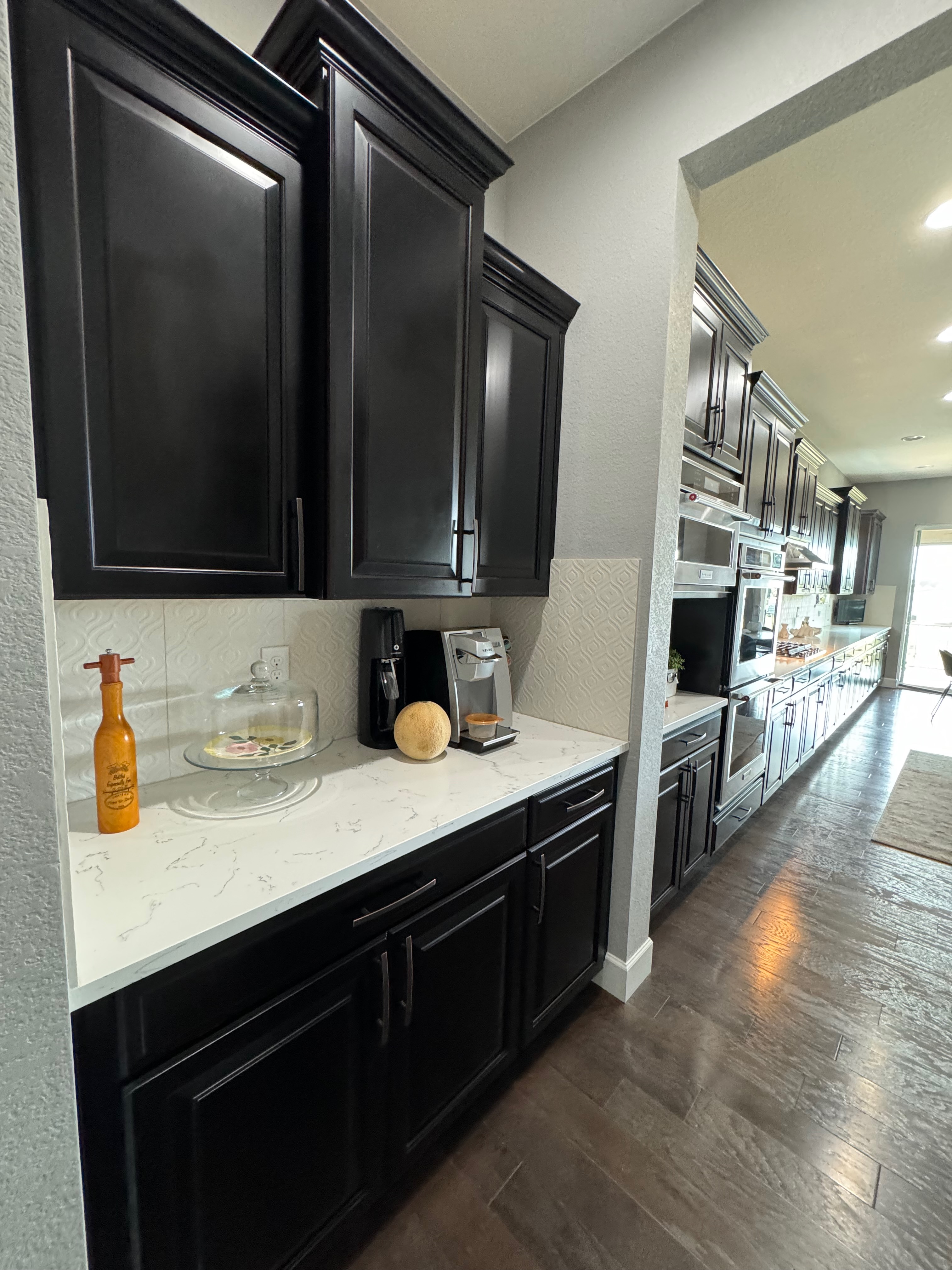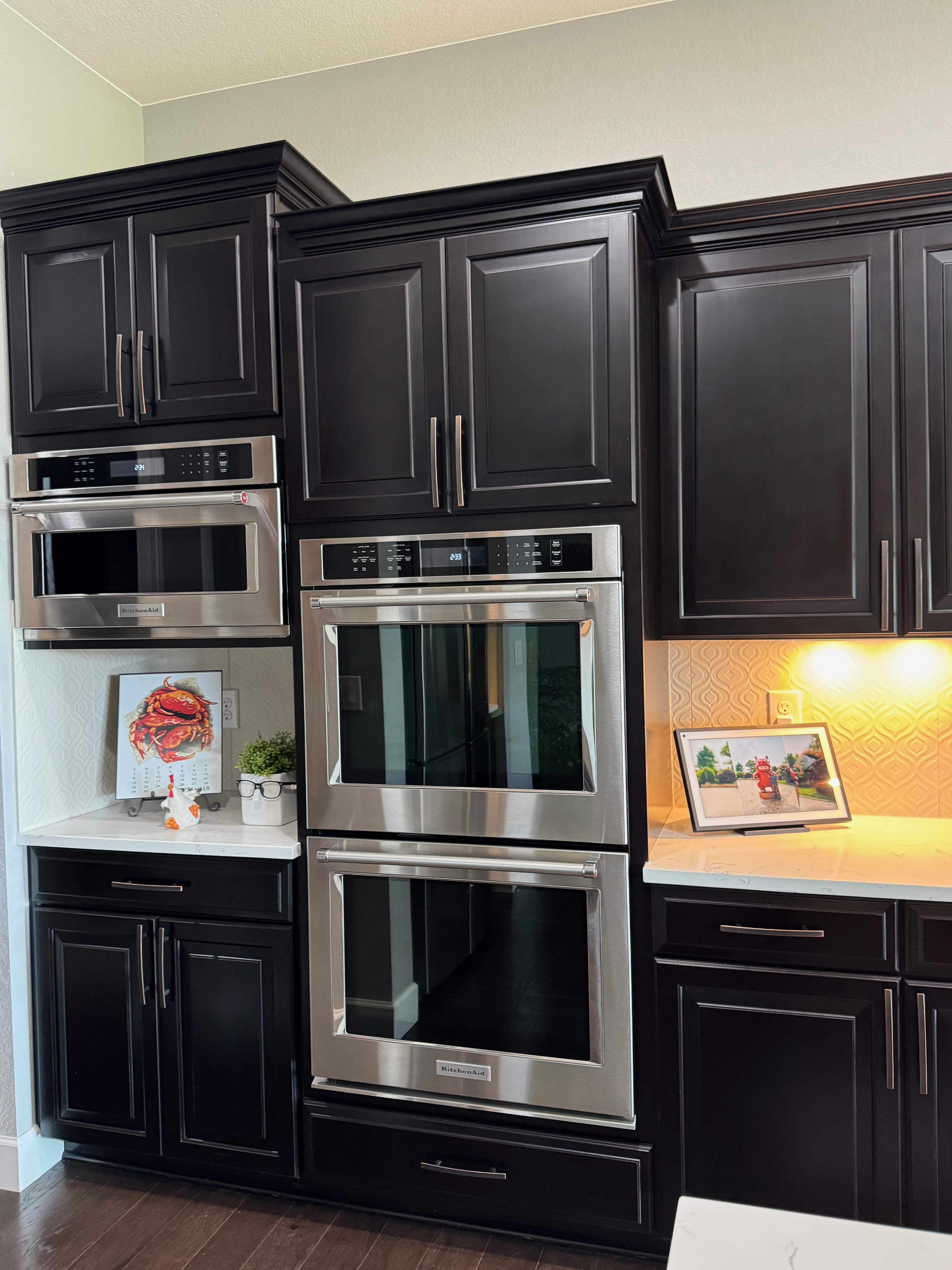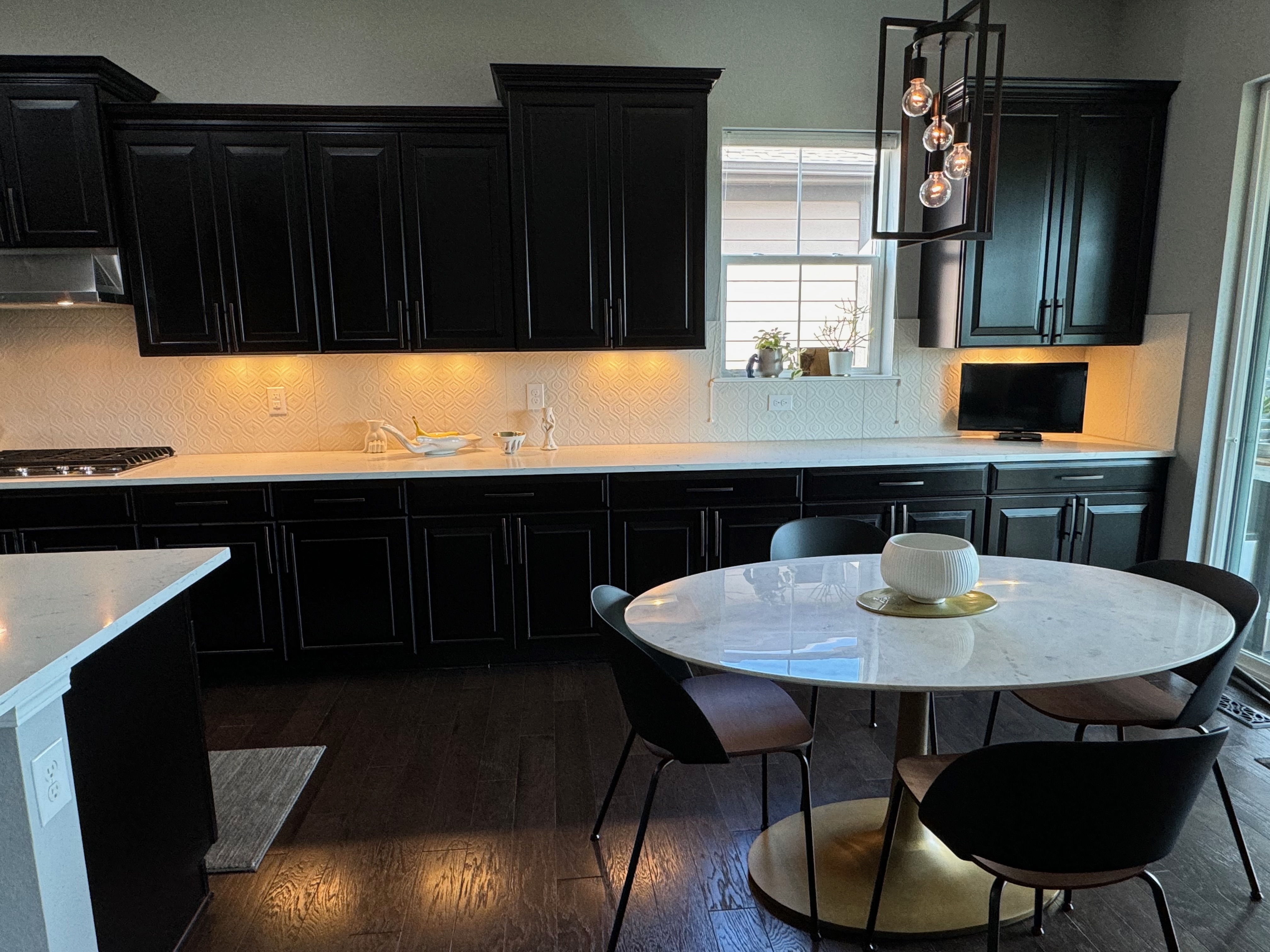 Like New! Timberlake Kitchen Cabinetry, only 7 years old. The cabinets are the Rushmore door style in a Maple wood with a raised panel overlay in a nice Espresso finish. The cabinets have bow pull door hardware in Verona bronze. The cabinets have dove-tail drawers and lots of pull-out drawer inserts inside. The cabinet maker is local so you could add additional matching cabinetry. Included are gorgeous Quartz slab countertops along with KitchenAid and Samsung Stainless Steel Appliances. The kitchen is available to be removed by a qualified buyer or there are licensed contractors available to hire after Christmas by 1/5/25. Price for the kitchen package below.