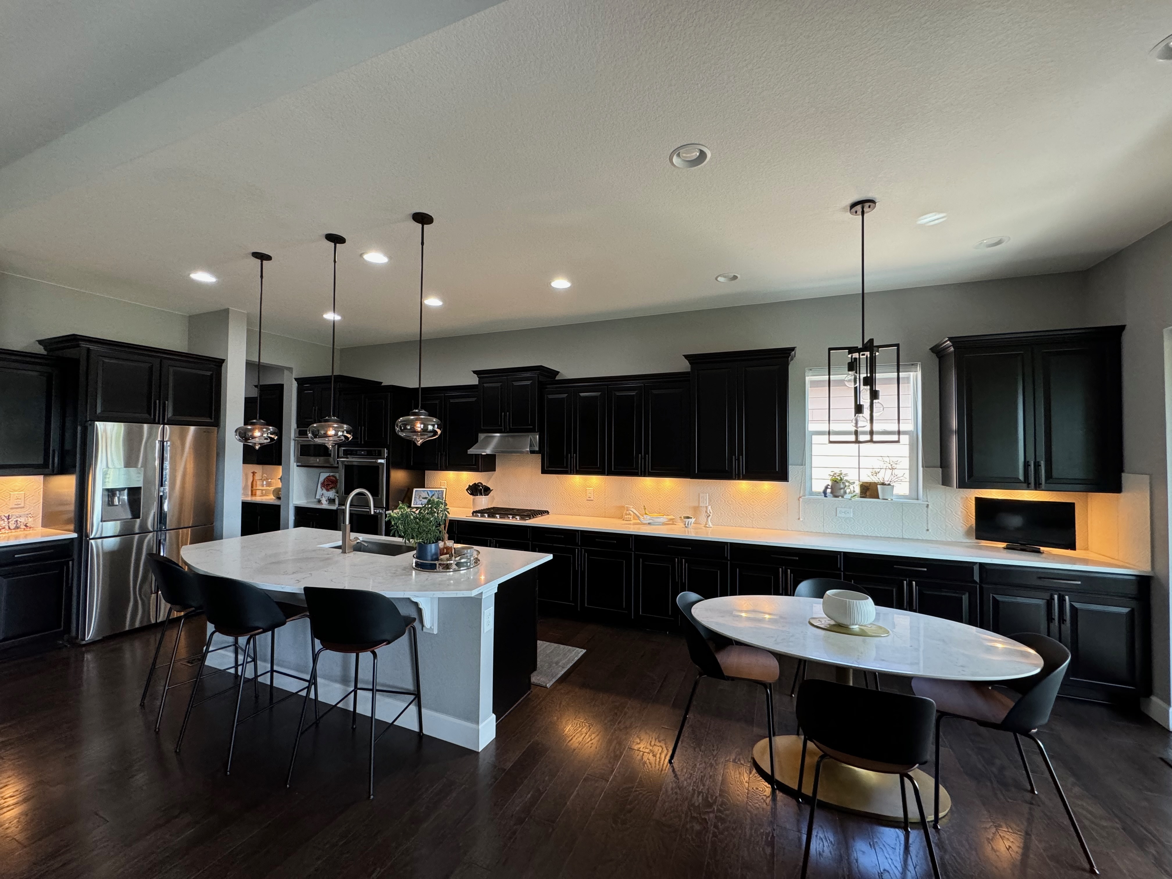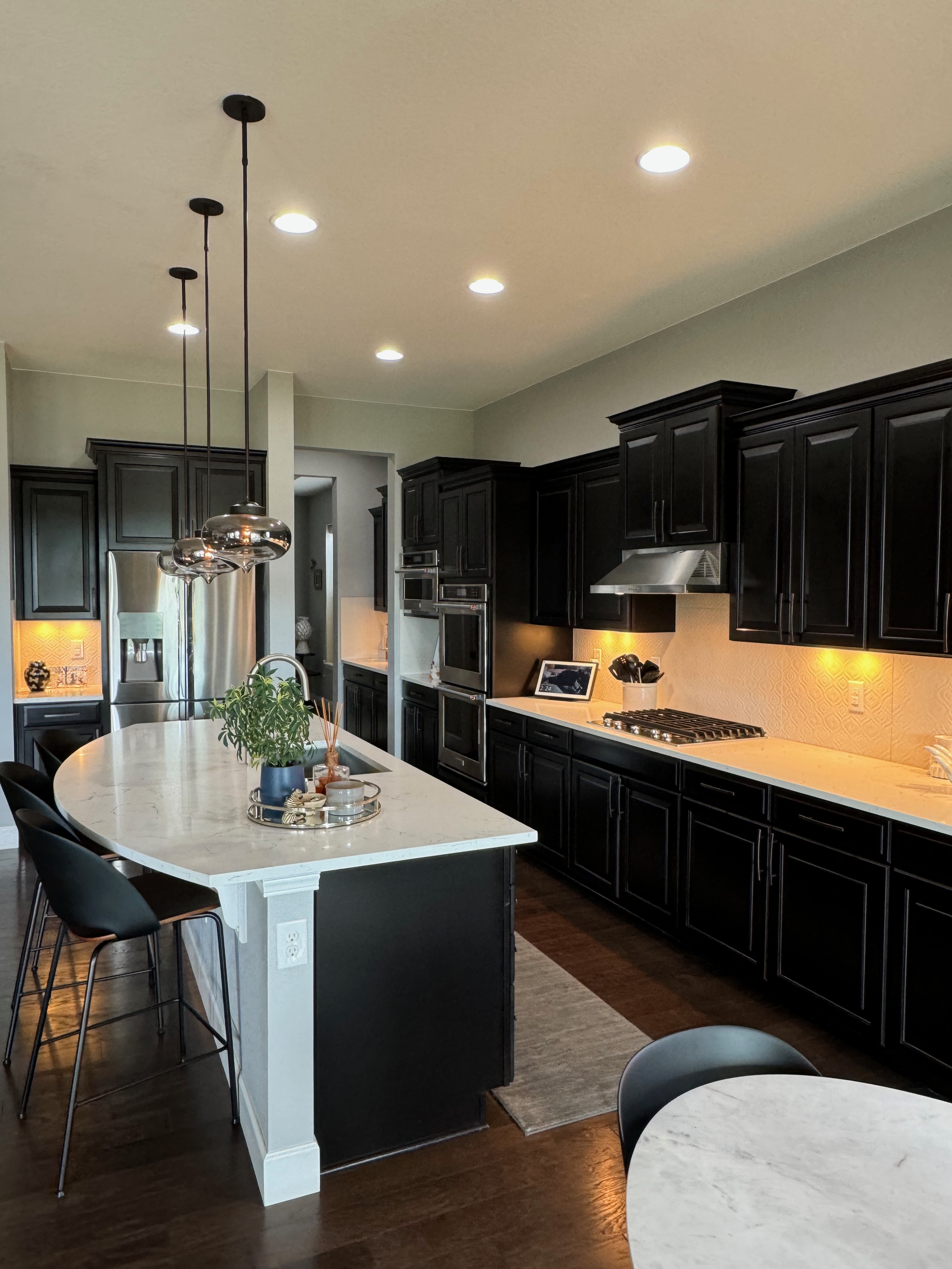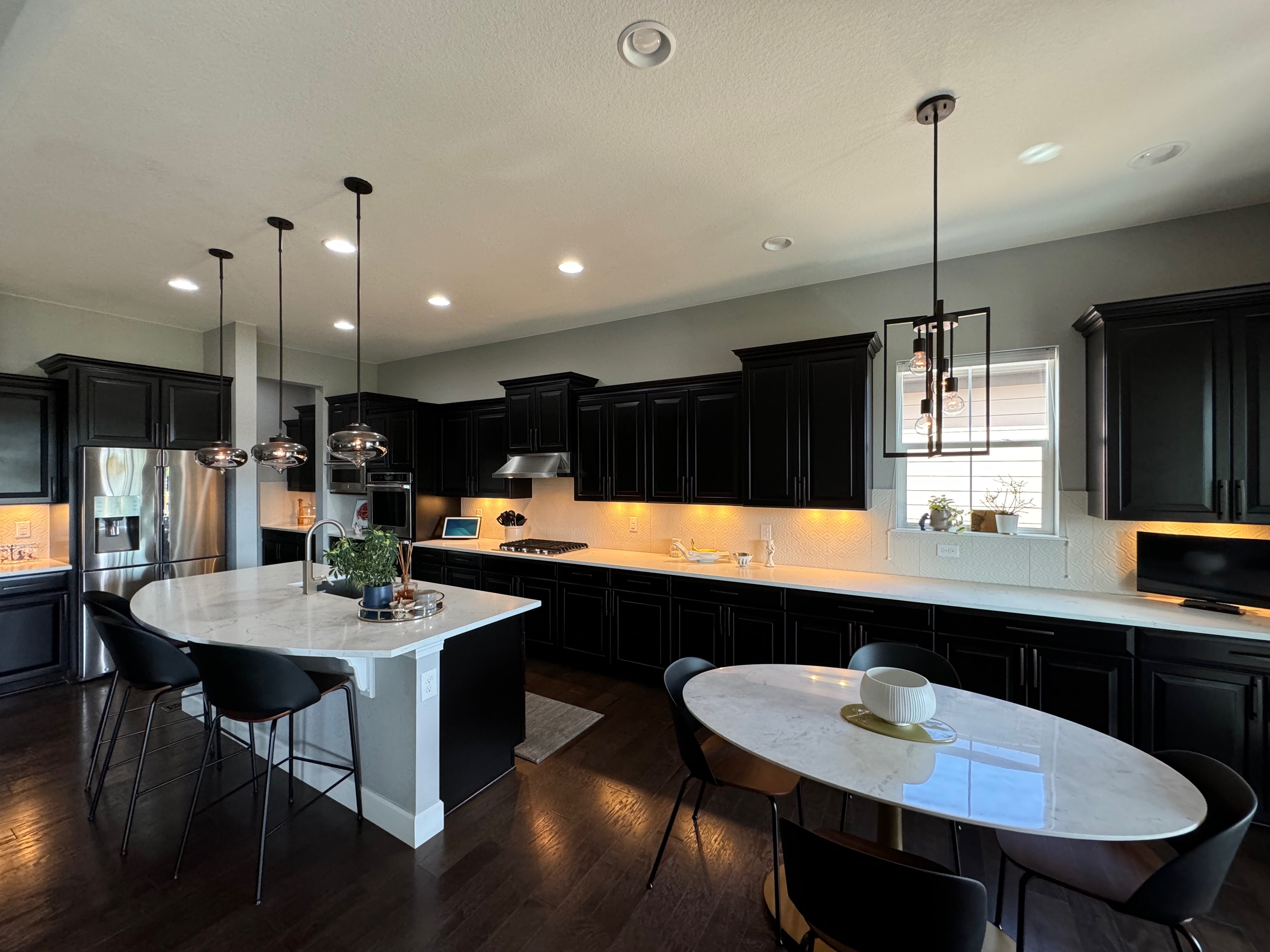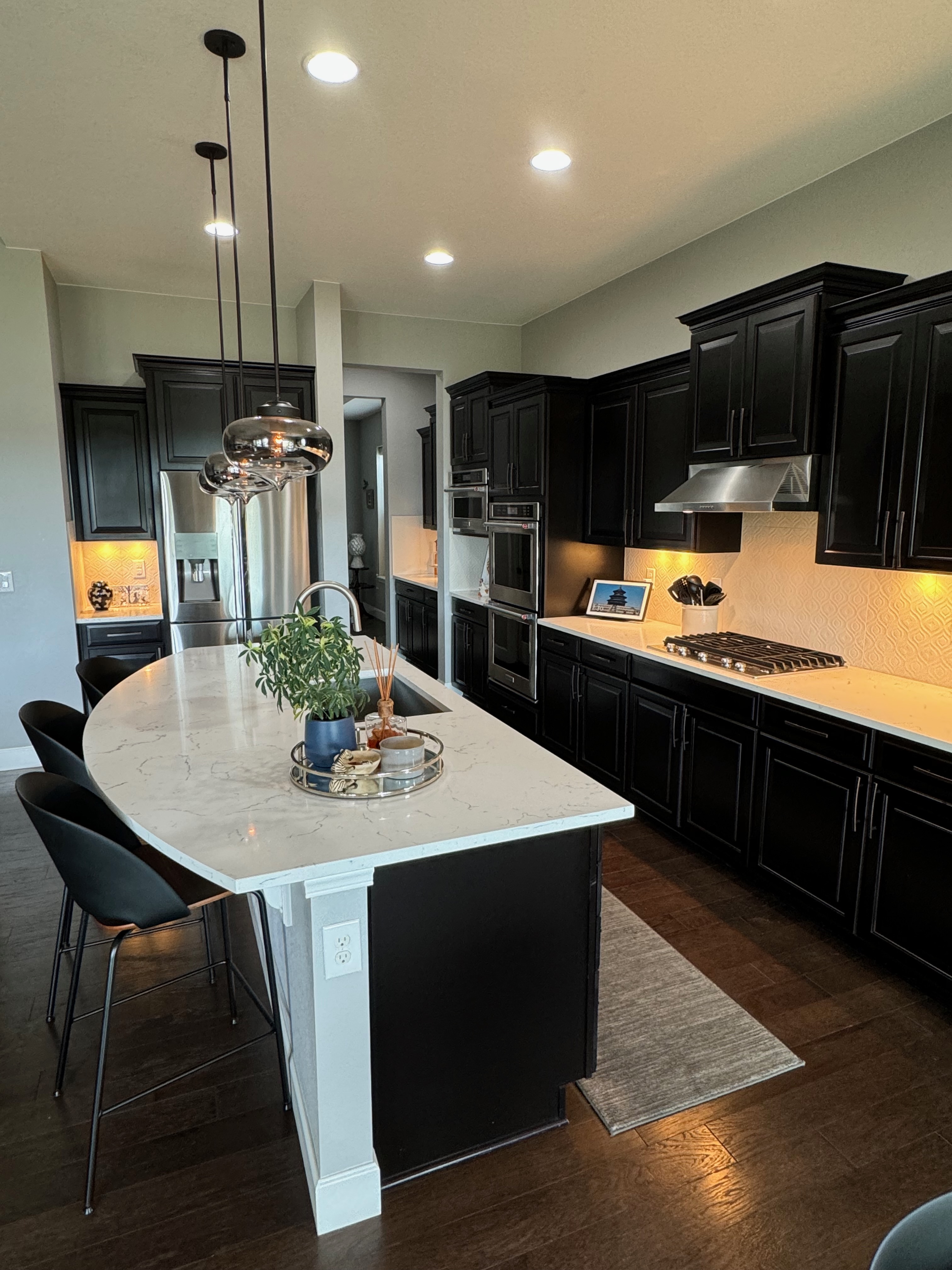 Like New! Timberlake Kitchen Cabinetry, only 7 years old. The cabinets are the Rushmore door style in a Maple wood with a raised panel overlay in a nice Espresso finish. The cabinets have bow pull door hardware in Verona bronze. The cabinets have dove-tail drawers and lots of pull-out drawer inserts inside. The cabinet maker is local so you could add additional matching cabinetry. Included are gorgeous Quartz slab countertops along with KitchenAid and Samsung Stainless Steel Appliances. The kitchen is available to be removed by a qualified buyer or there are licensed contractors available to hire after Christmas by 1/5/25. Price for the kitchen package below.