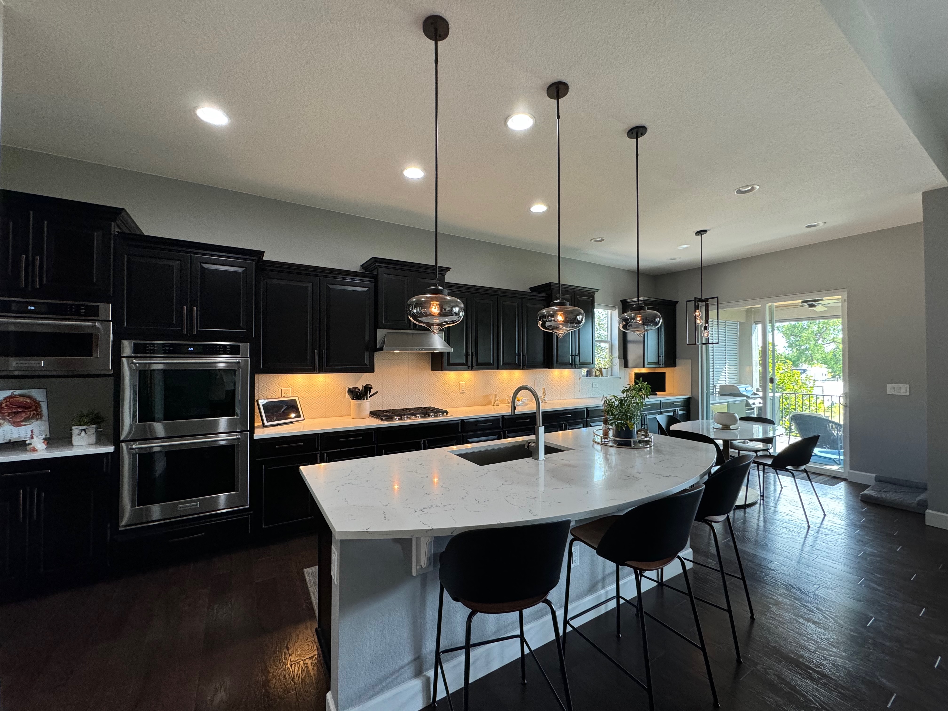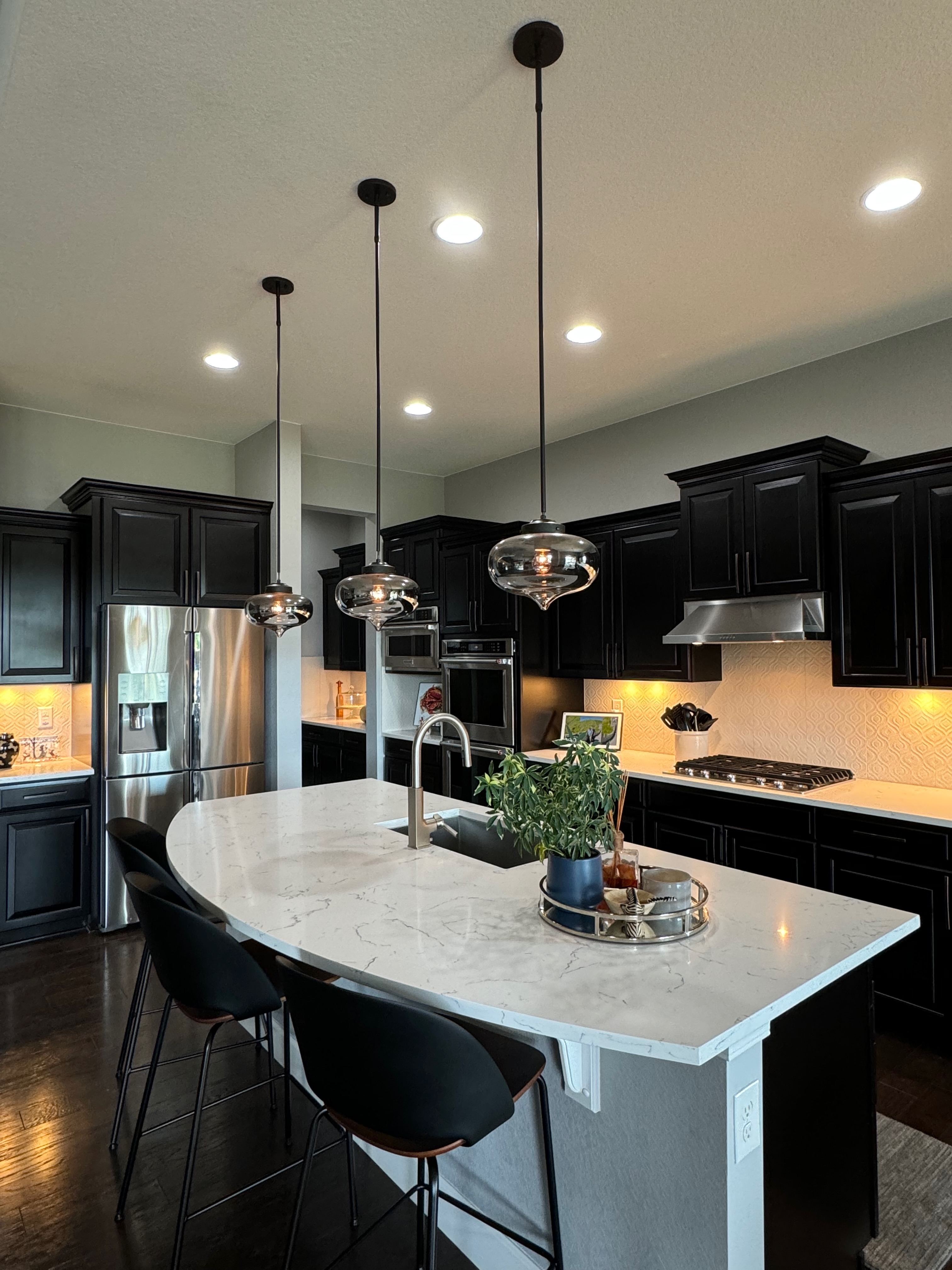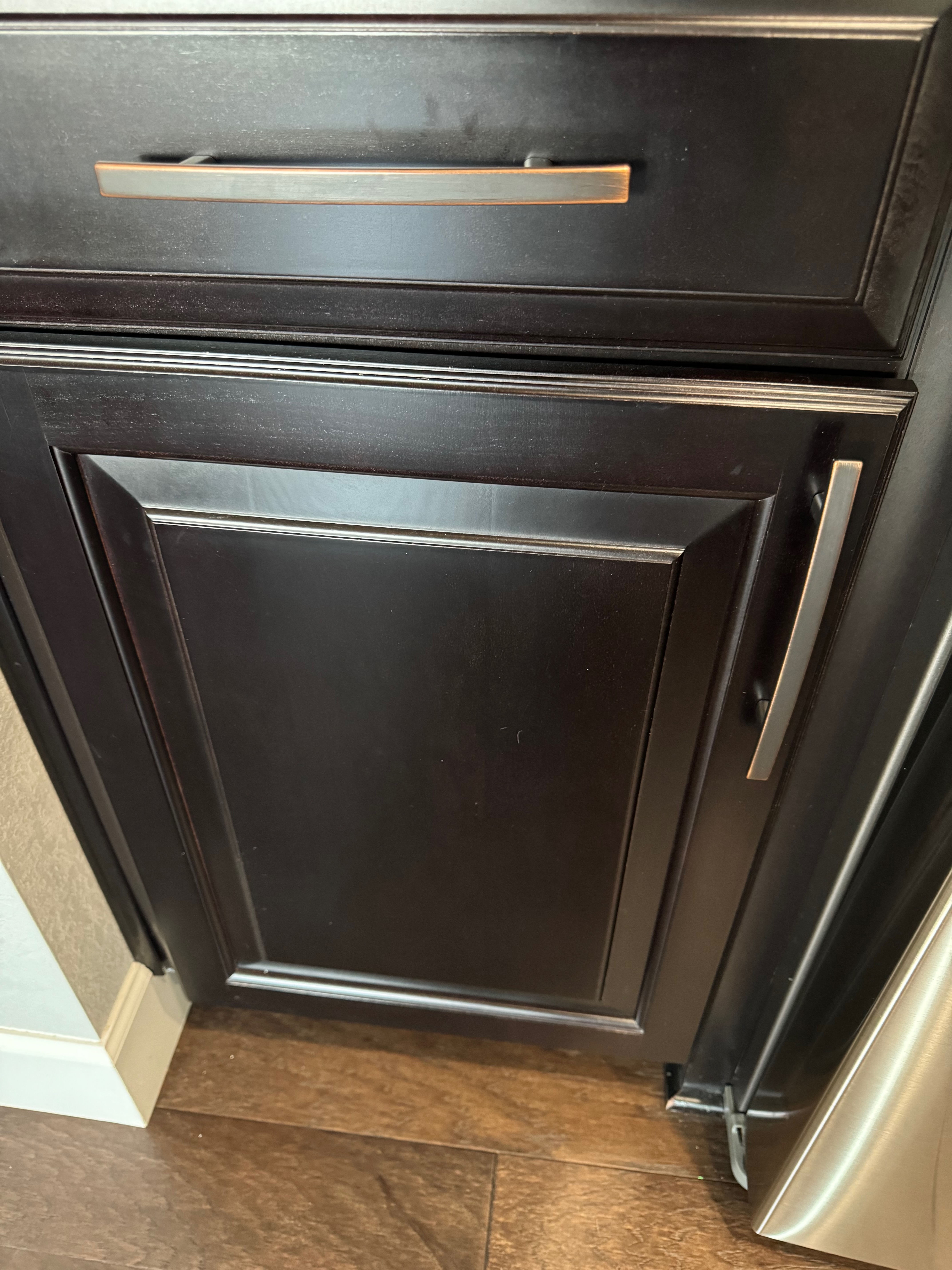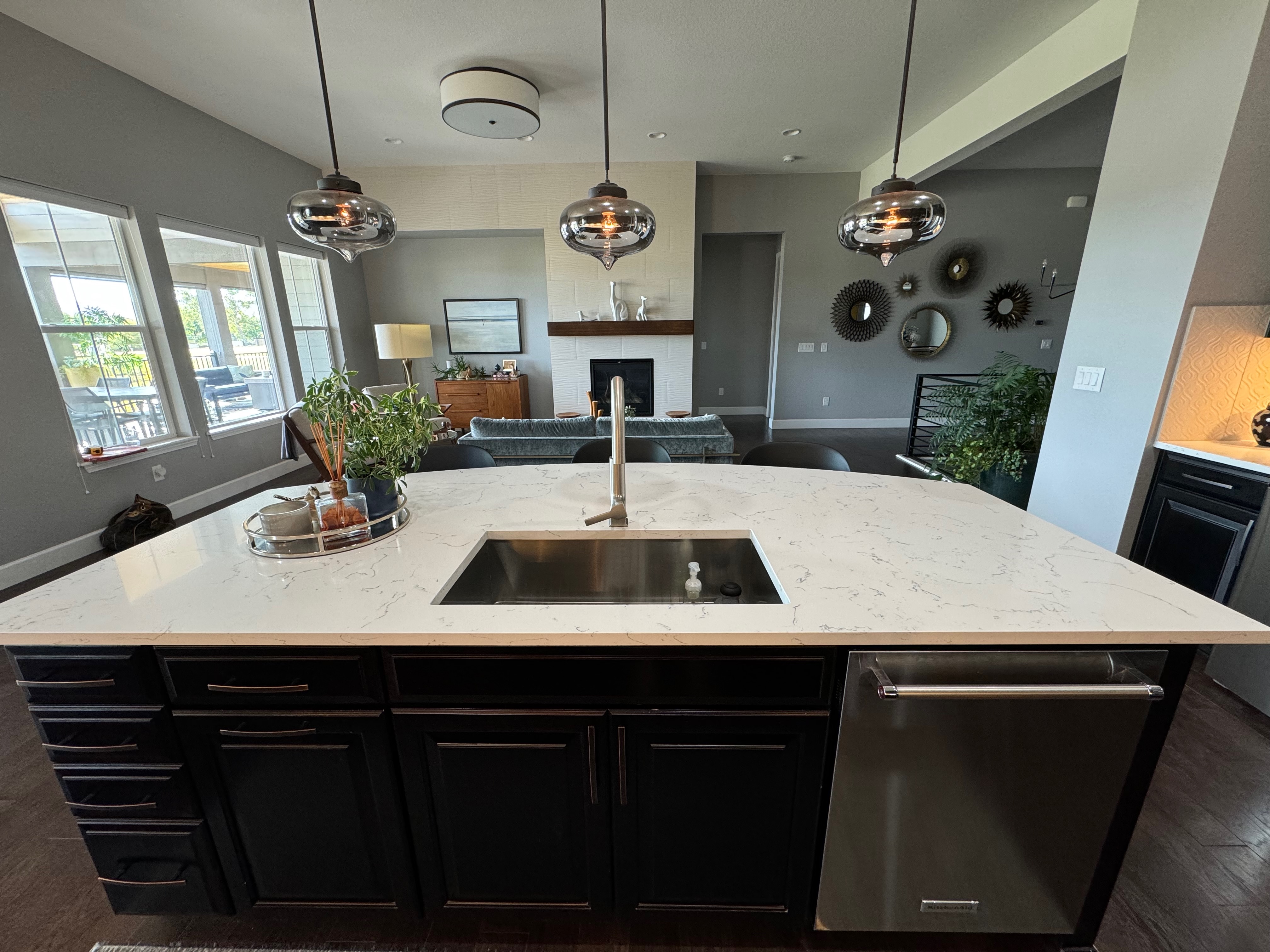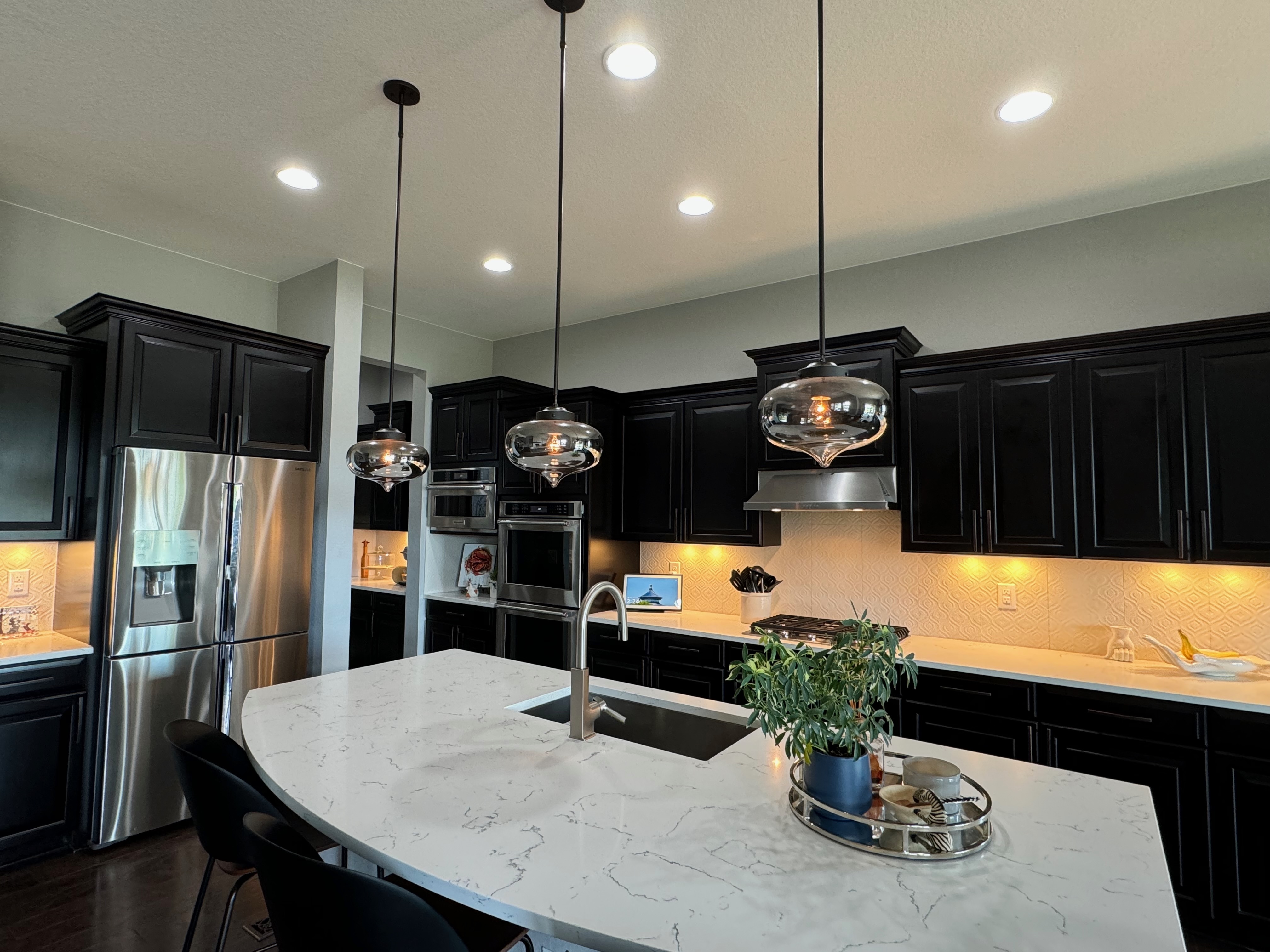 Like New! Timberlake Kitchen Cabinetry, only 7 years old. The cabinets are the Rushmore door style in a Maple wood with a raised panel overlay in a nice Espresso finish. The cabinets have bow pull door hardware in Verona bronze. The cabinets have dove-tail drawers and lots of pull-out drawer inserts inside. The cabinet maker is local so you could add additional matching cabinetry. Included are gorgeous Quartz slab countertops along with KitchenAid and Samsung Stainless Steel Appliances. The kitchen is available to be removed by a qualified buyer or there are licensed contractors available to hire after Christmas by 1/5/25. Price for the kitchen package below.