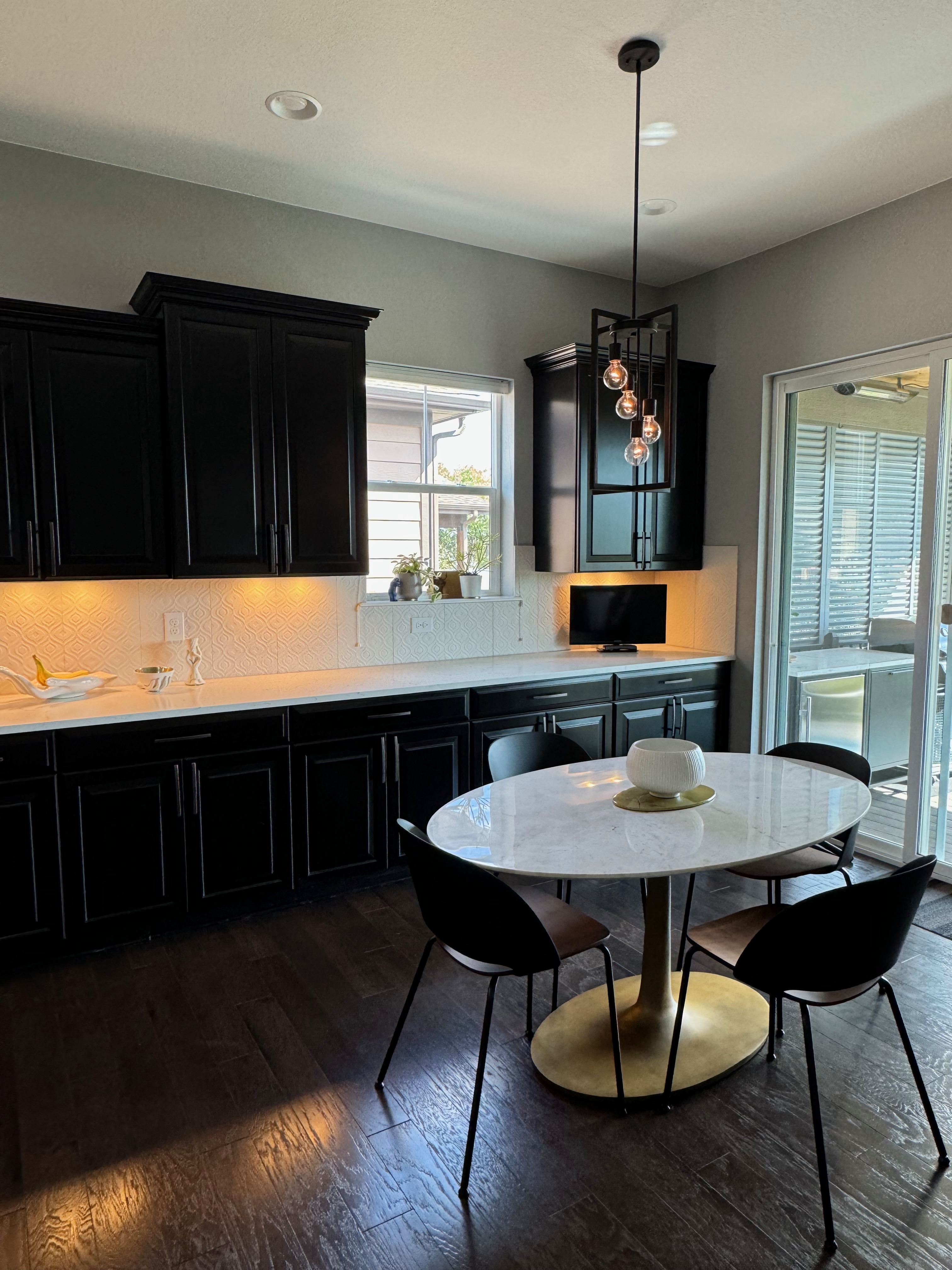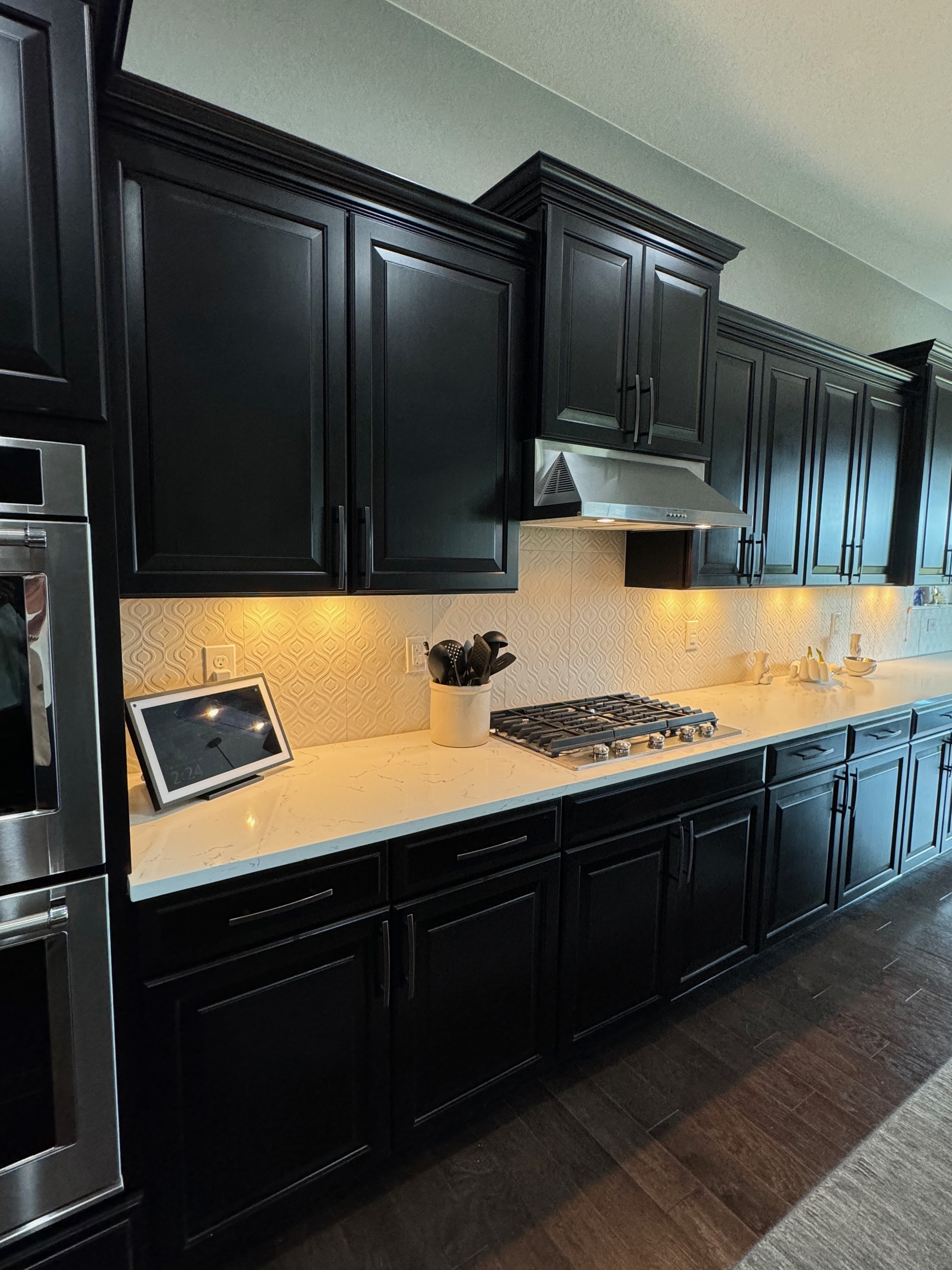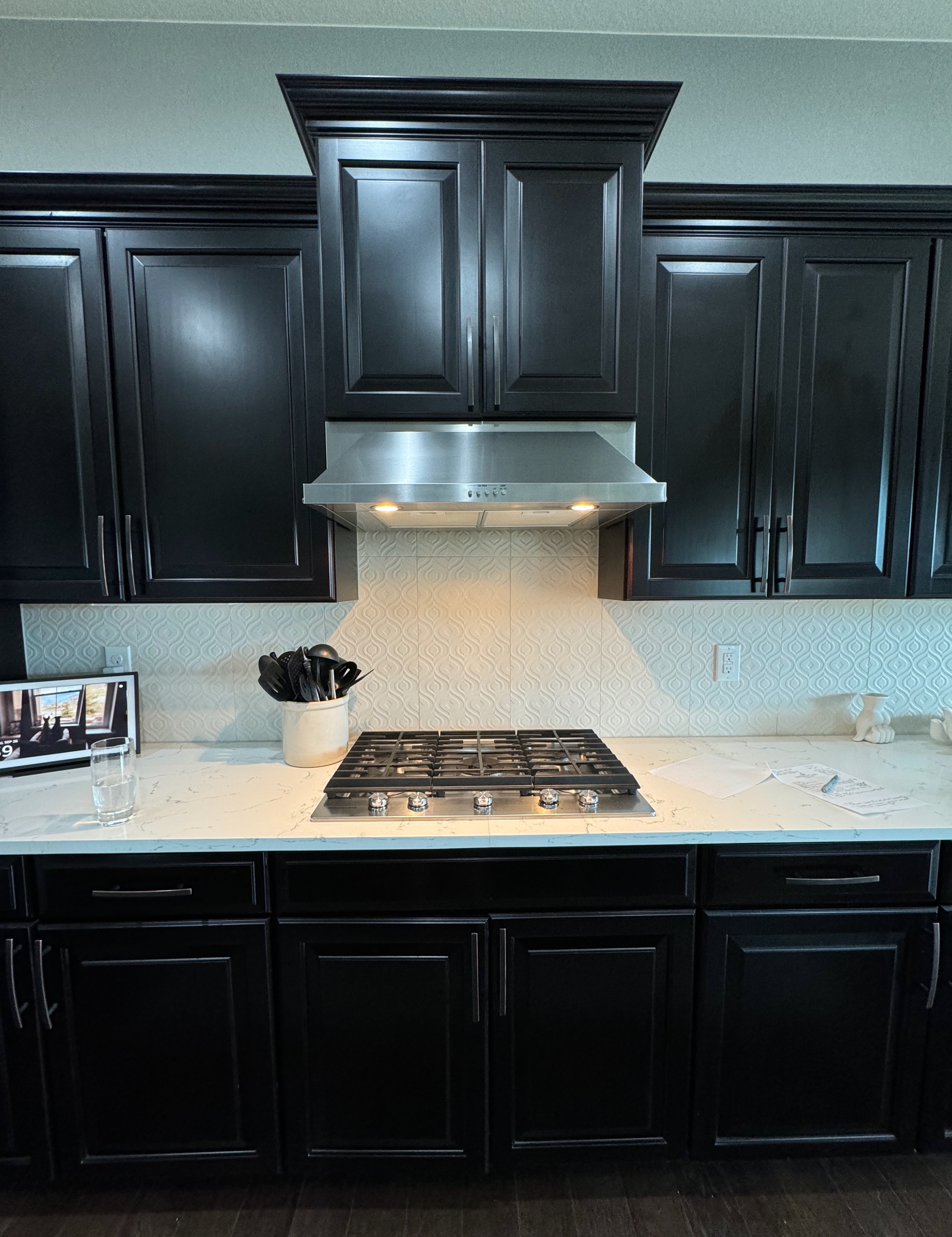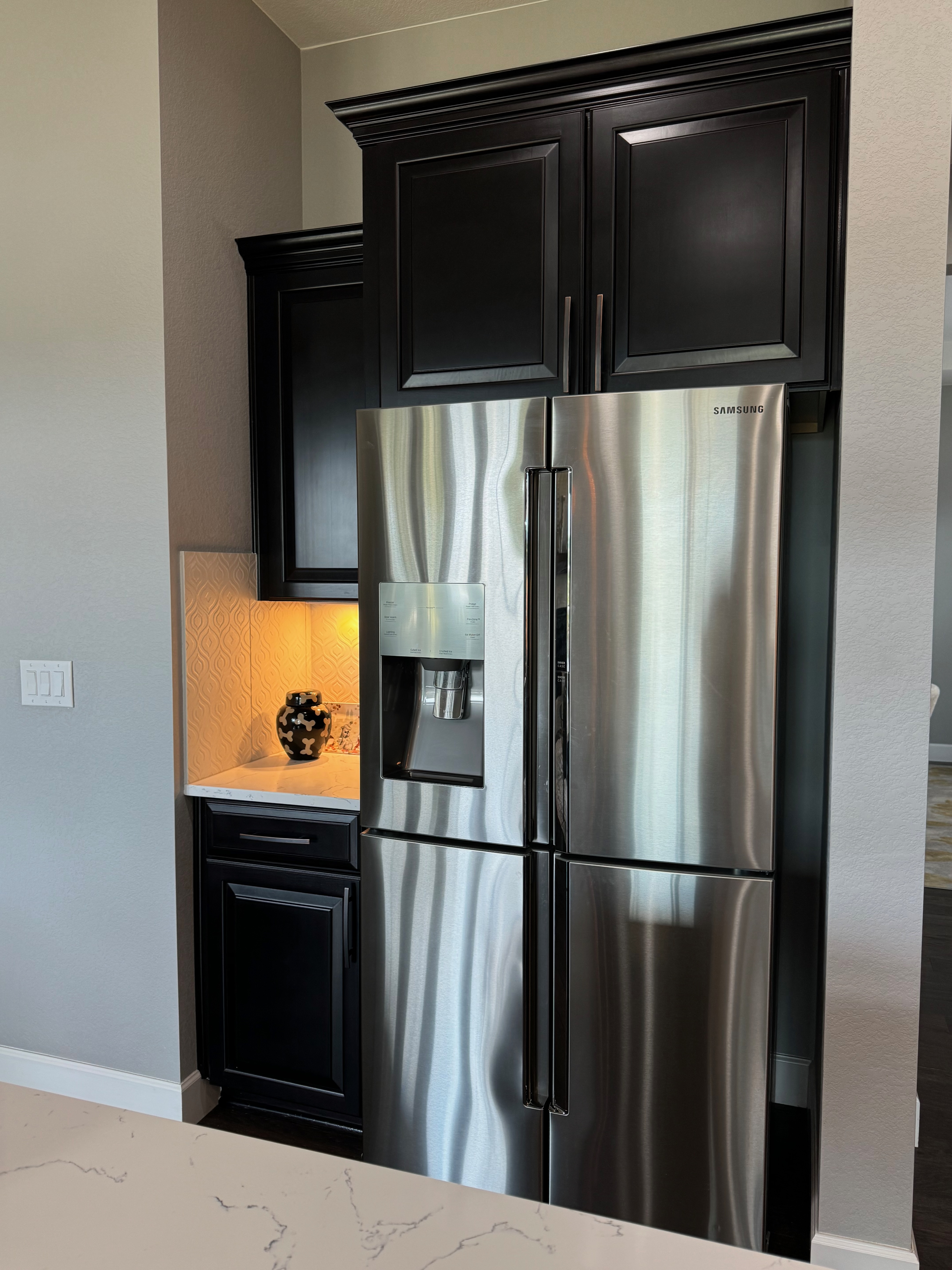 Like New! Timberlake Kitchen Cabinetry, only 7 years old. The cabinets are the Rushmore door style in a Maple wood with a raised panel overlay in a nice Espresso finish. The cabinets have bow pull door hardware in Verona bronze. The cabinets have dove-tail drawers and lots of pull-out drawer inserts inside. The cabinet maker is local so you could add additional matching cabinetry. Included are gorgeous Quartz slab countertops along with KitchenAid and Samsung Stainless Steel Appliances. The kitchen is available to be removed by a qualified buyer or there are licensed contractors available to hire after Christmas by 1/5/25. Price for the kitchen package below.