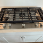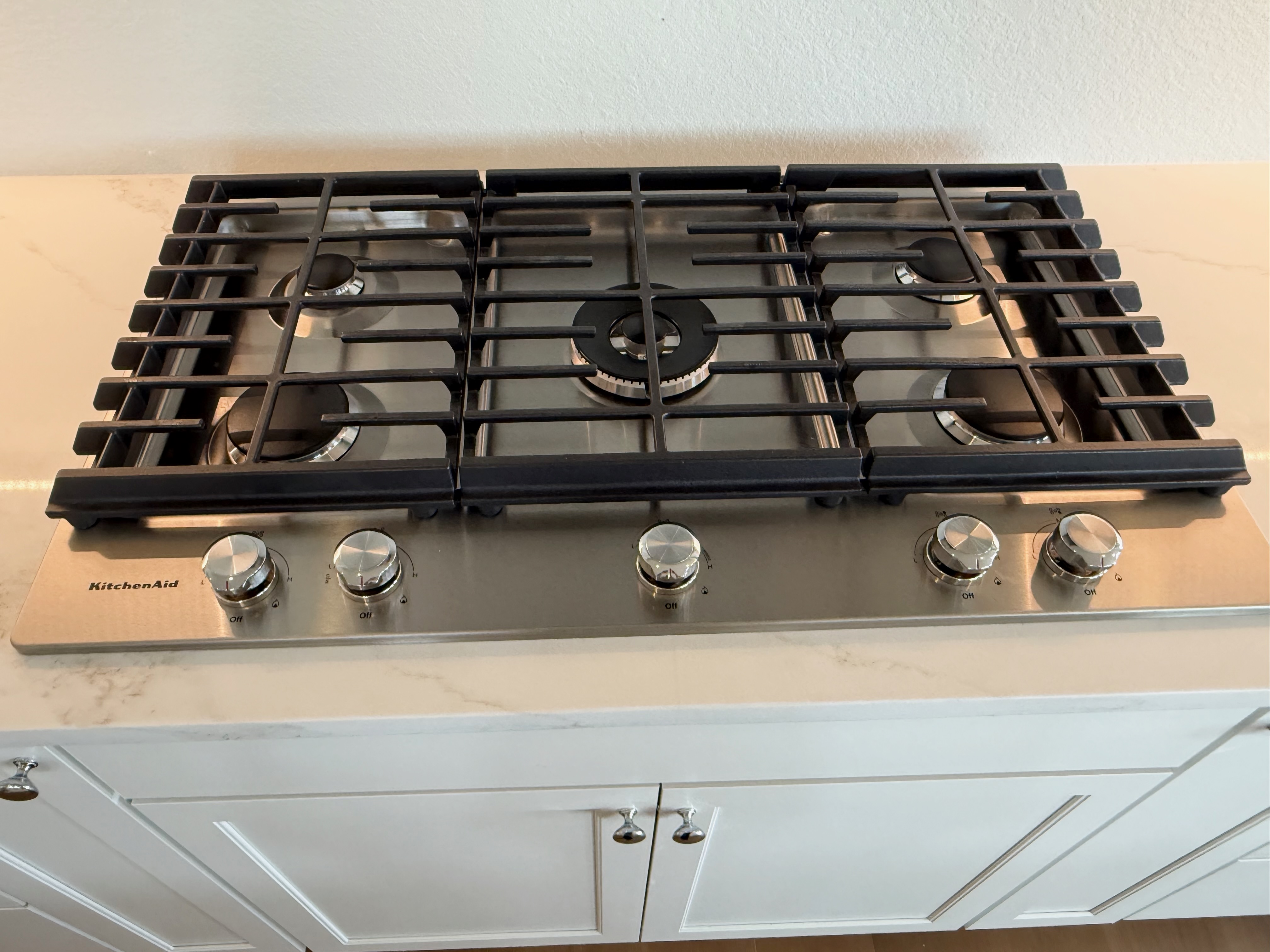 36” KitchenAid 5 burner gas cooktop in Stainless Steel Five individual burners includes a powerful 20,000 BTU Dual Ring Burner that is among the most powerful in the industry. The eye-catching design includes Multi-Finish Knobs and the scratch-resistant CookShield Finish help protect the surface against stains that may occur with high-temperature cooking.Model # KCGS556ESS06, Serial#DE3004977, Listing price new $1,398