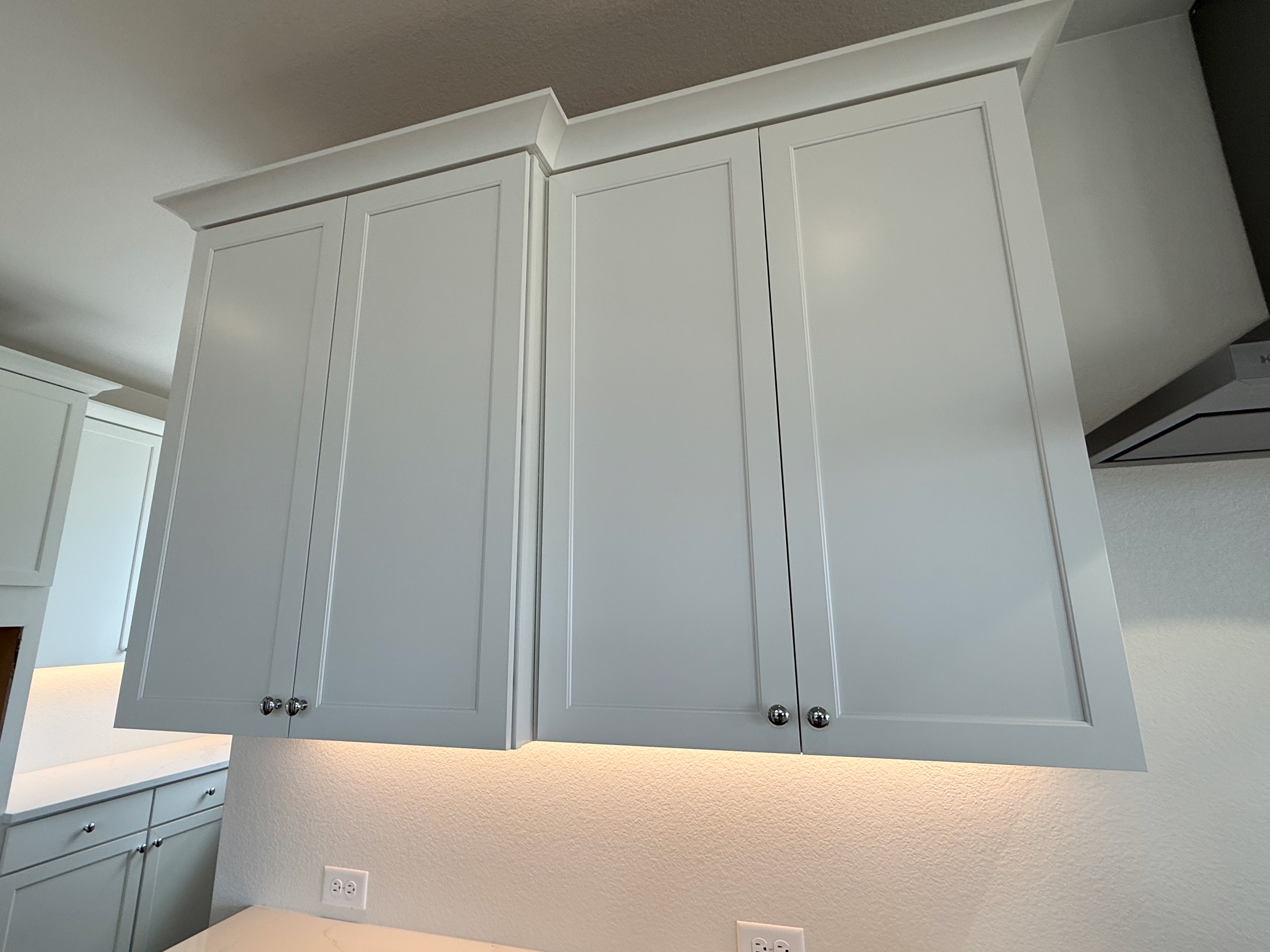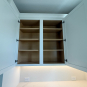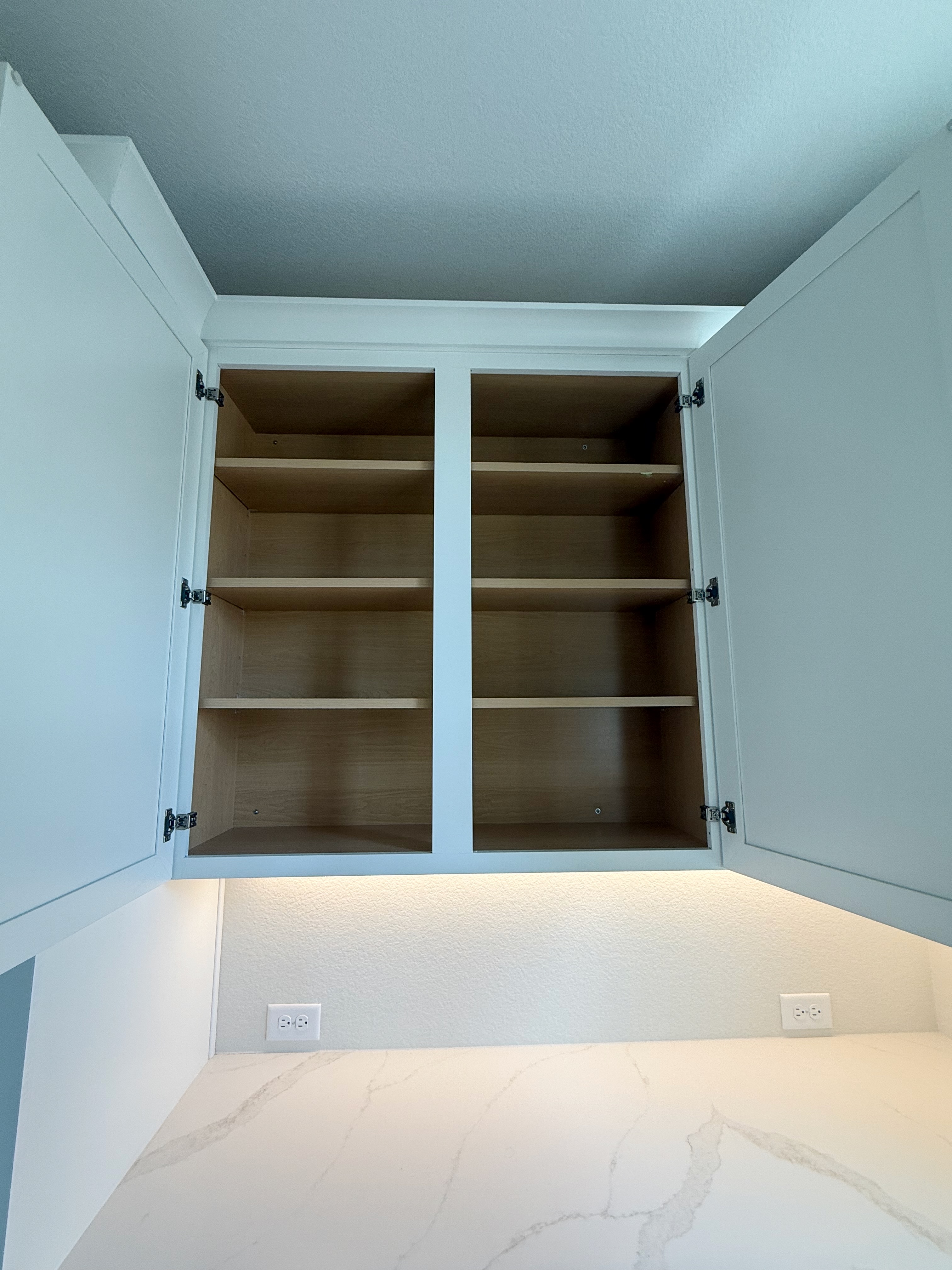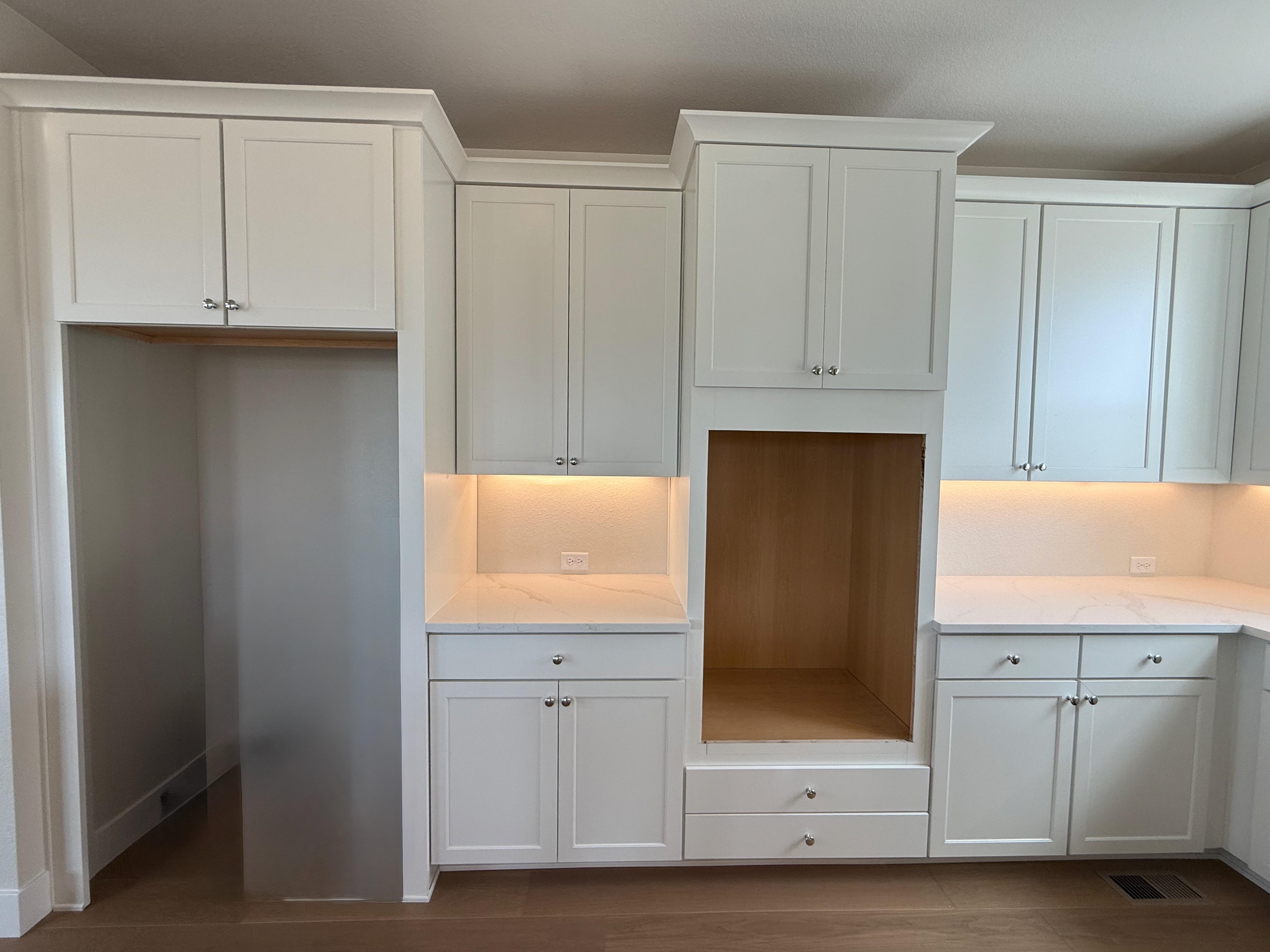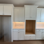 1-Two door two drawer double tall, double oven cabinet Dim.: 33’W X 96”h cabinet only/97 ½”h w/ crown * could lower upper cabinet 1 ½”to get to 8’h overall