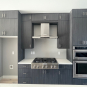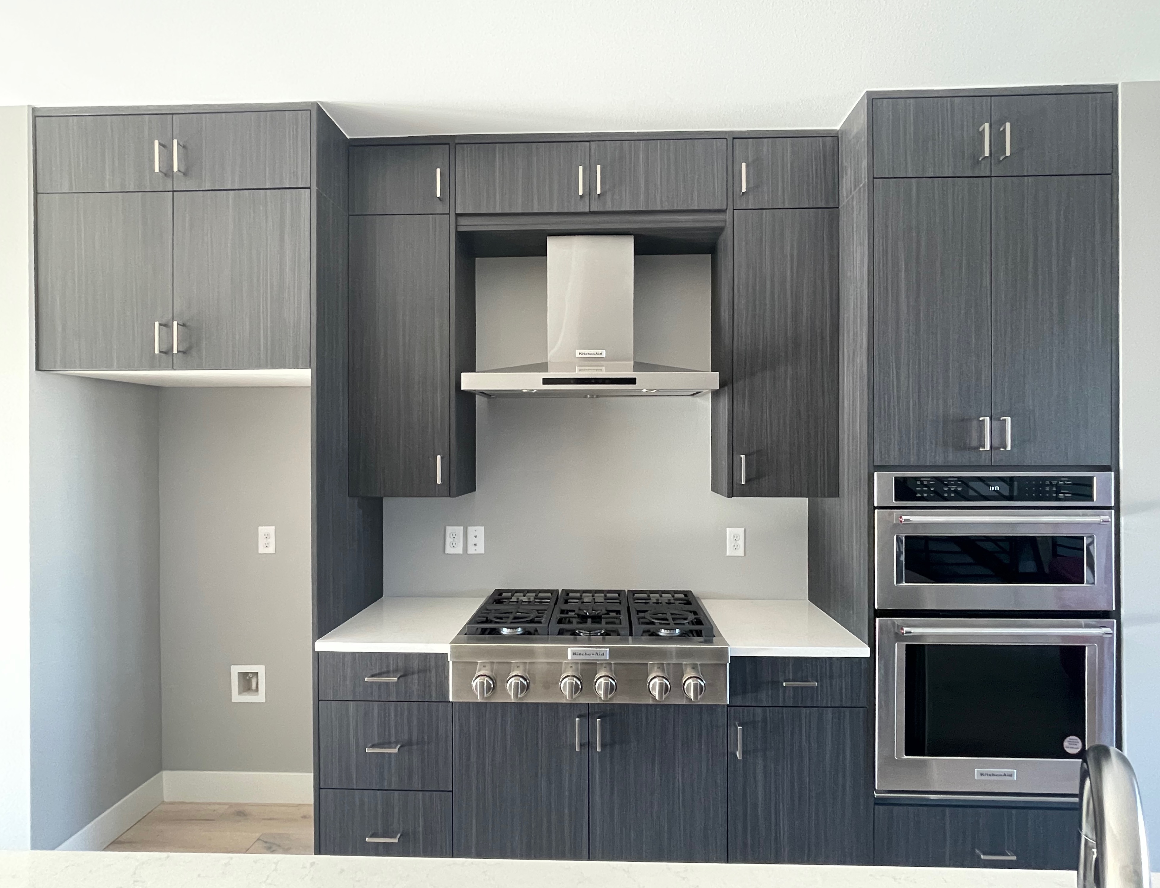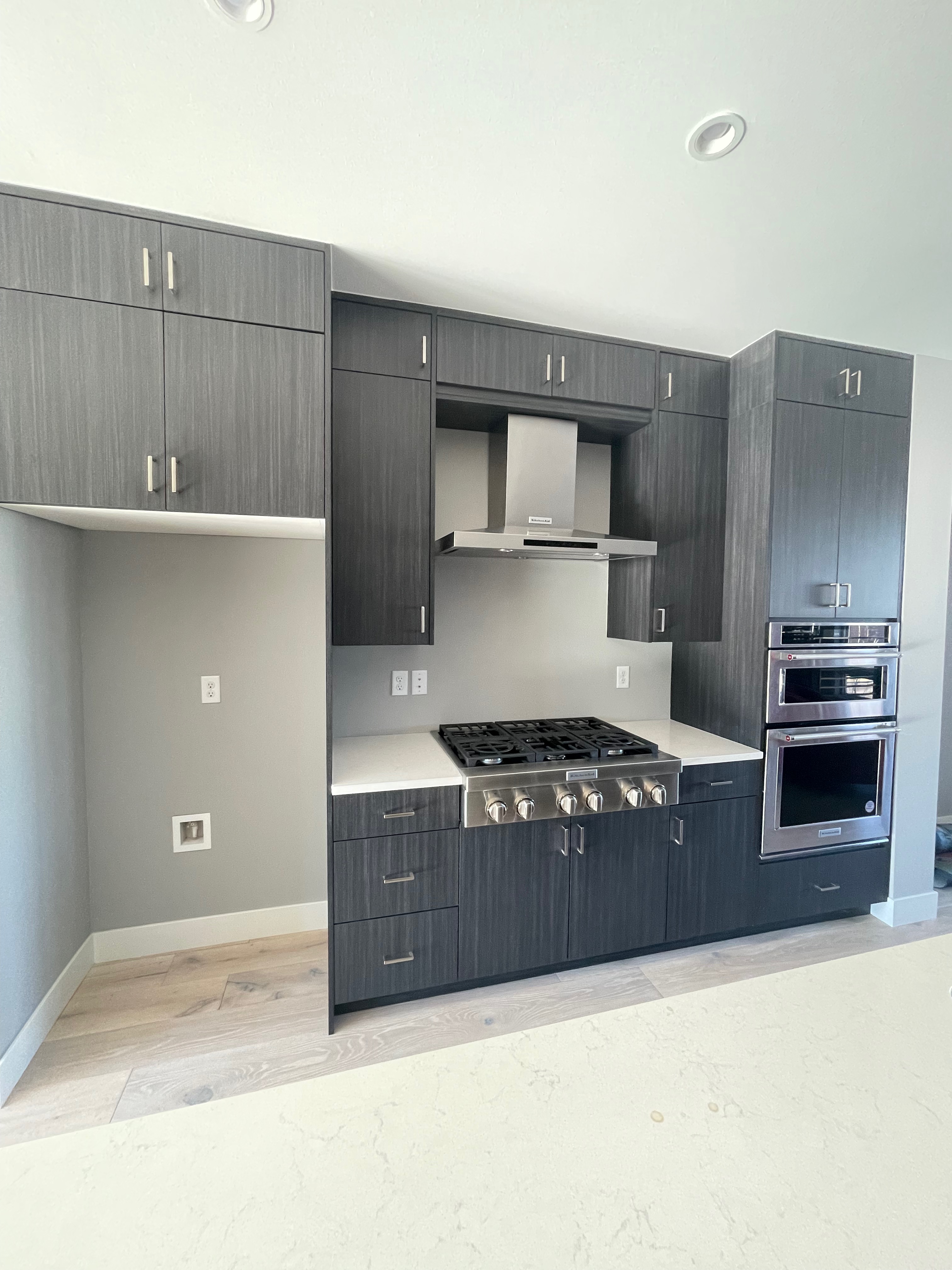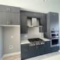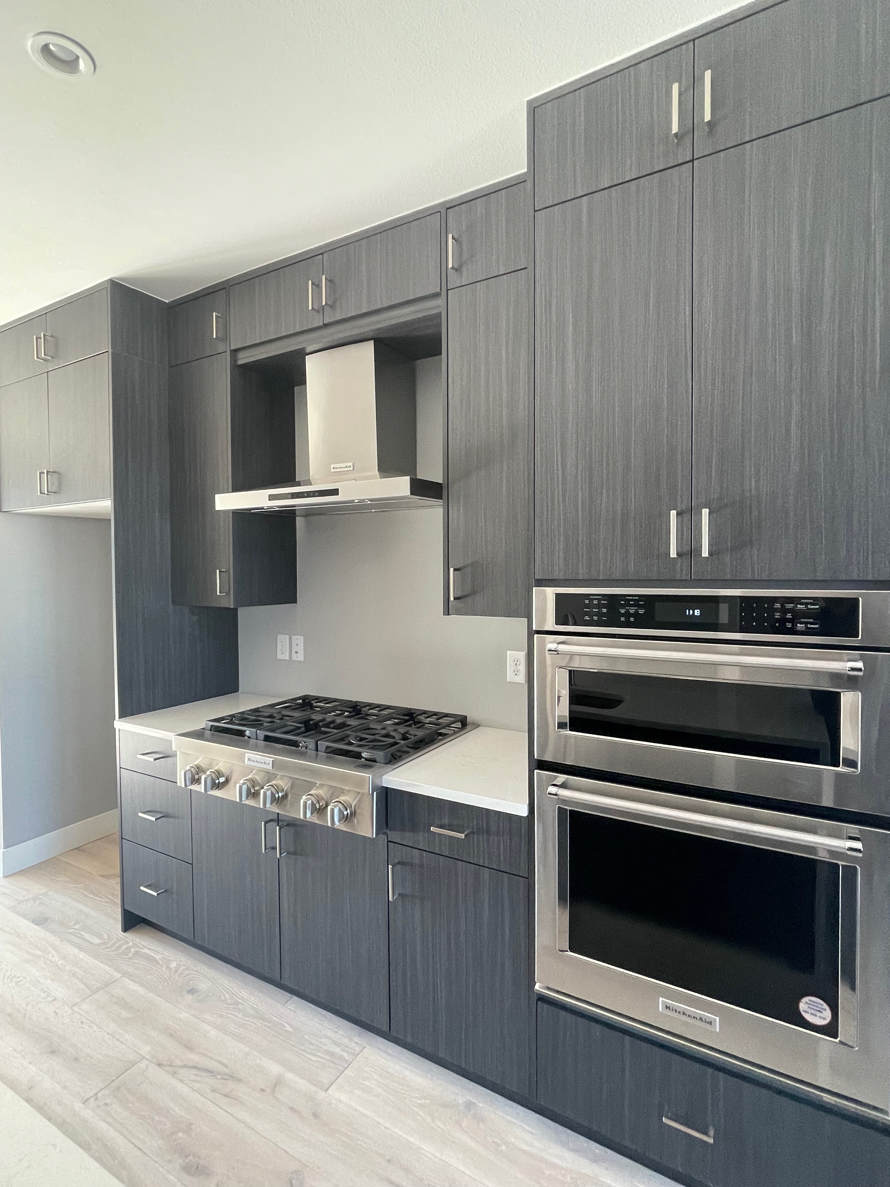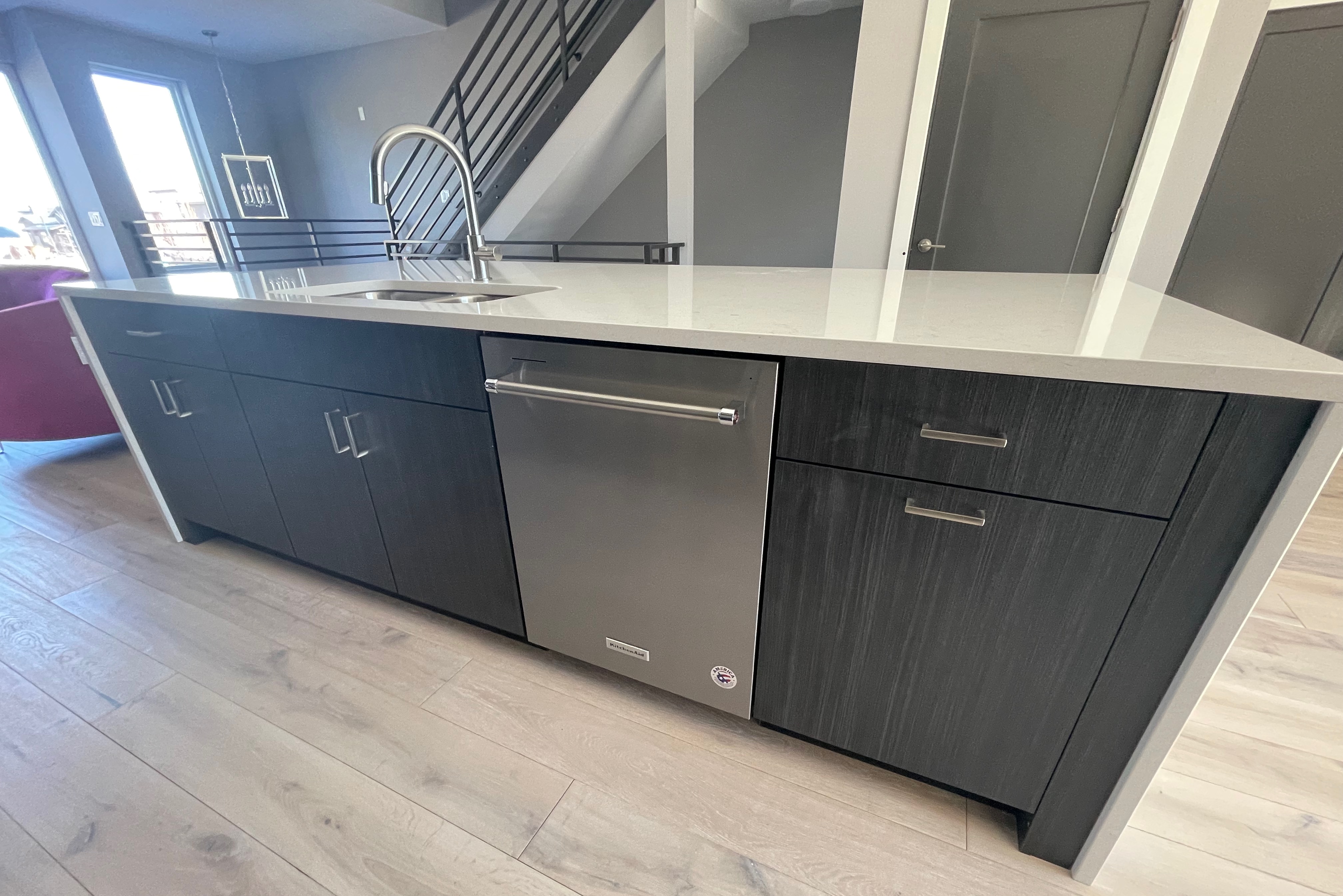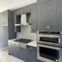 New, never used "Tharpe" Kitchen Cabinets in a gray textured melamine with Quartz Counter tops and brand new KitchenAid stainless steel appliances in a new build! The kitchen has been carefully removed by contractors and is ready to pick up anytime. Price for the package below.