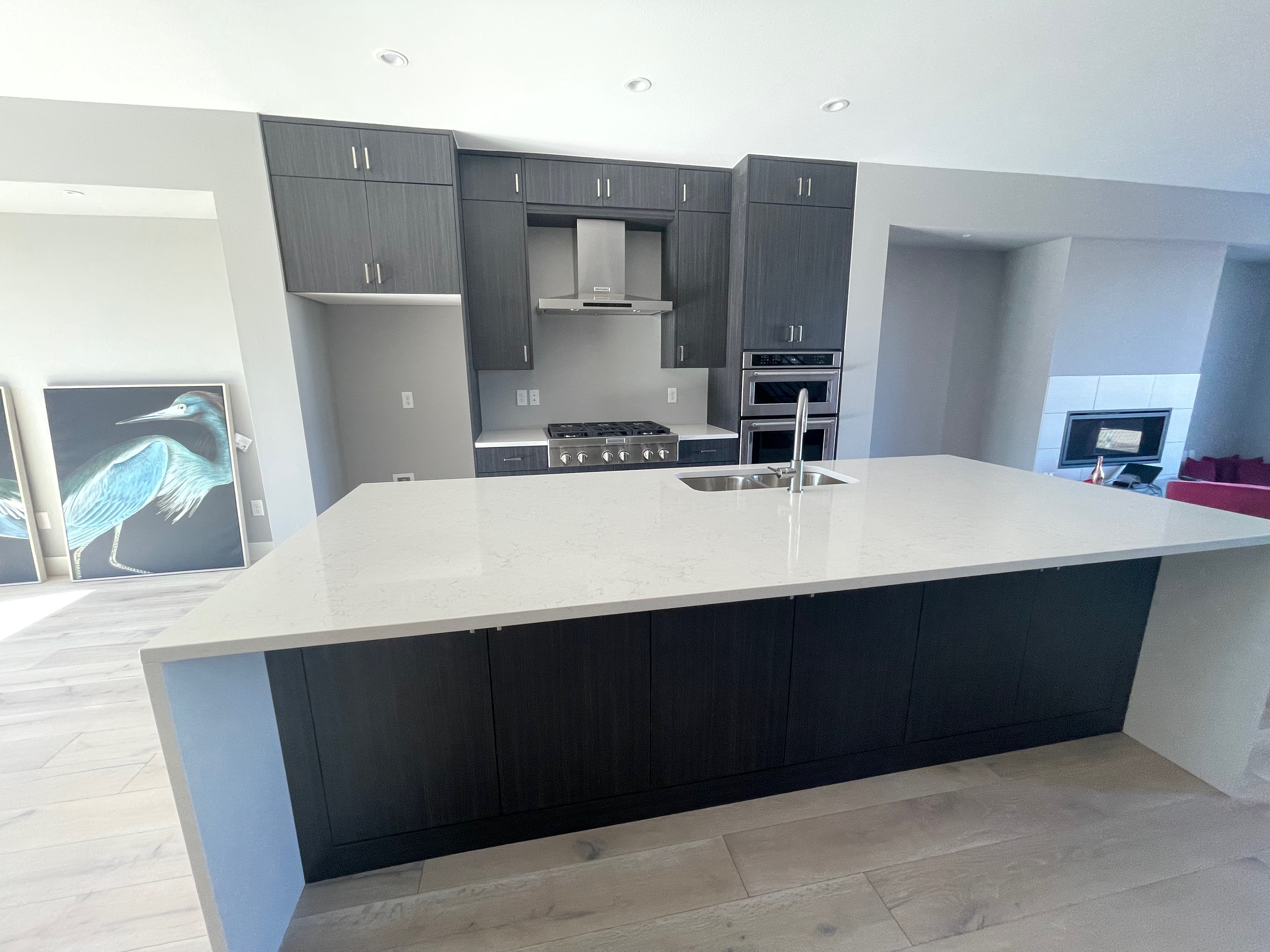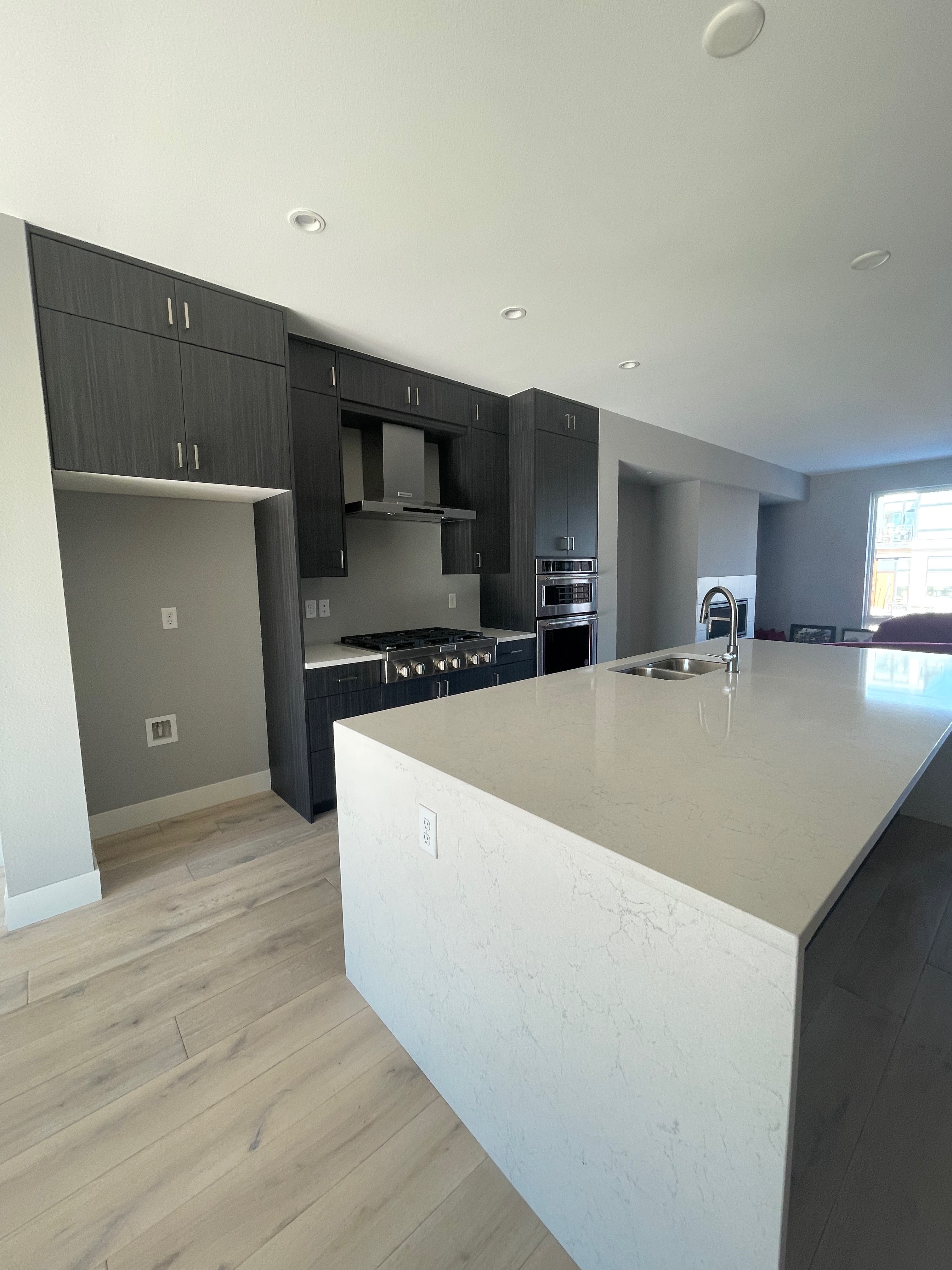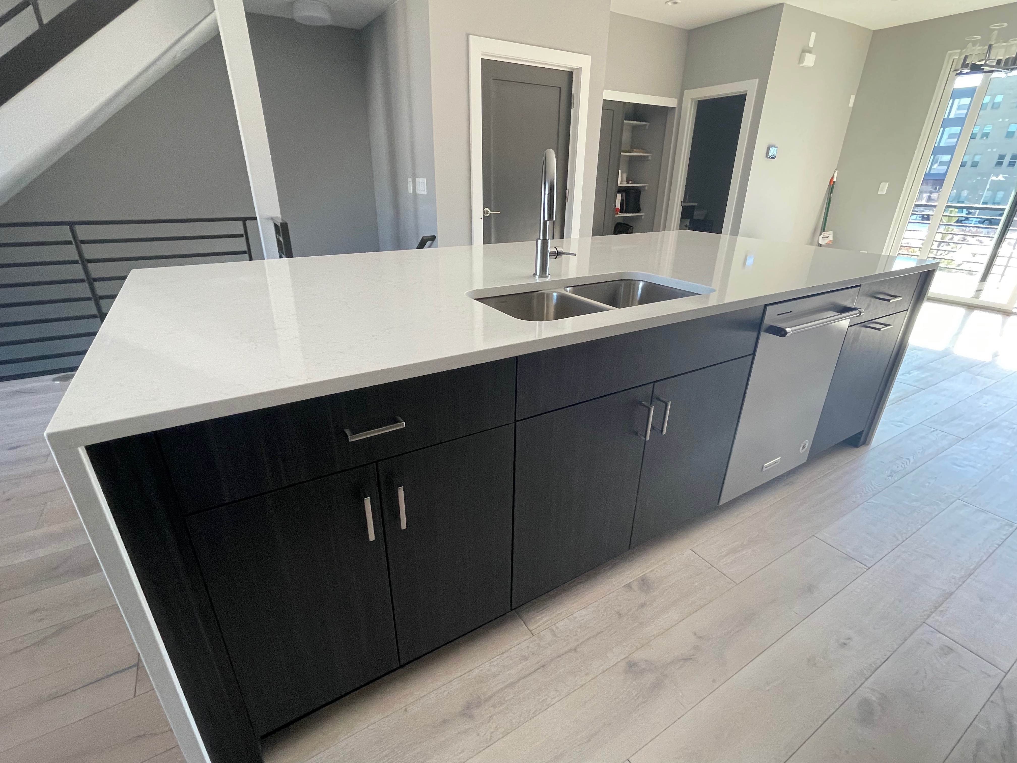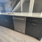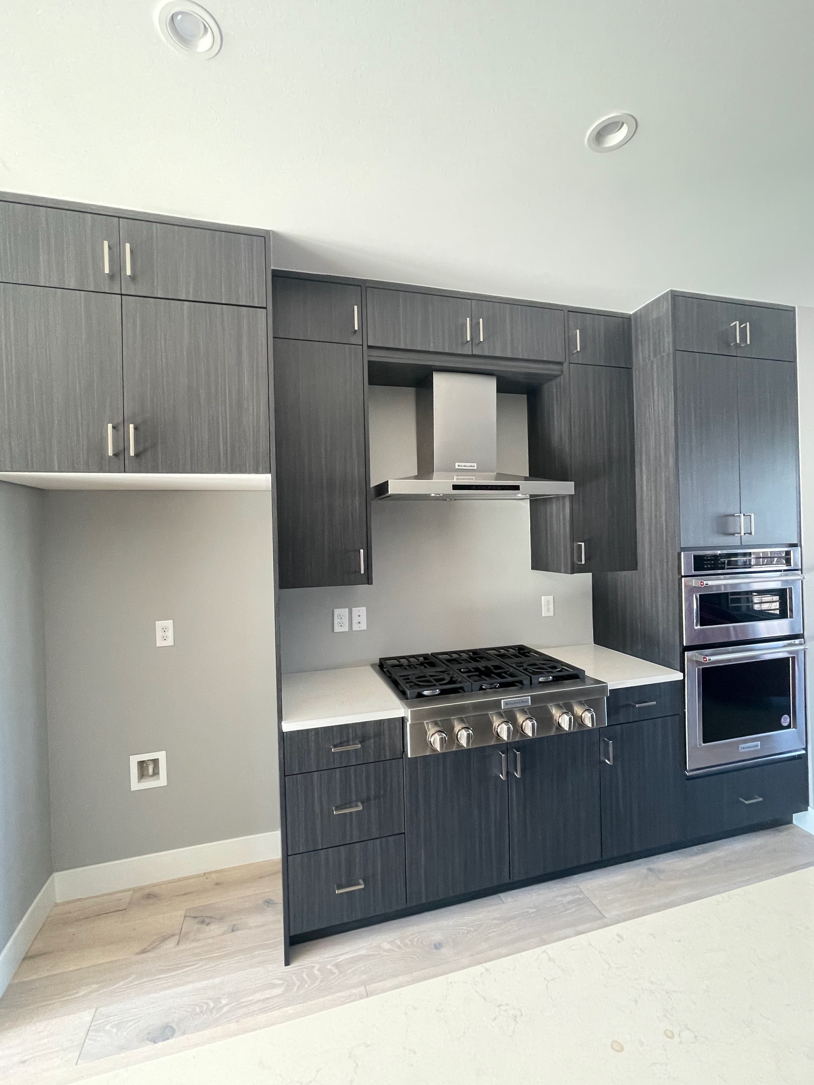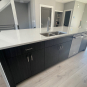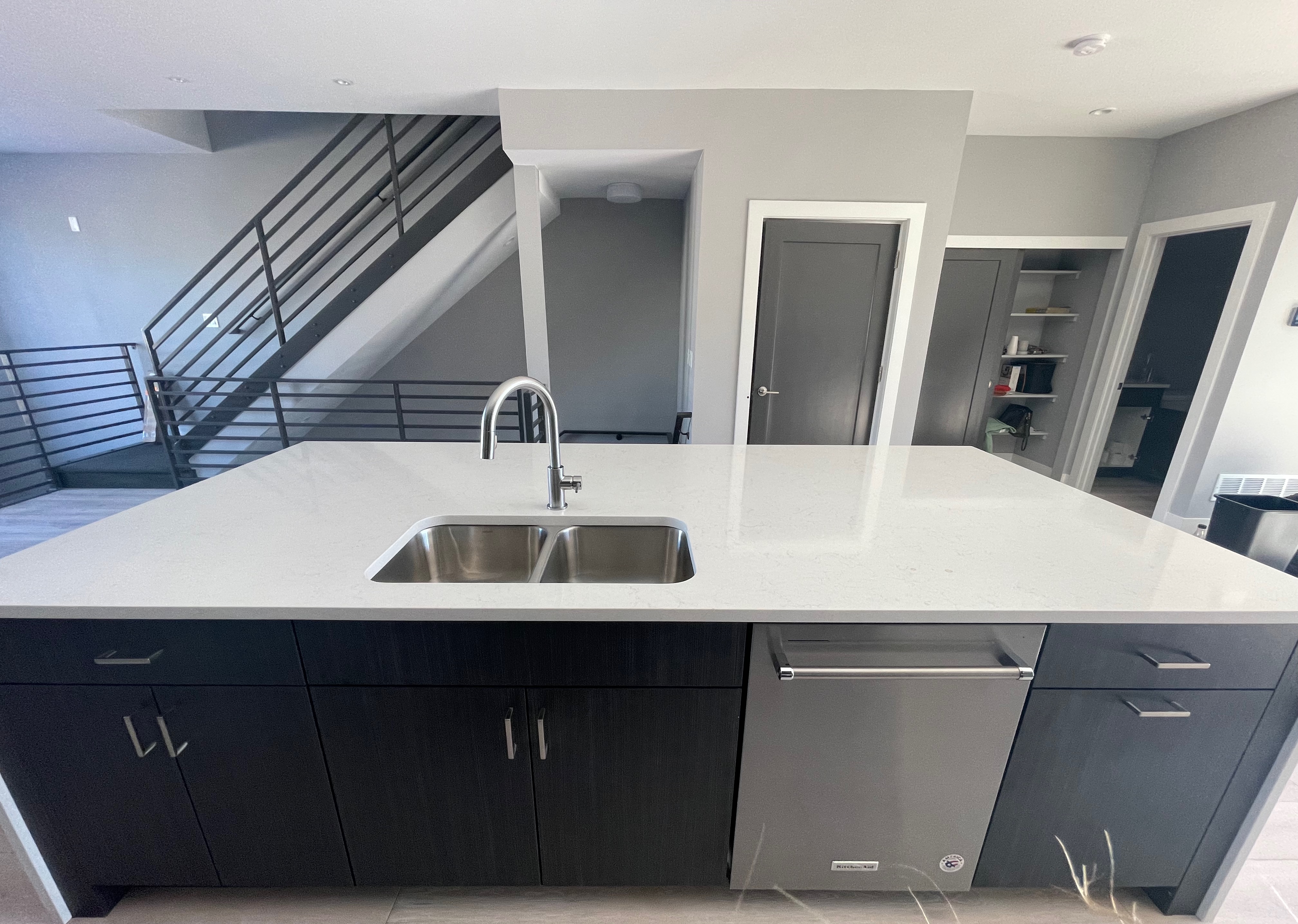 New, never used "Tharpe" Kitchen Cabinets in a gray textured melamine with Quartz Counter tops and brand new KitchenAid stainless steel appliances in a new build! The kitchen has been carefully removed by contractors and is ready to pick up anytime. Price for the package below.