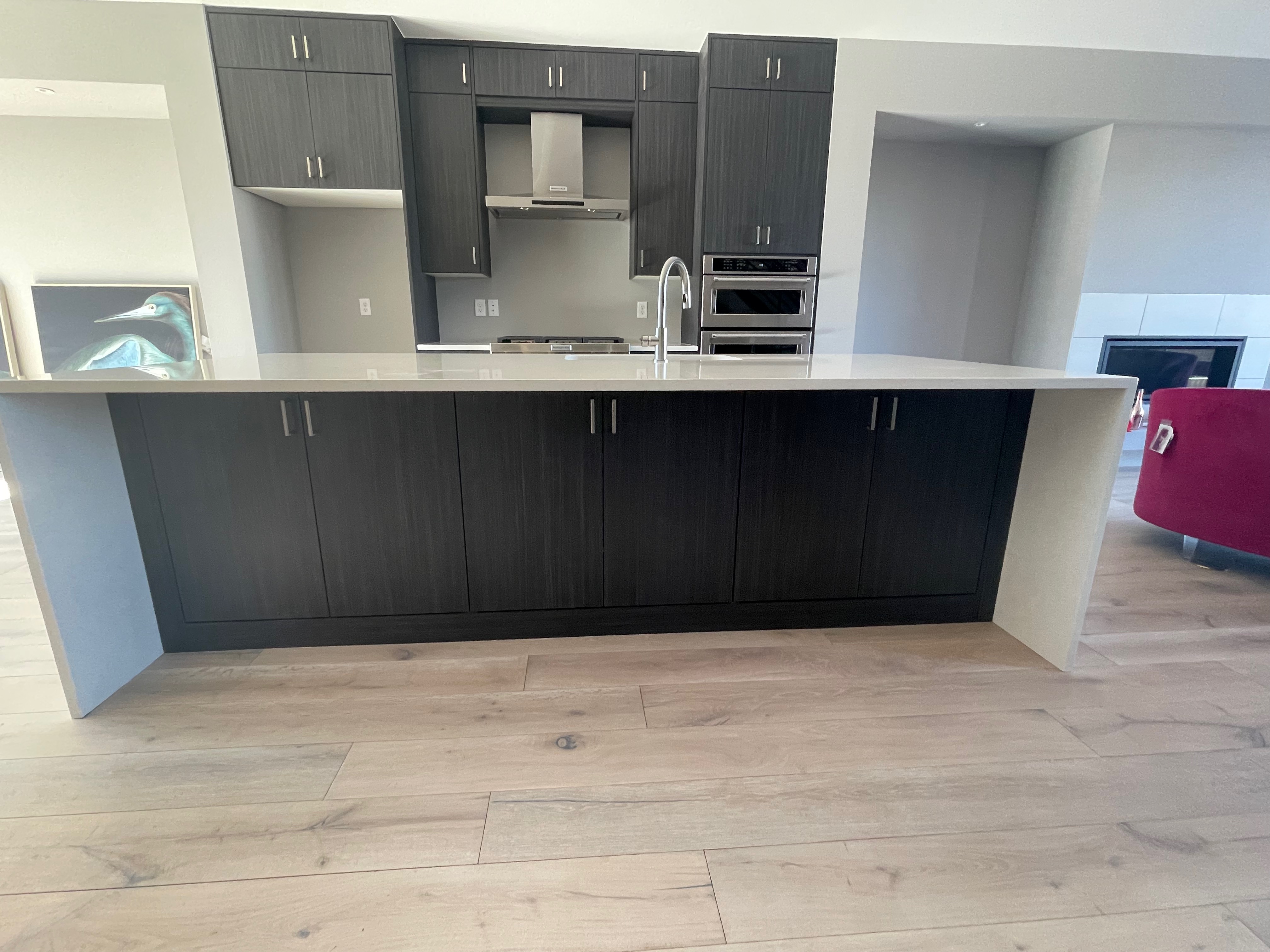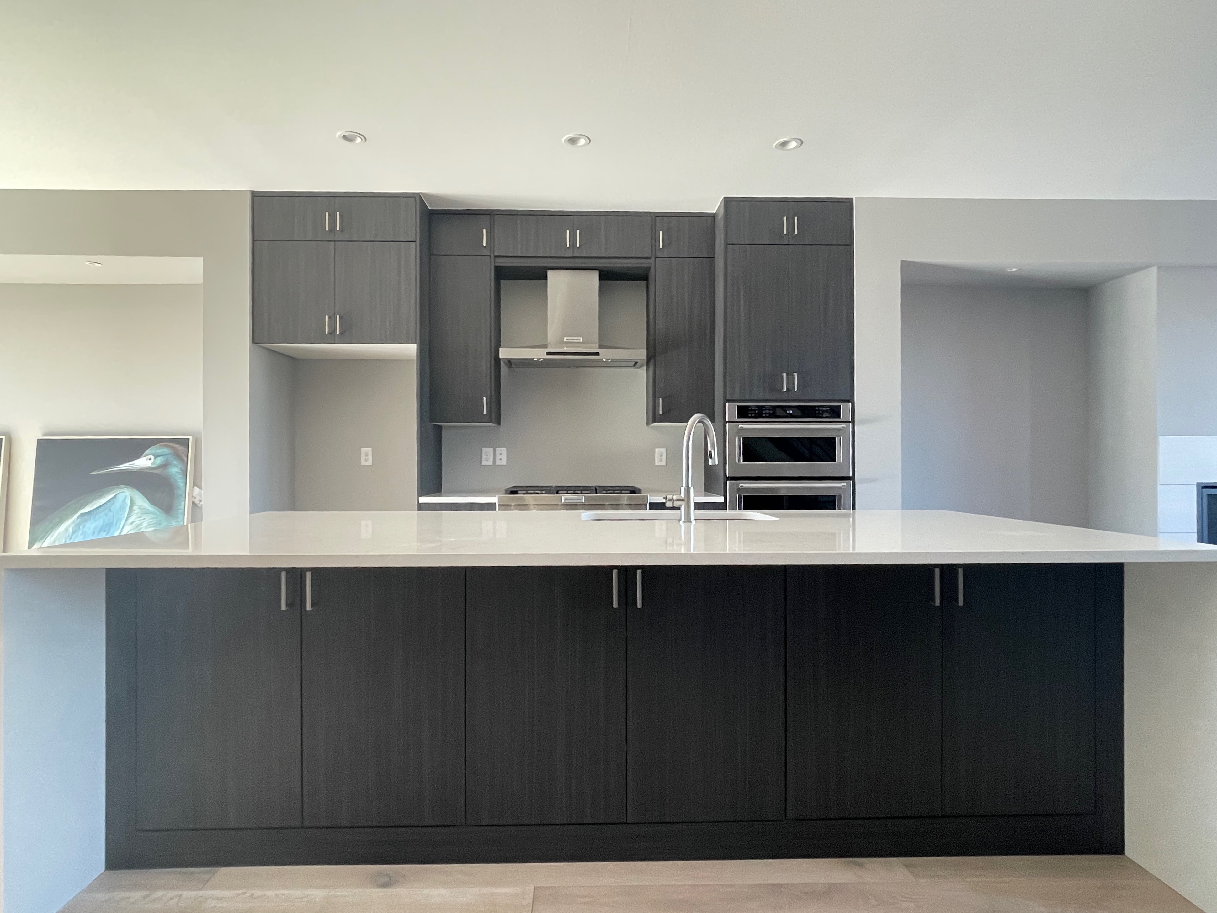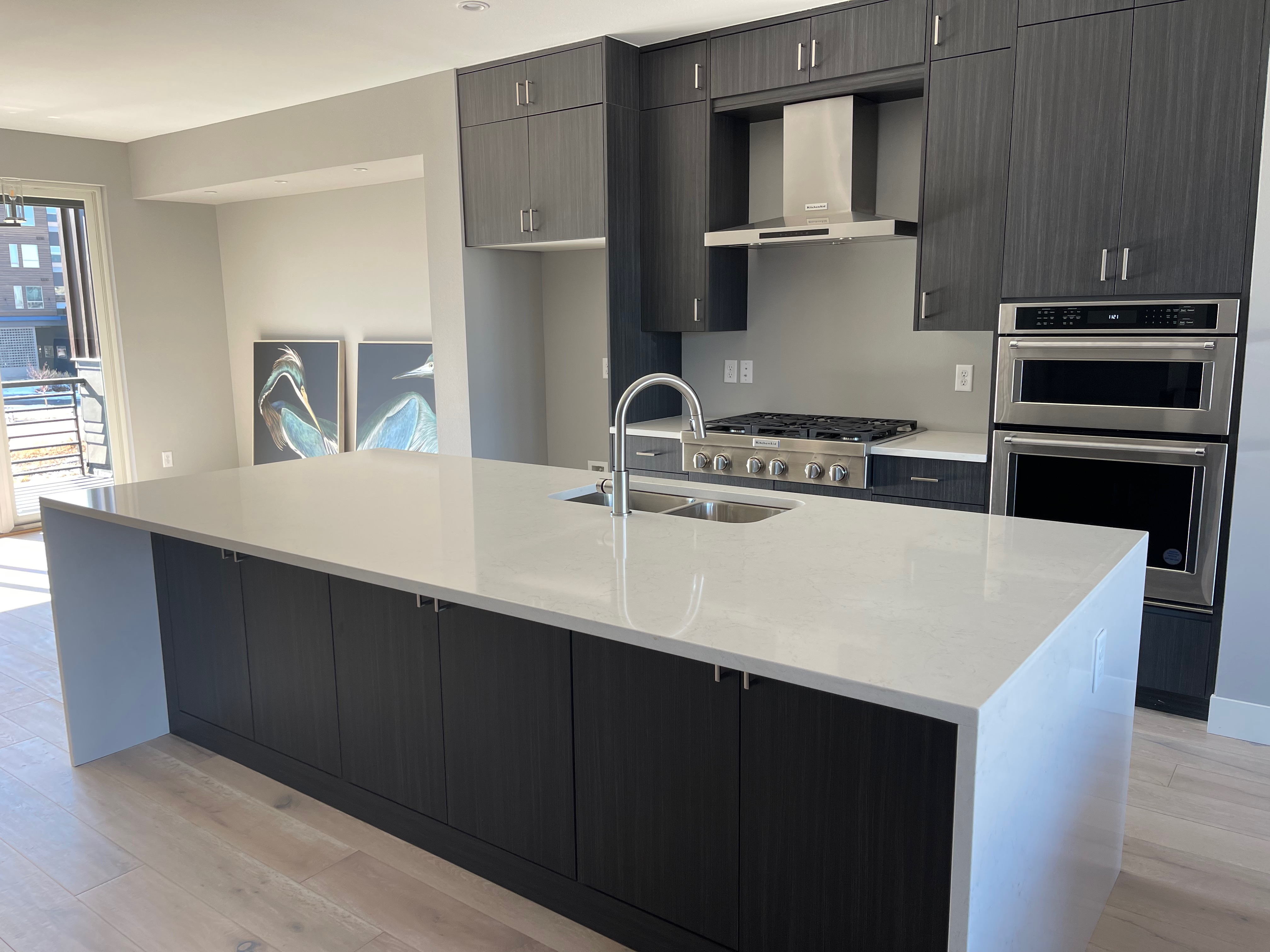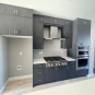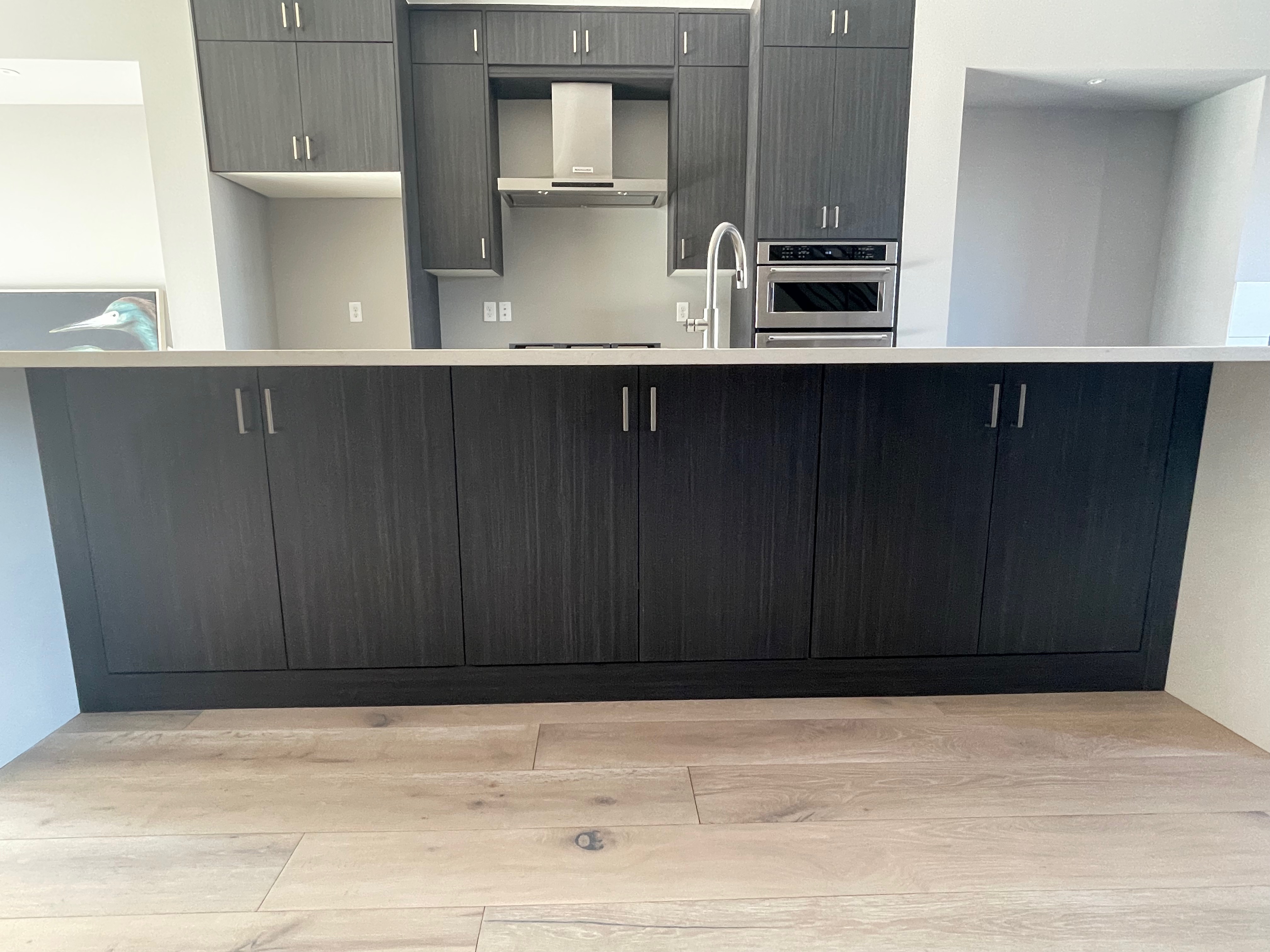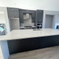 New, never used "Tharpe" Kitchen Cabinets in a gray textured melamine with Quartz Counter tops and brand new KitchenAid stainless steel appliances in a new build! The kitchen has been carefully removed by contractors and is ready to pick up anytime. Price for the package below.