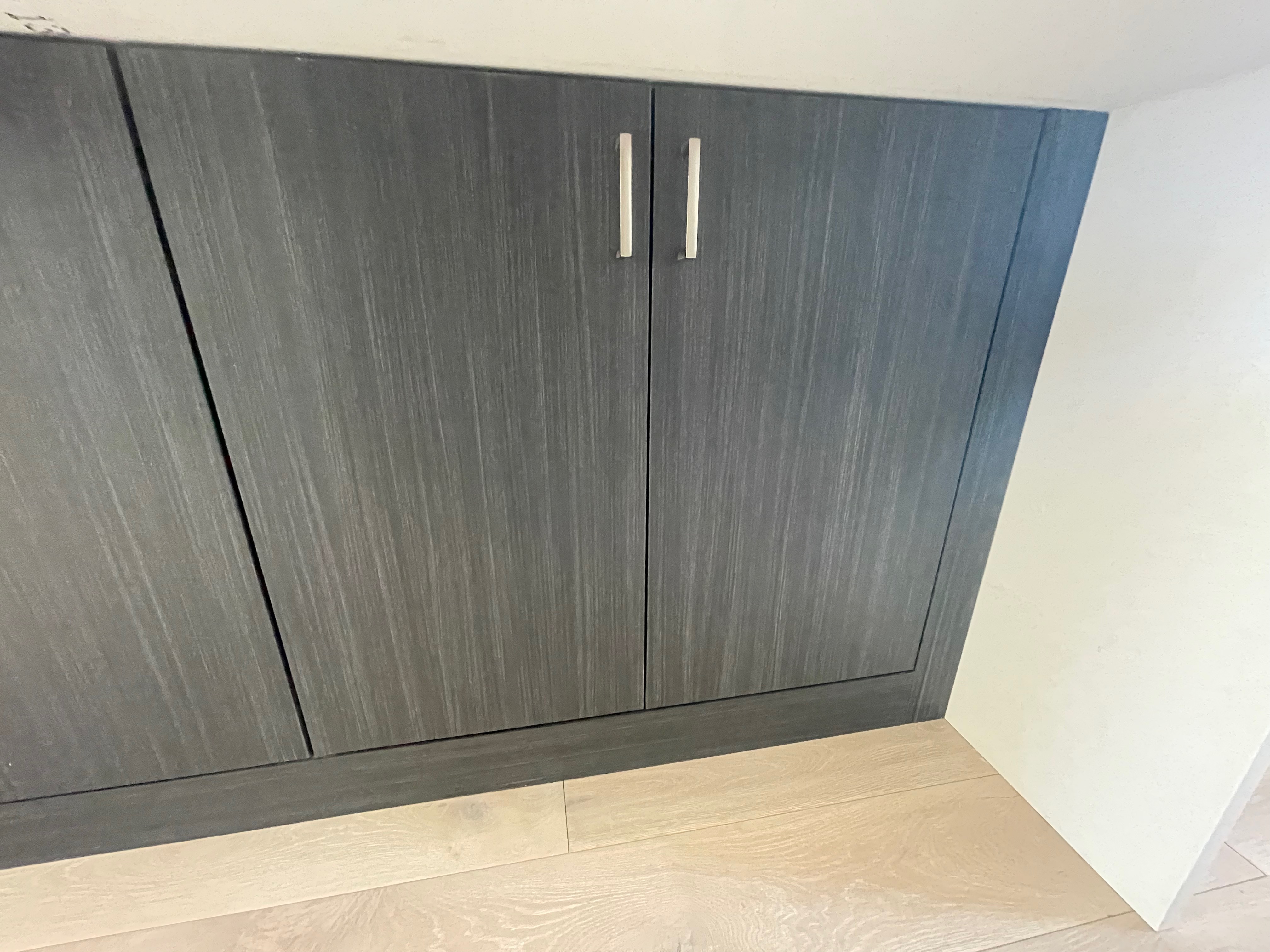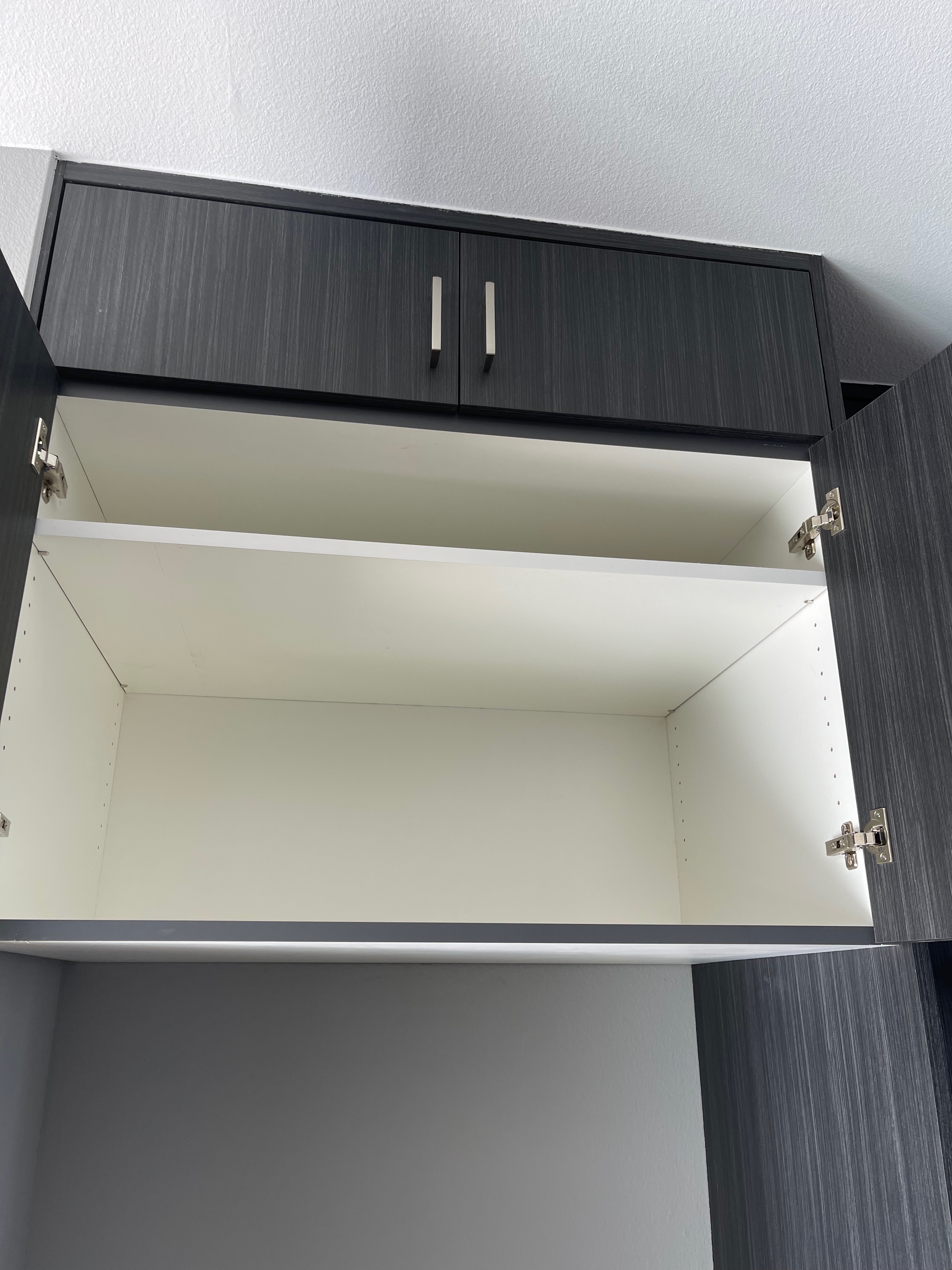 1-2 door/4 stacked wall cabinets above refrigerator space Dim.:38”w x 24”h and 10”h/overall 34” h/35 ¾”h w/crown x 24”d