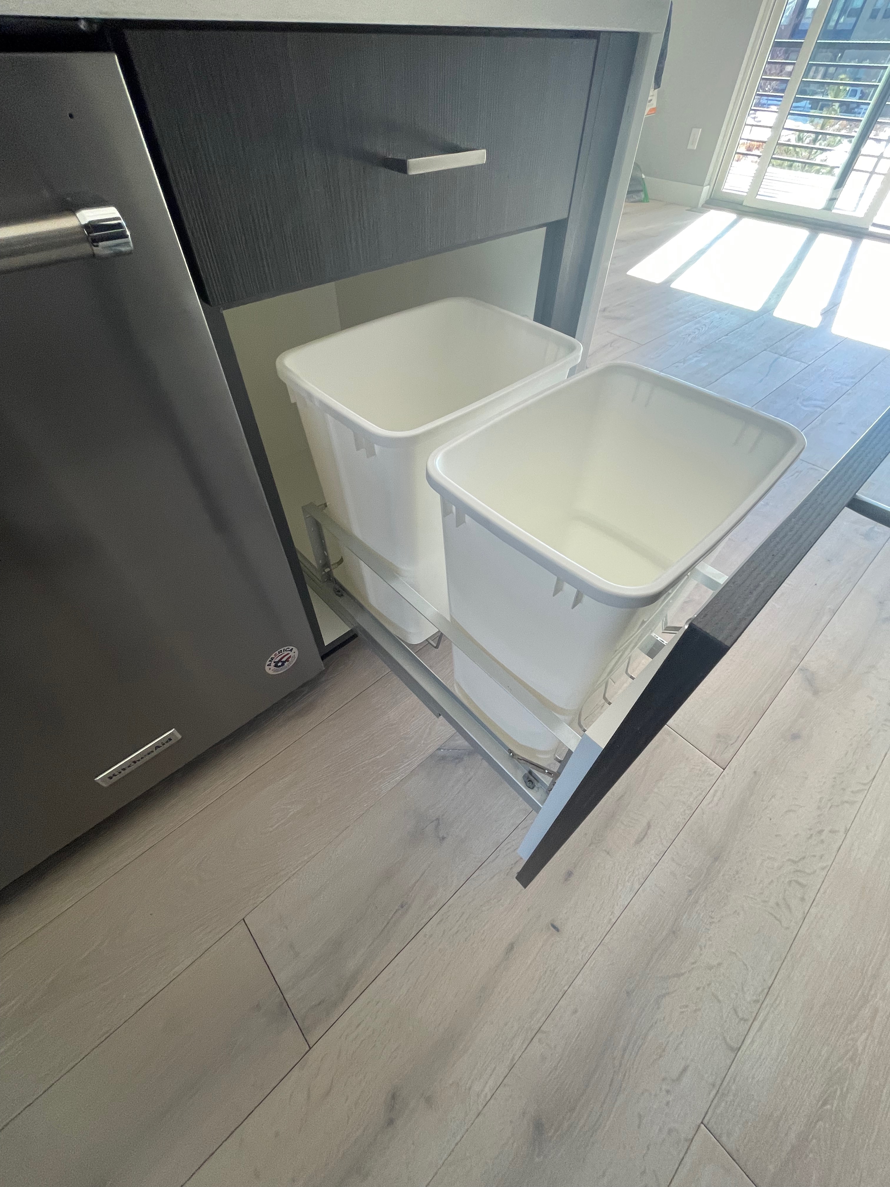 1-One drawer, One pull out door,2 trash cans Dim.:20 5/8” w x 36”h x 24”