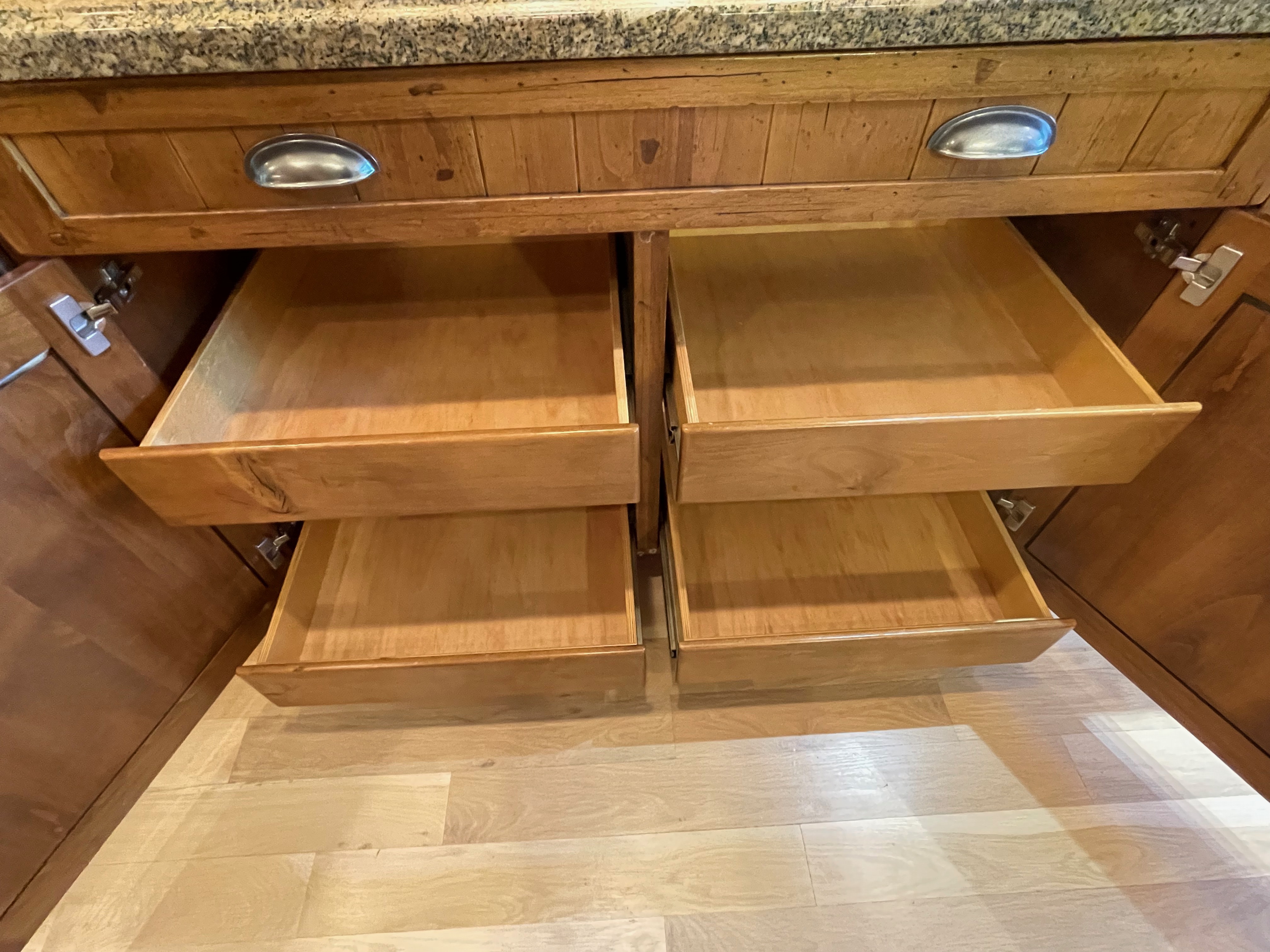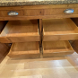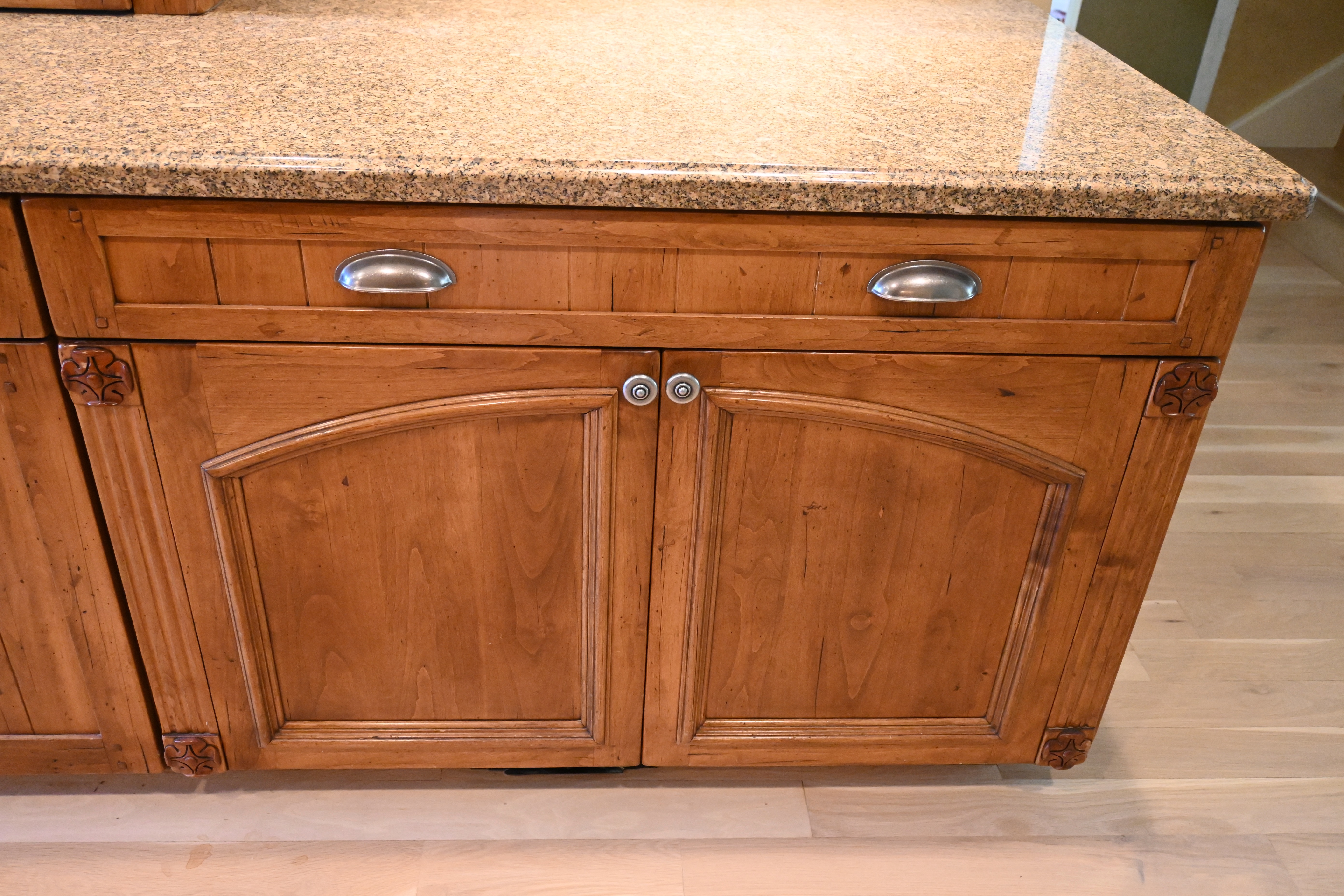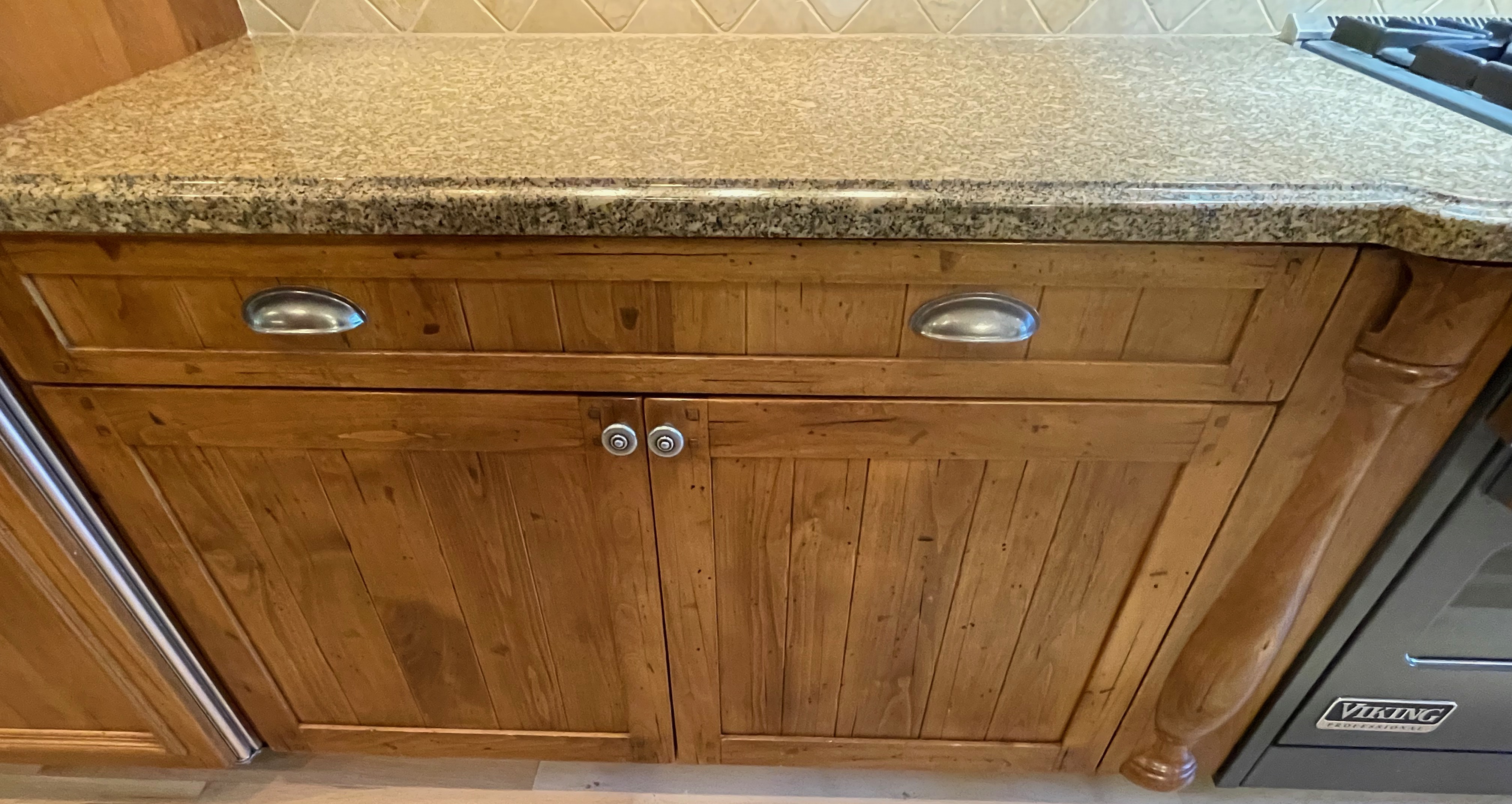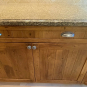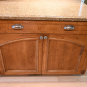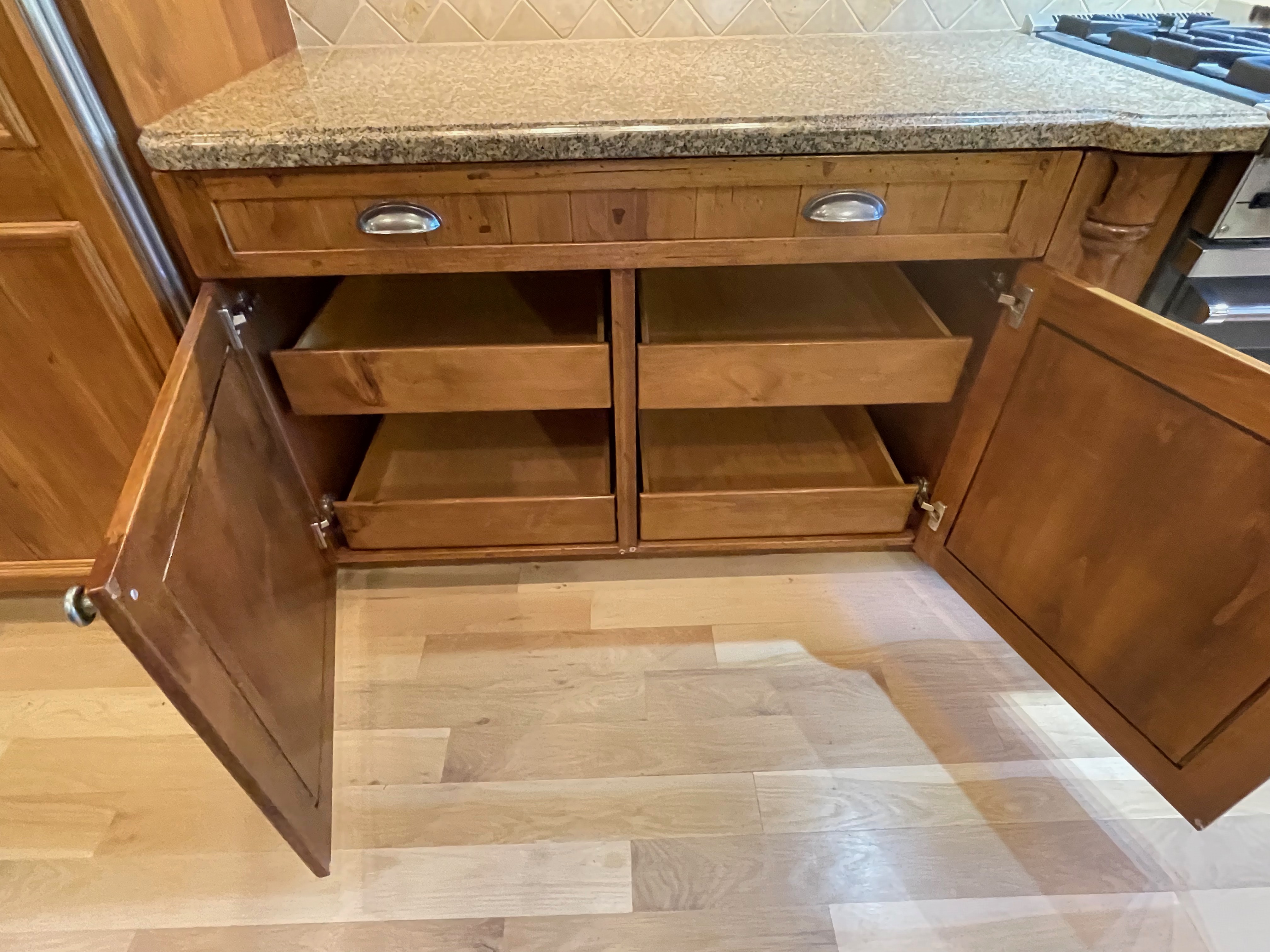 1-One drawer, two door base cabinet w/ 4 alder wood pull out drawers on refrigerator wall Dim.: 48”w x 36”h x 24”d