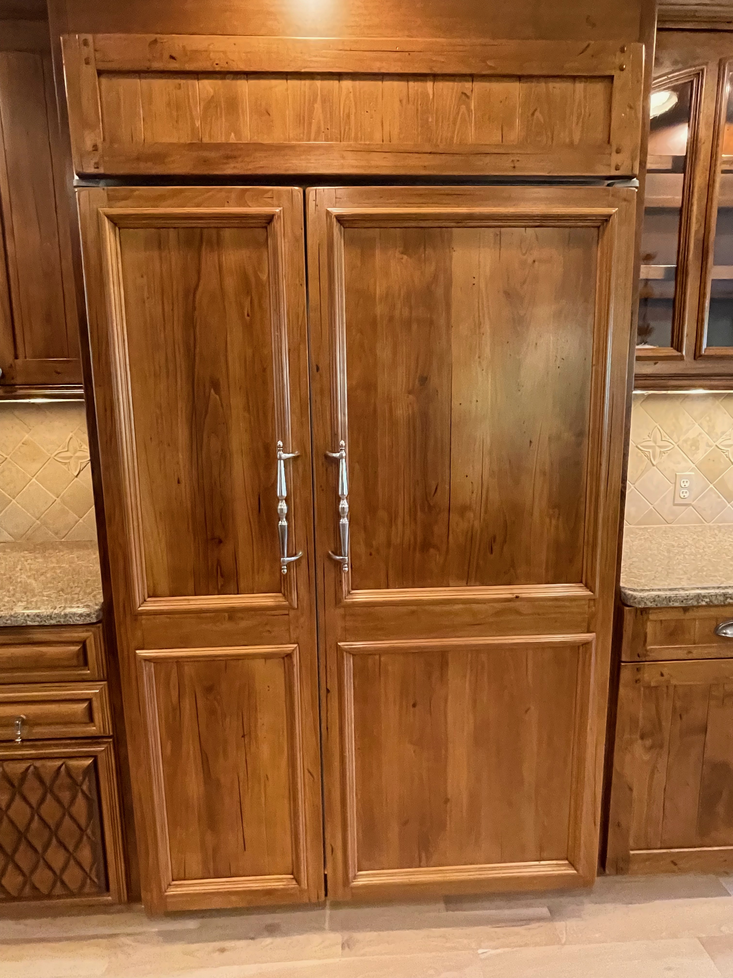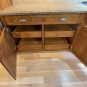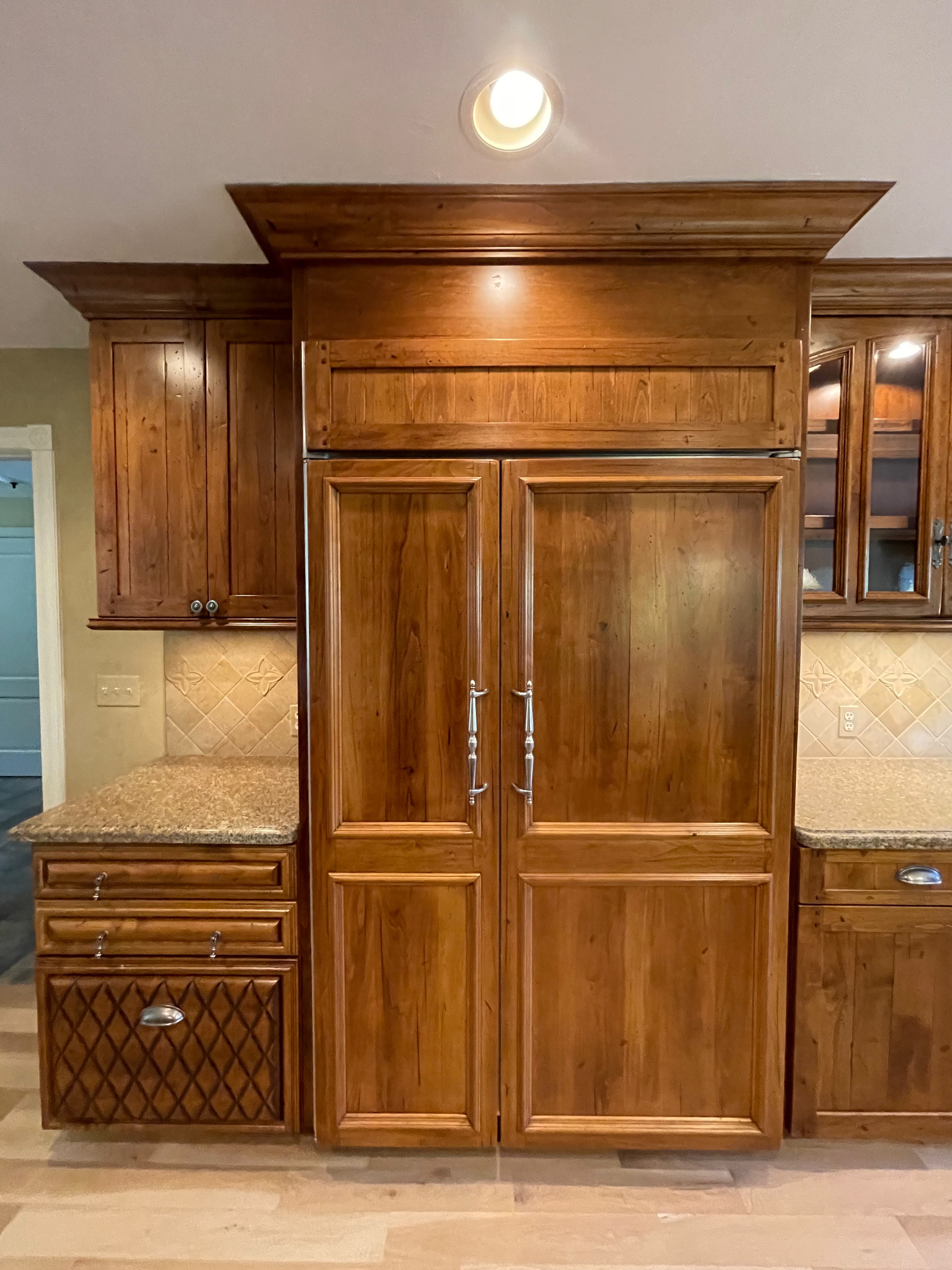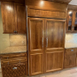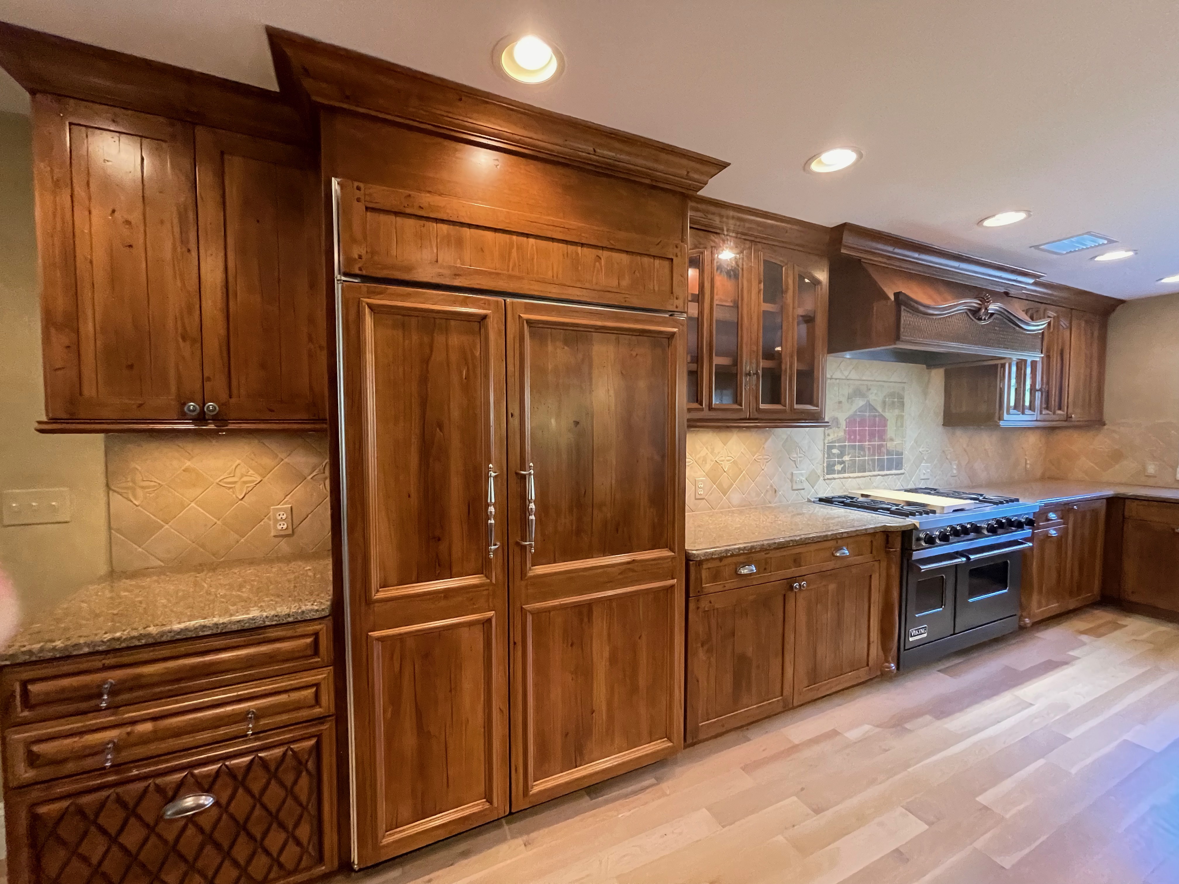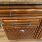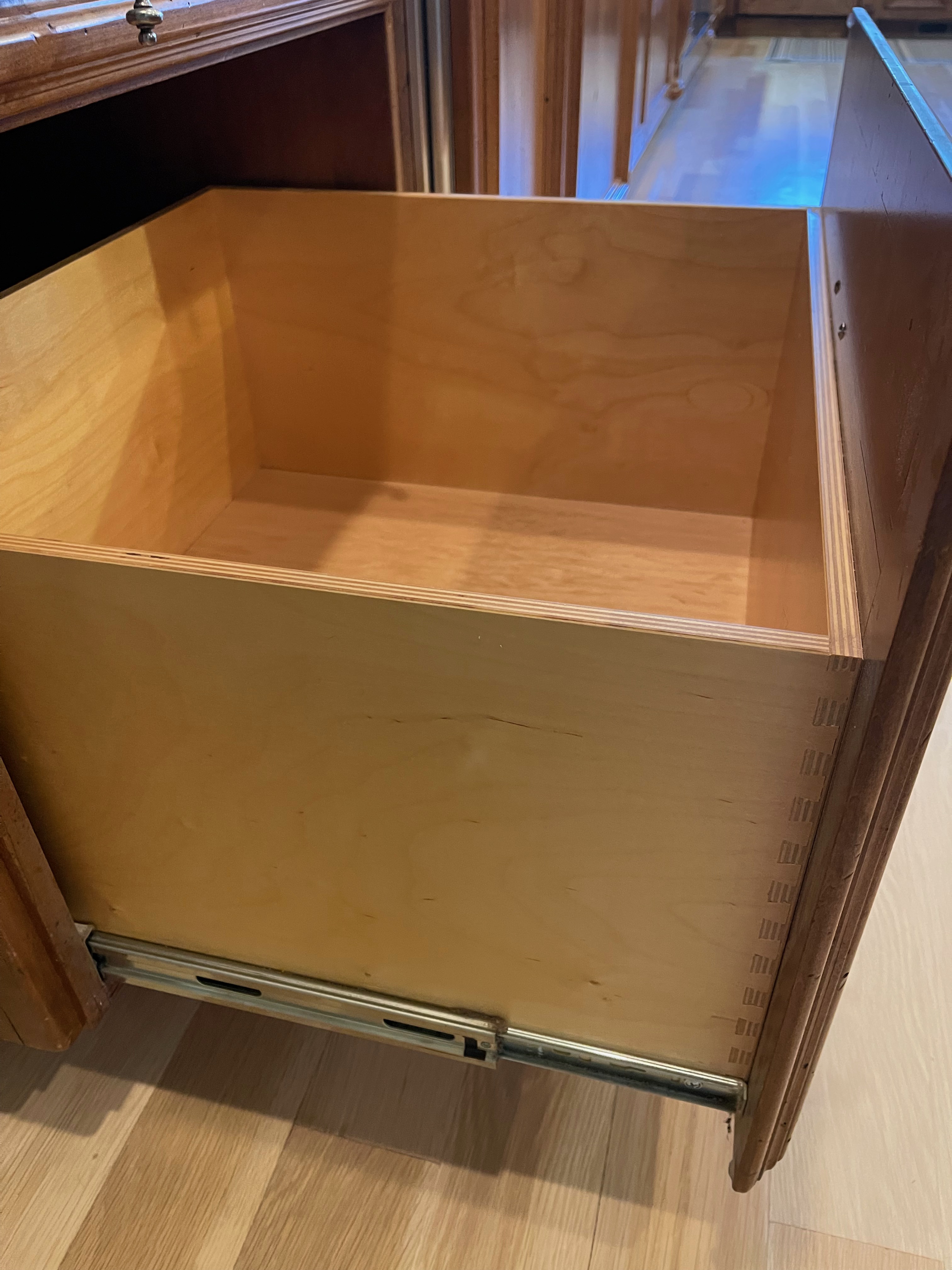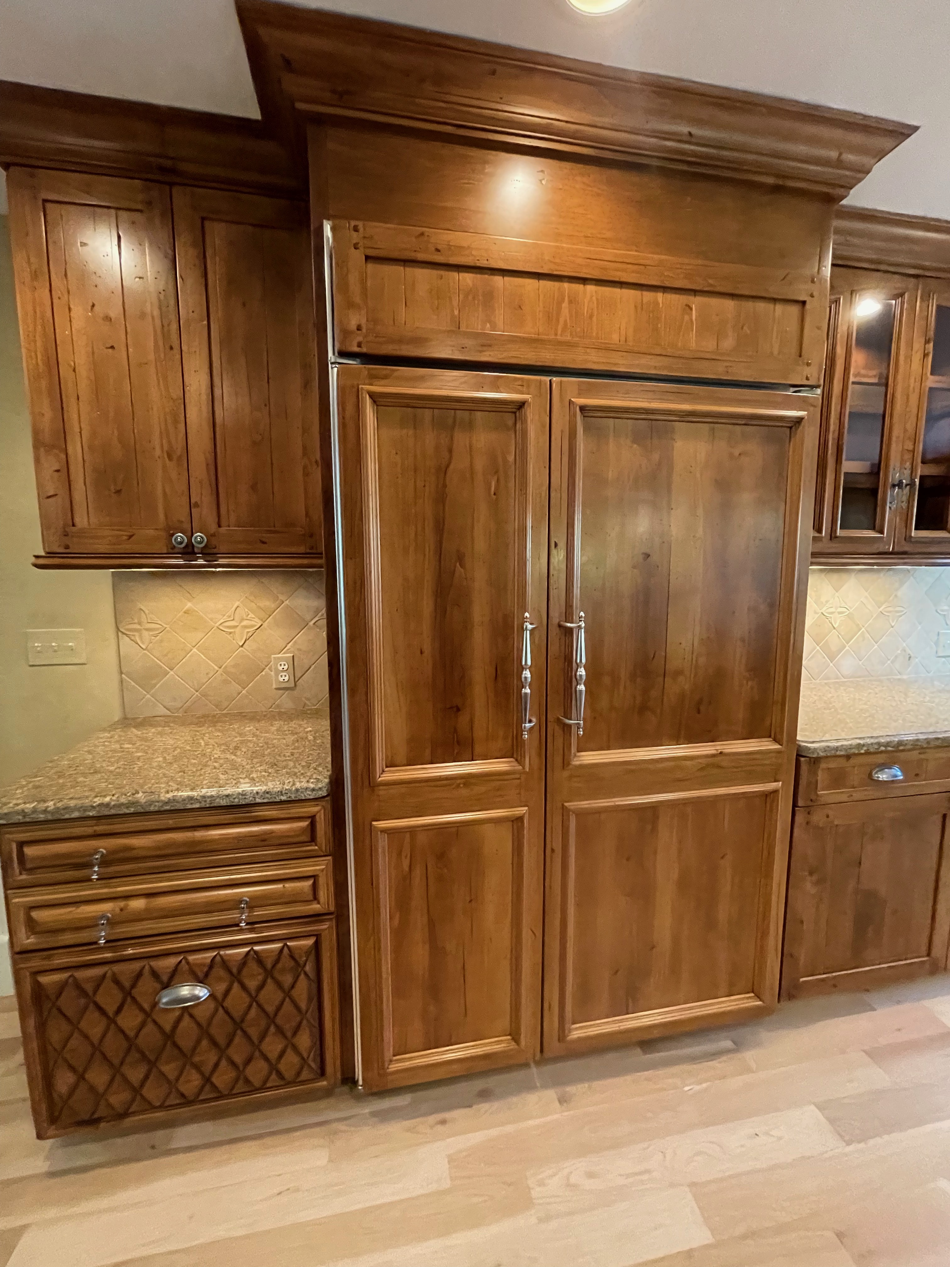 1-One drawer, two door base cabinet w/ 4 alder wood pull out drawers on refrigerator wall Dim.: 48”w x 36”h x 24”d