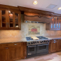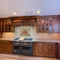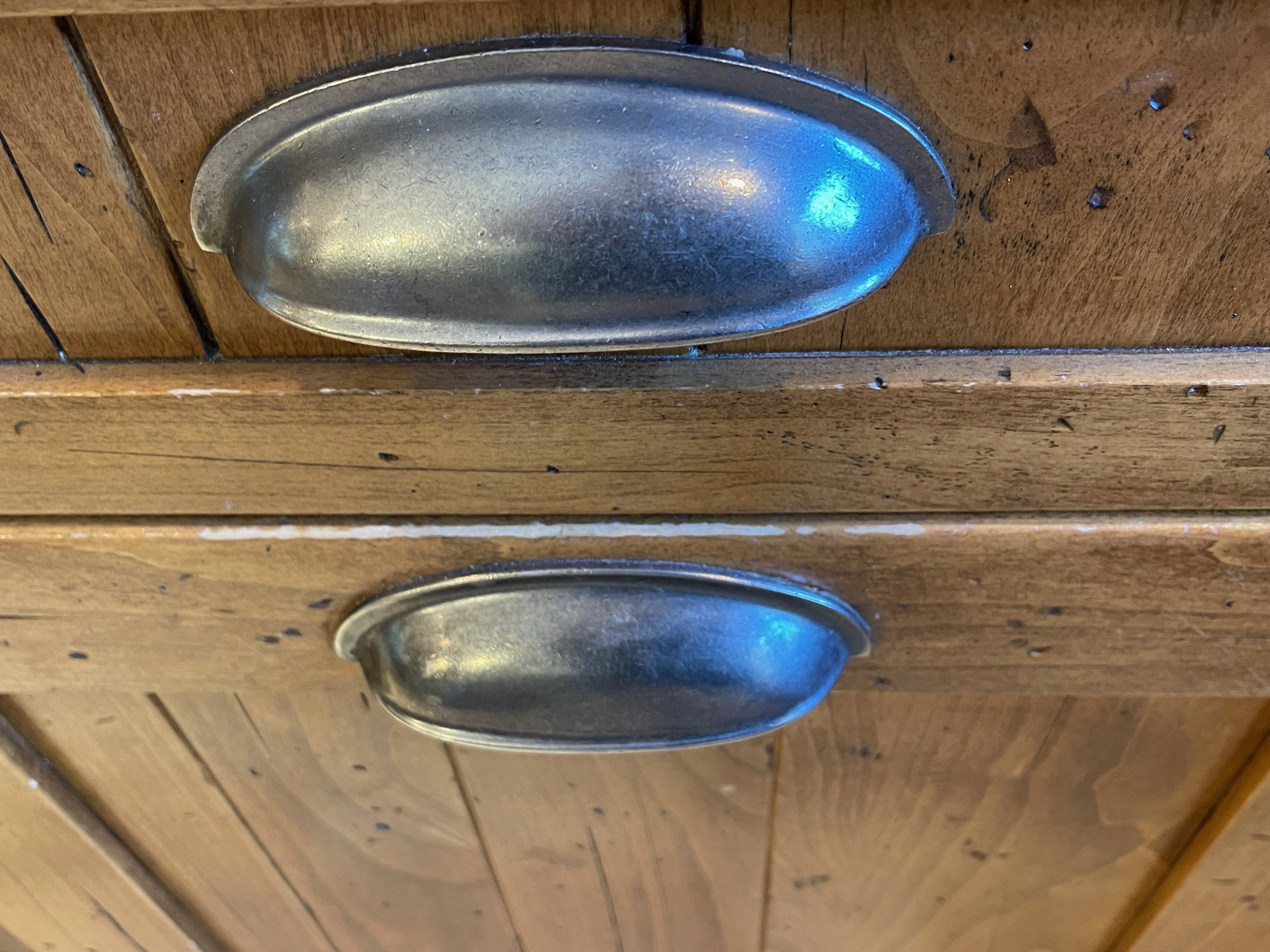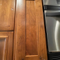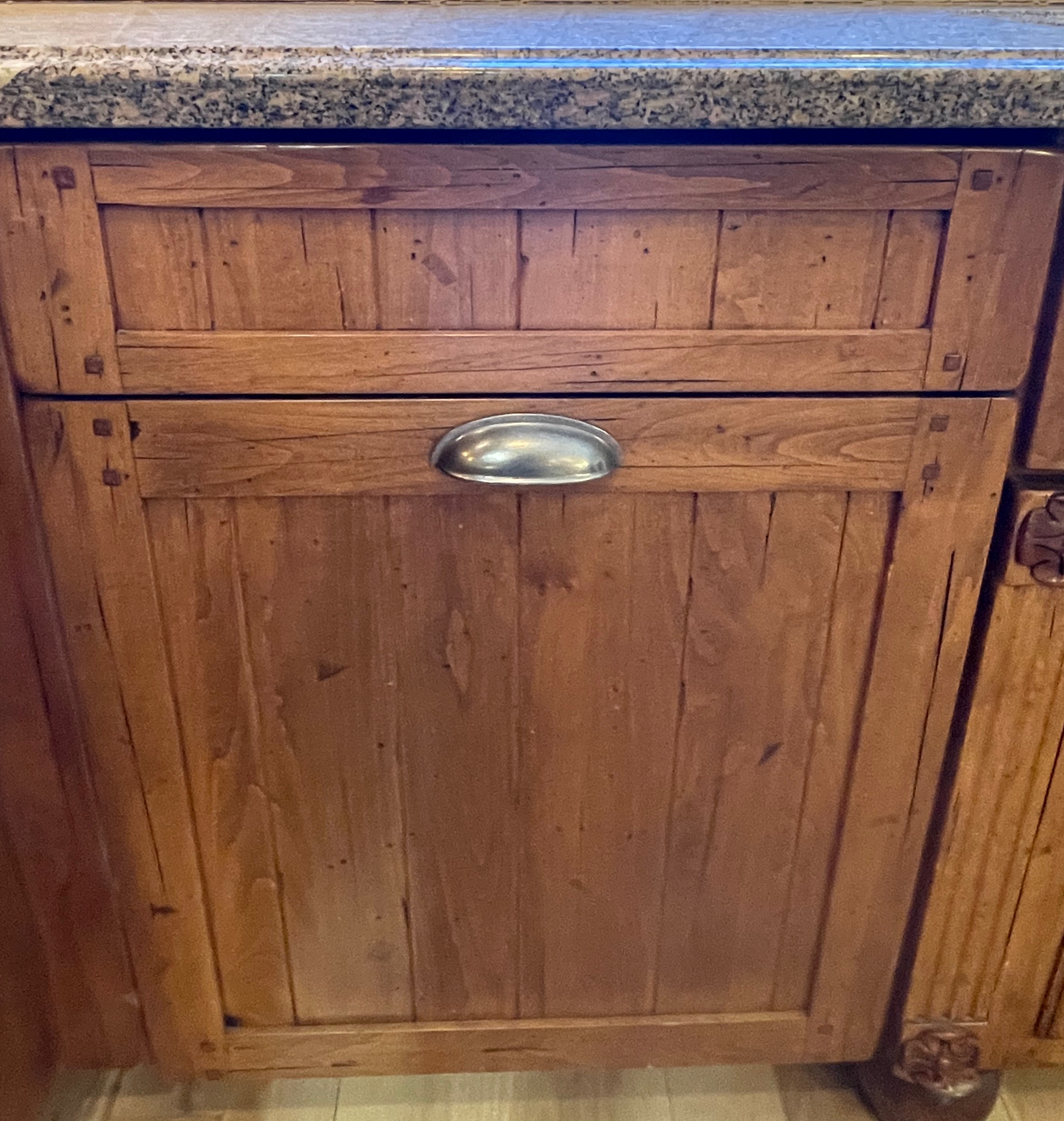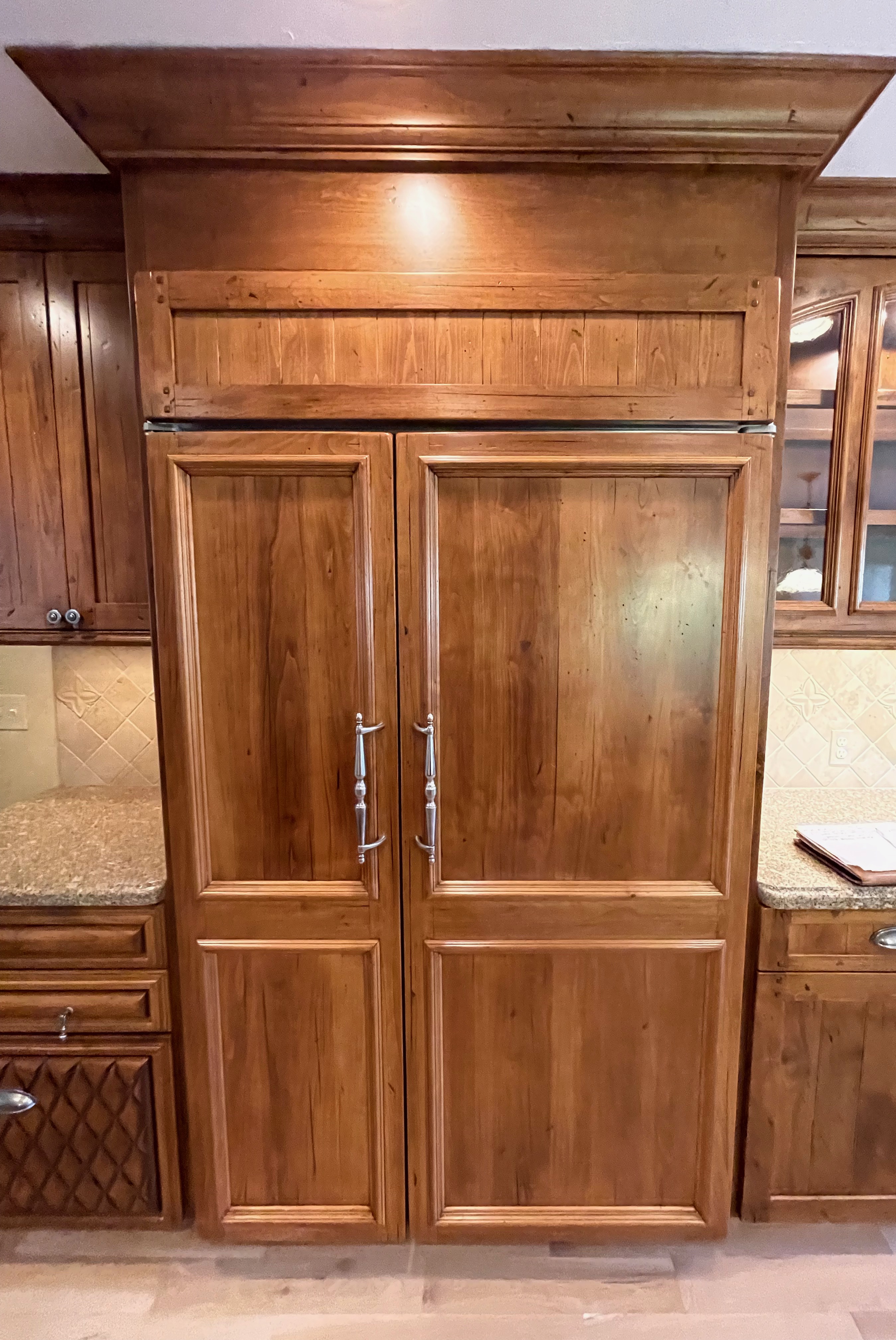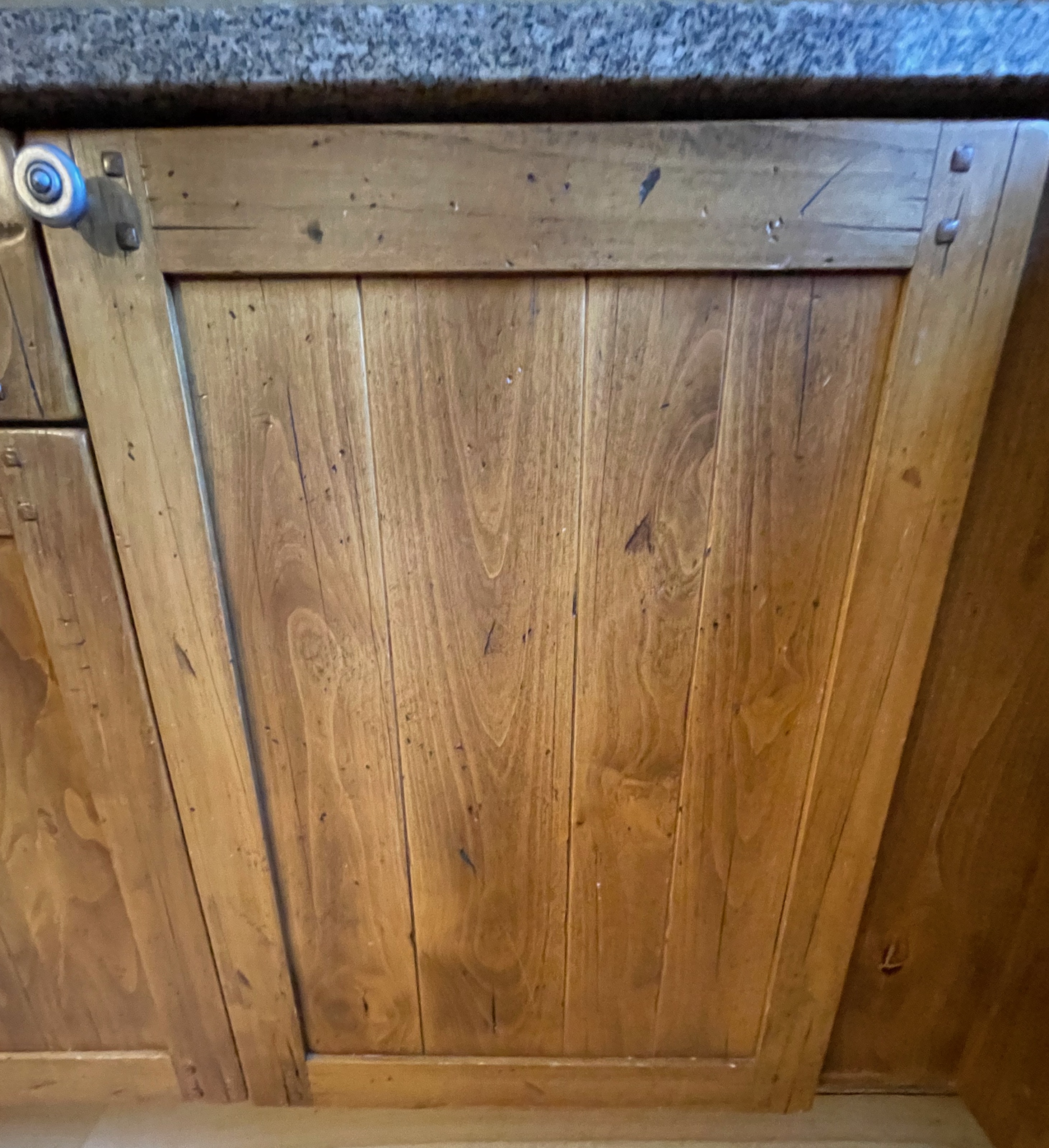 1-One drawer, two door base cabinet w/ 4 alder wood pull out drawers on refrigerator wall Dim.: 48”w x 36”h x 24”d