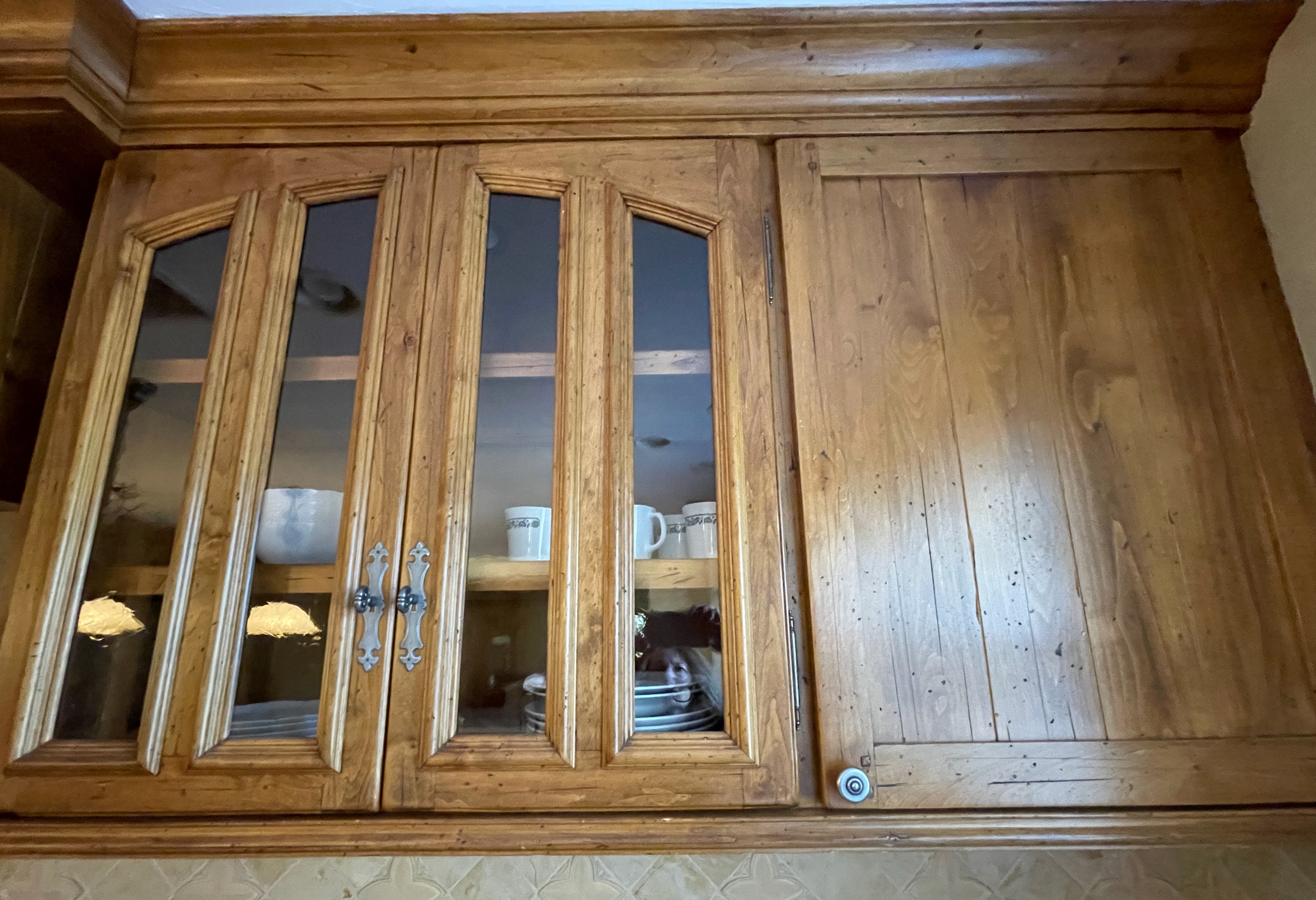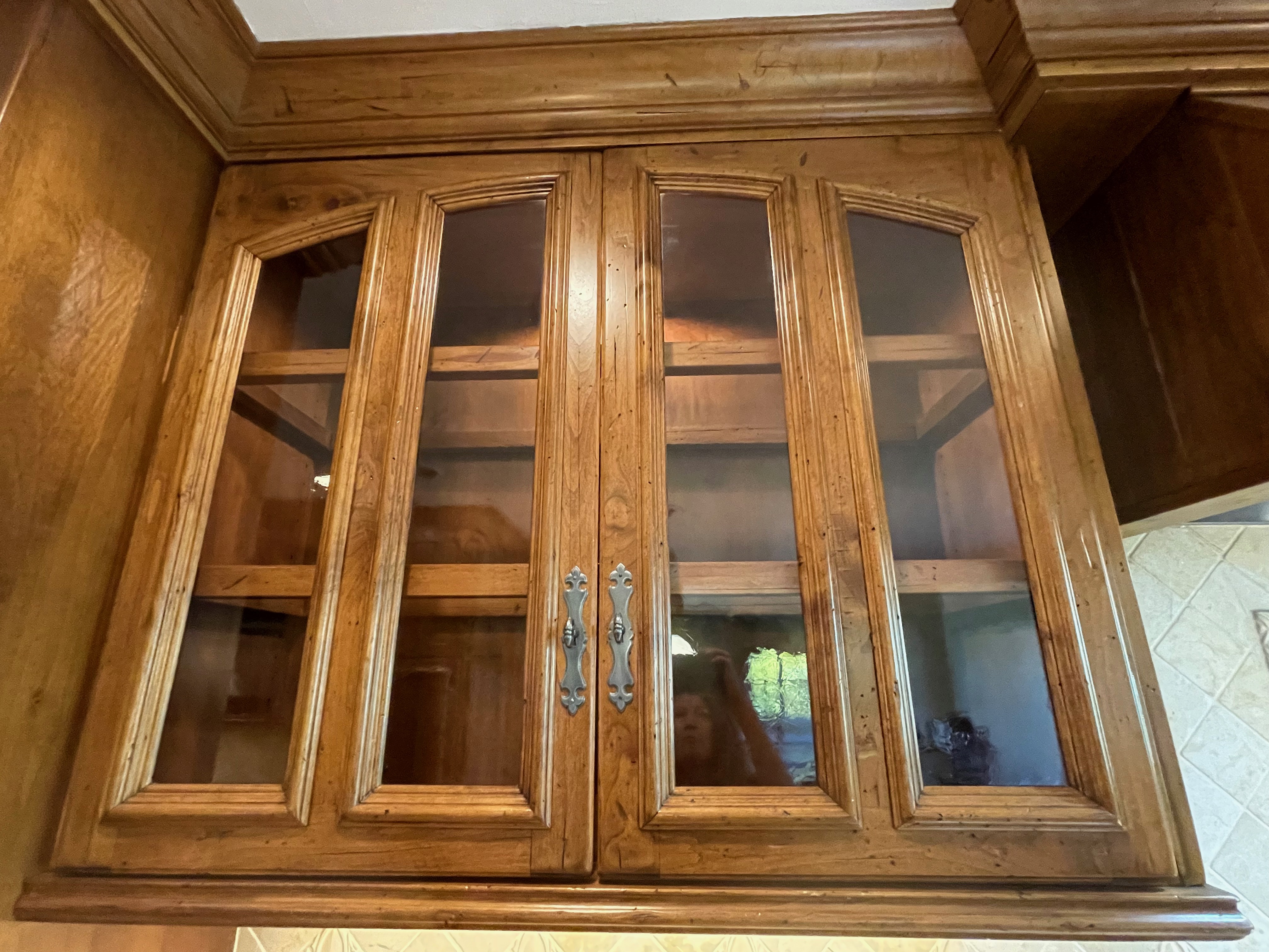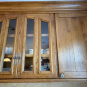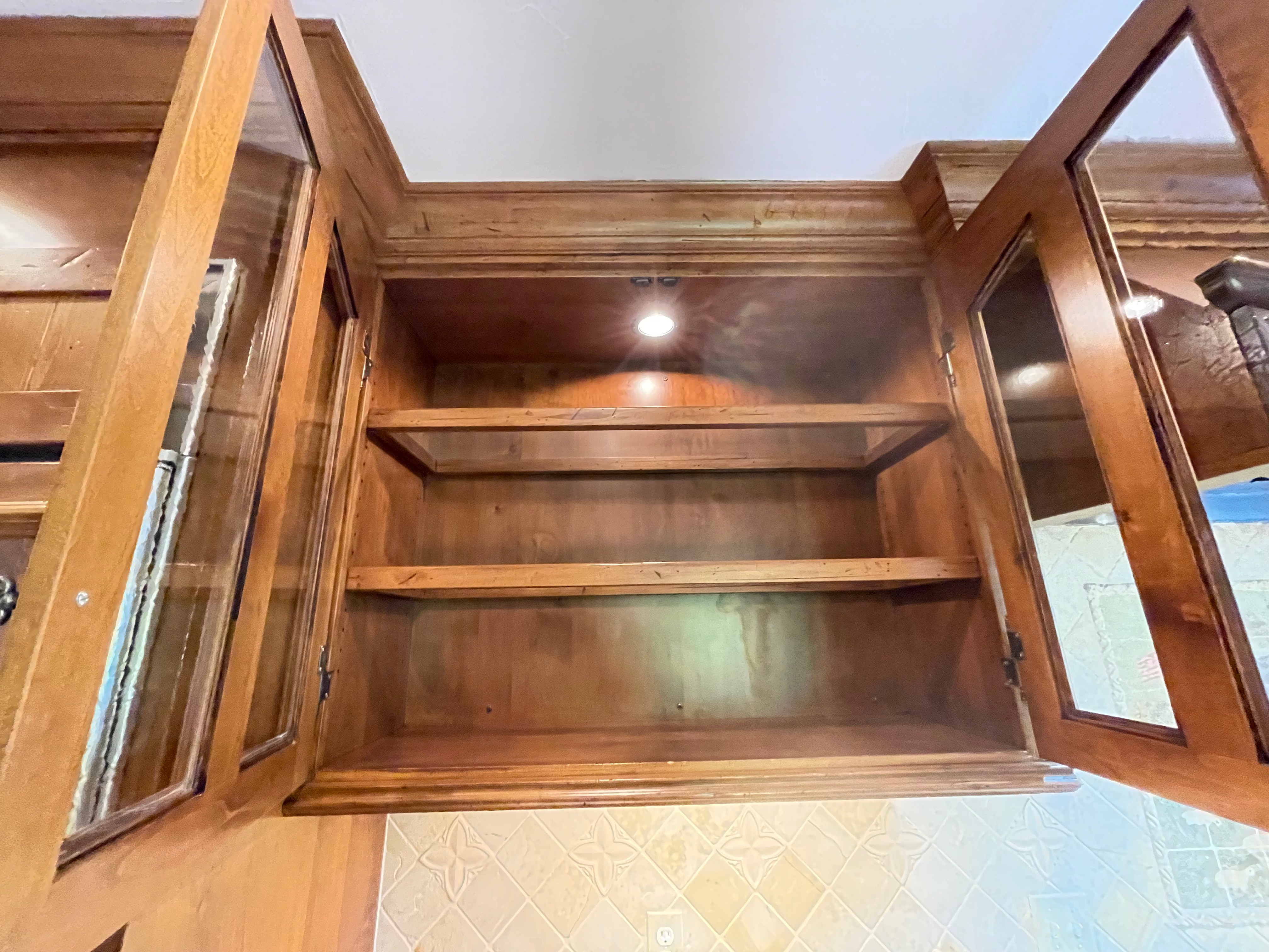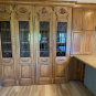 1-Two glass front door wall cabinets Dim.: 36”w /38”w x 34 ½” cab. only /39”h w/ crown/40 ½”w/bottom trim x 15”d
