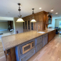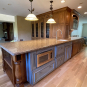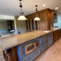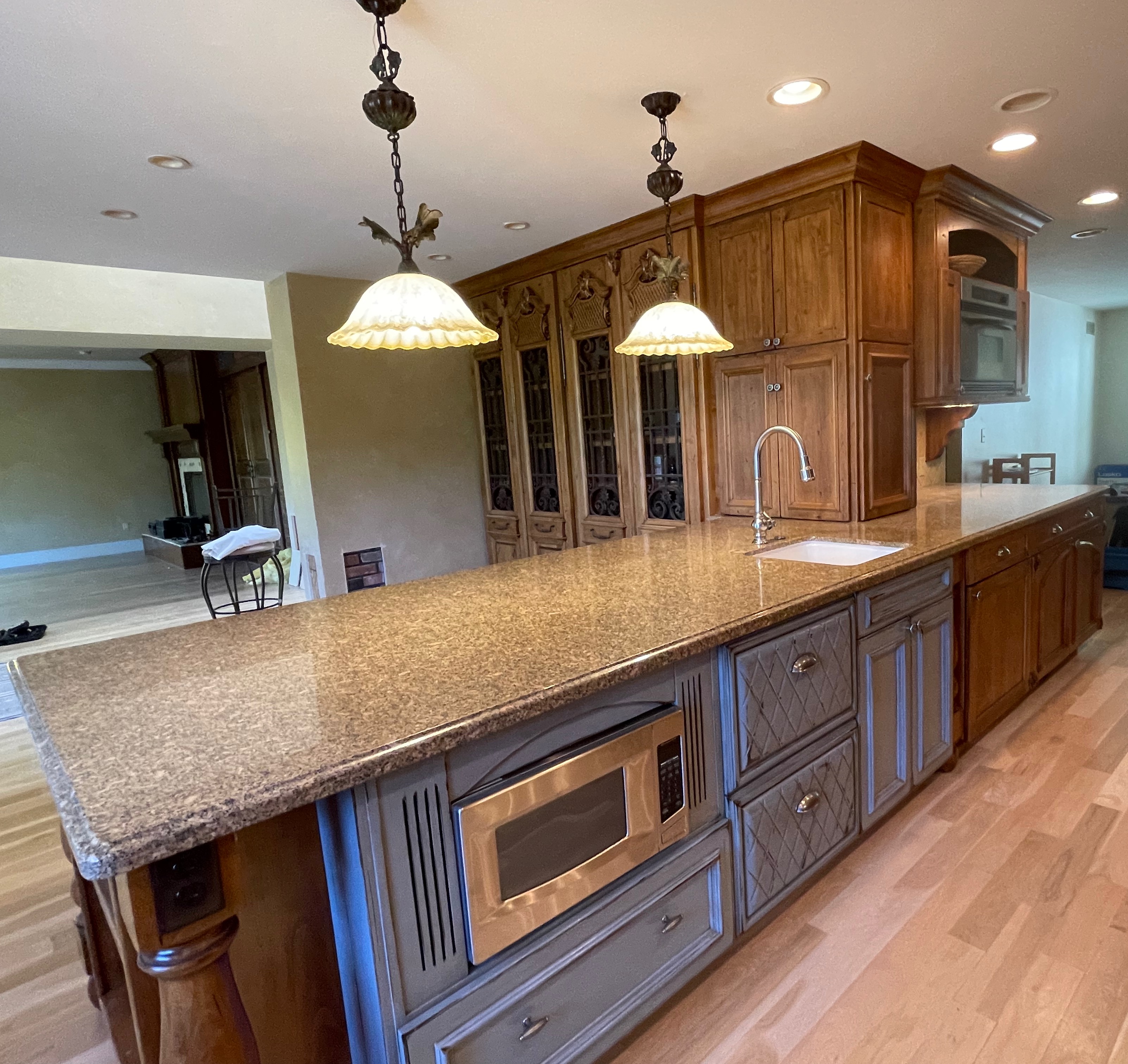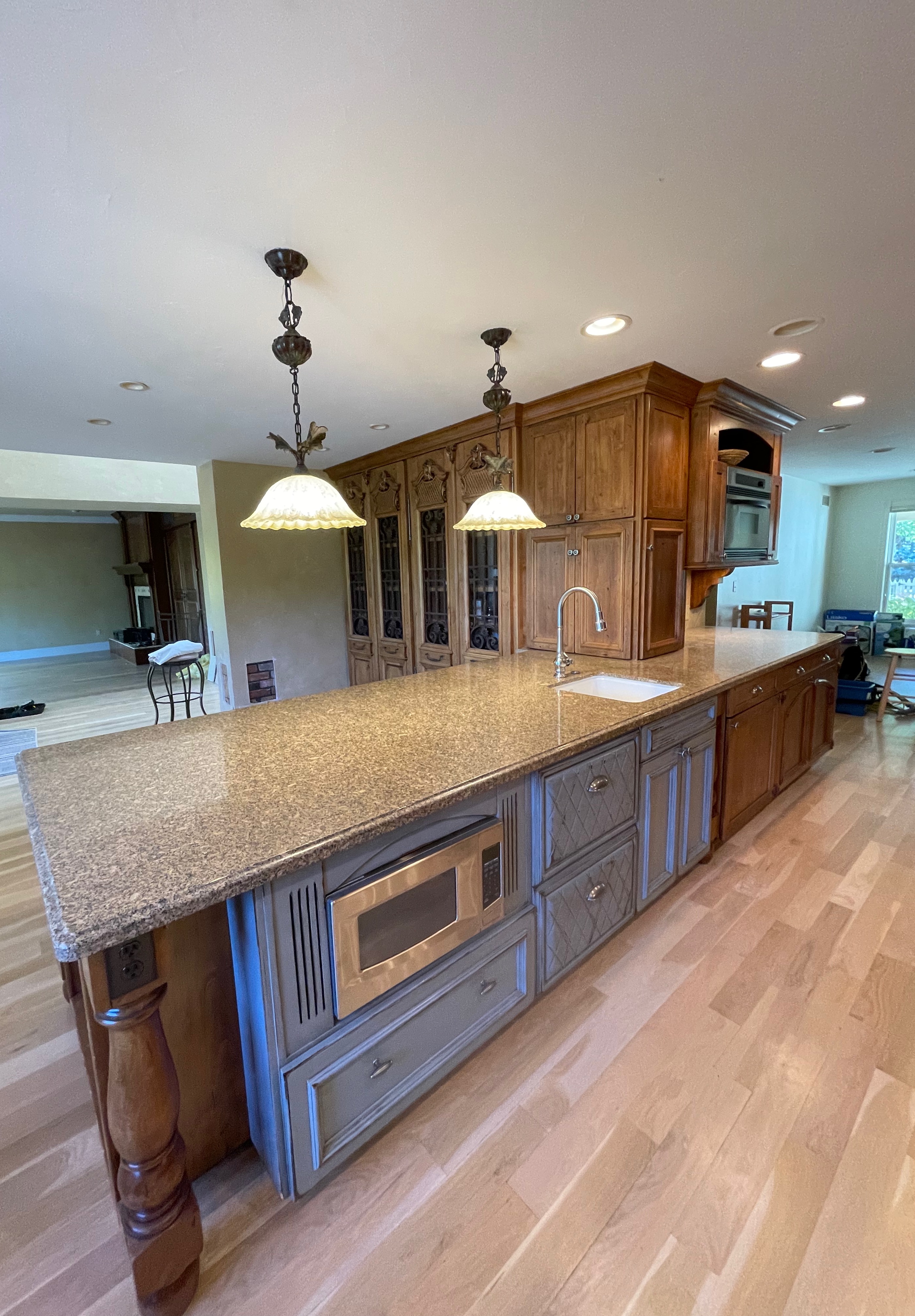Blue base cabinets on the peninsula in a cornflower/dusty blue