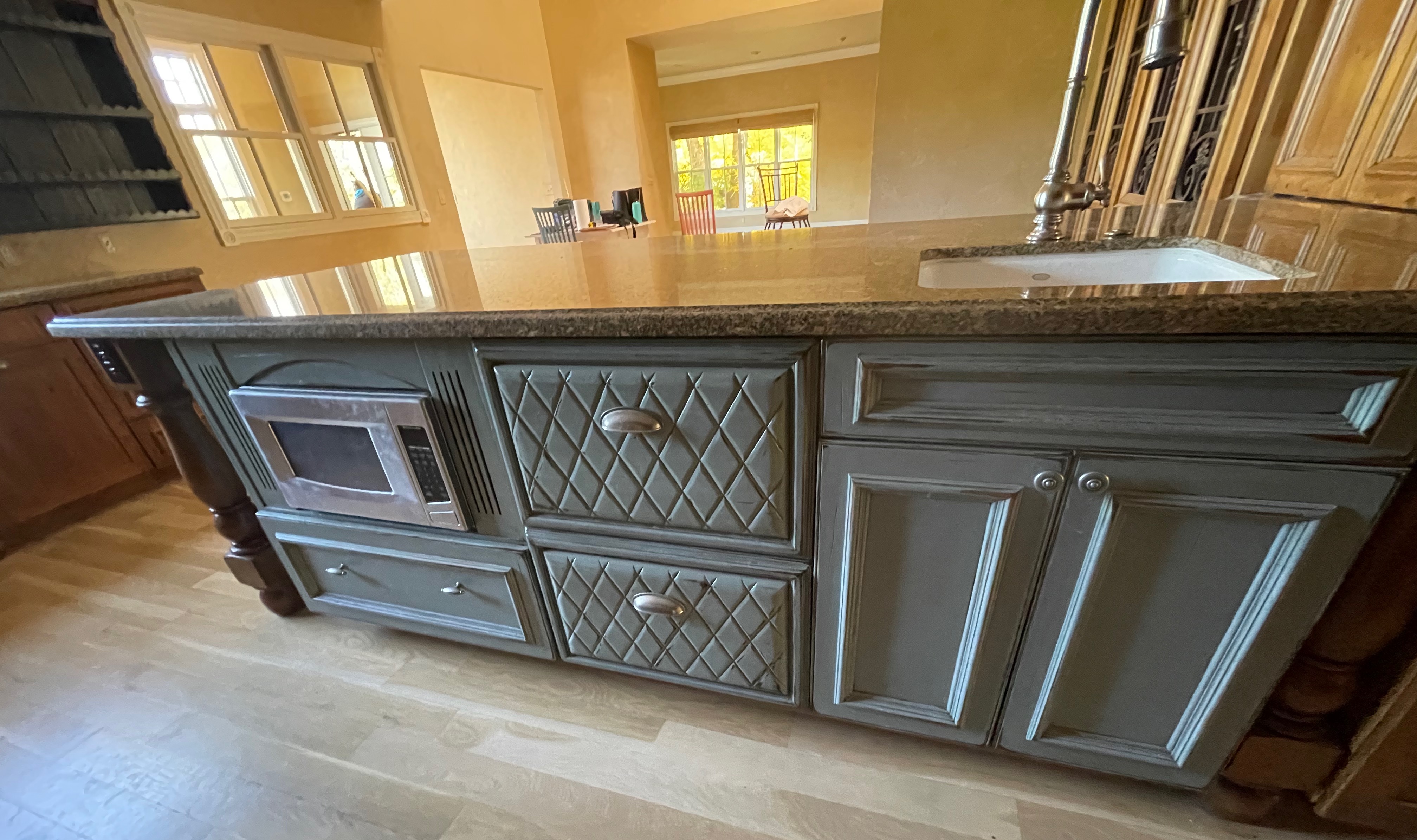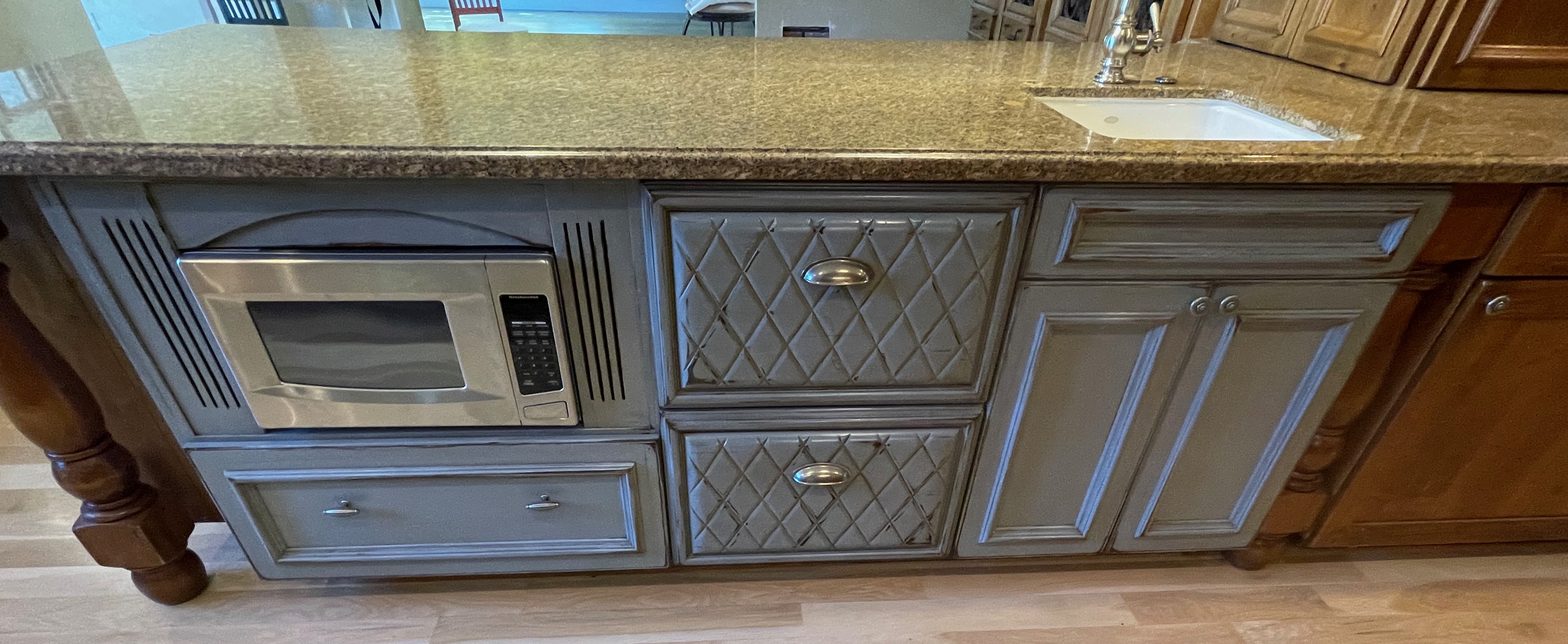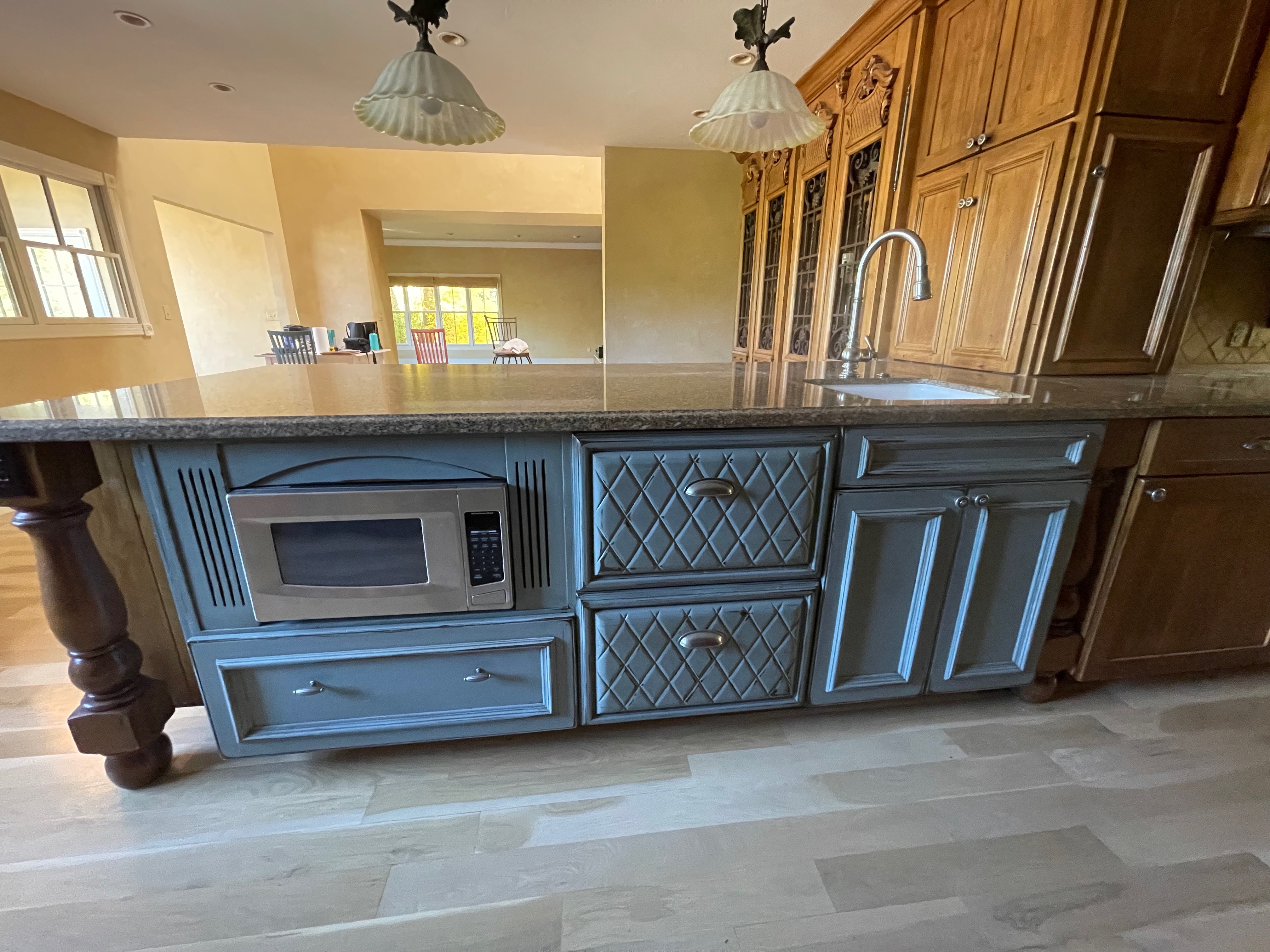 1-One microwave, one drawer base cabinet in blue in the peninsula Dim.: 33”w/34”w x 36”h x 24”d
