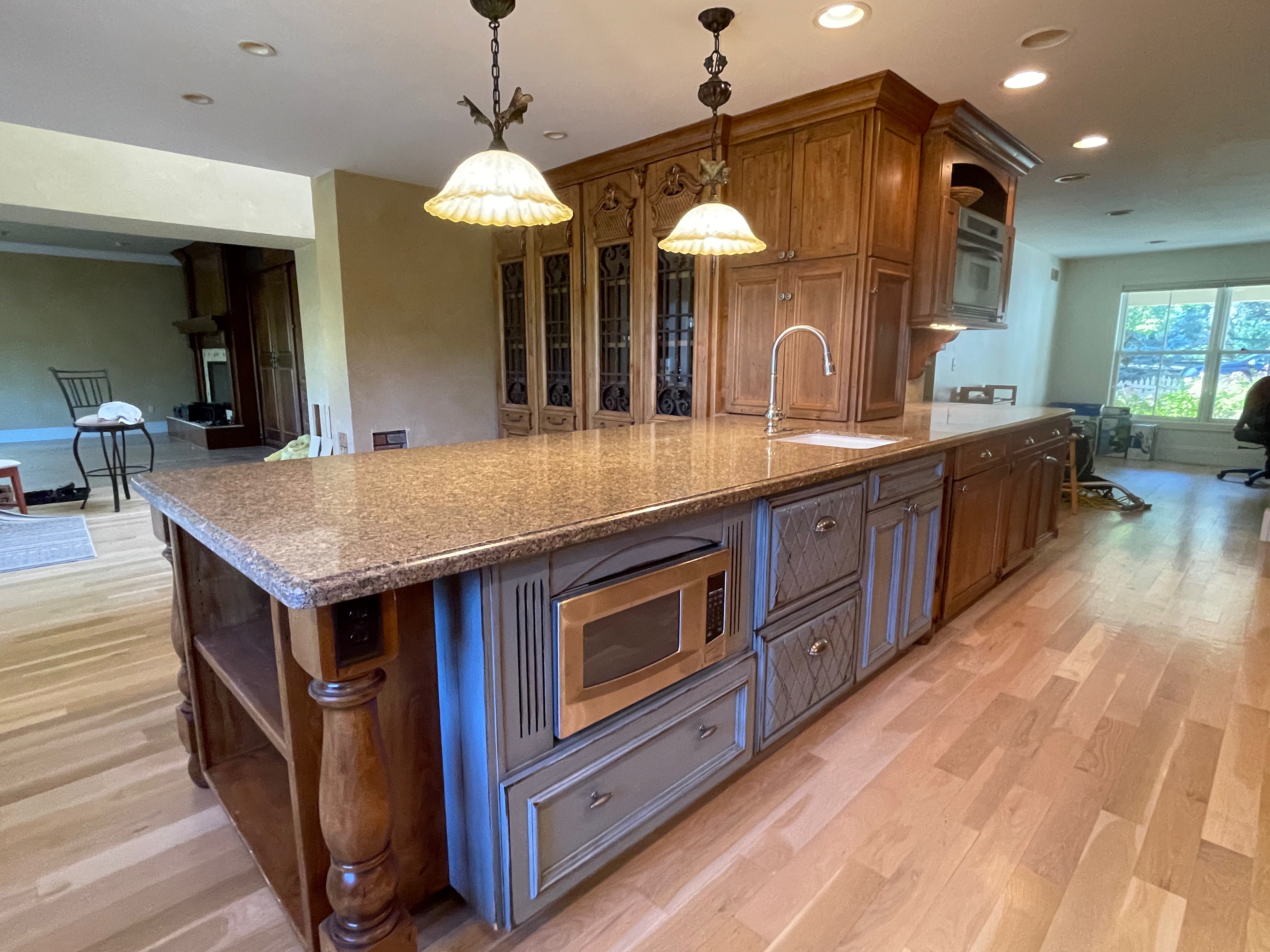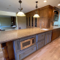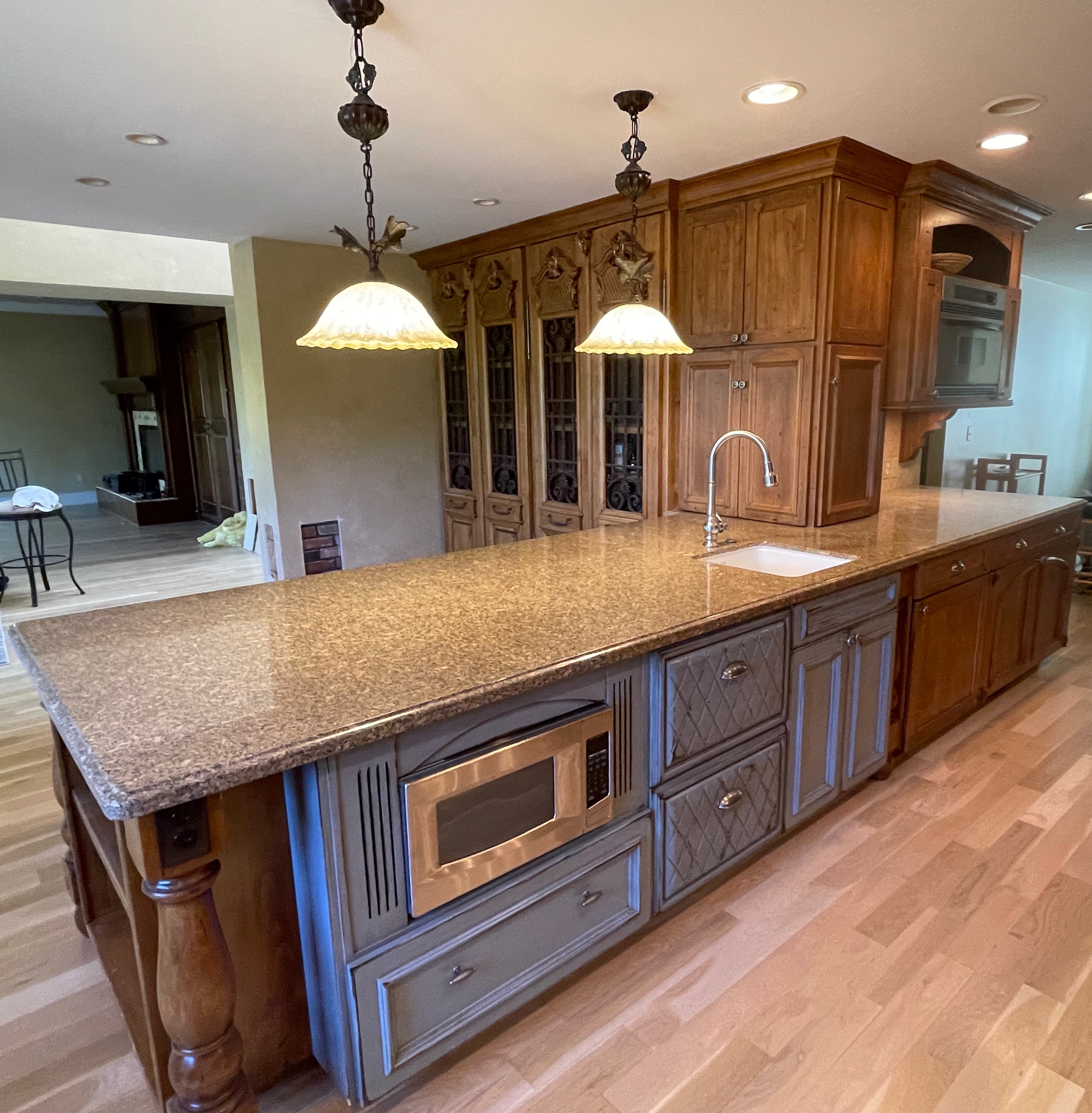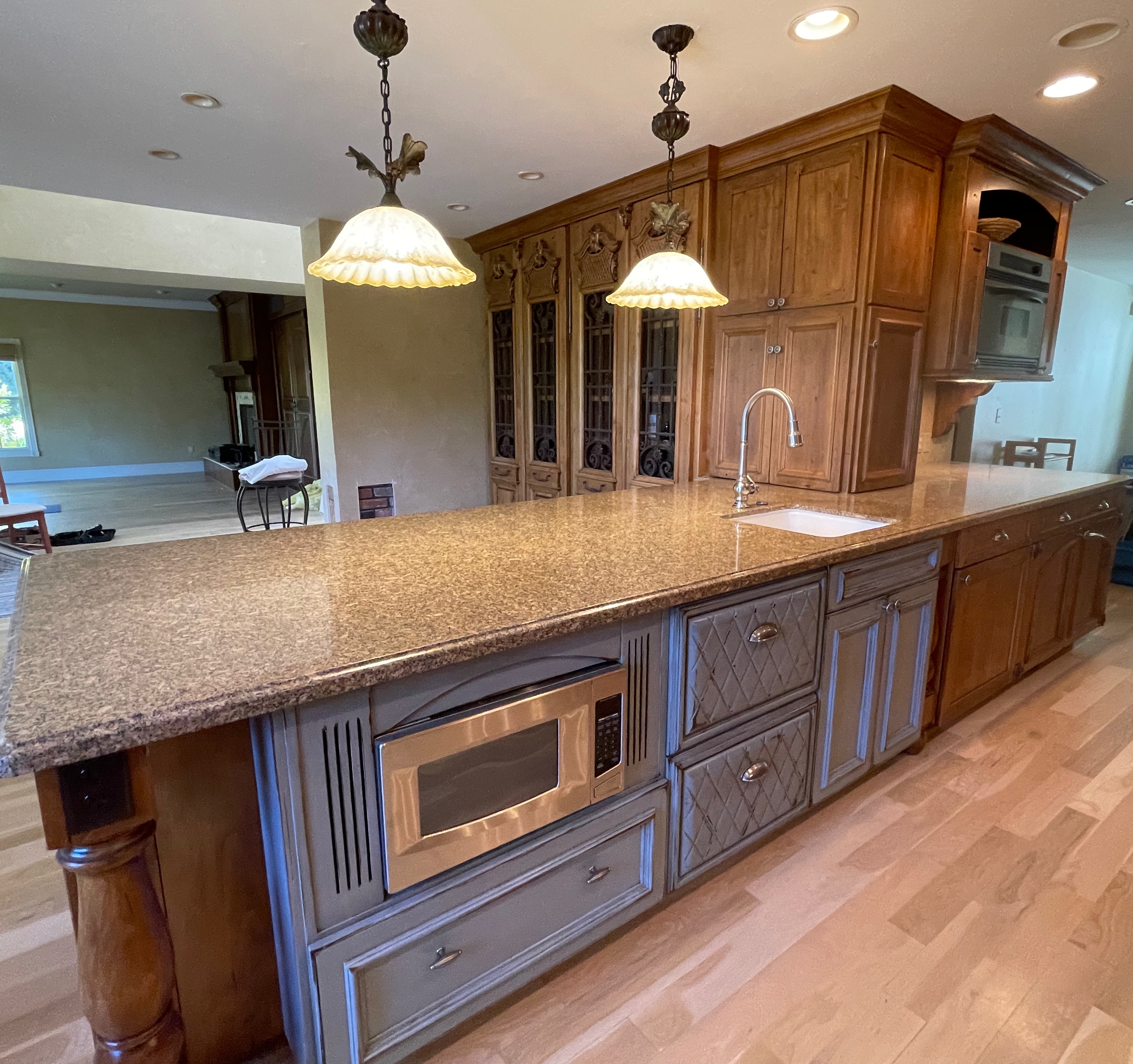 1-One microwave, one drawer base cabinet in blue in the peninsula Dim.: 33”w/34”w x 36”h x 24”d
