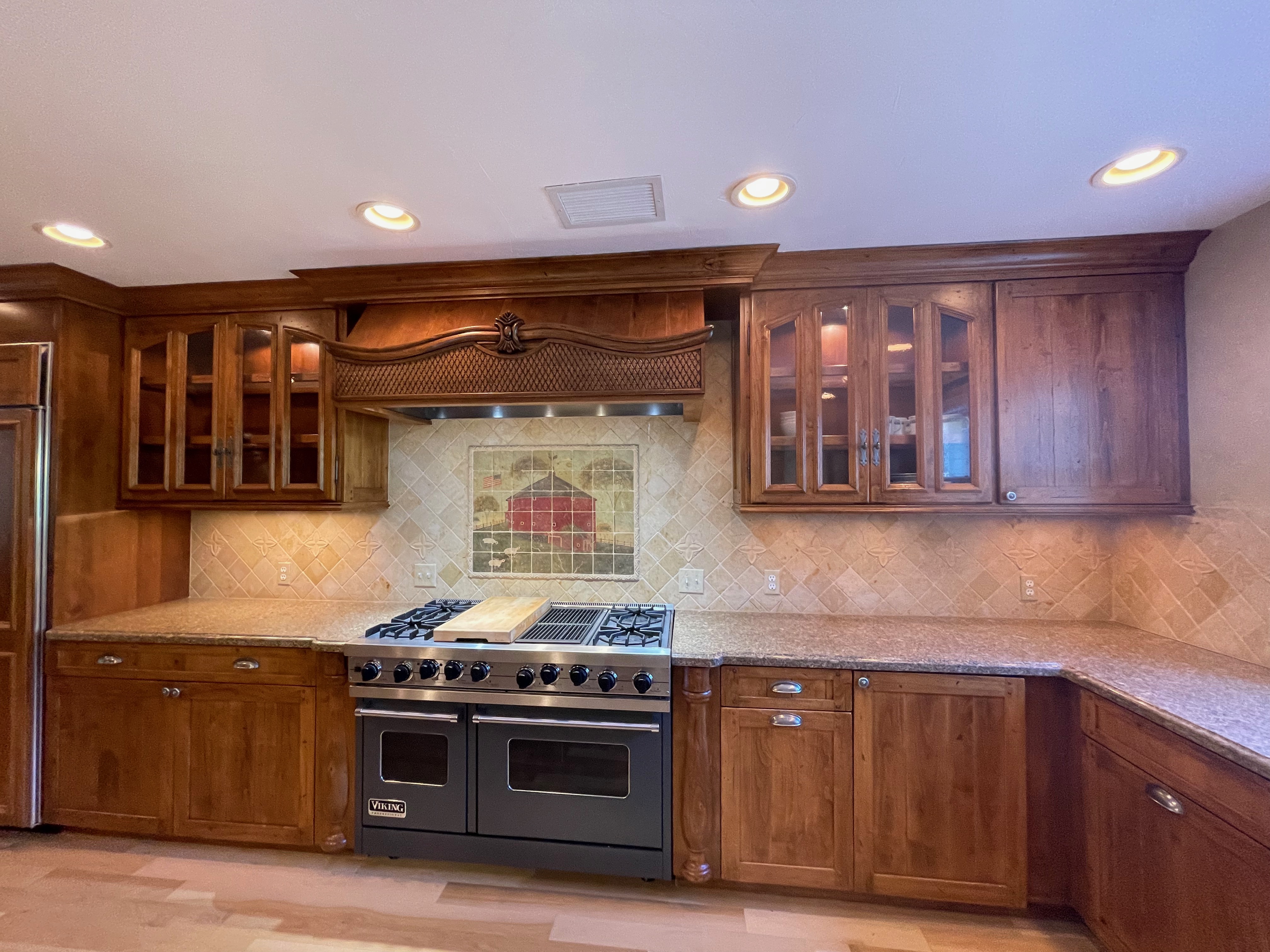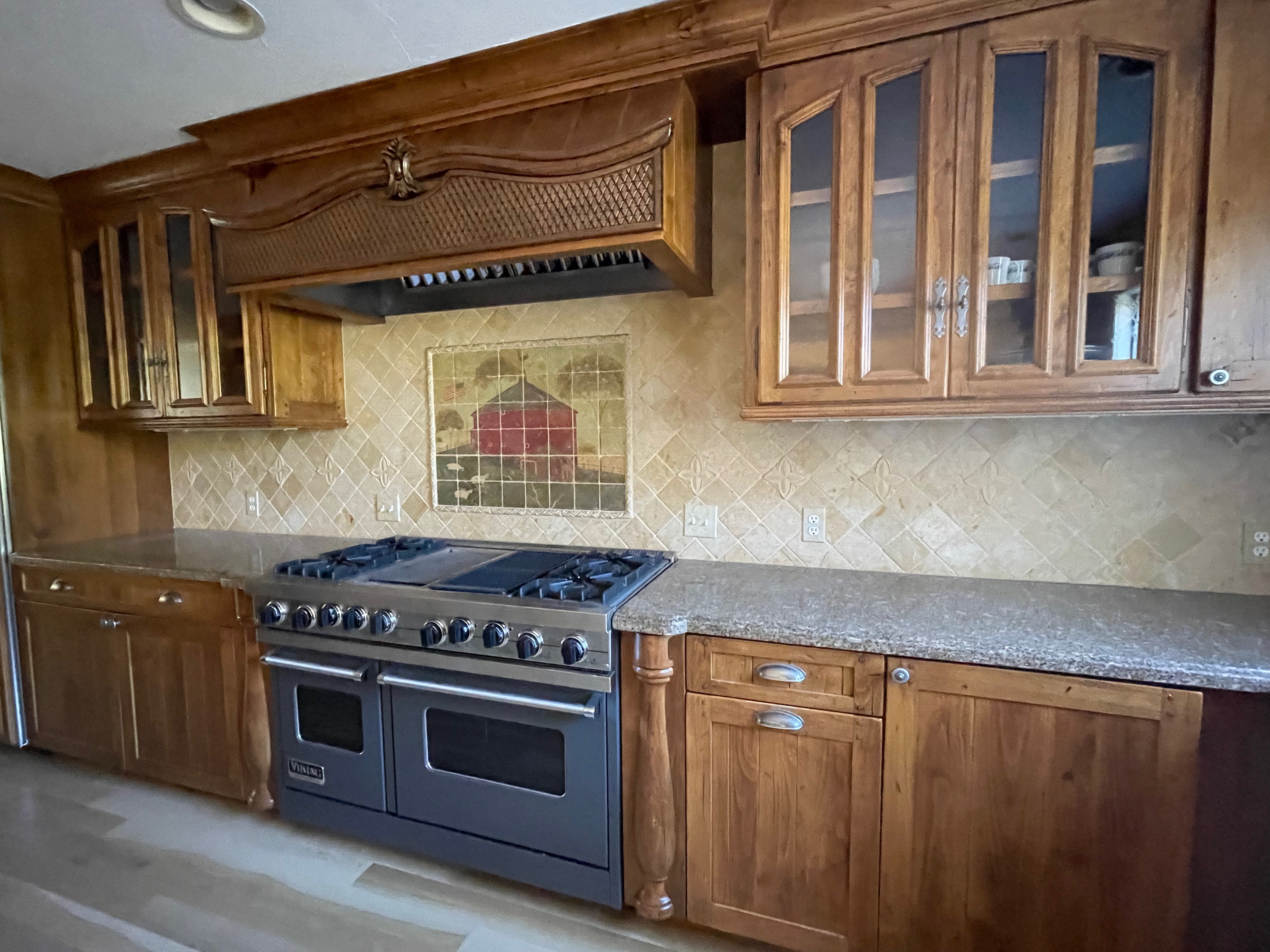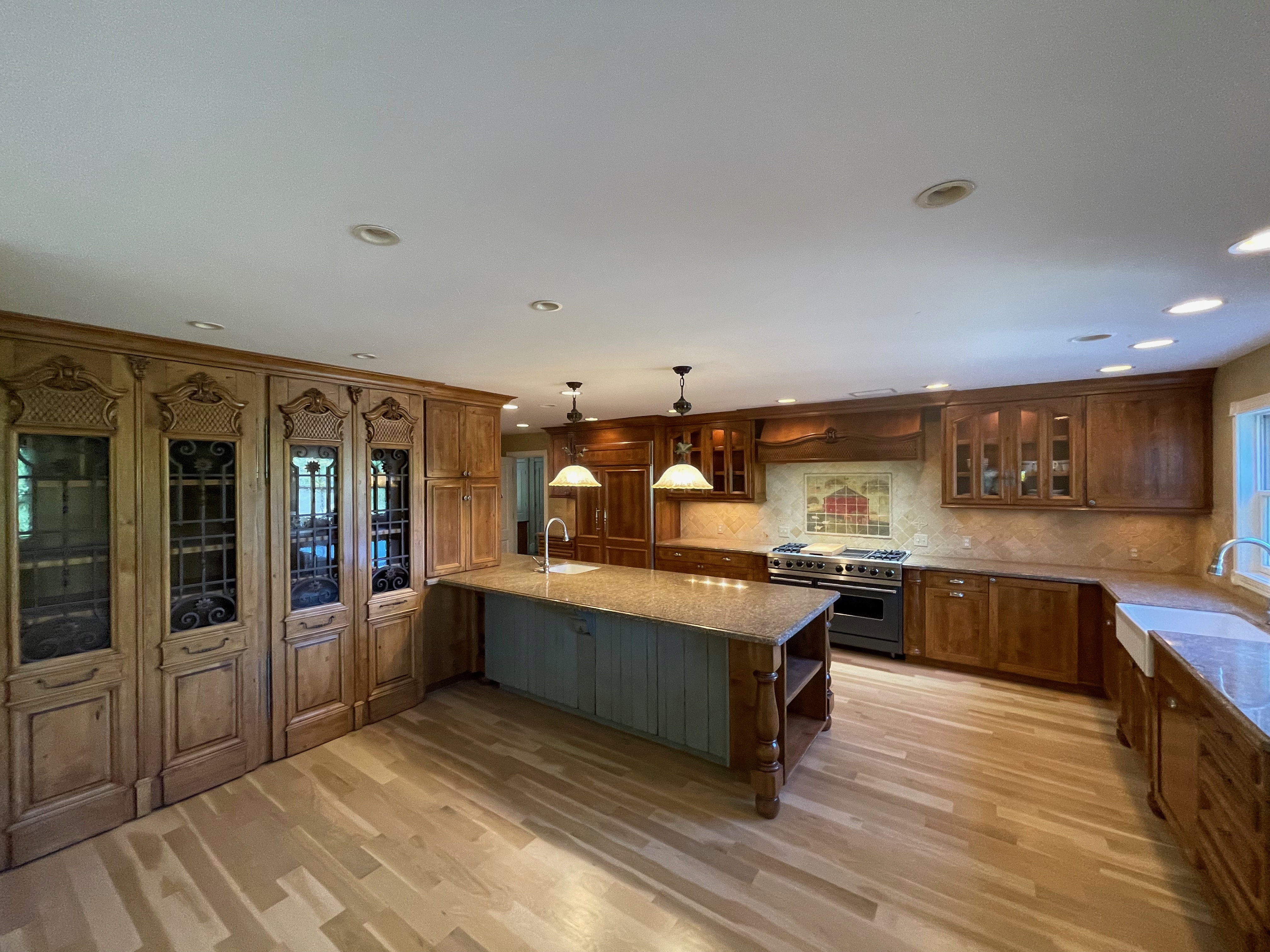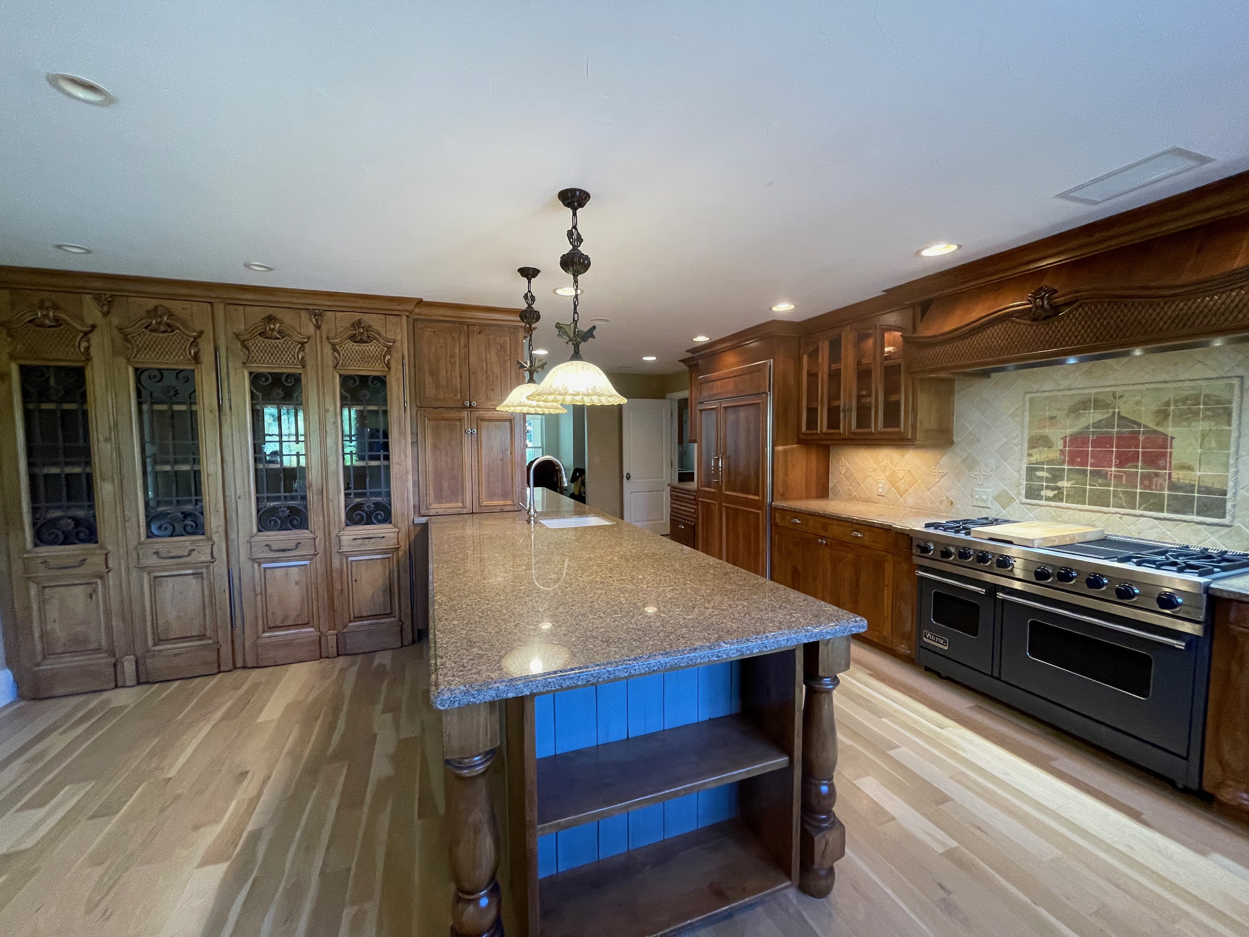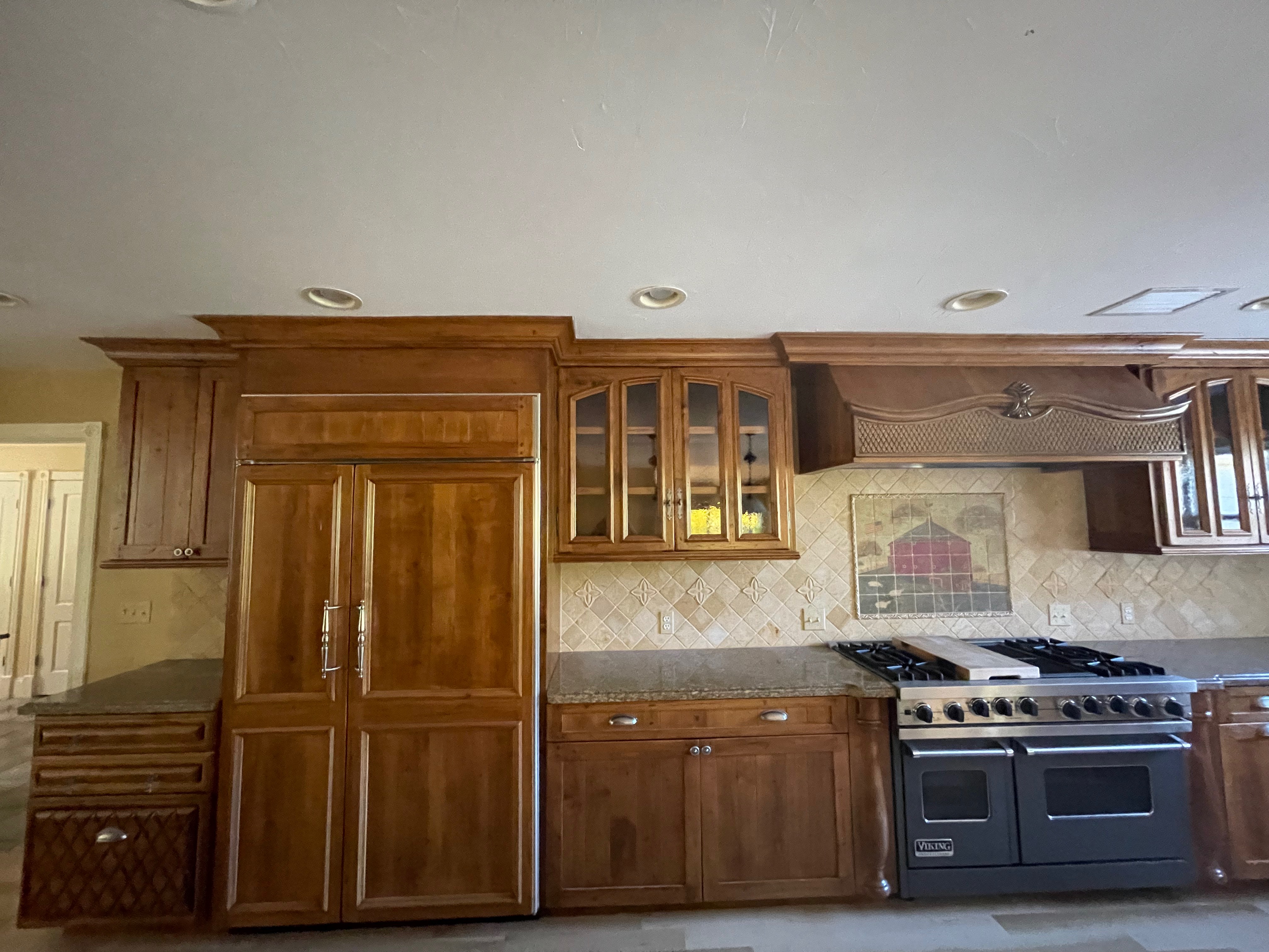 Gorgeous Alder wood kitchen cabinetry with beautiful custom craftsmanship in this farmhouse style kitchen. The cabinetry has square flat peg inserts on a traditional mortise and tenon door/drawer front style with dovetail joinery drawers. The cabinets are all finished wood inside. There are a few contrasting peninsula cabinets and finished panels in a cornflower dusty blue. The kitchen set includes a Viking range, Sub-Zero refrigerator, and other appliances. Granite counter tops, farmhouse sink, and faucet sets included. Sub-contractors can be hired for removal. The kitchen is available tbd January/February 2026. Price for the package below.