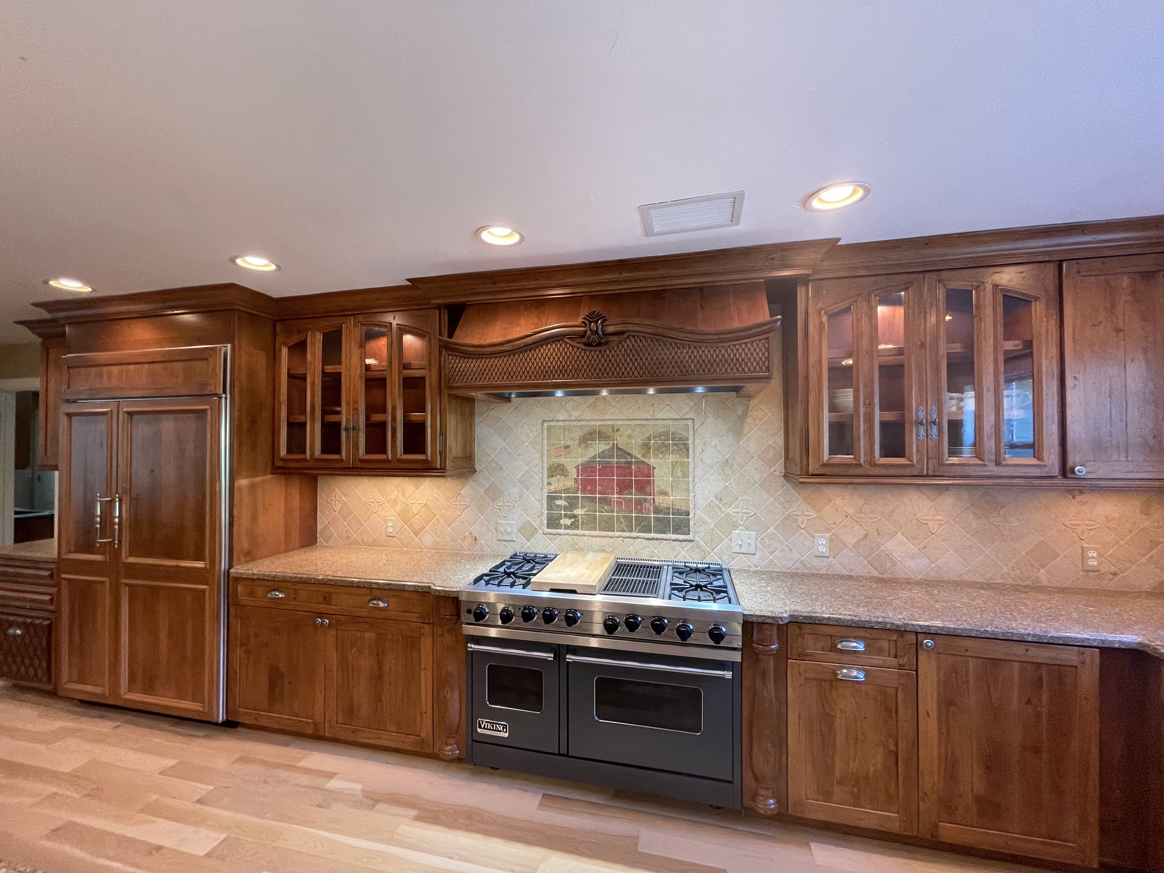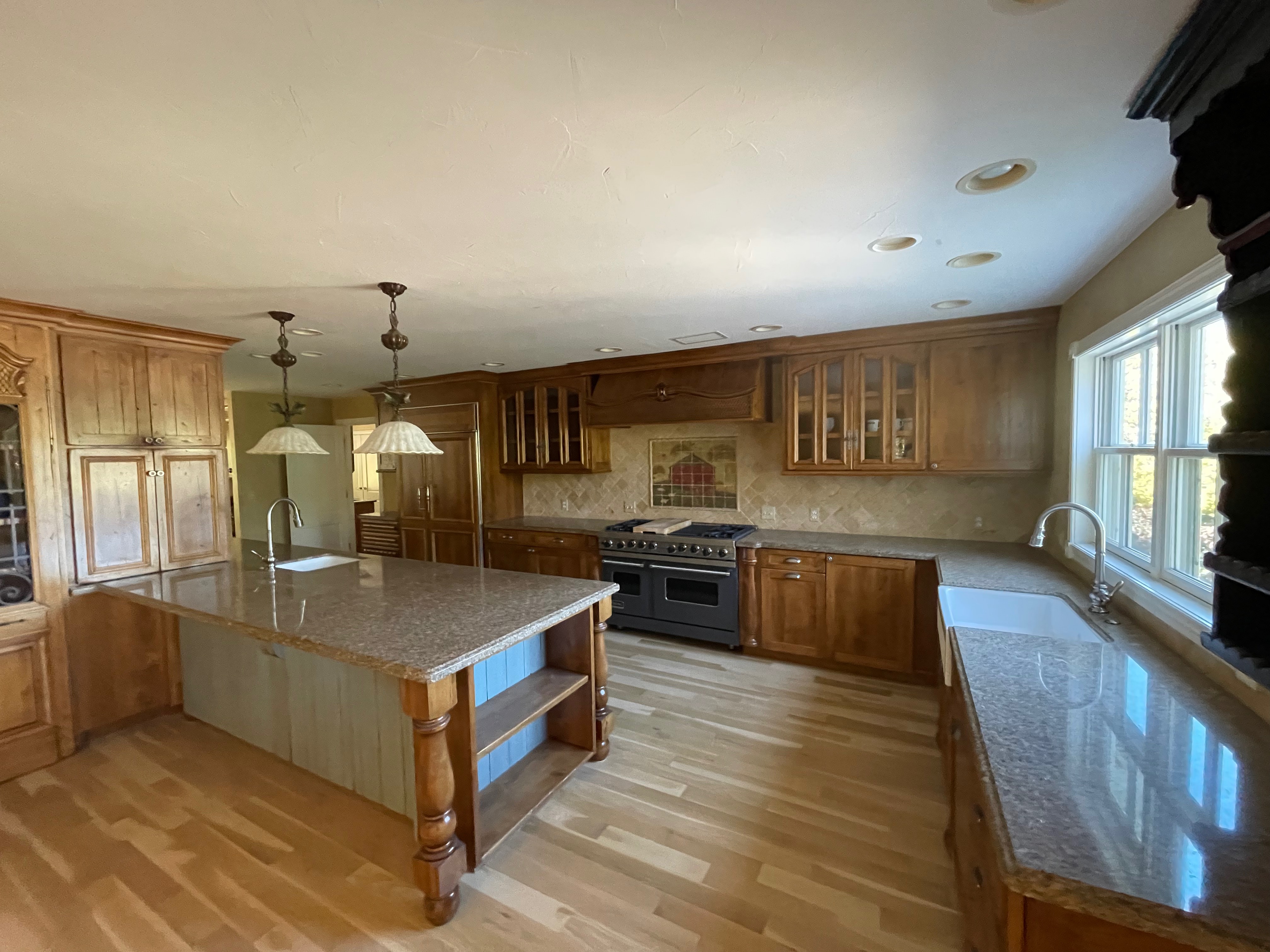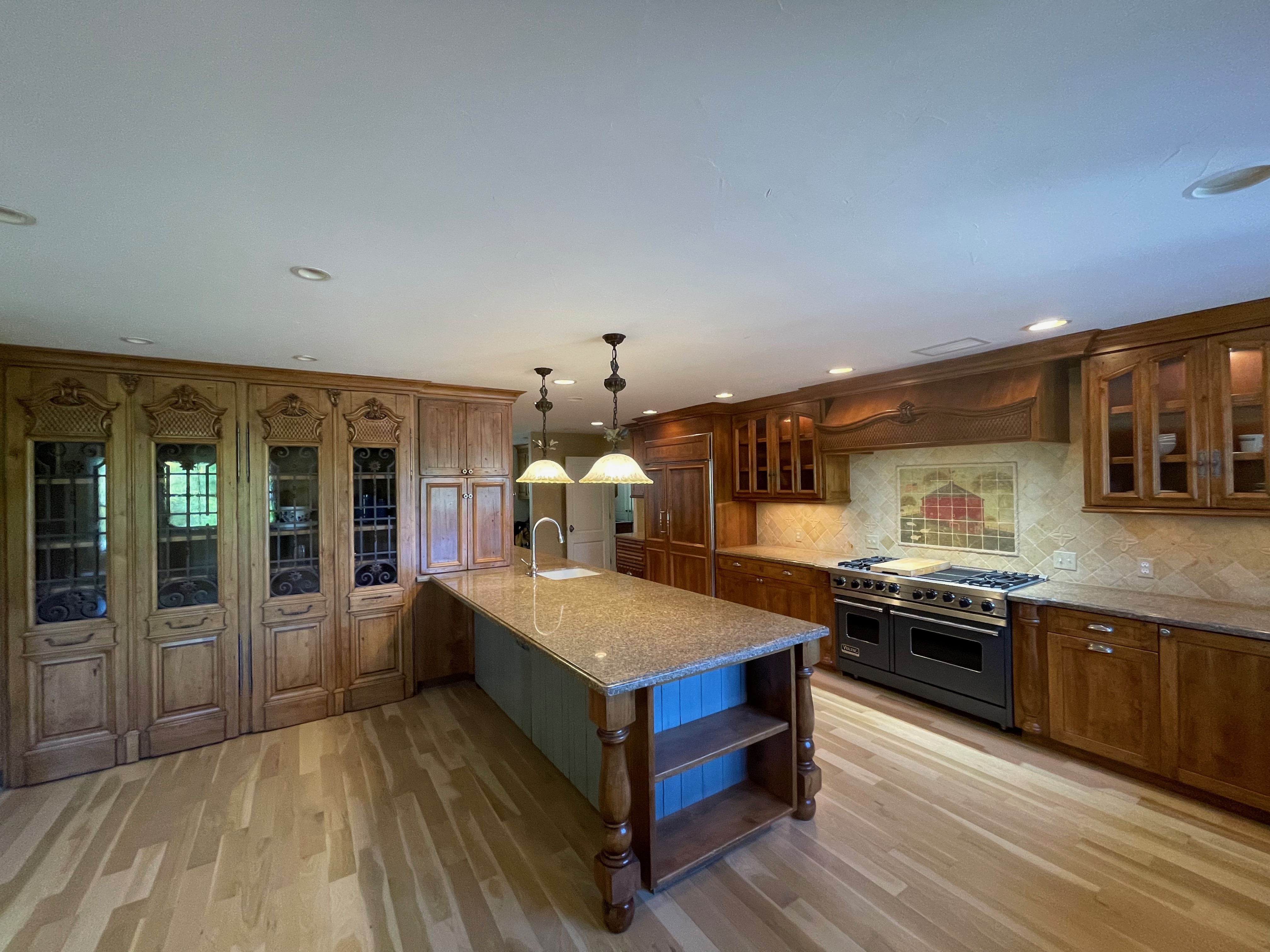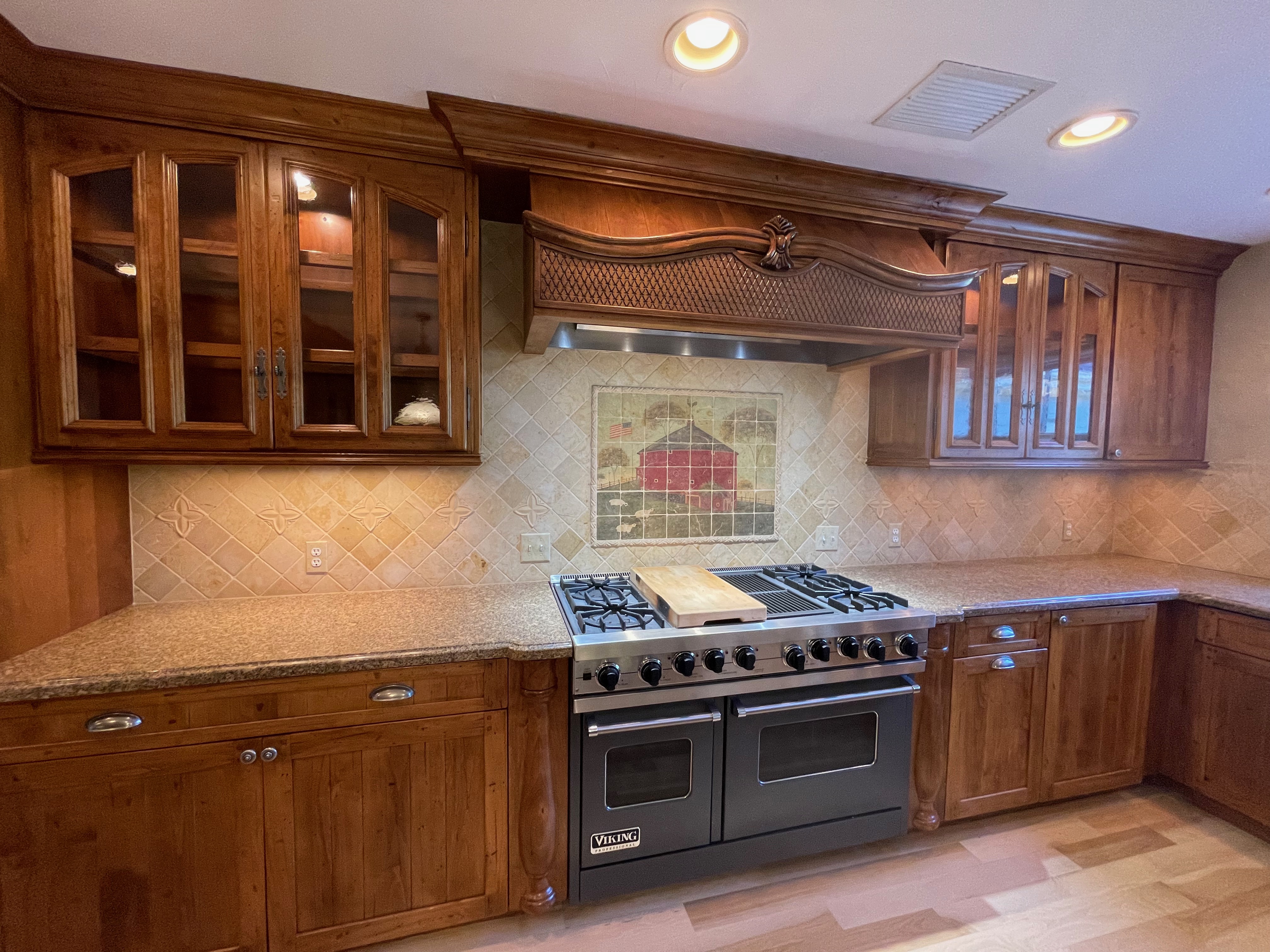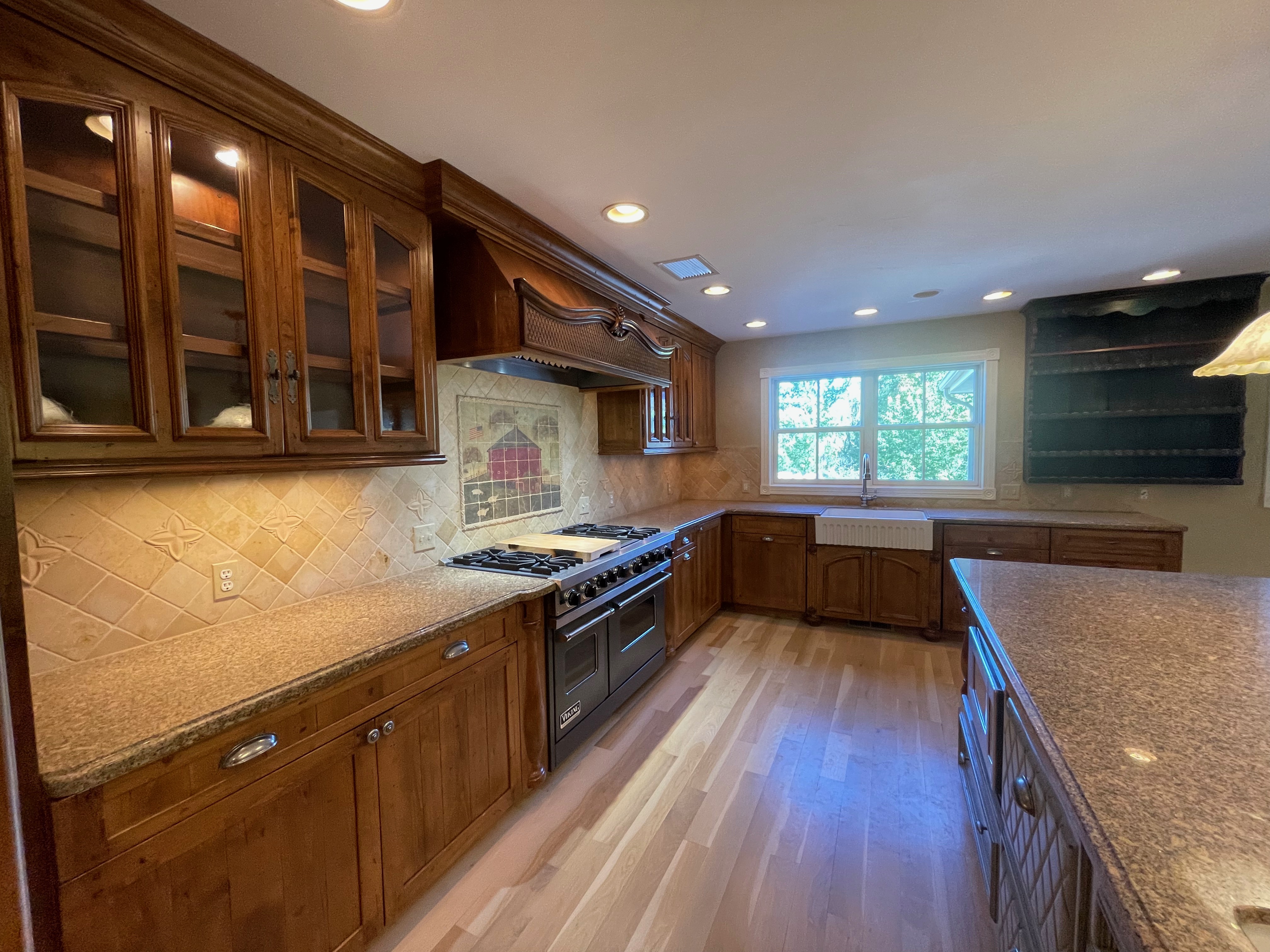 Gorgeous Alder wood kitchen cabinetry with beautiful custom craftsmanship in this farmhouse style kitchen. The cabinetry has square flat peg inserts on a traditional mortise and tenon door/drawer front style with dovetail joinery drawers. The cabinets are all finished wood inside. There are a few contrasting peninsula cabinets and finished panels in a cornflower dusty blue. The kitchen set includes a Viking range, Sub-Zero refrigerator, and other appliances. Granite counter tops, farmhouse sink, and faucet sets included. Sub-contractors can be hired for removal. The kitchen is available tbd January/February 2026. Price for the package below.