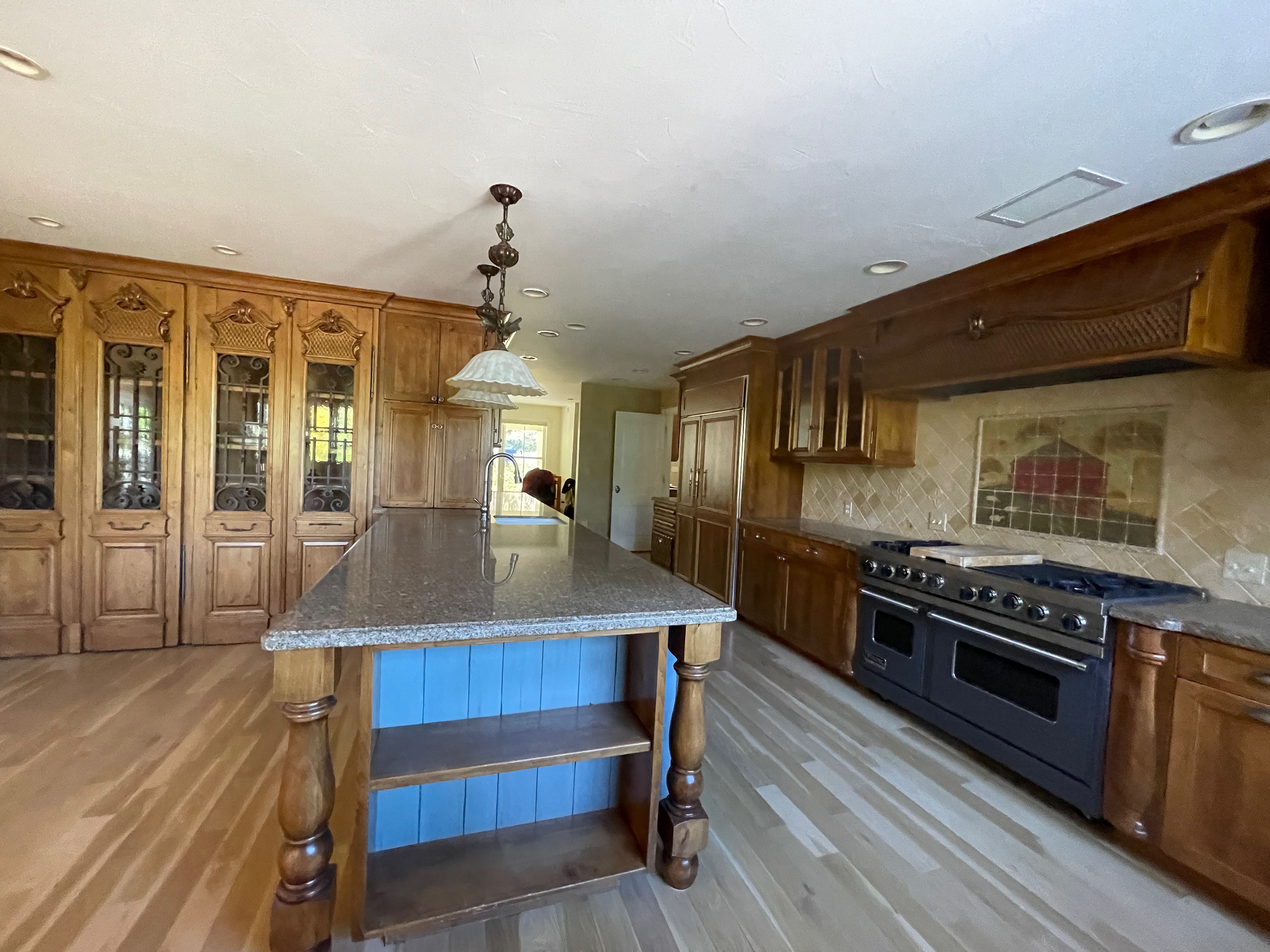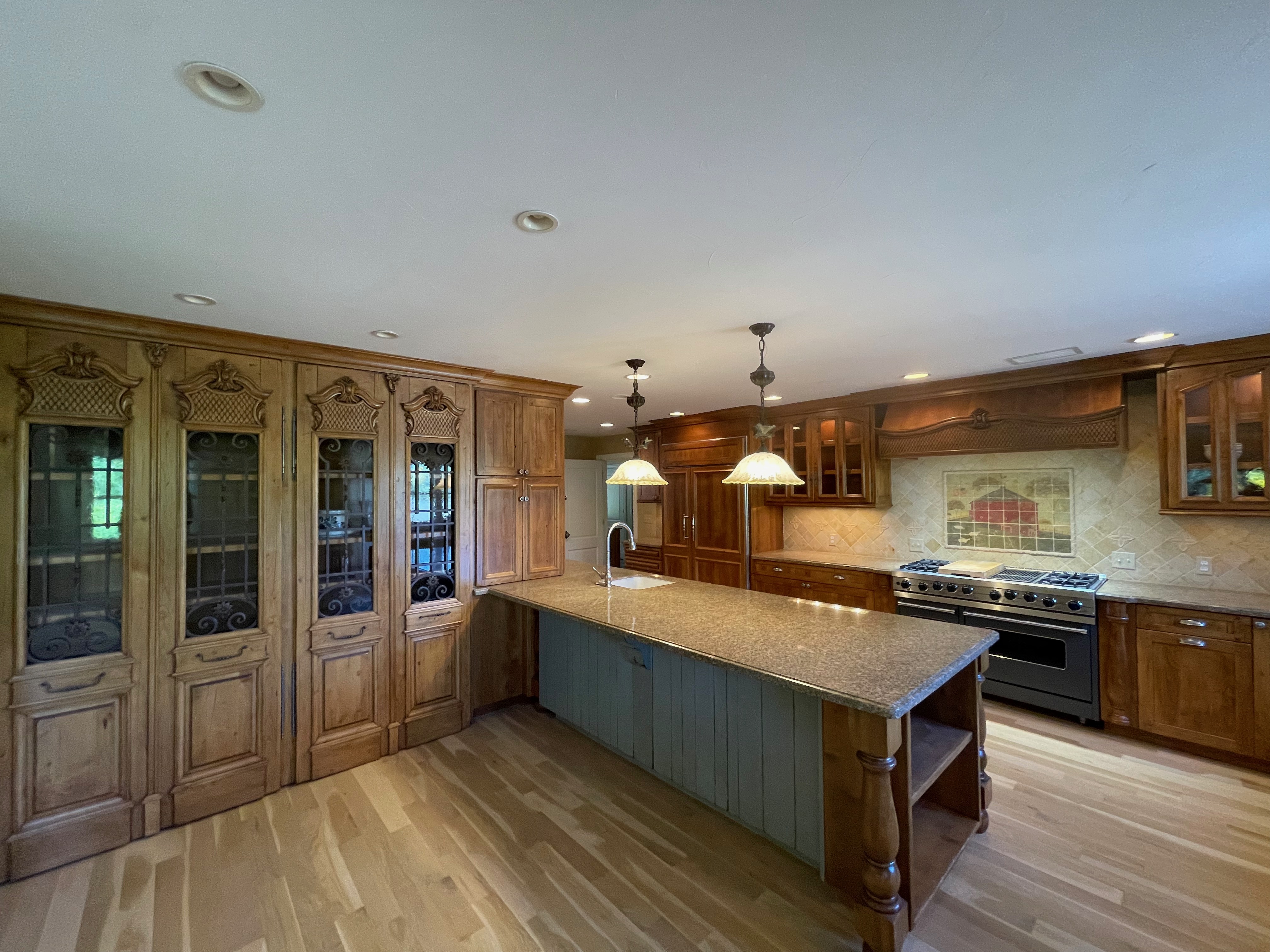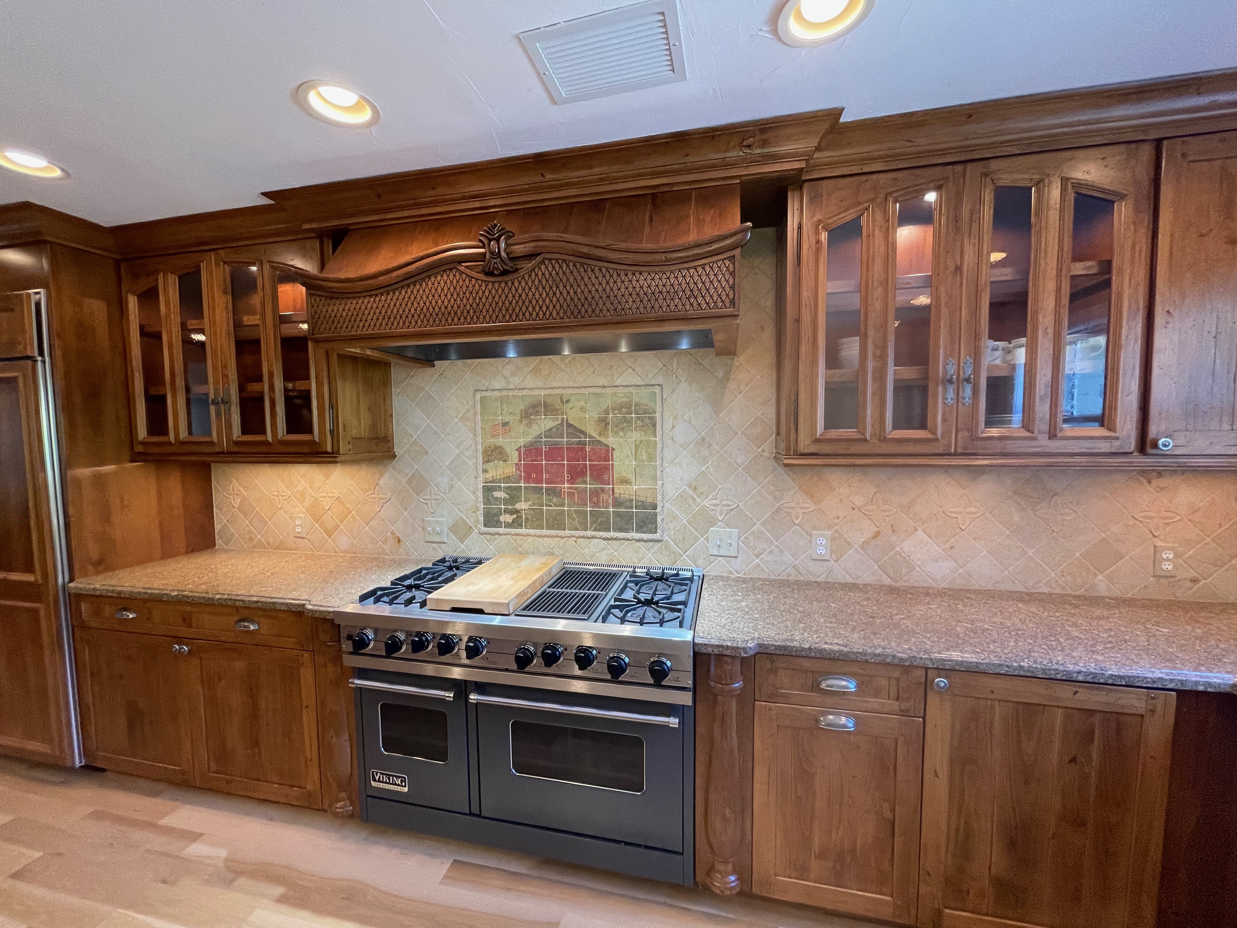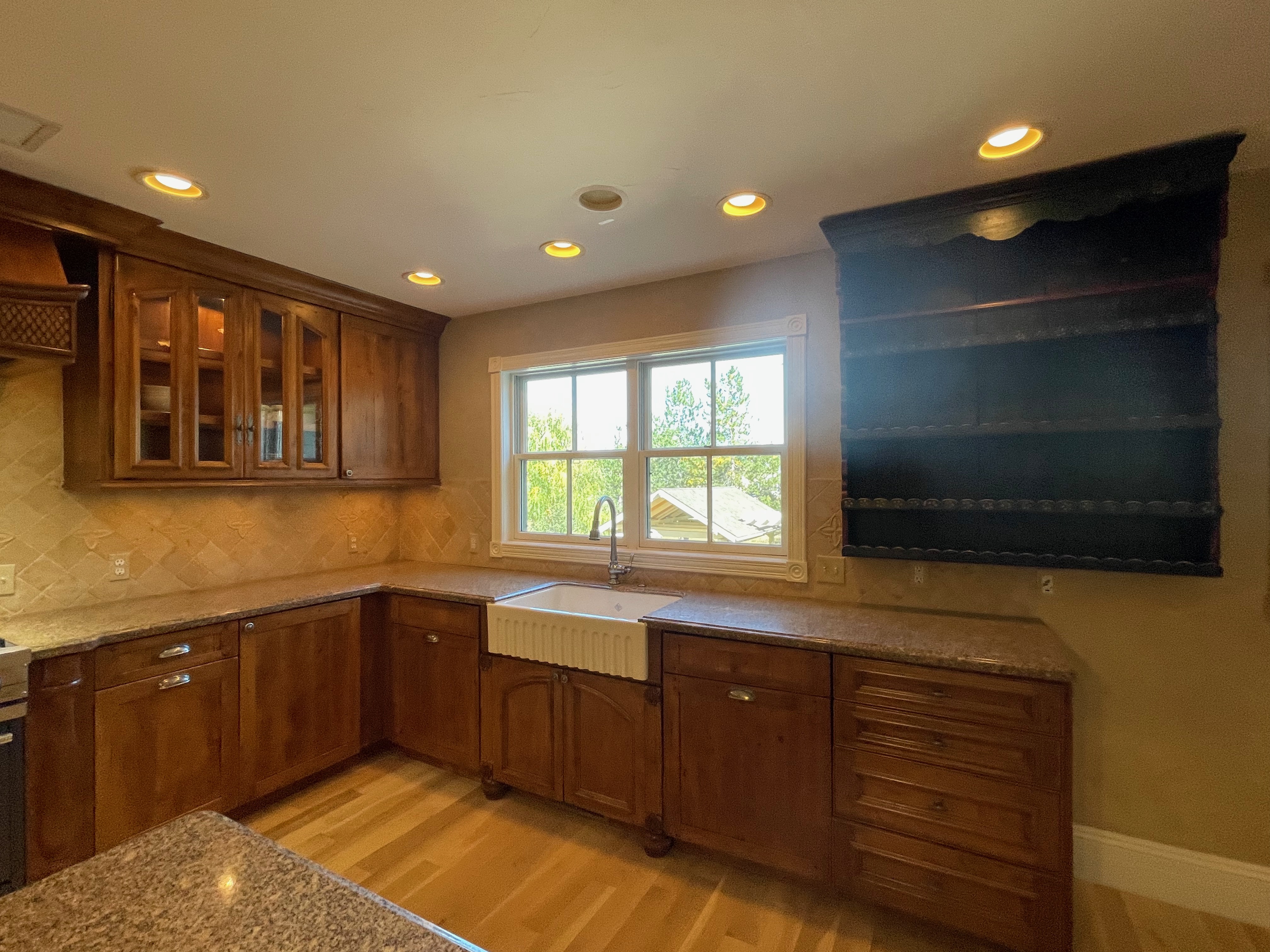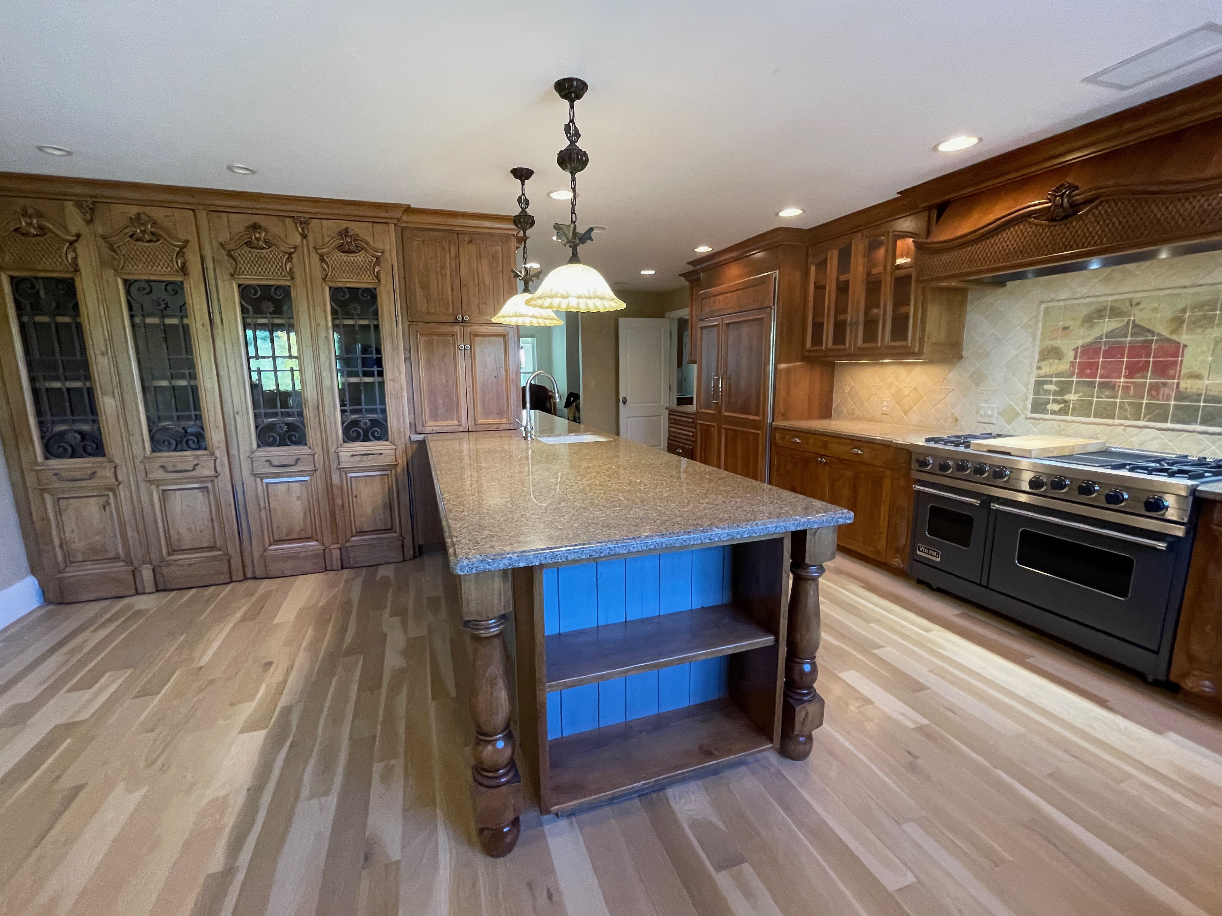 Gorgeous Alder wood kitchen cabinetry with beautiful custom craftsmanship in this farmhouse style kitchen. The cabinetry has square flat peg inserts on a traditional mortise and tenon door/drawer front style with dovetail joinery drawers. The cabinets are all finished wood inside. There are a few contrasting peninsula cabinets and finished panels in a cornflower dusty blue. The kitchen set includes a Viking range, Sub-Zero refrigerator, and other appliances. Granite counter tops, farmhouse sink, and faucet sets included. Sub-contractors can be hired for removal. The kitchen is available tbd January/February 2026. Price for the package below.