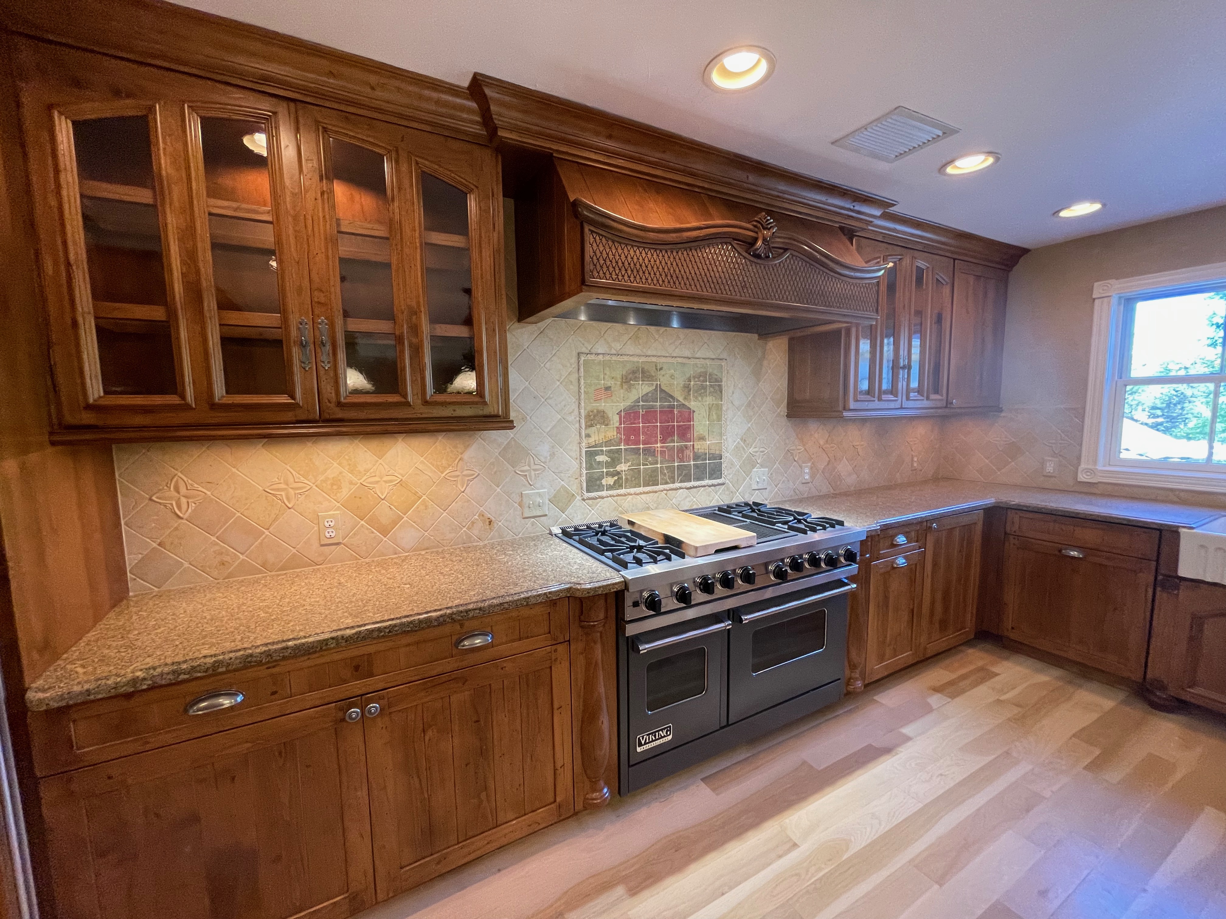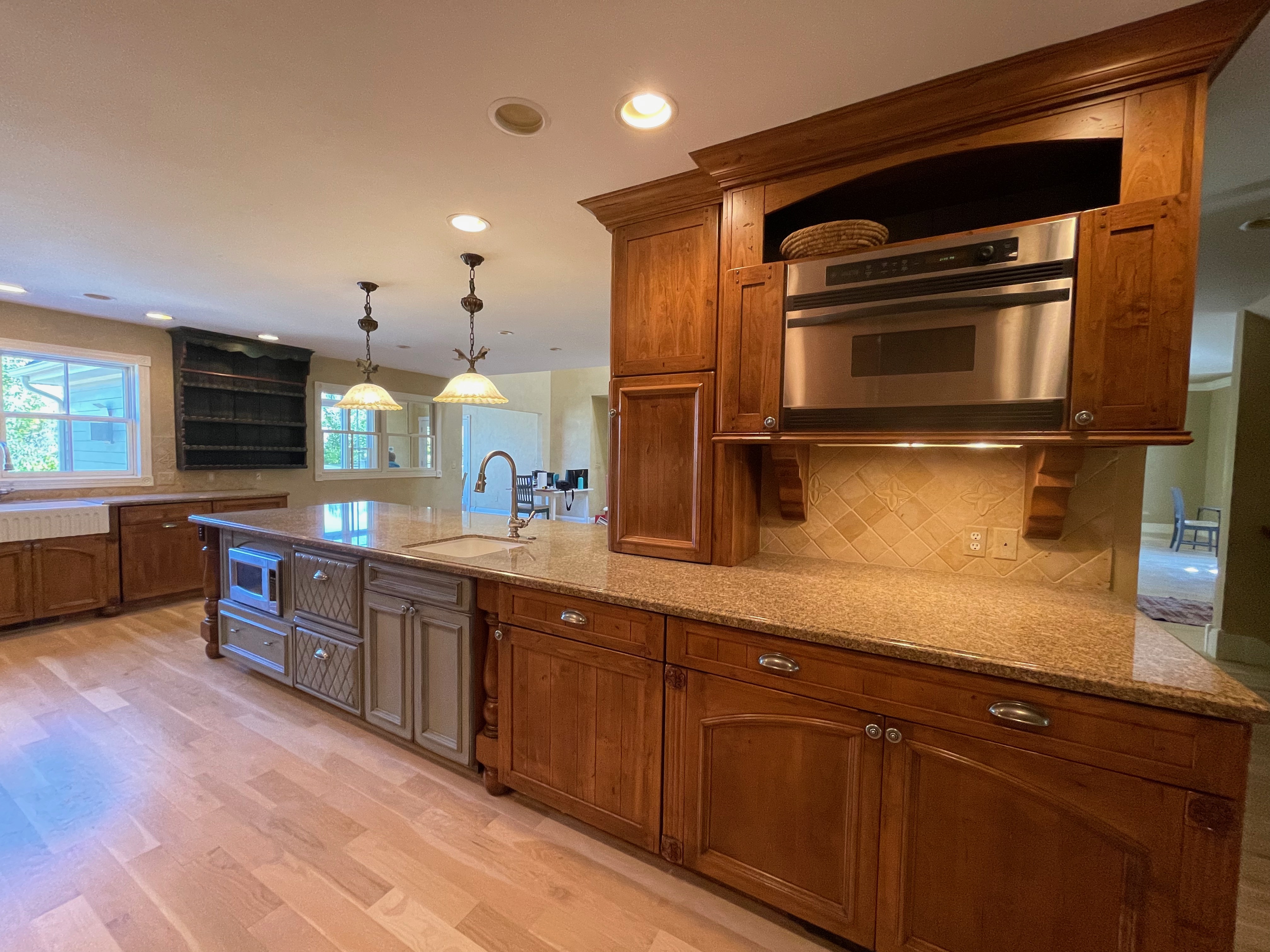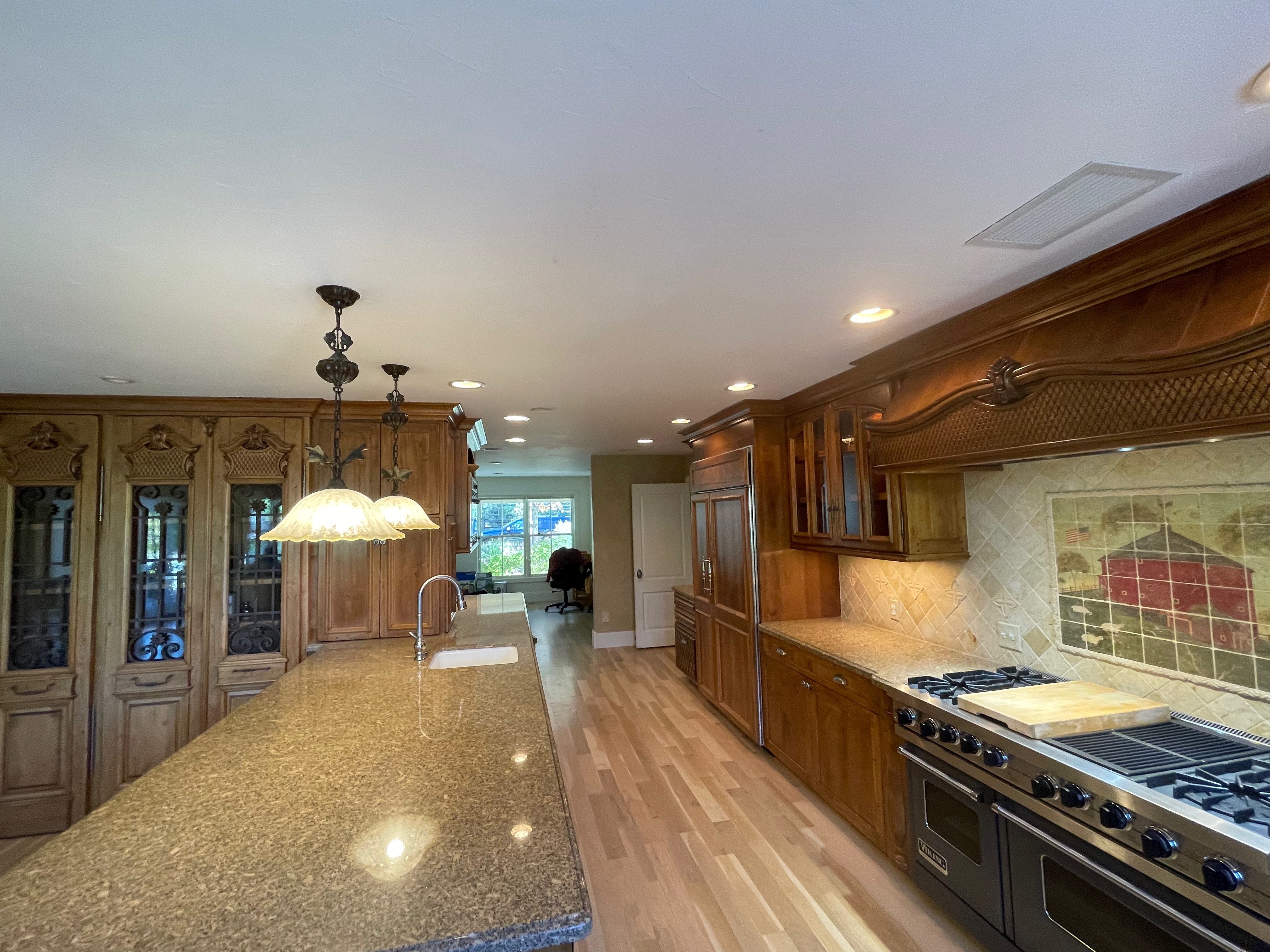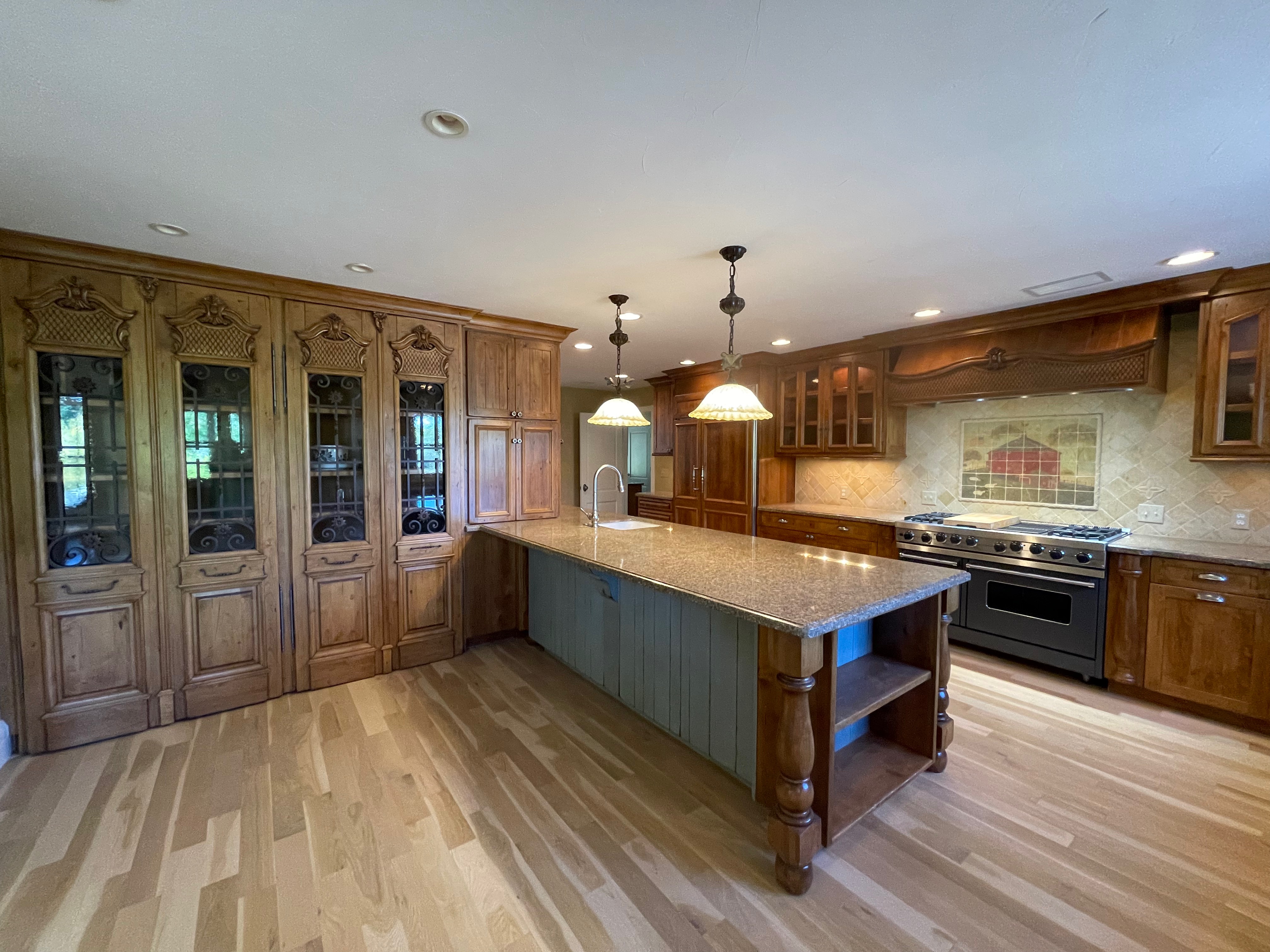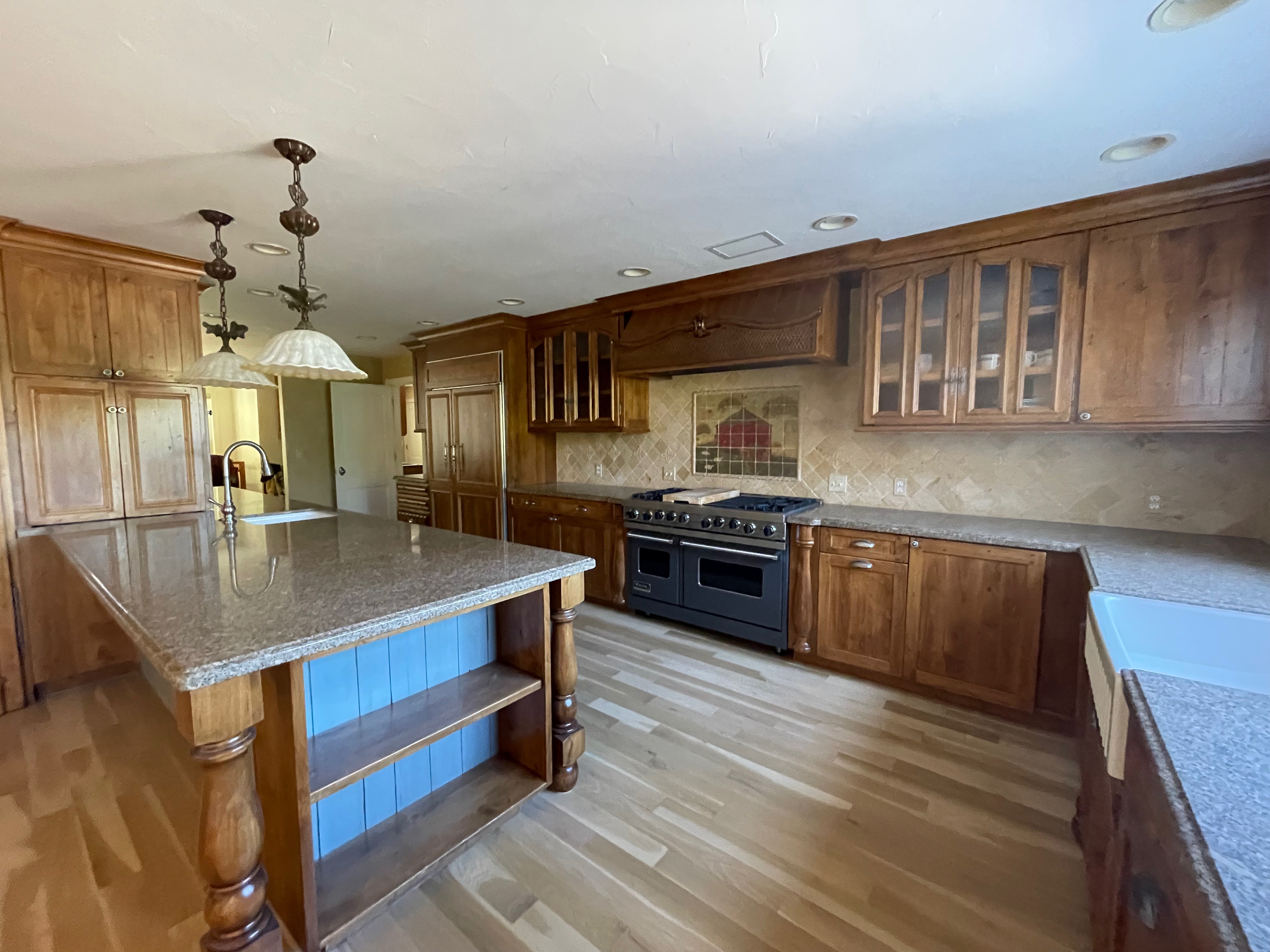 Gorgeous Alder wood kitchen cabinetry with beautiful custom craftsmanship in this farmhouse style kitchen. The cabinetry has square flat peg inserts on a traditional mortise and tenon door/drawer front style with dovetail joinery drawers. The cabinets are all finished wood inside. There are a few contrasting peninsula cabinets and finished panels in a cornflower dusty blue. The kitchen set includes a Viking range, Sub-Zero refrigerator, and other appliances. Granite counter tops, farmhouse sink, and faucet sets included. Sub-contractors can be hired for removal. The kitchen is available tbd January/February 2026. Price for the package below.