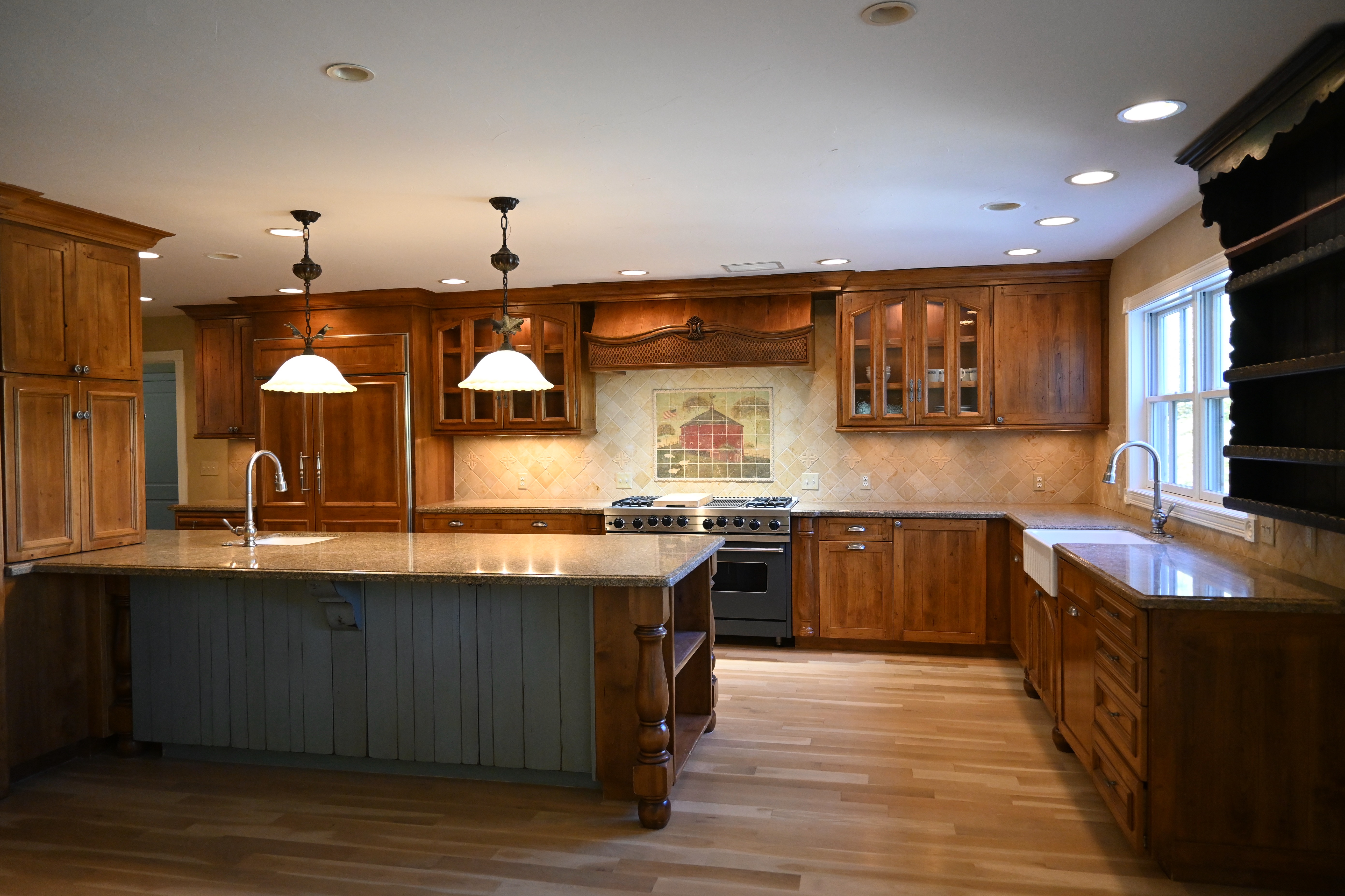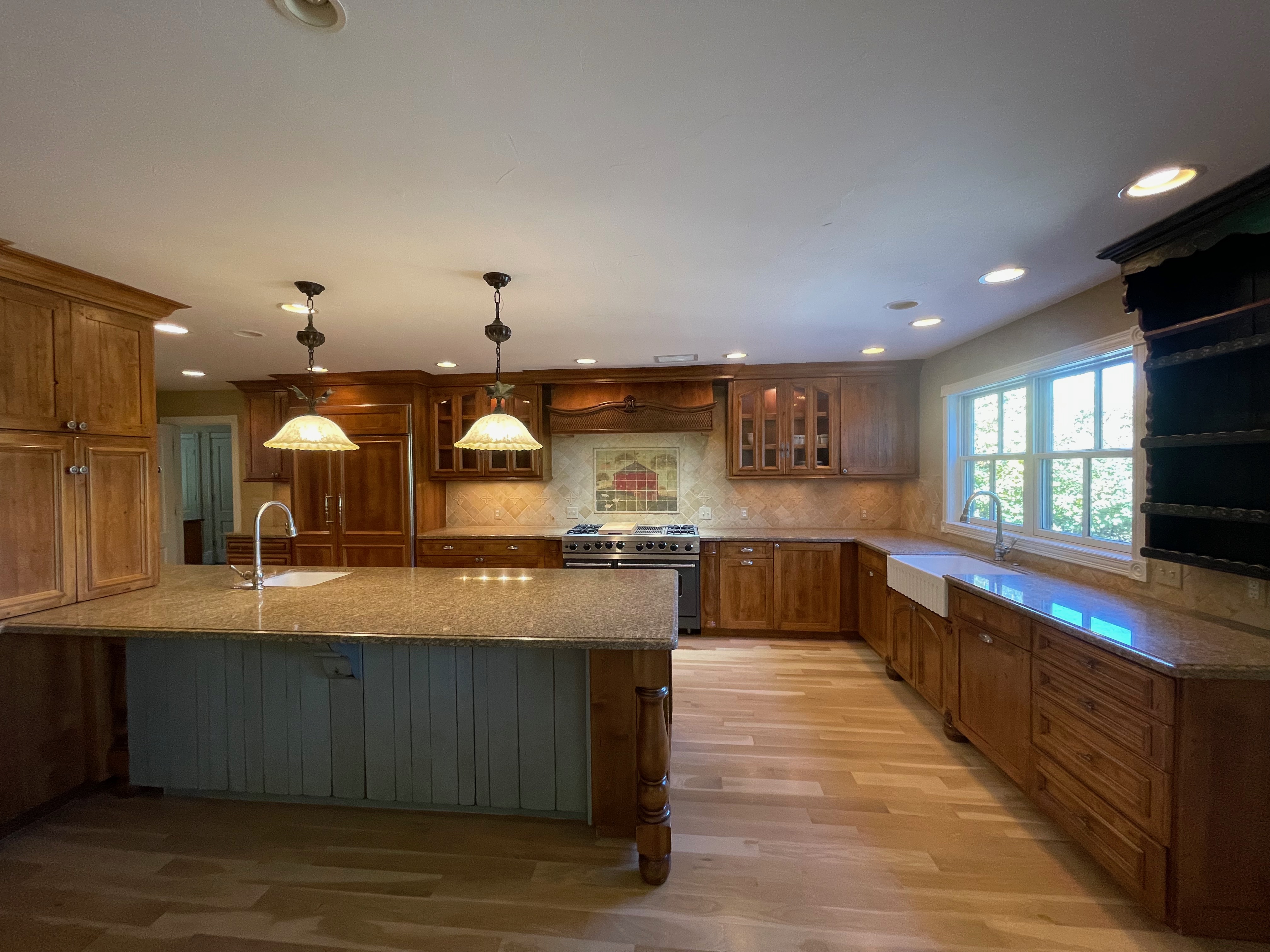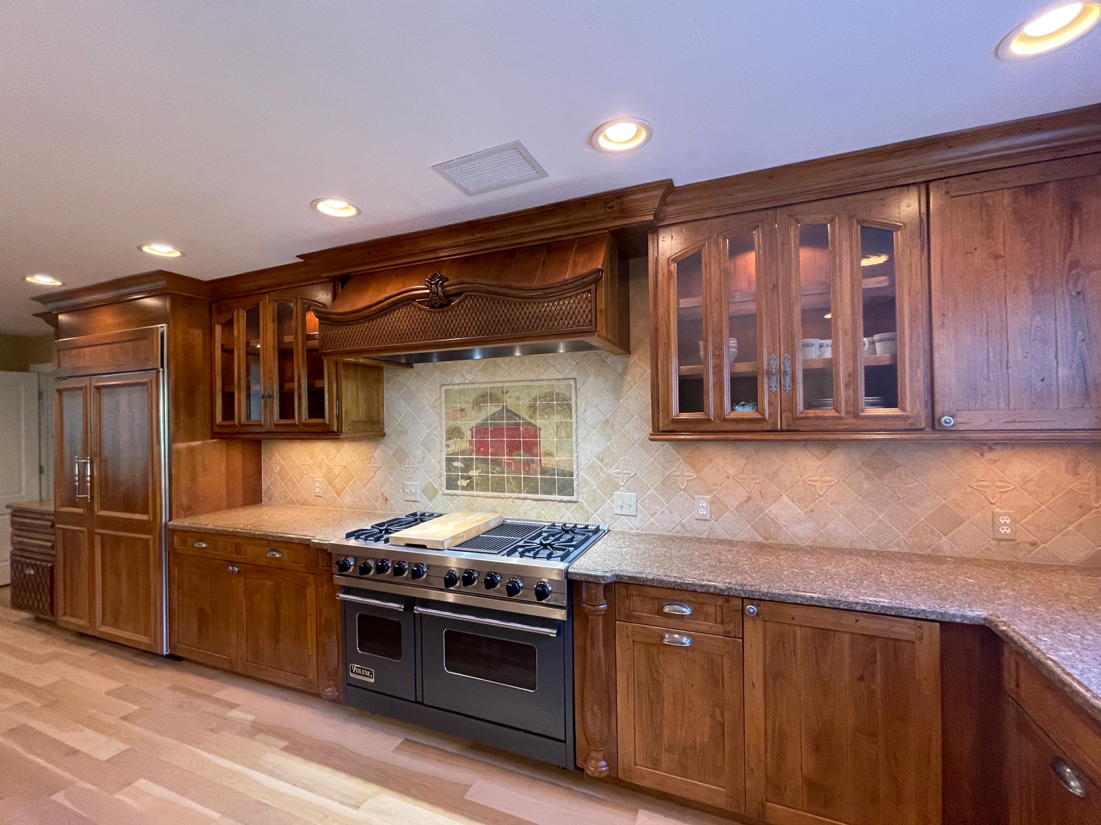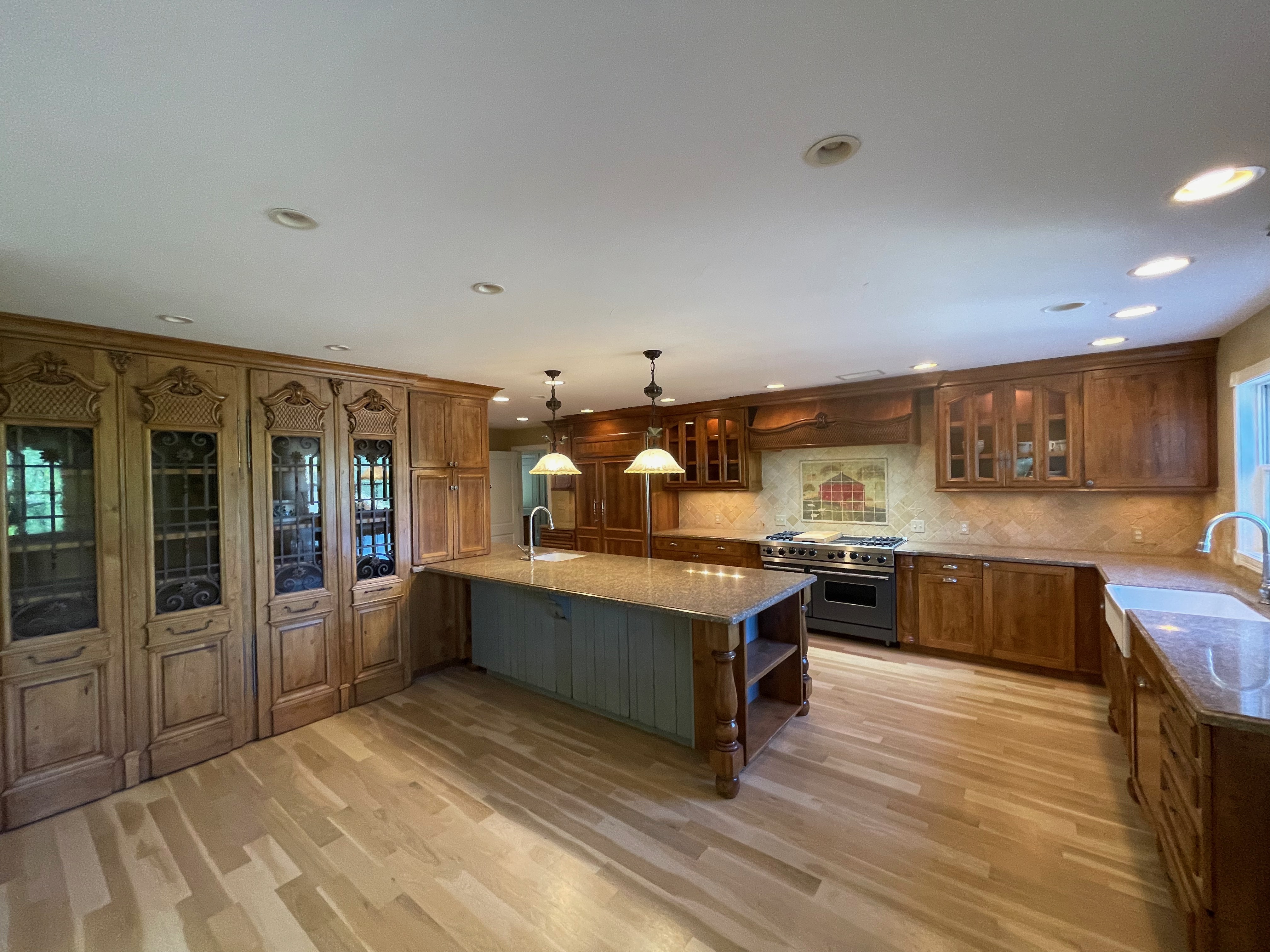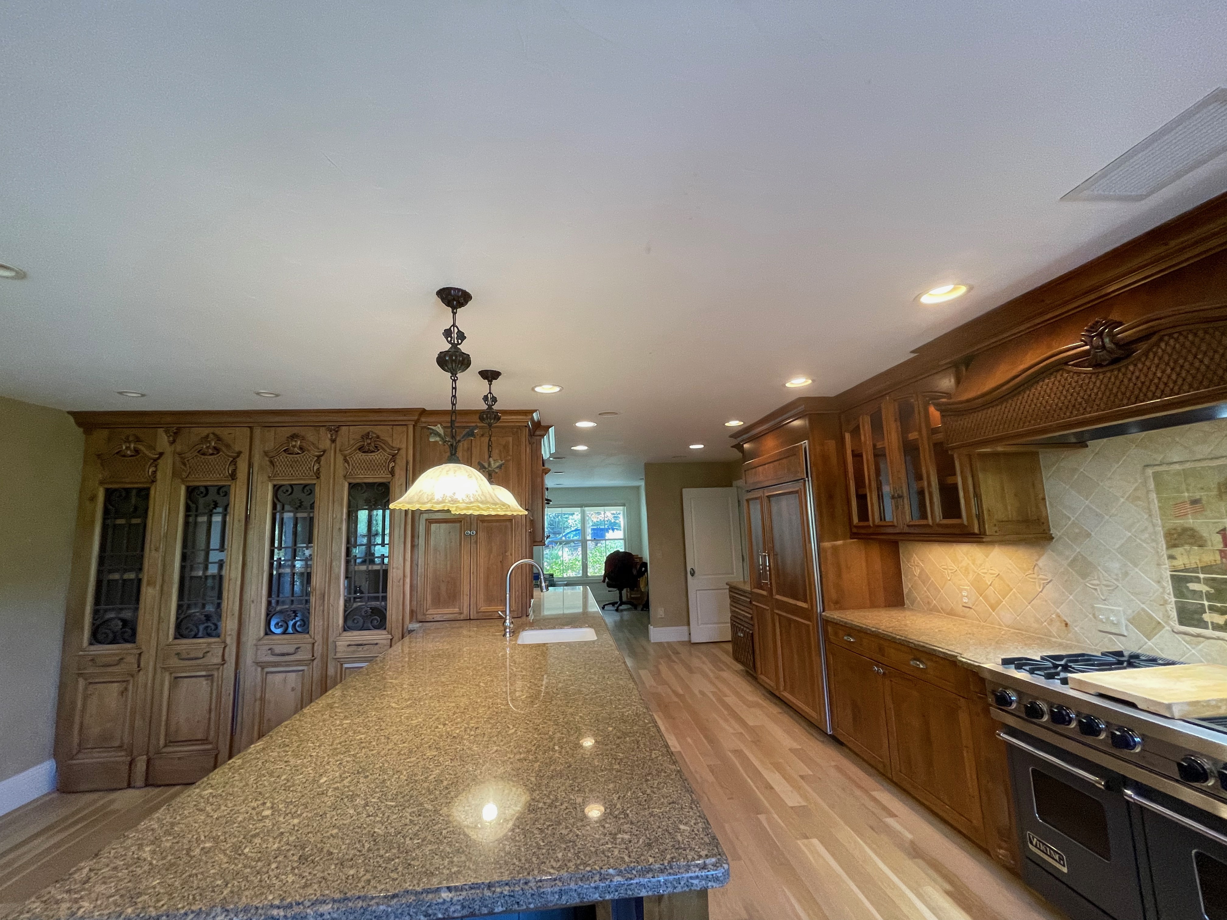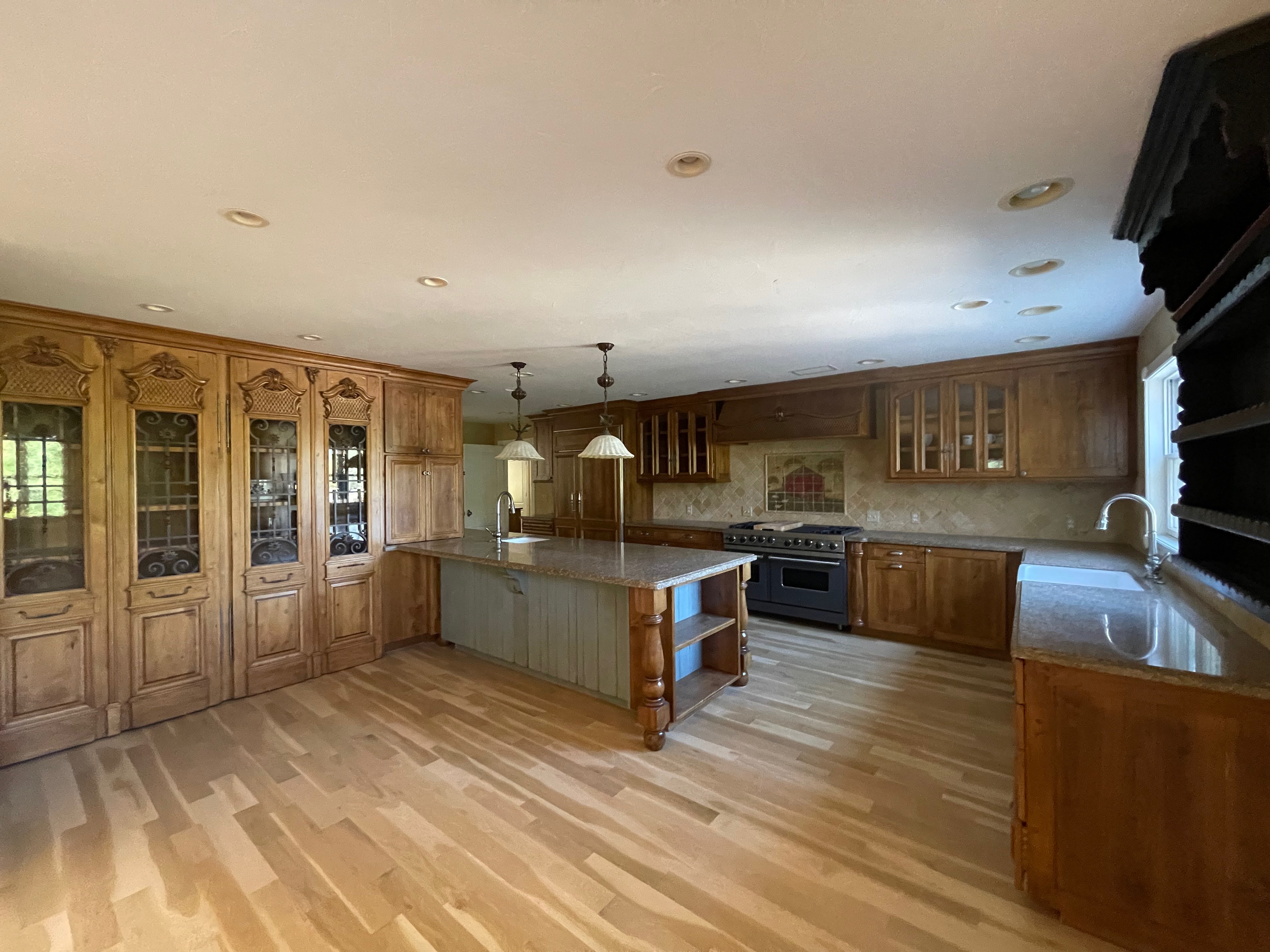 Gorgeous Alder wood kitchen cabinetry with beautiful custom craftsmanship in this farmhouse style kitchen. The cabinetry has square flat peg inserts on a traditional mortise and tenon door/drawer front style with dovetail joinery drawers. The cabinets are all finished wood inside. There are a few contrasting peninsula cabinets and finished panels in a cornflower dusty blue. The kitchen set includes a Viking range, Sub-Zero refrigerator, and other appliances. Granite counter tops, farmhouse sink, and faucet sets included. Sub-contractors can be hired for removal. The kitchen is available tbd January/February 2026. Price for the package below.