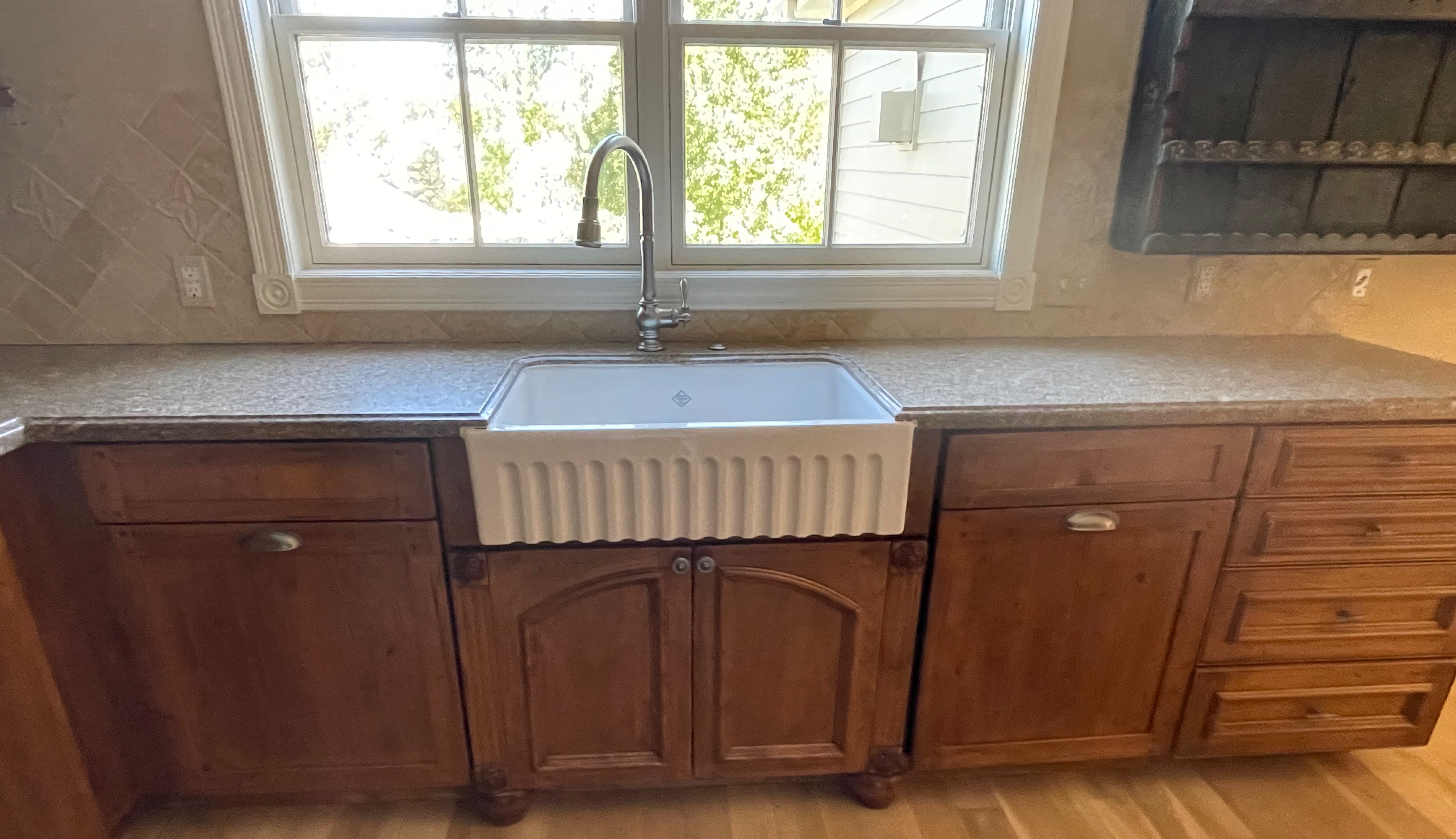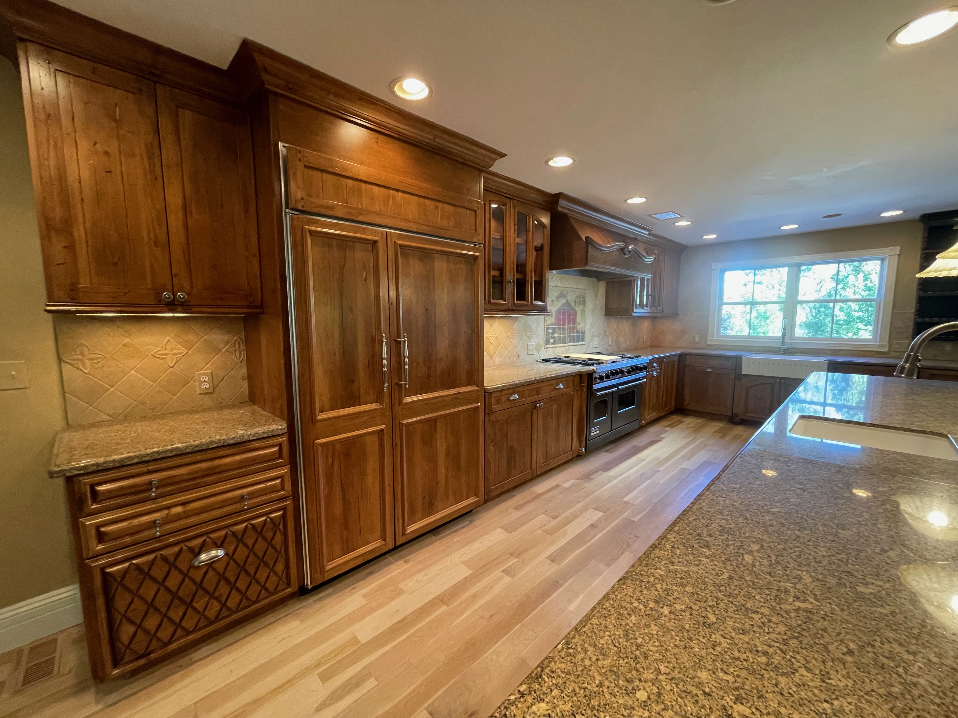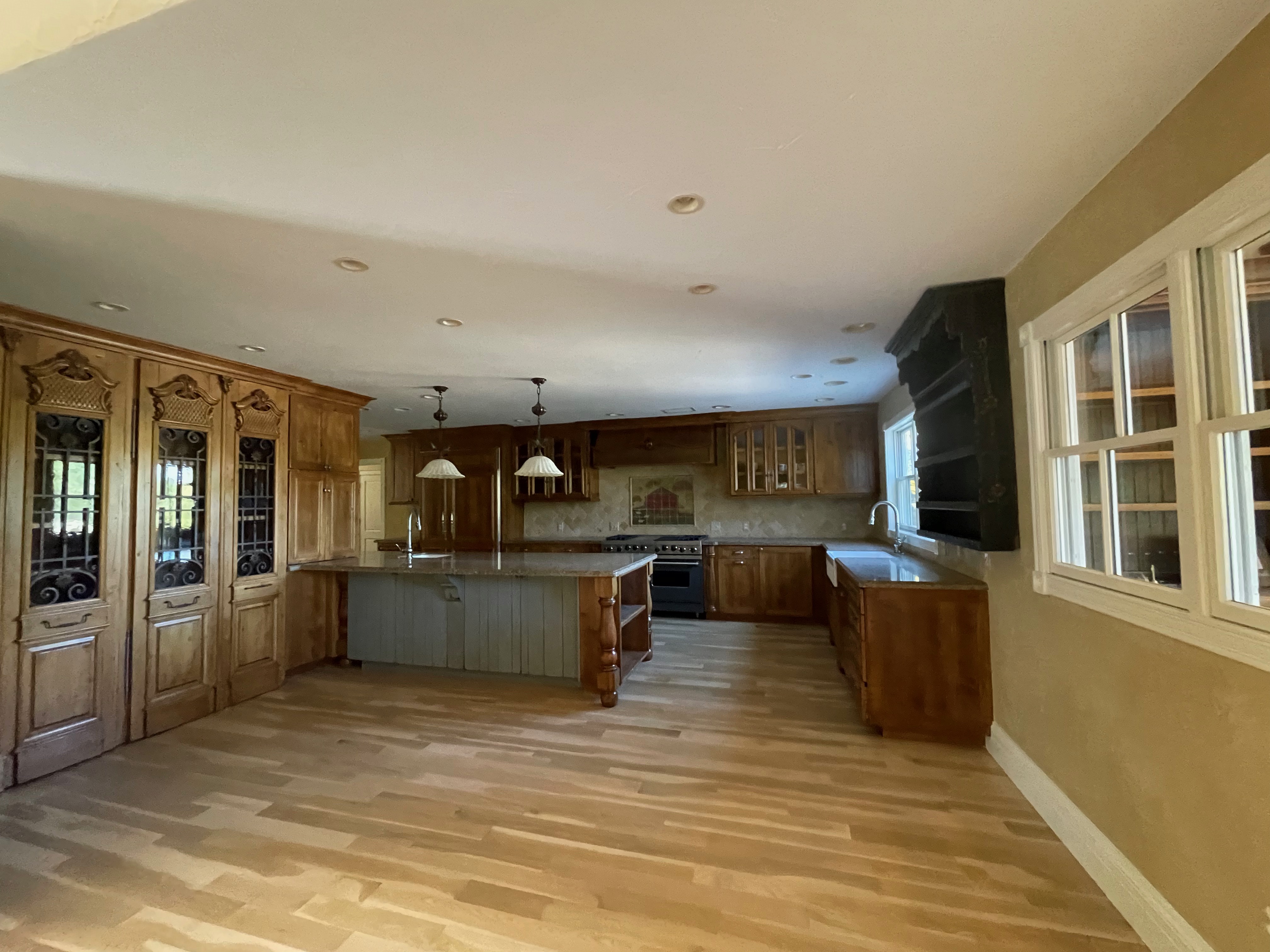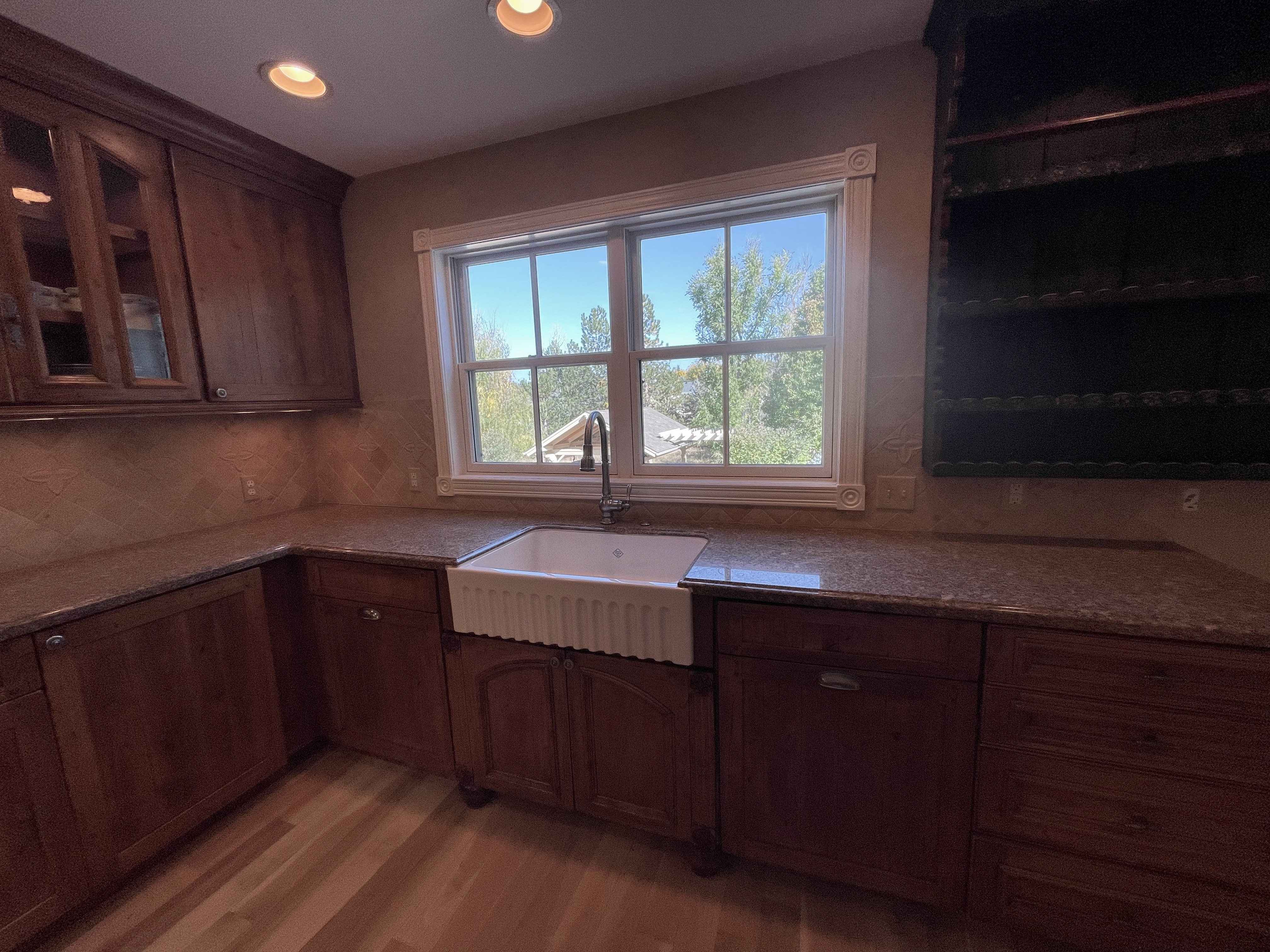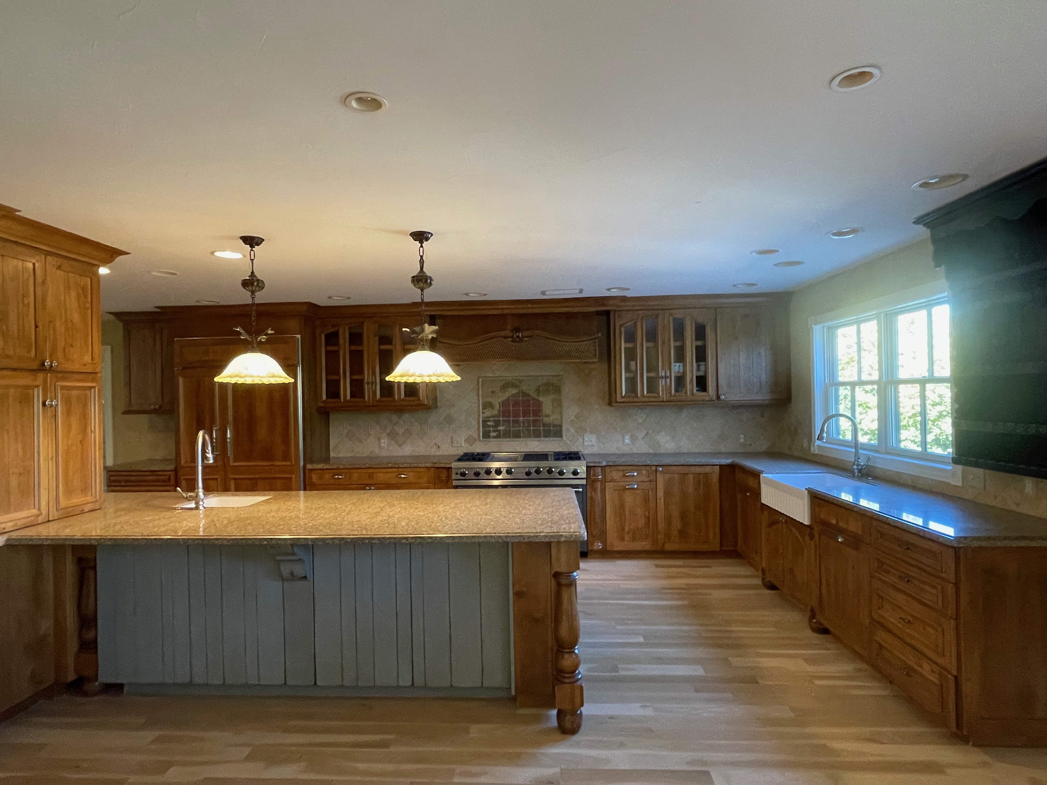 Gorgeous Alder wood kitchen cabinetry with beautiful custom craftsmanship in this farmhouse style kitchen. The cabinetry has square flat peg inserts on a traditional mortise and tenon door/drawer front style with dovetail joinery drawers. The cabinets are all finished wood inside. There are a few contrasting peninsula cabinets and finished panels in a cornflower dusty blue. The kitchen set includes a Viking range, Sub-Zero refrigerator, and other appliances. Granite counter tops, farmhouse sink, and faucet sets included. Sub-contractors can be hired for removal. The kitchen is available tbd January/February 2026. Price for the package below.