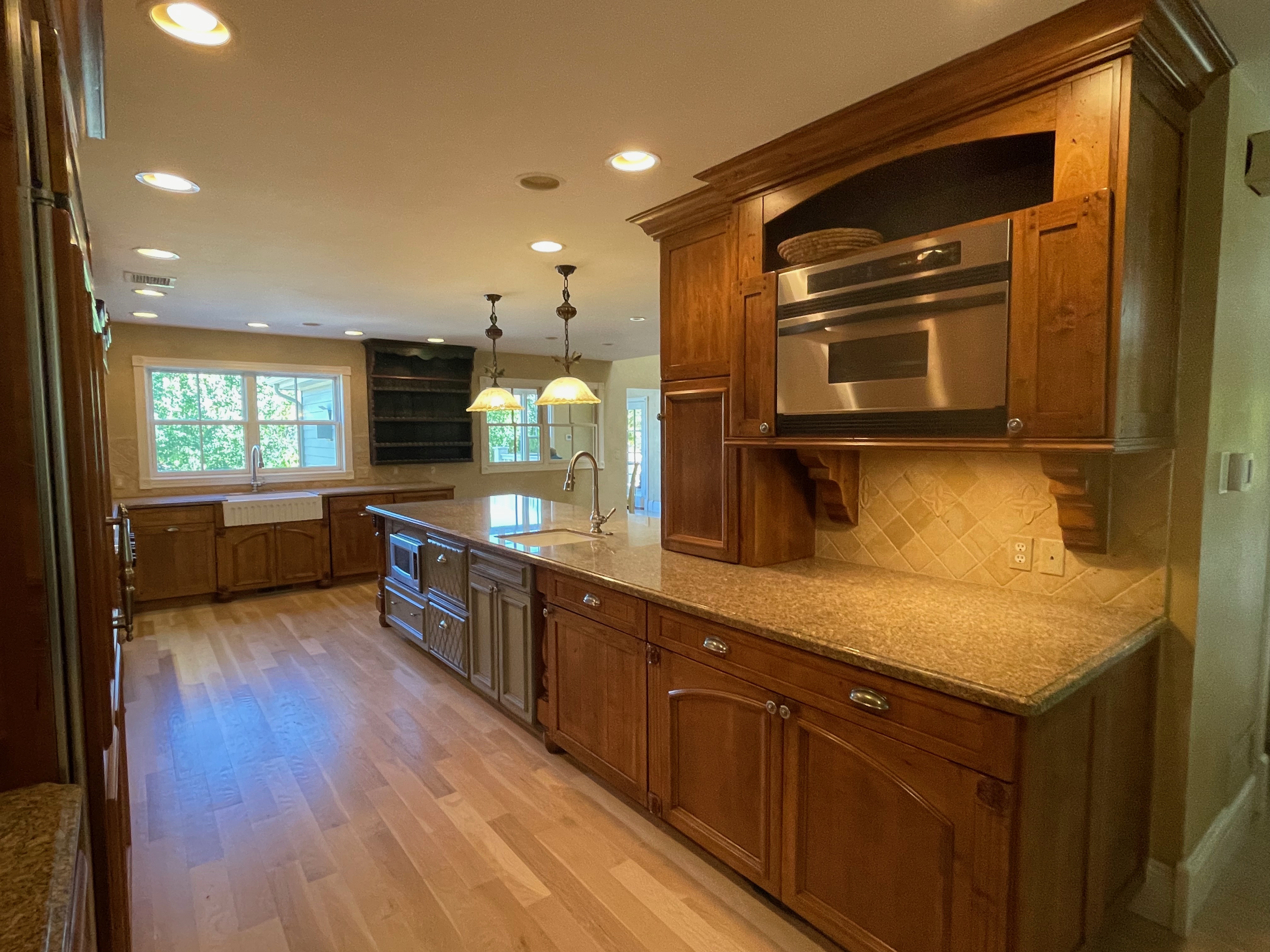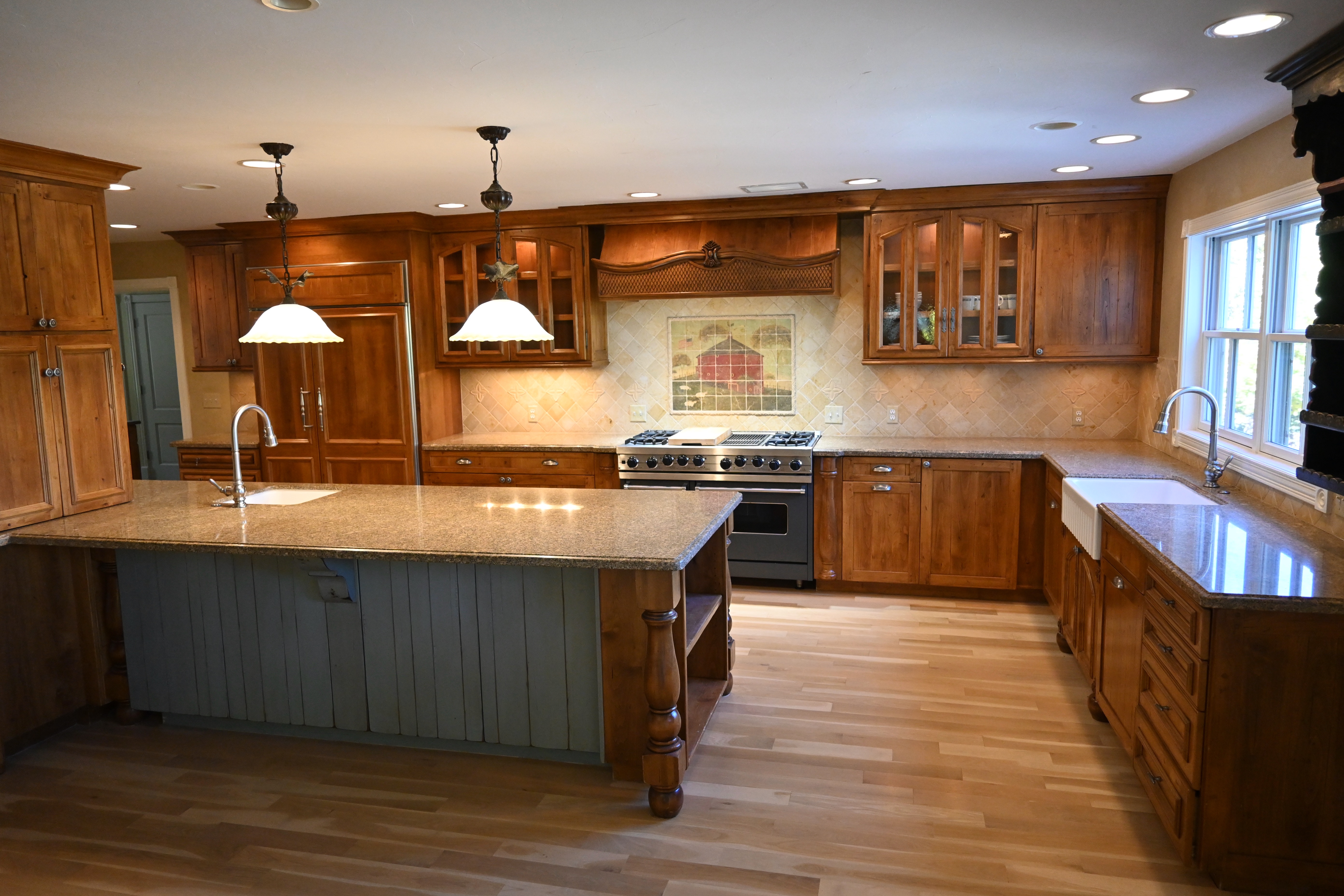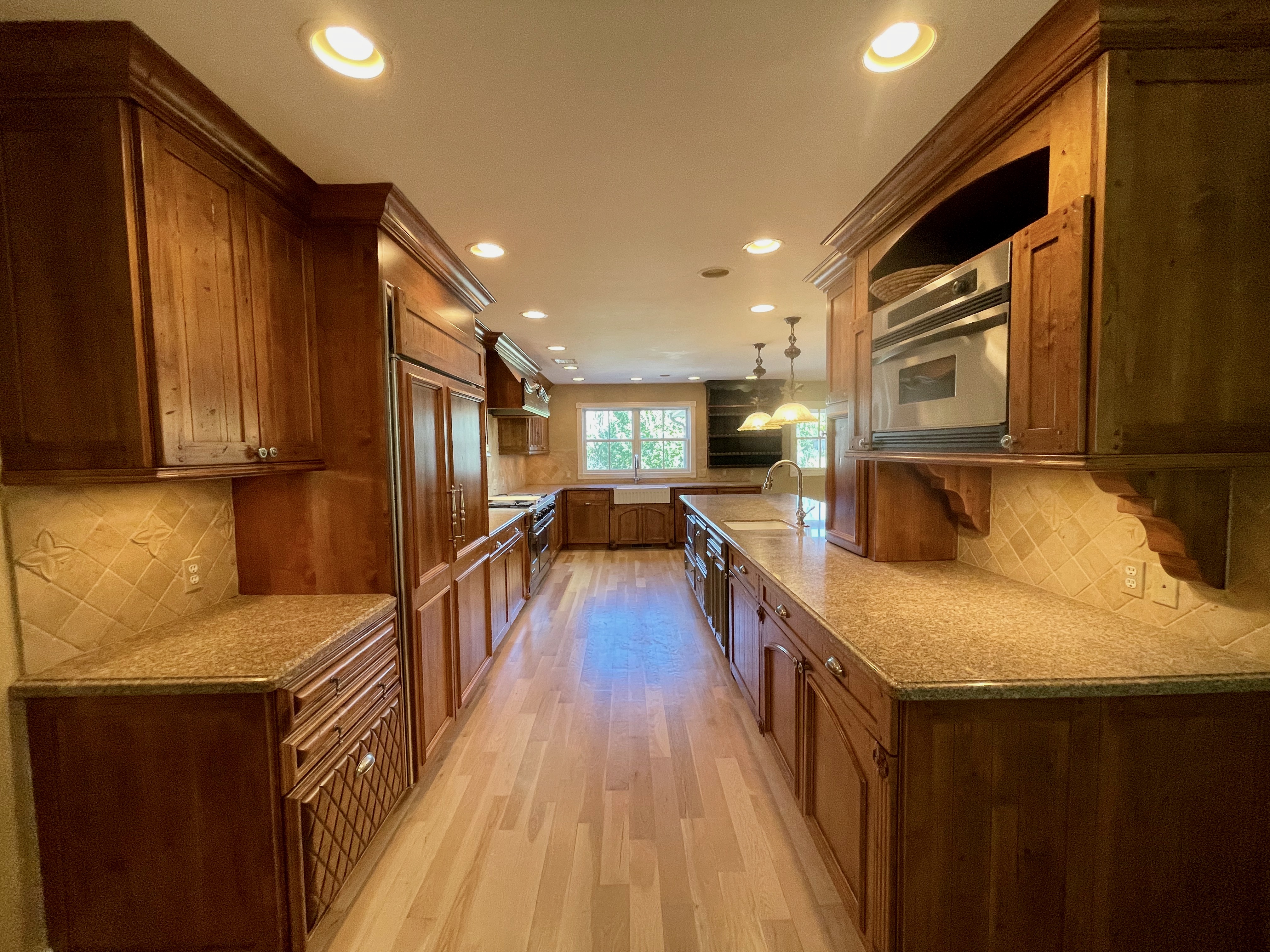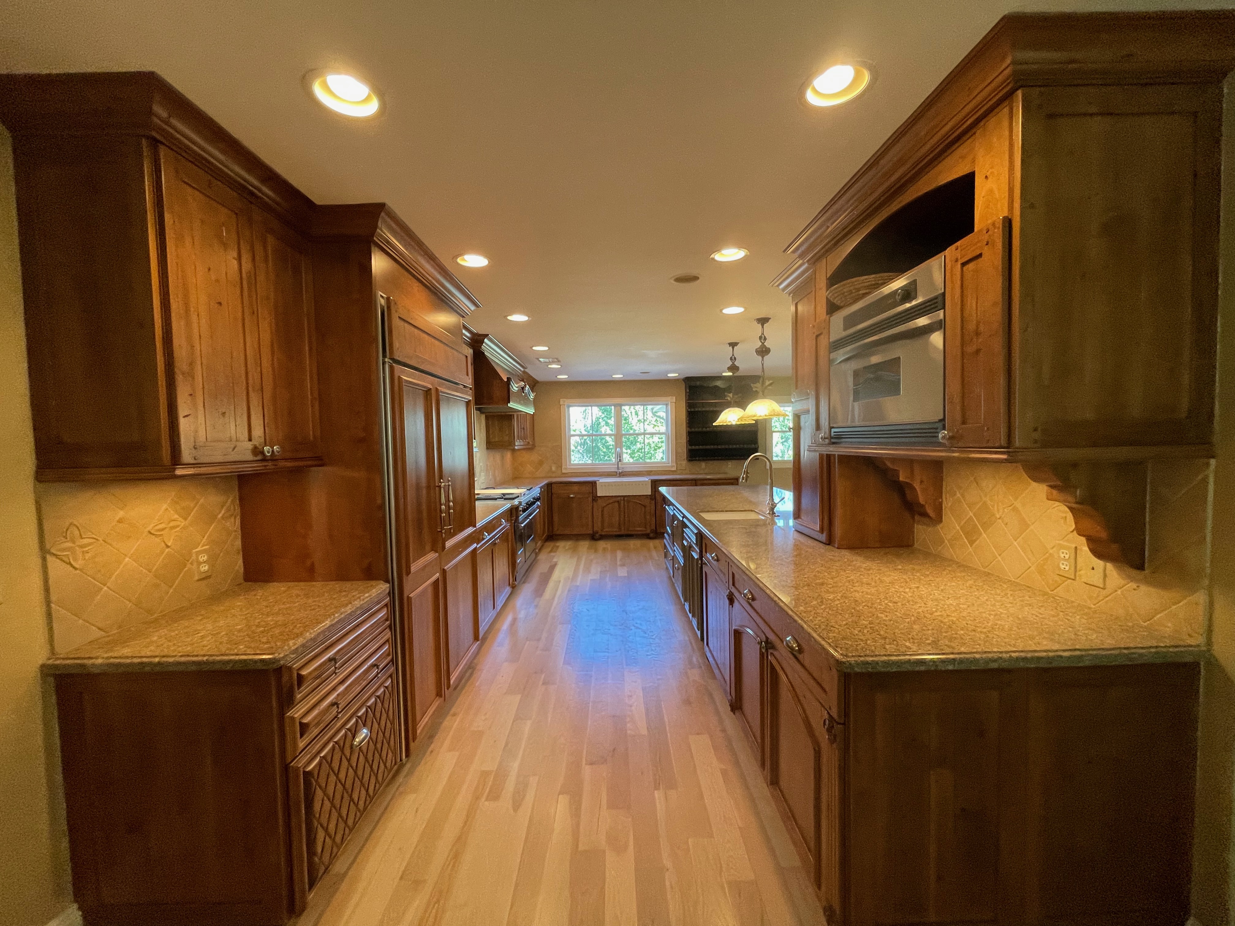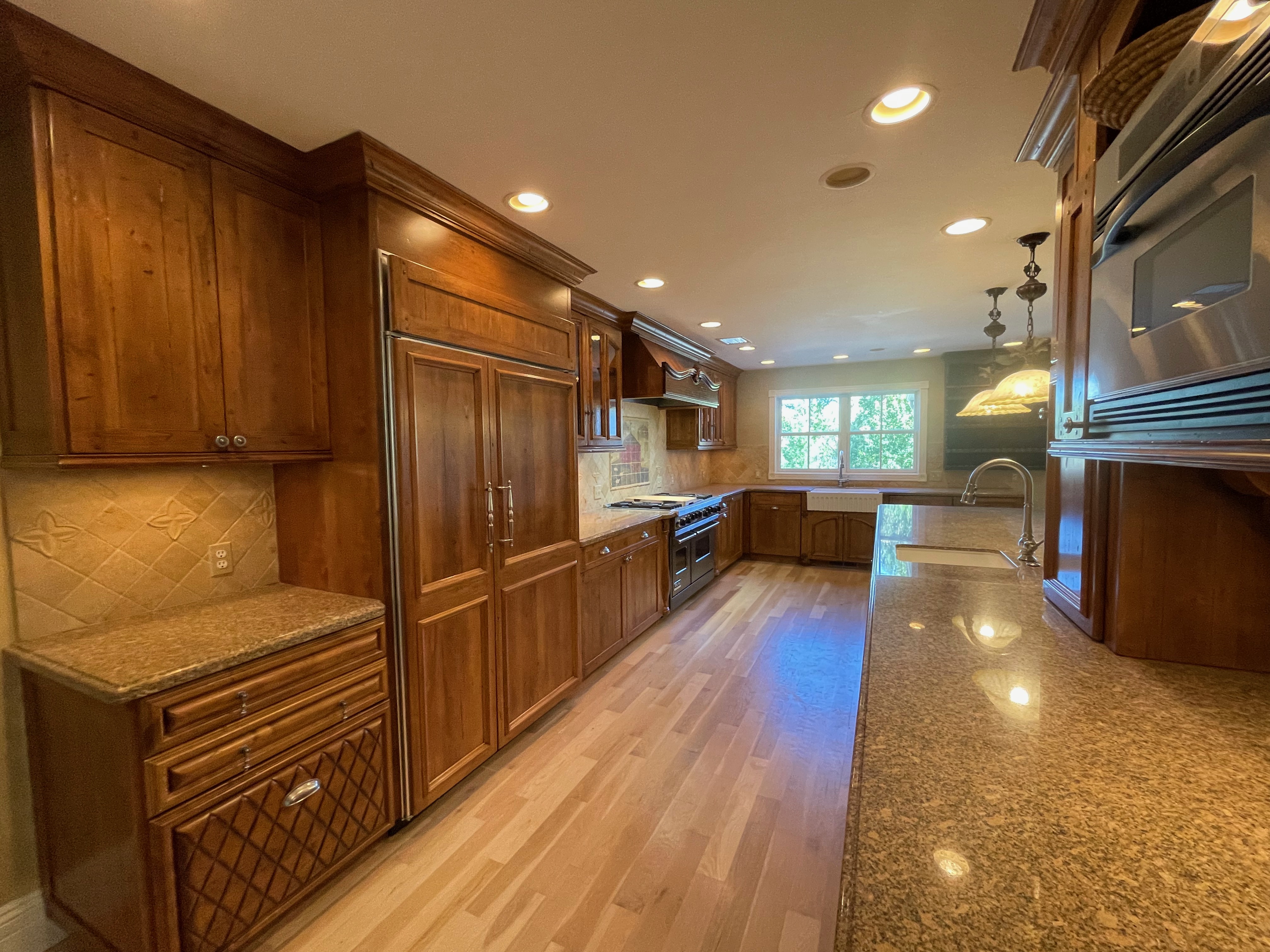 Gorgeous Alder wood kitchen cabinetry with beautiful custom craftsmanship in this farmhouse style kitchen. The cabinetry has square flat peg inserts on a traditional mortise and tenon door/drawer front style with dovetail joinery drawers. The cabinets are all finished wood inside. There are a few contrasting peninsula cabinets and finished panels in a cornflower dusty blue. The kitchen set includes a Viking range, Sub-Zero refrigerator, and other appliances. Granite counter tops, farmhouse sink, and faucet sets included. Sub-contractors can be hired for removal. The kitchen is available tbd January/February 2026. Price for the package below.