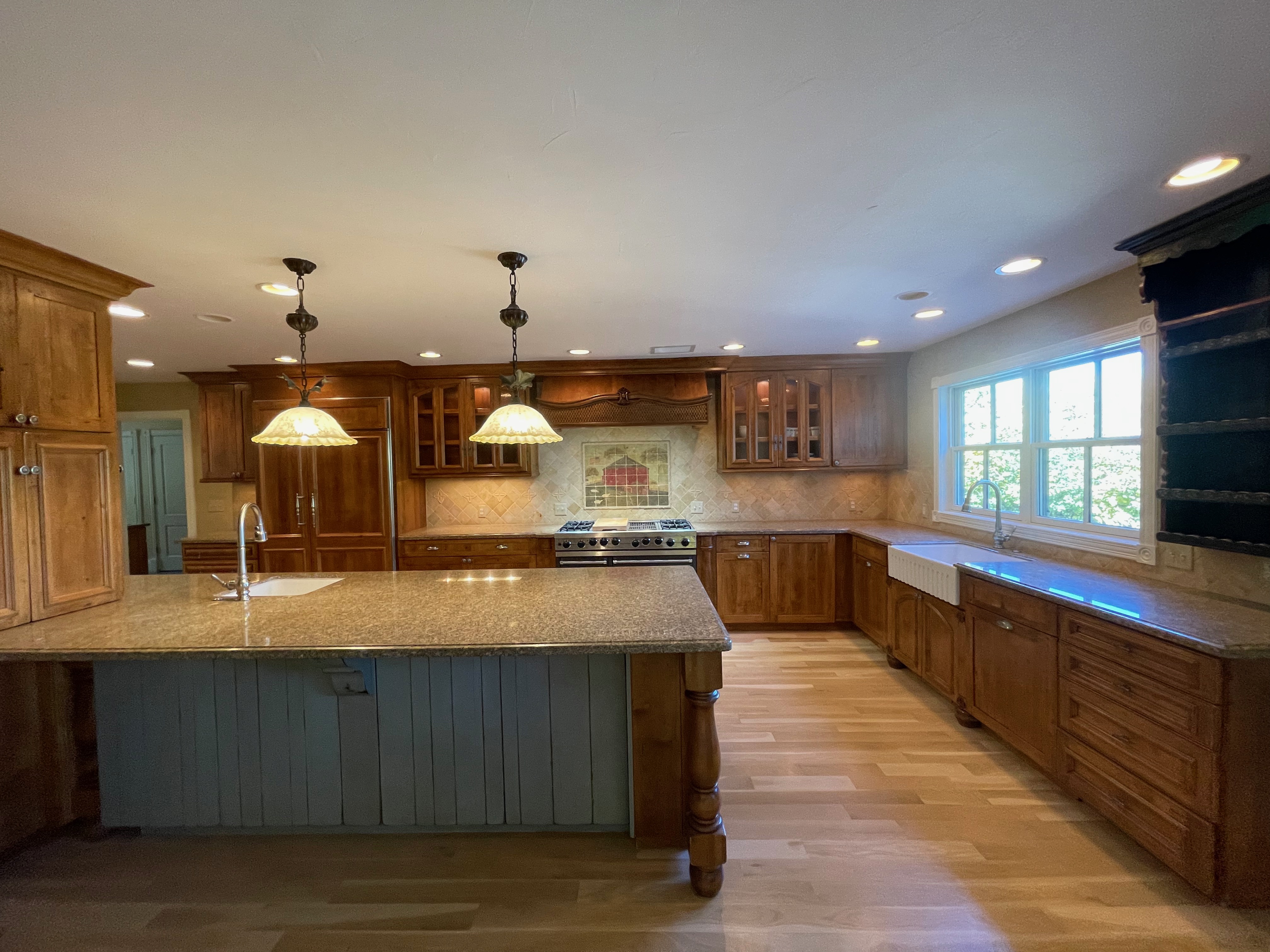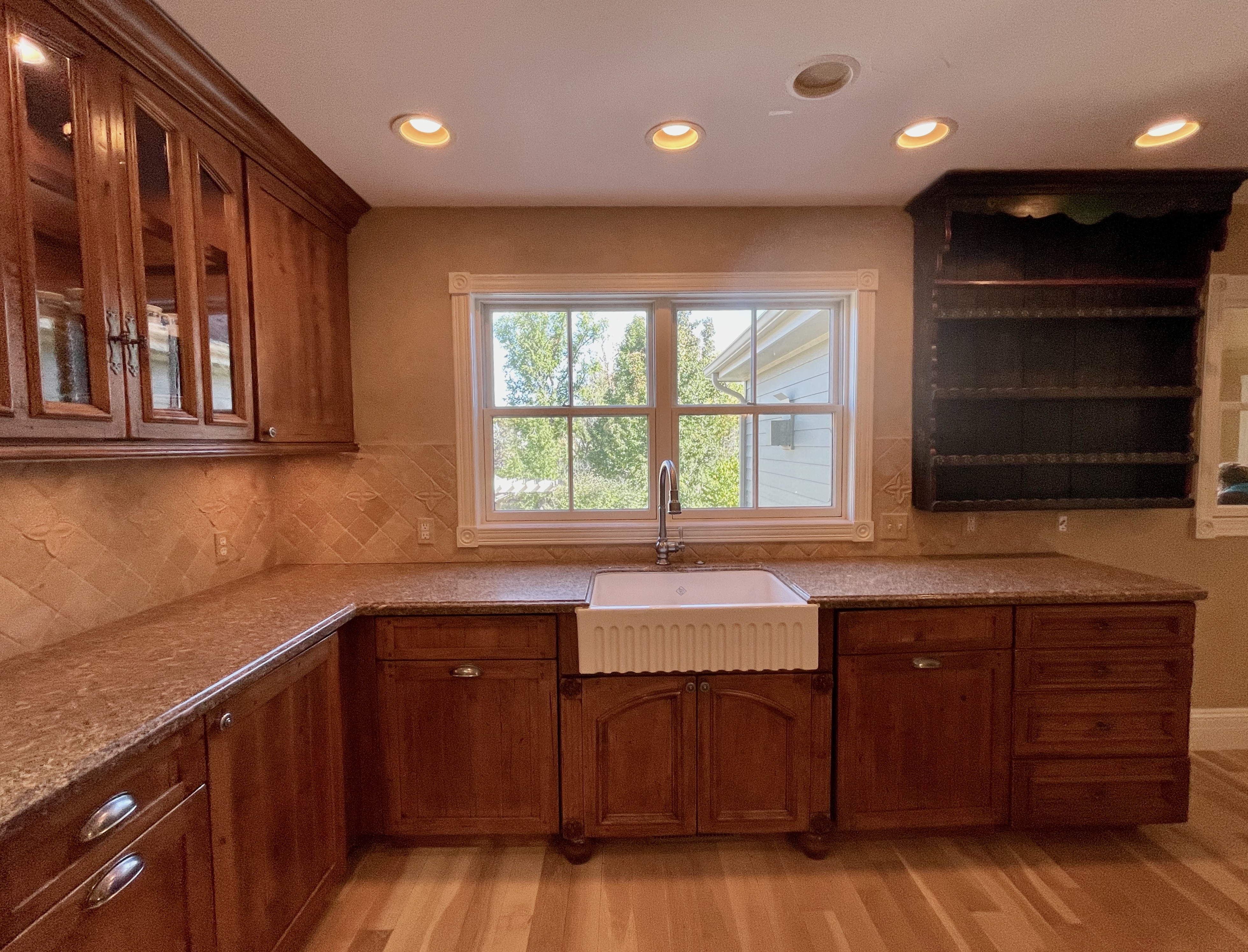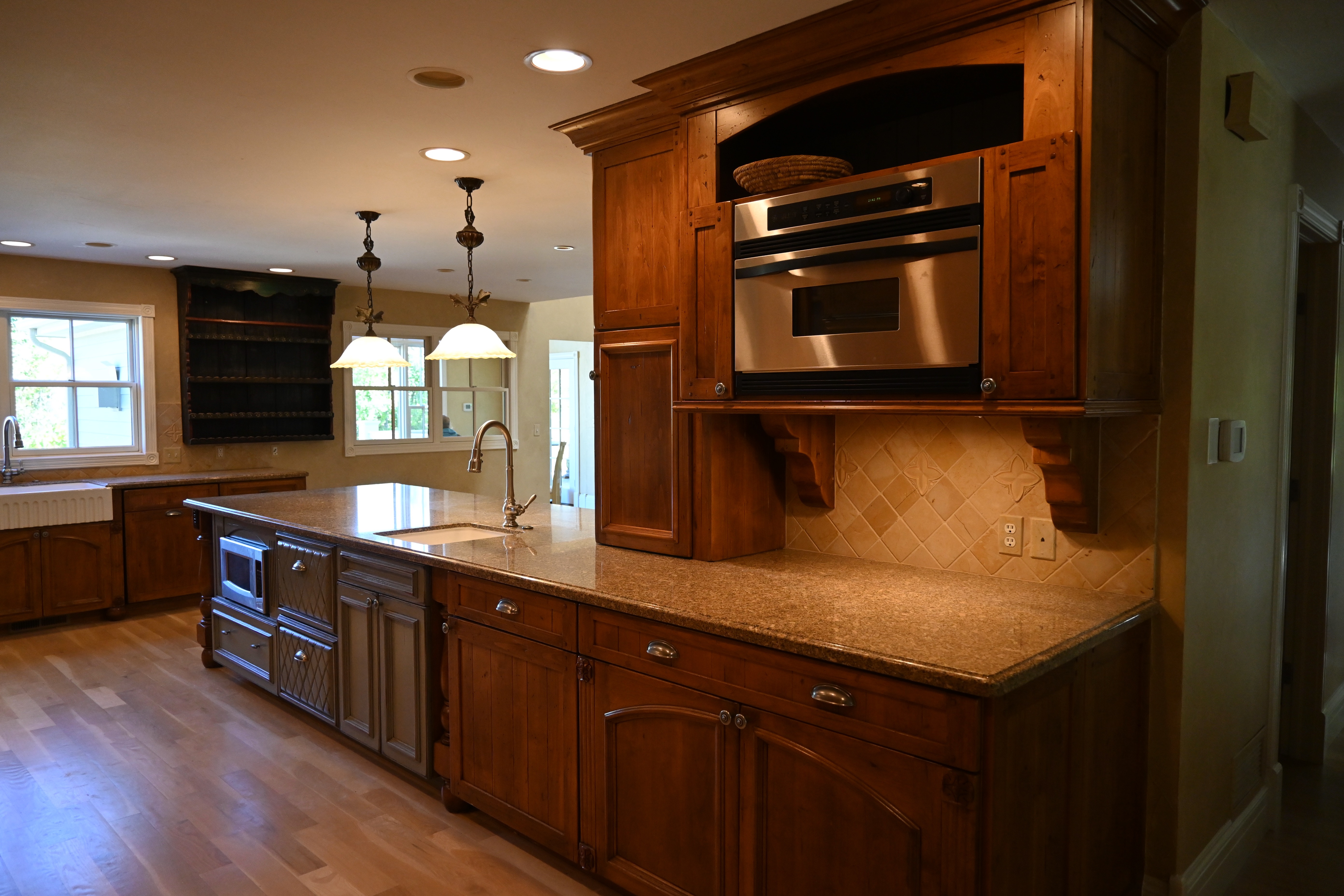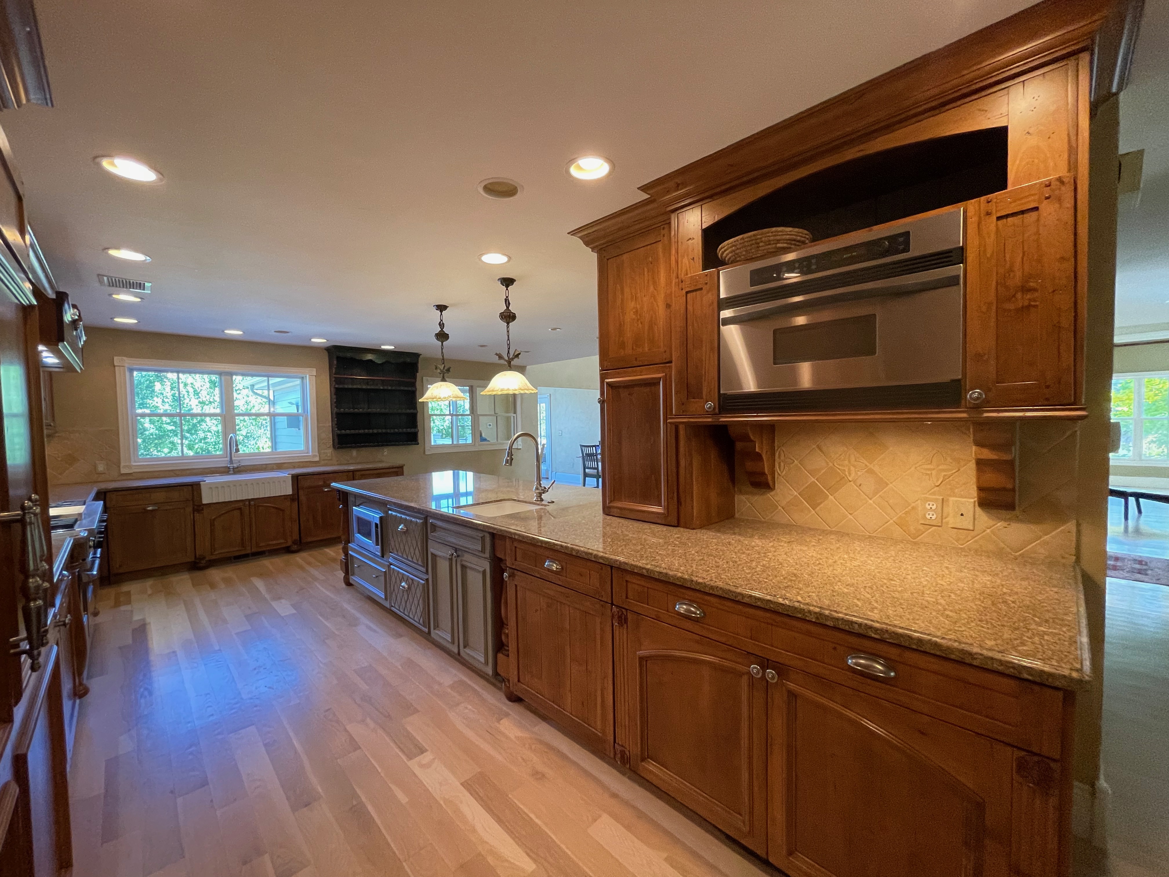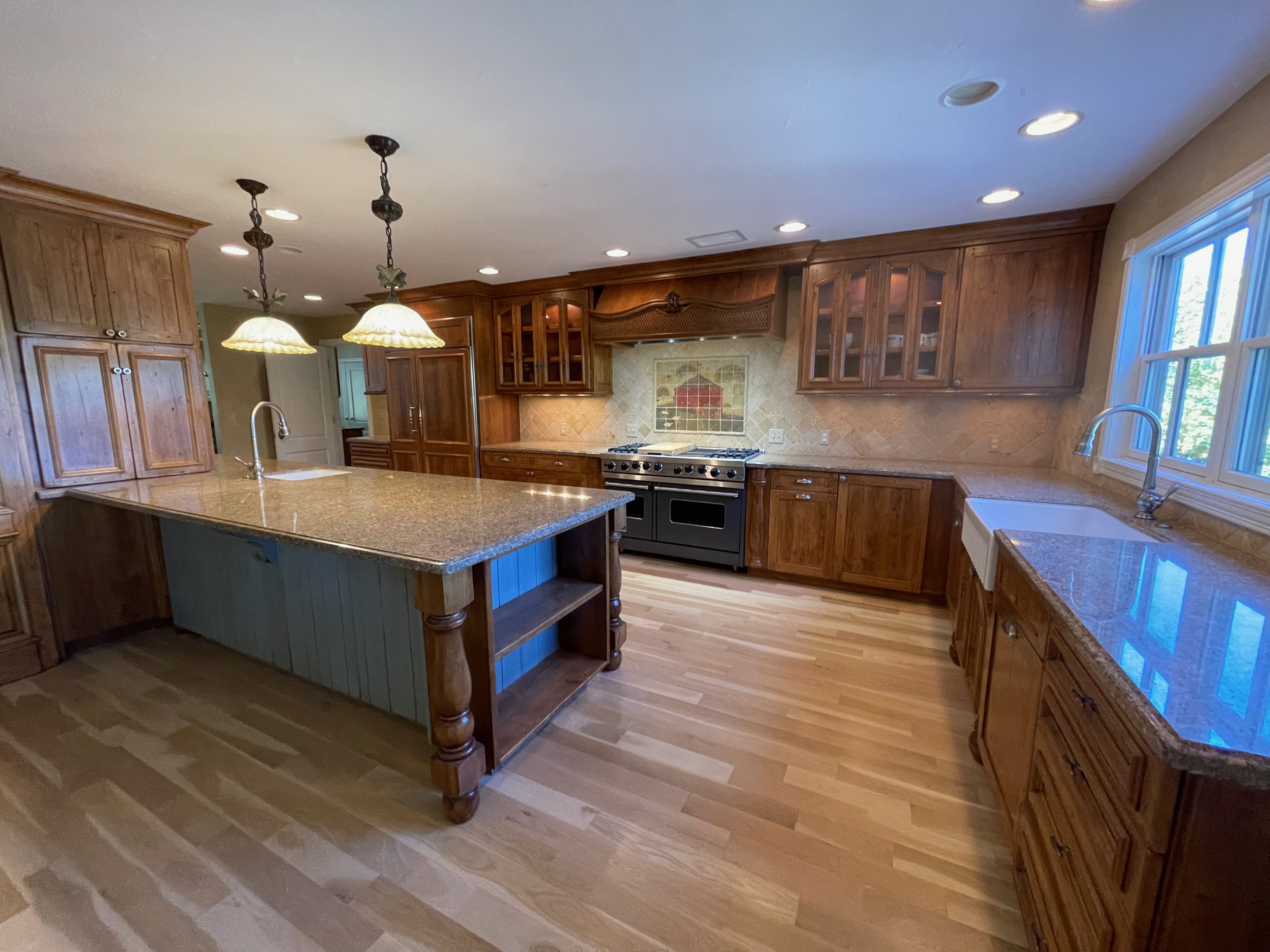 Gorgeous Alder wood kitchen cabinetry with beautiful custom craftsmanship in this farmhouse style kitchen. The cabinetry has square flat peg inserts on a traditional mortise and tenon door/drawer front style with dovetail joinery drawers. The cabinets are all finished wood inside. There are a few contrasting peninsula cabinets and finished panels in a cornflower dusty blue. The kitchen set includes a Viking range, Sub-Zero refrigerator, and other appliances. Granite counter tops, farmhouse sink, and faucet sets included. Sub-contractors can be hired for removal. The kitchen is available tbd January/February 2026. Price for the package below.