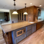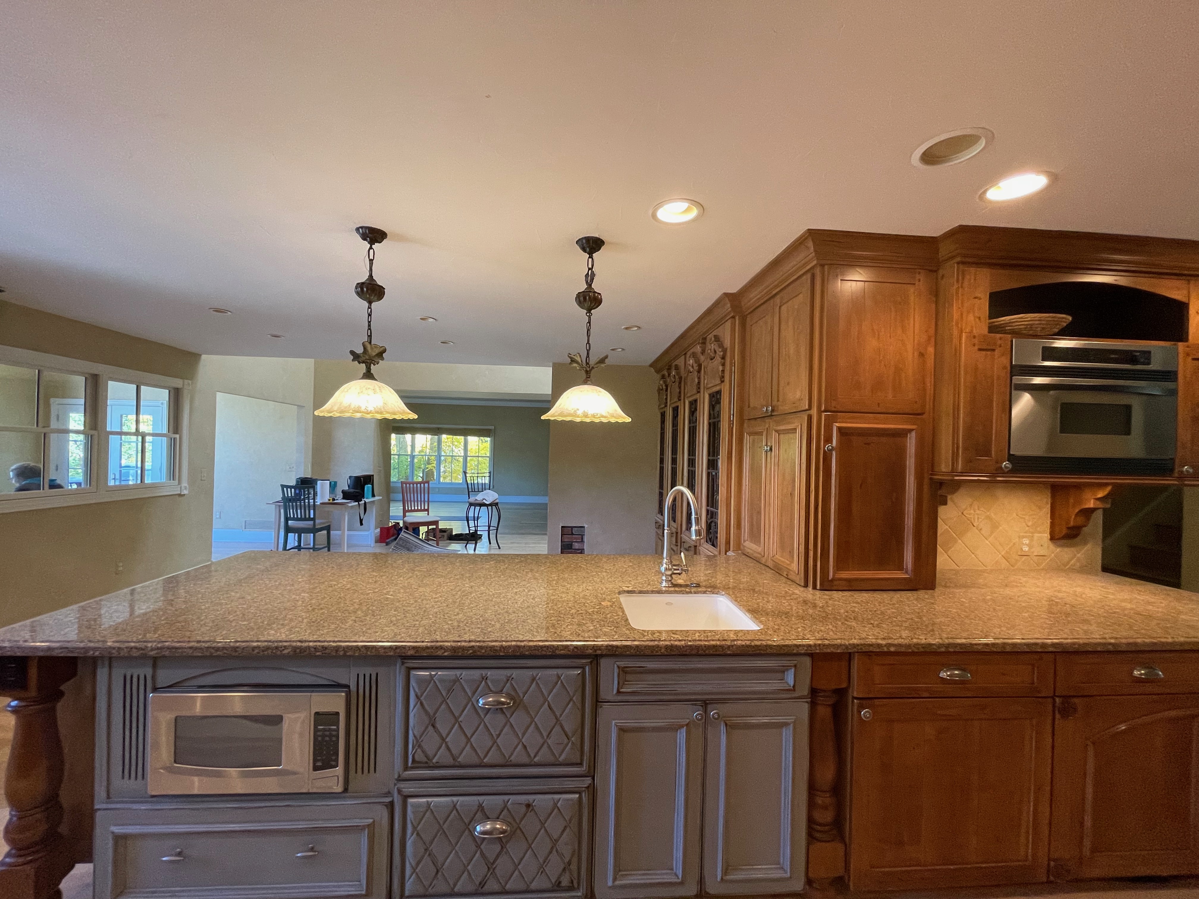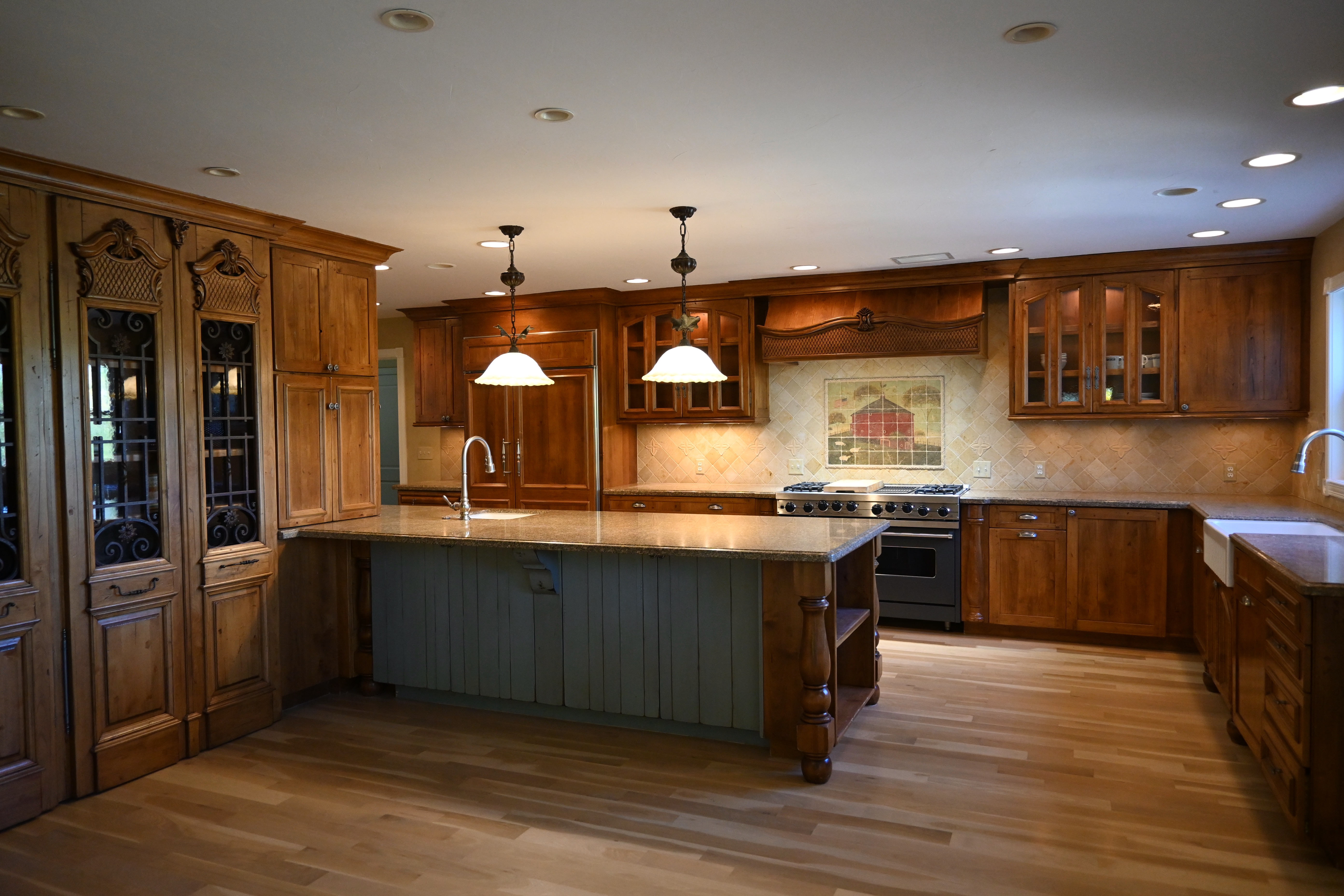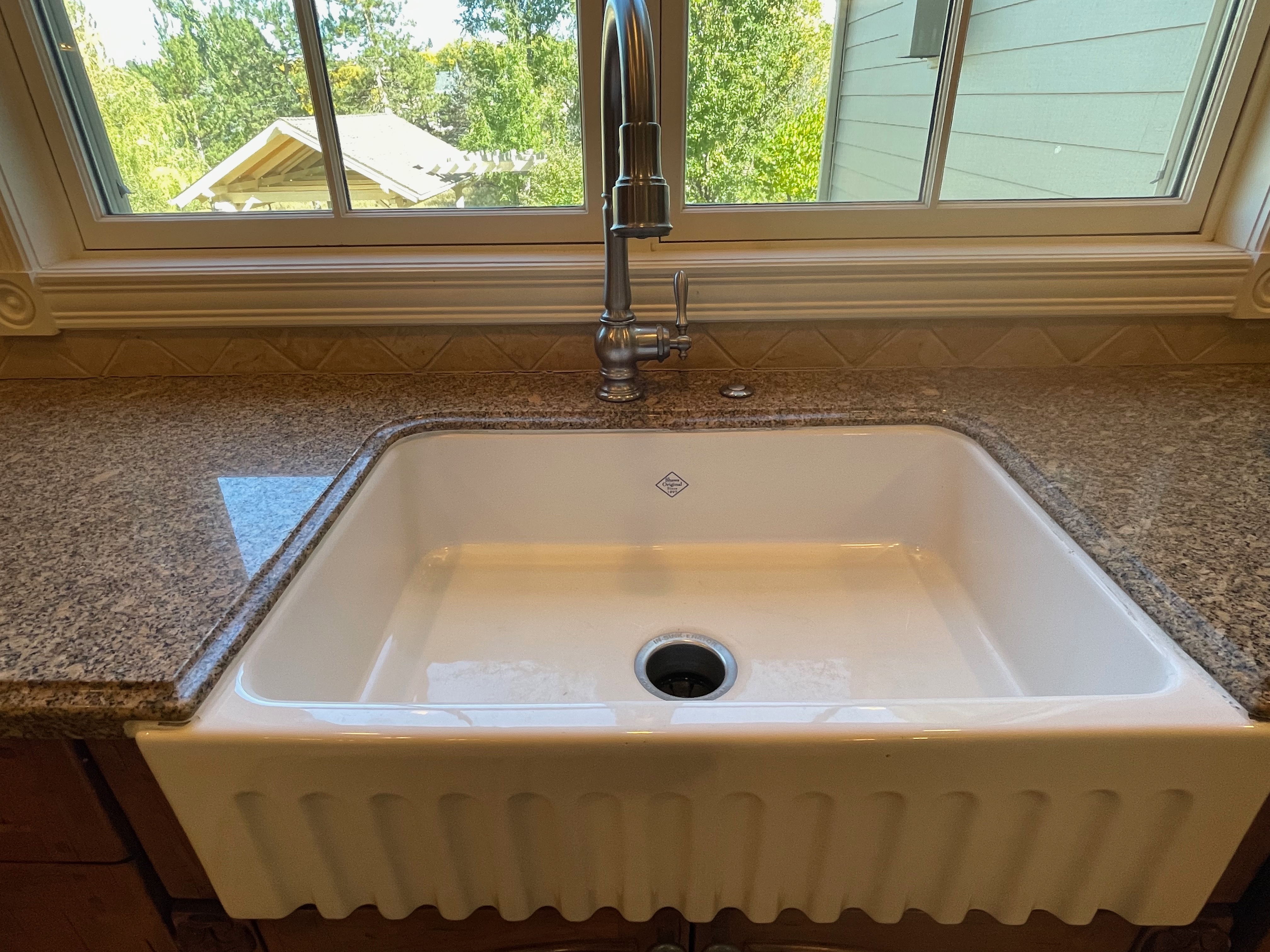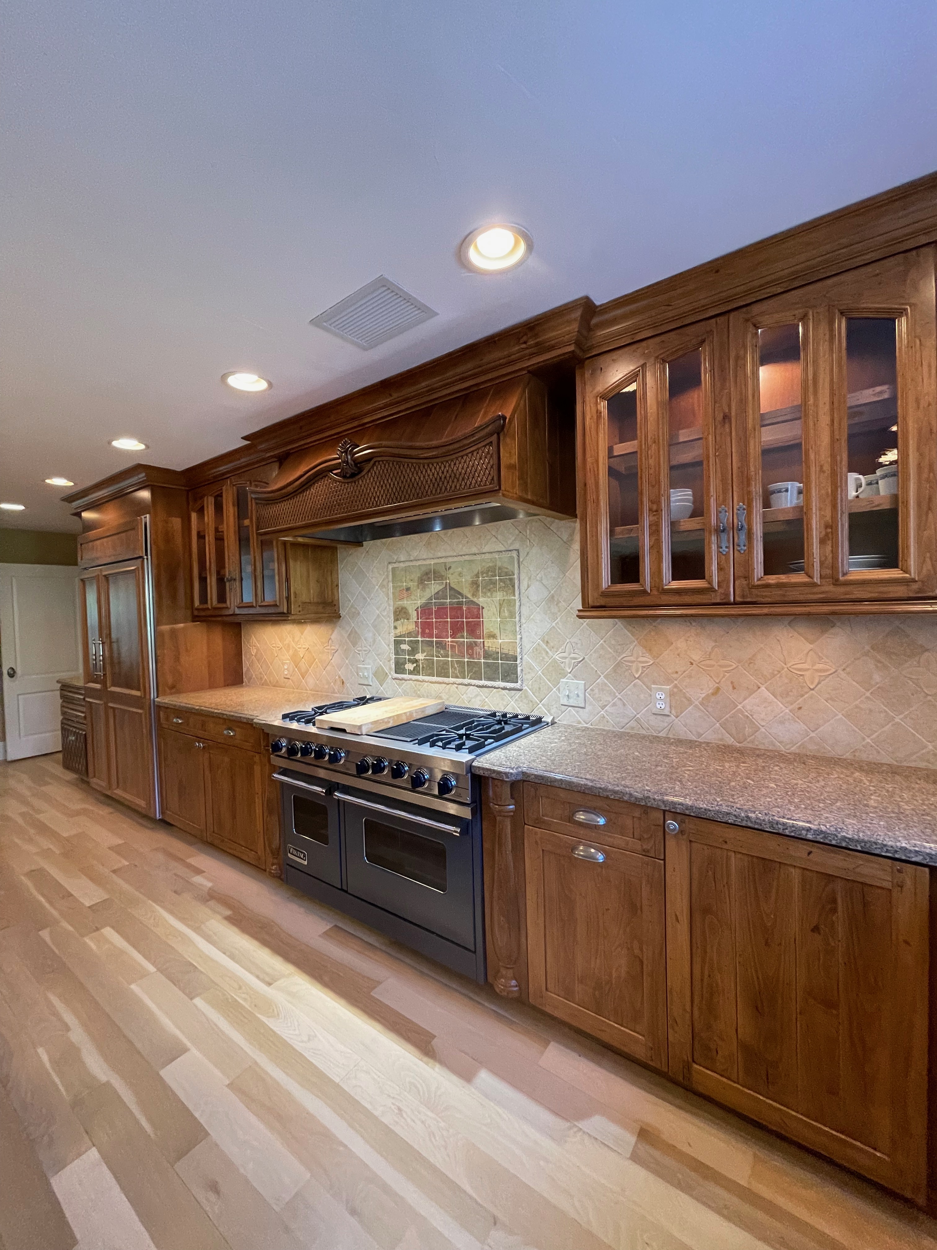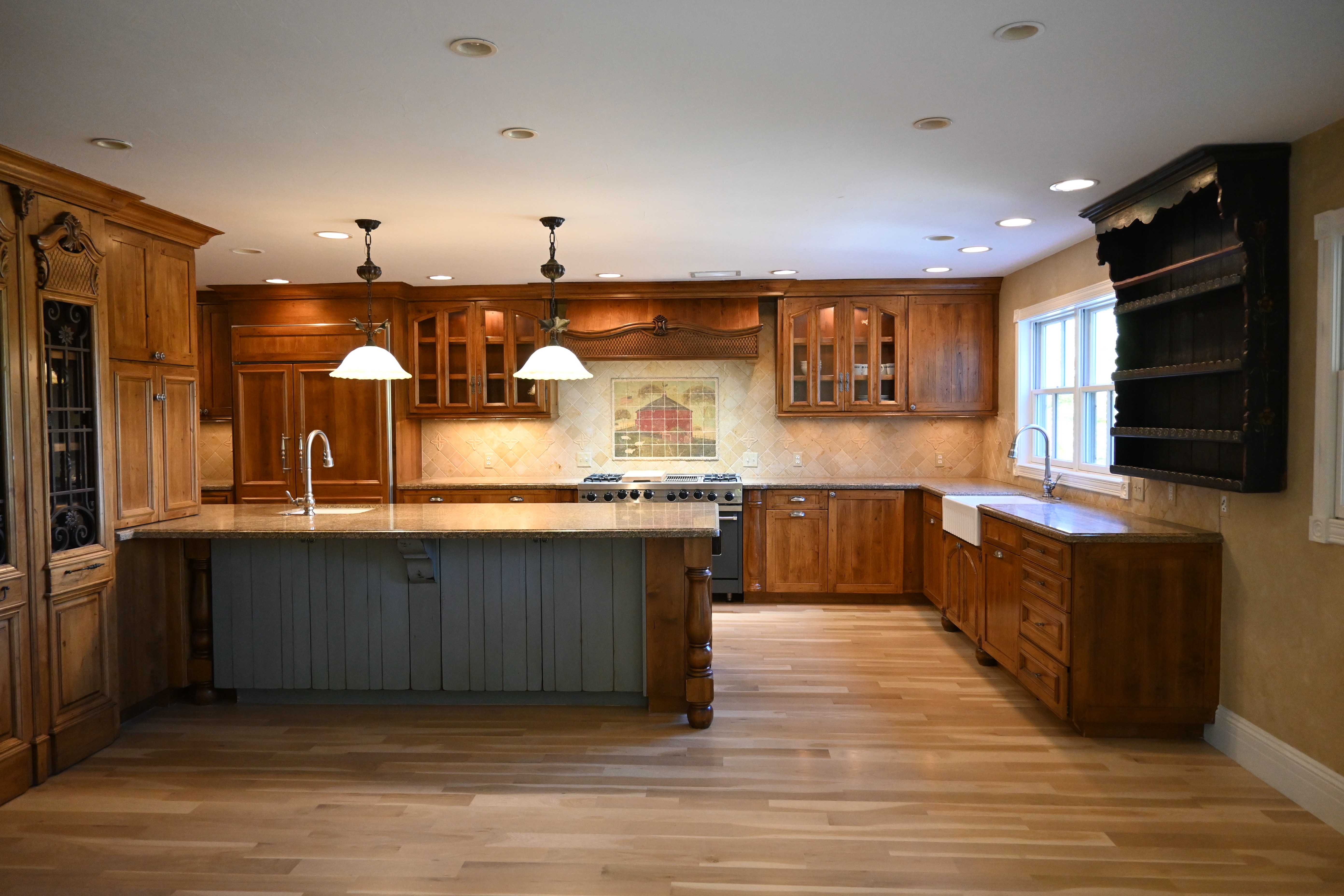 Gorgeous Alder wood kitchen cabinetry with beautiful custom craftsmanship in this farmhouse style kitchen. The cabinetry has square flat peg inserts on a traditional mortise and tenon door/drawer front style with dovetail joinery drawers. The cabinets are all finished wood inside. There are a few contrasting peninsula cabinets and finished panels in a cornflower dusty blue. The kitchen set includes a Viking range, Sub-Zero refrigerator, and other appliances. Granite counter tops, farmhouse sink, and faucet sets included. Sub-contractors can be hired for removal. The kitchen is available tbd January/February 2026. Price for the package below.