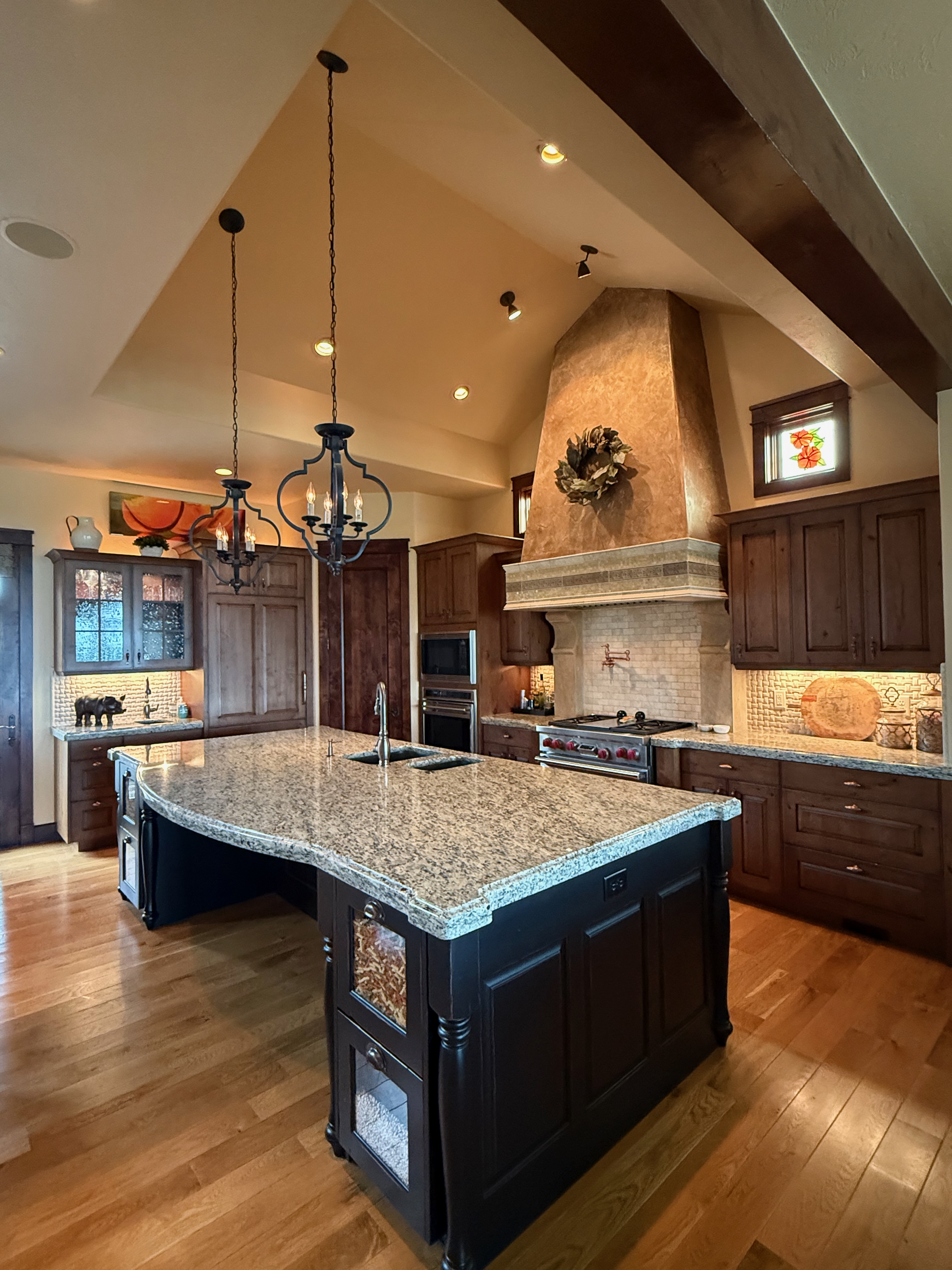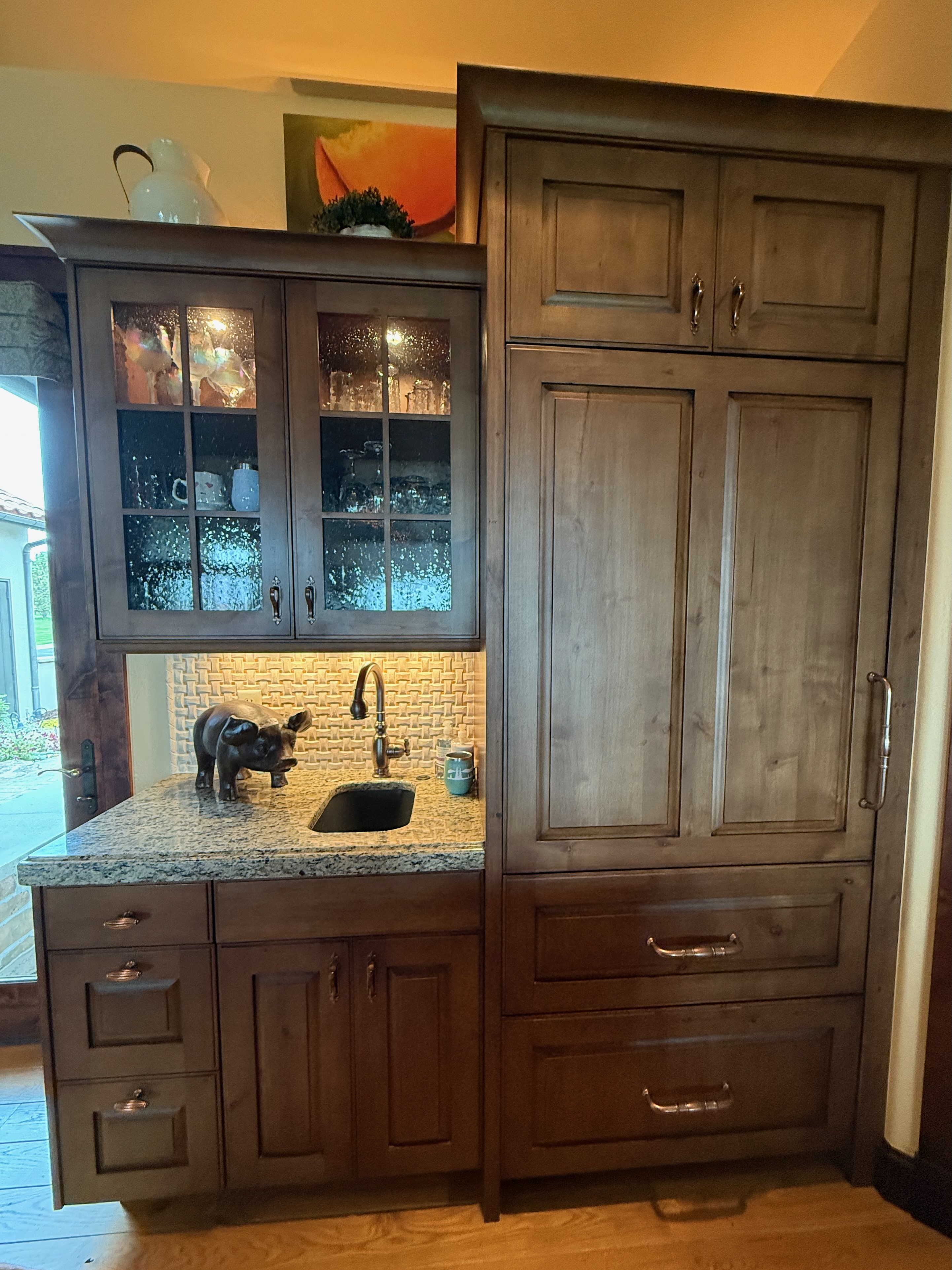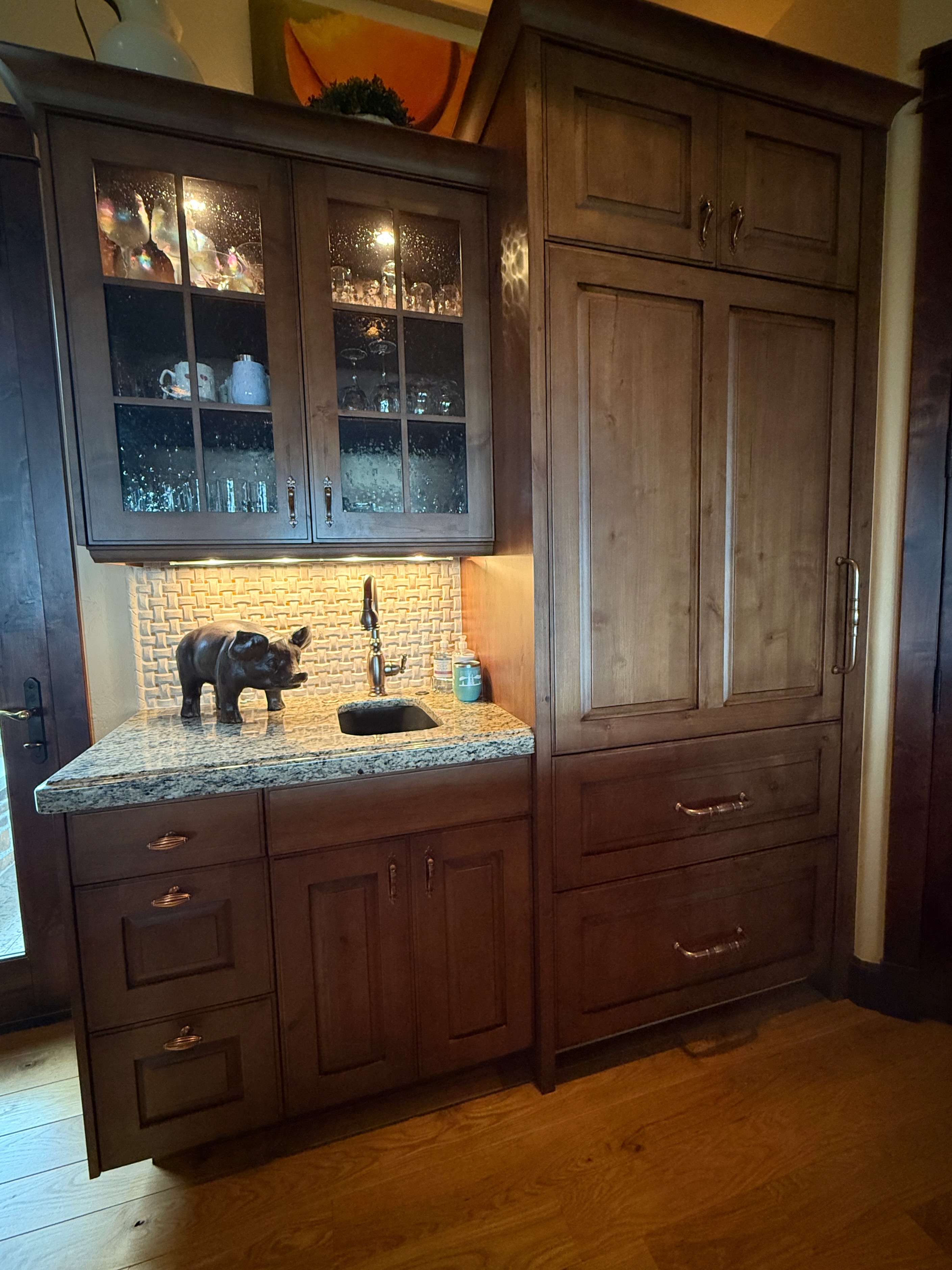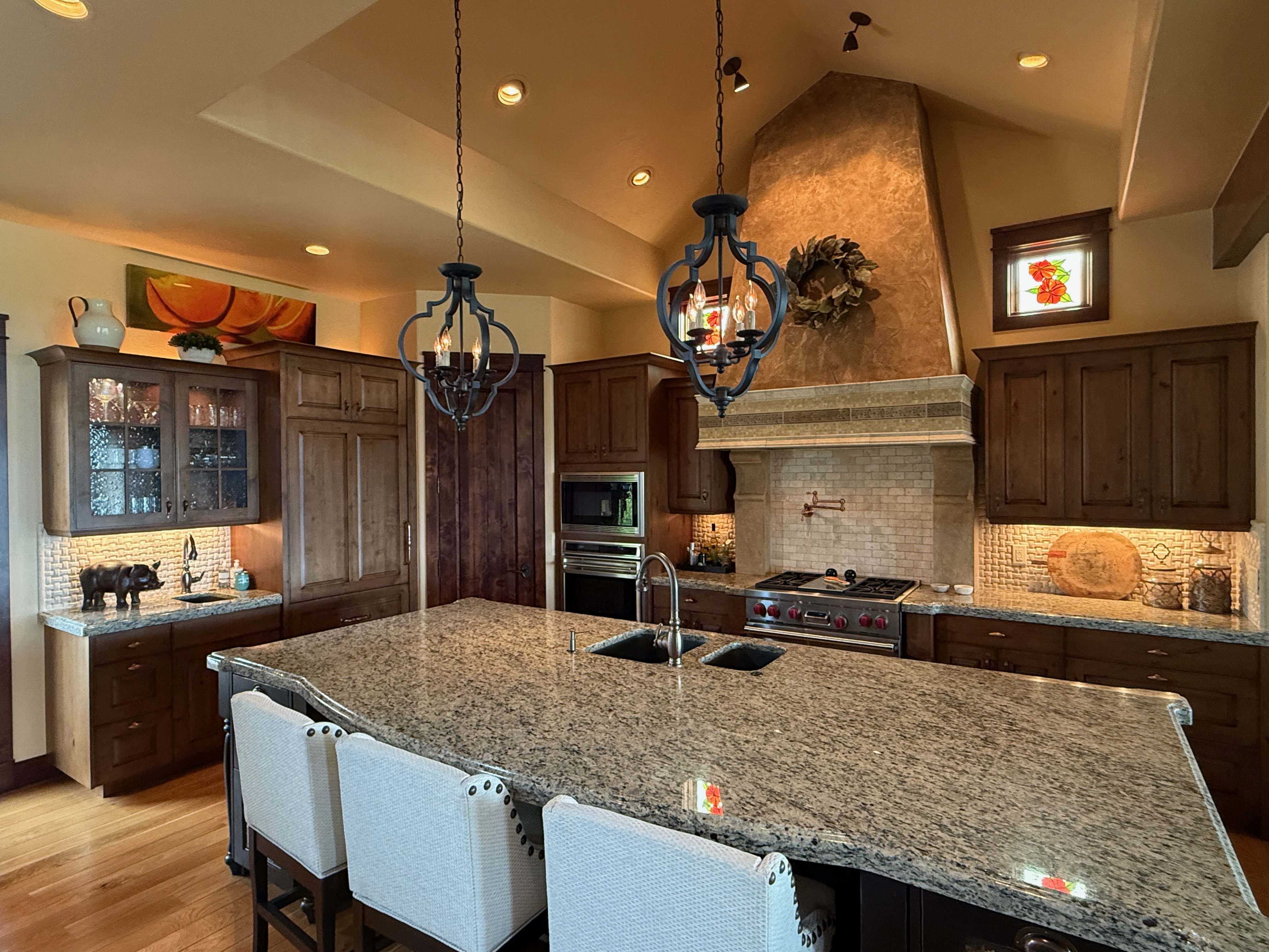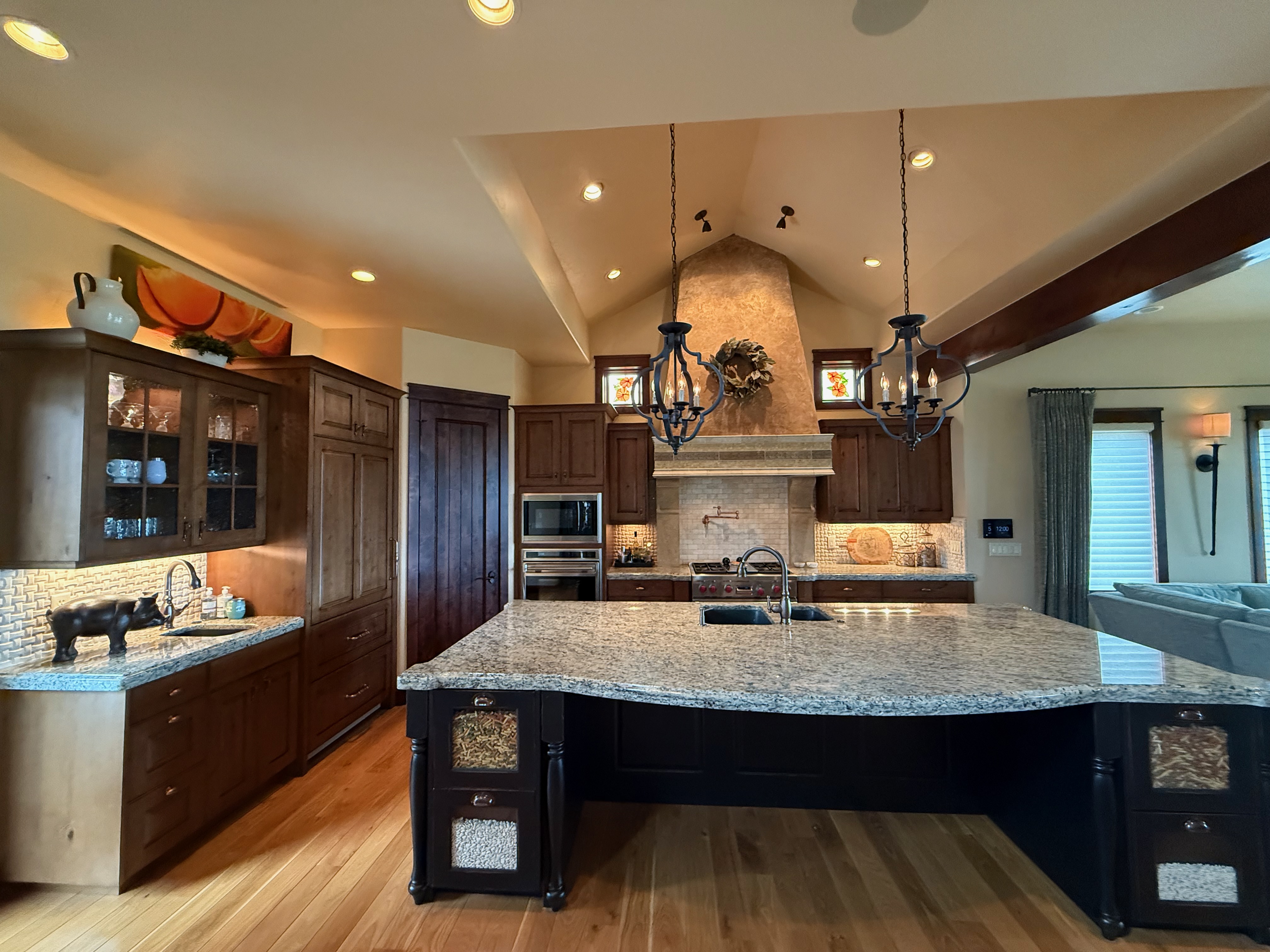 Nice! Rustic Colorado "Aspen Leaf" Knotty Alder Wood Kitchen and Wet Bar Cabinetry in a brushed Walnut finish. The perimeter cabinets are in a natural Knotty Alder Wood finish. The island and wet bar cabinets are in a matching Knotty Alder Wood in a black antique finish. All the drawer cabinets have the soft close feature. The kitchen package includes high-end Wolf and Sub-Zero appliances. The kitchen also has slab granite countertops included as well as two pendant lights. Cabinet drawings can be emailed. Pricing for the kitchen and wet bar below.